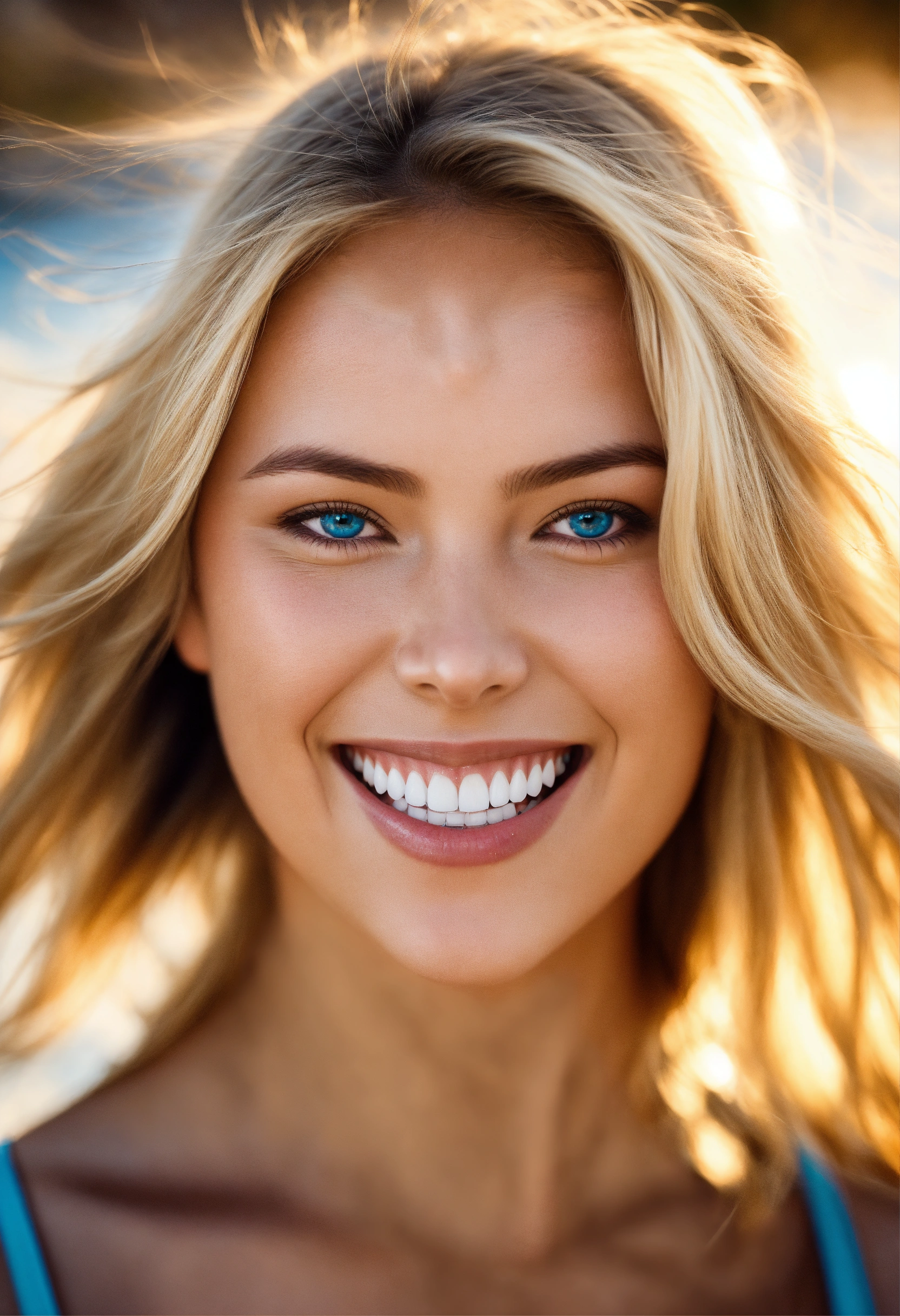 Beautiful petite woman, laughing, blonde hair, blue eyes, running on the beach, hyper detailed, canon eos 5d