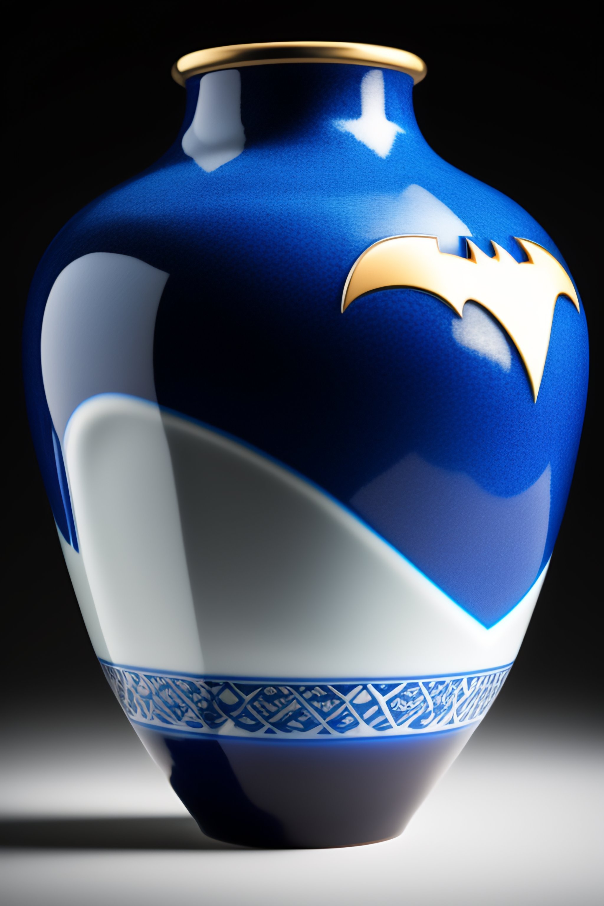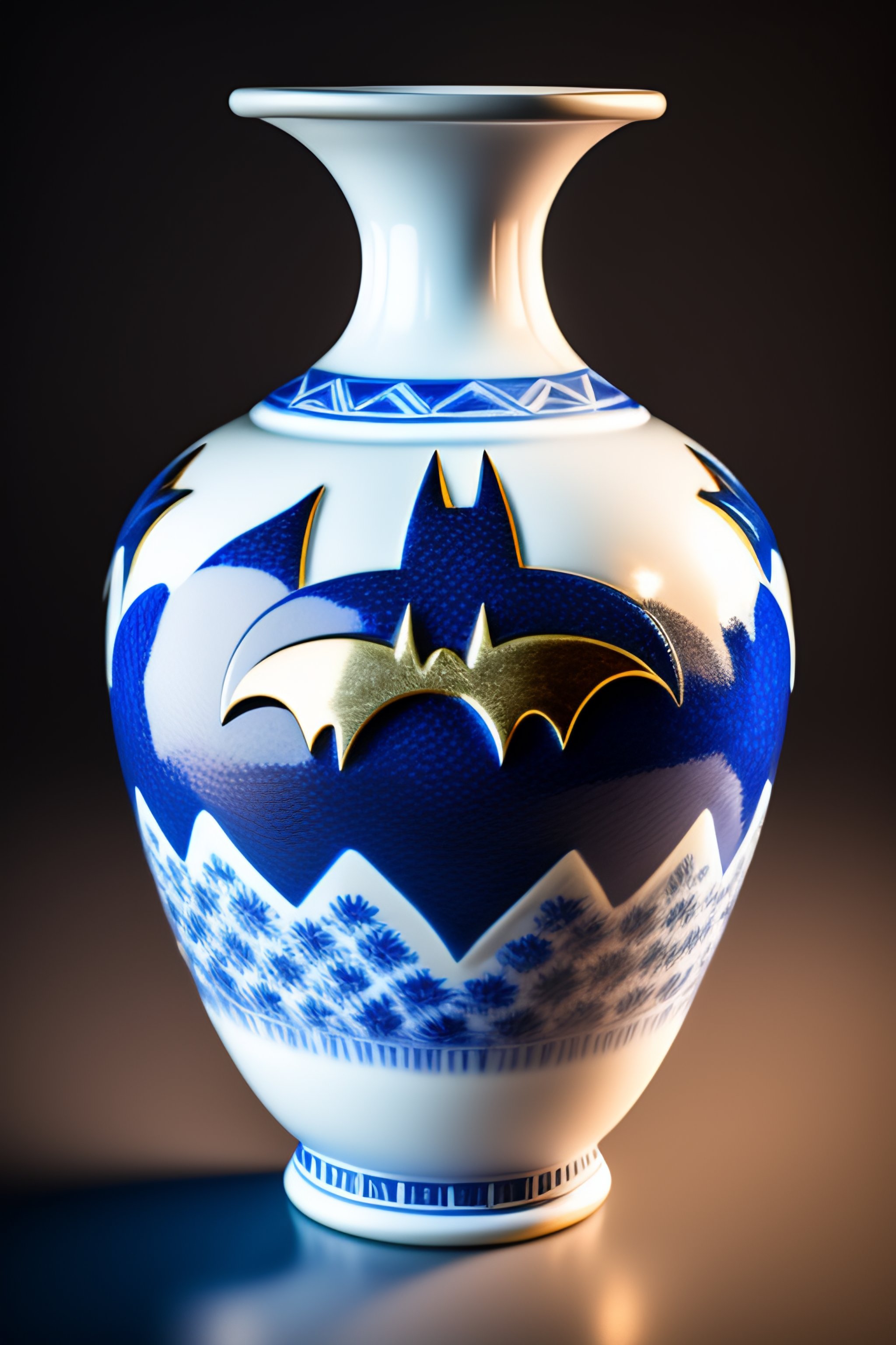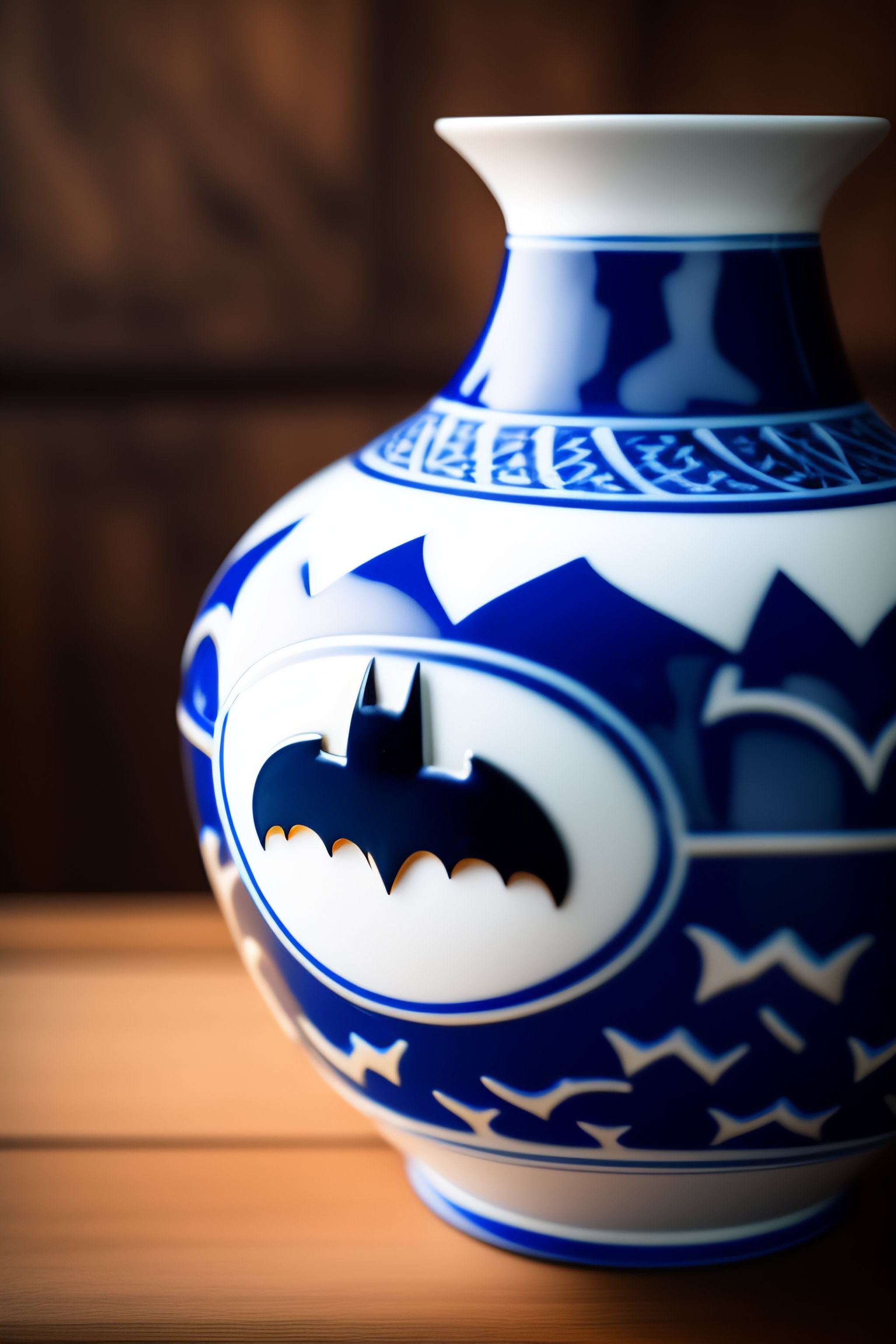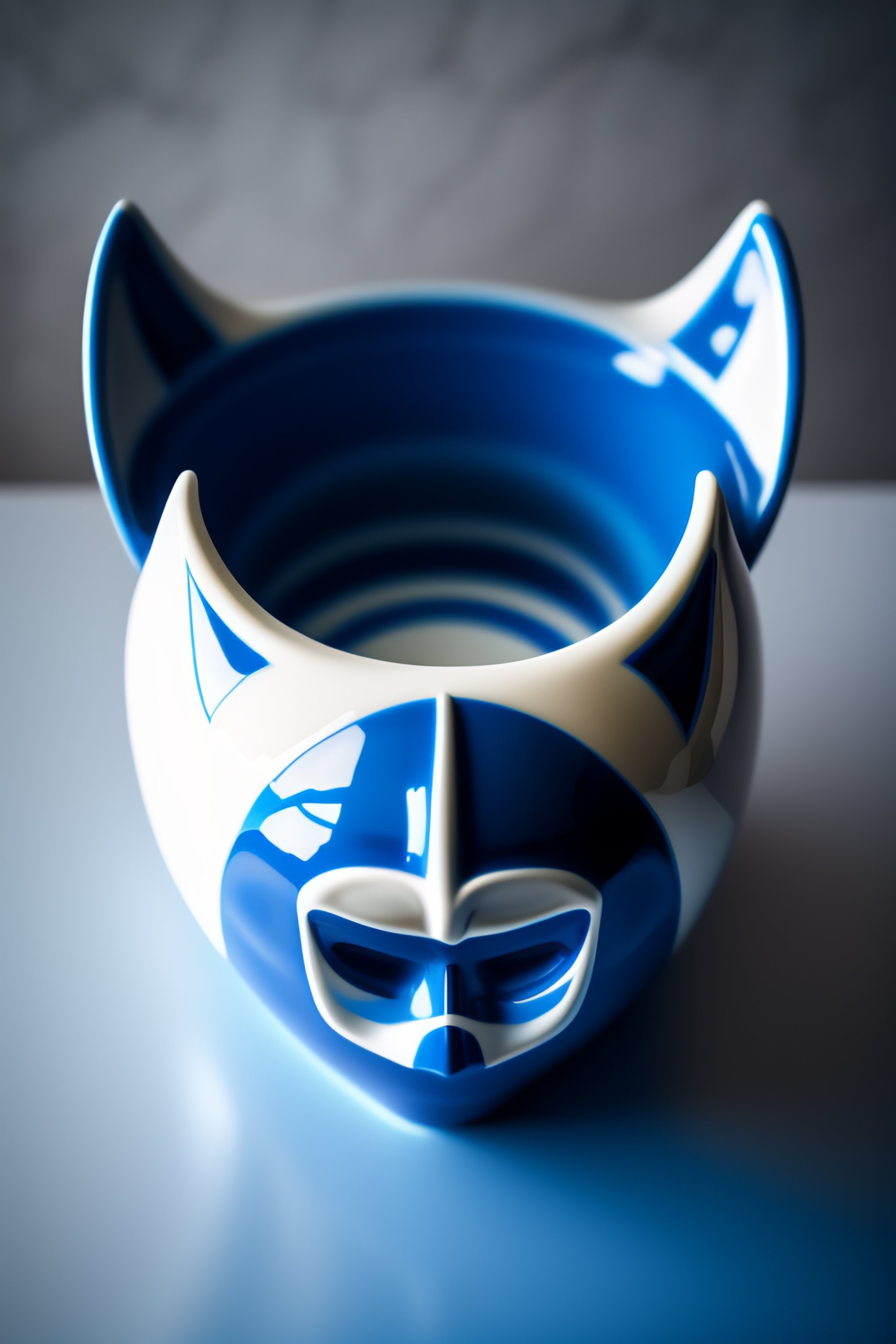 Batman mask as a japanese blue and white pottery, wide view, cinematic studio atmosphere, film grain, intricate details, sharp focus, ultra realistic details, global illumination, 8k