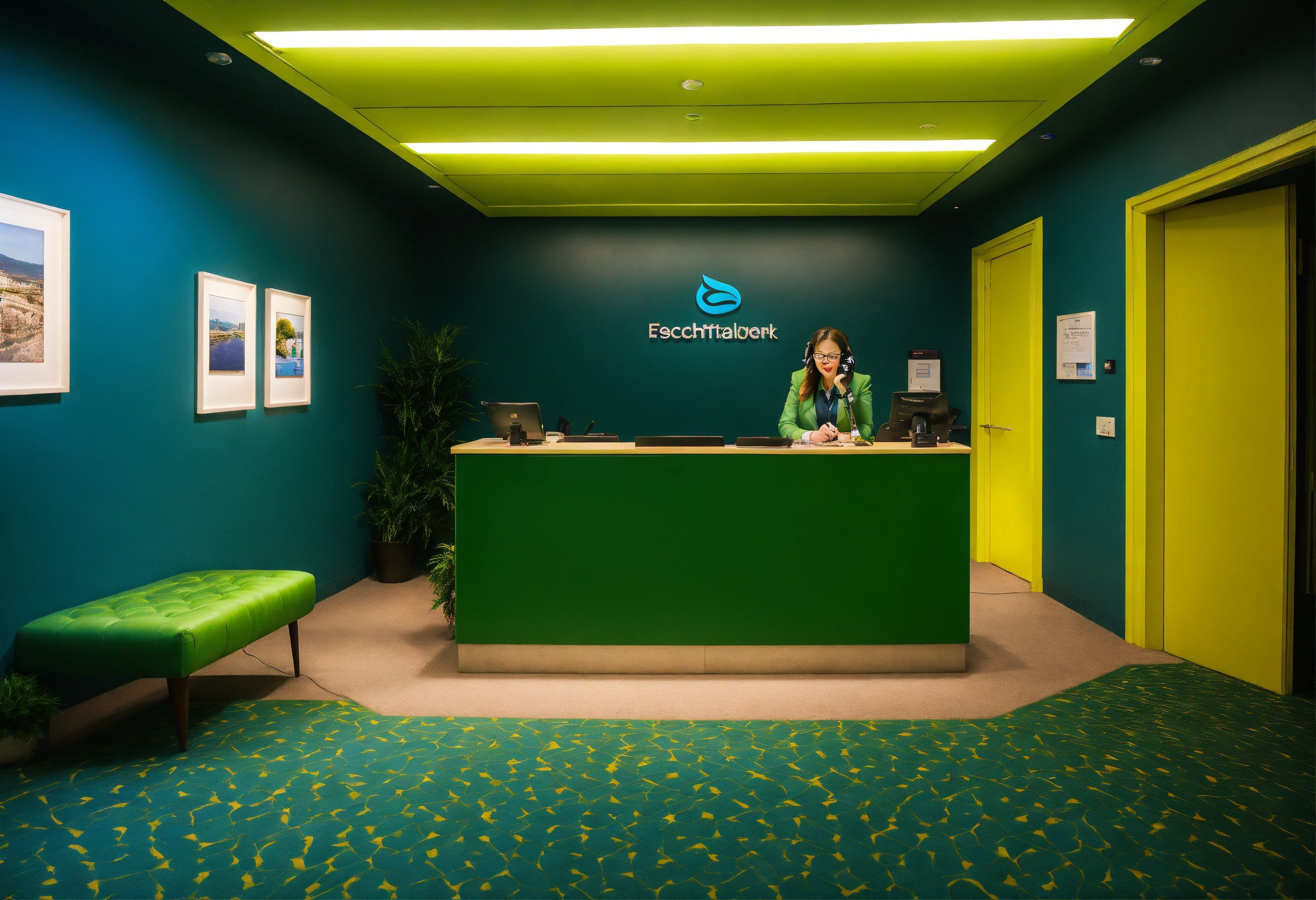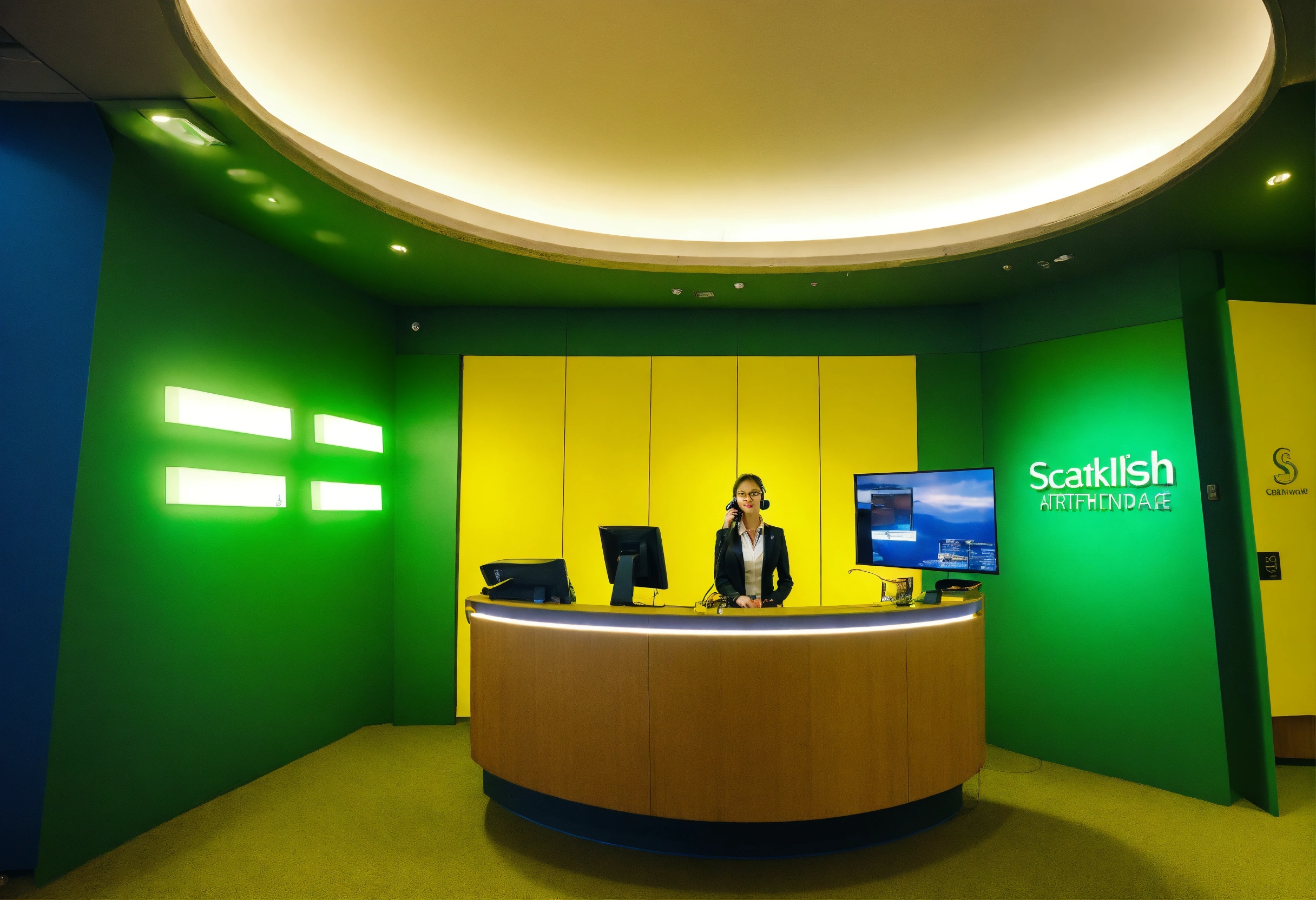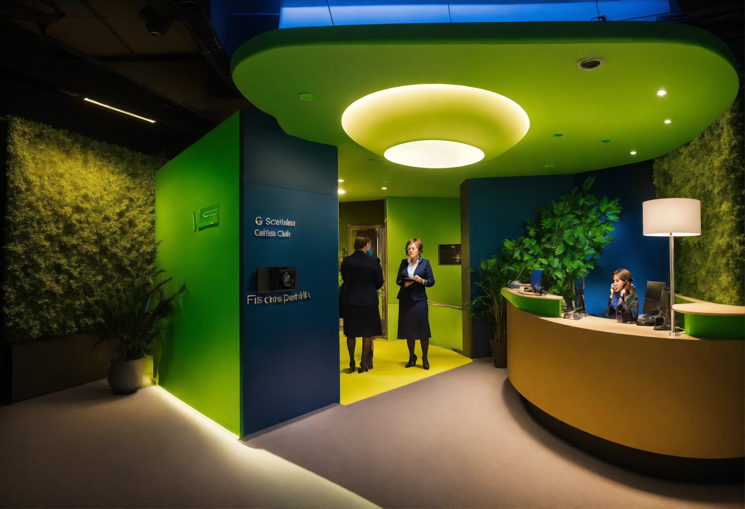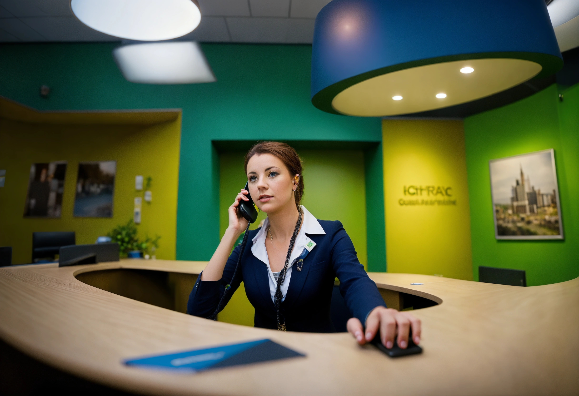 Ultra wide angle, fisheye lens, green entrance area, scottish female receptionist on the phone, rule of thirds, female figure to the right of the frame, looking into the background, blue and yellow artificial light.