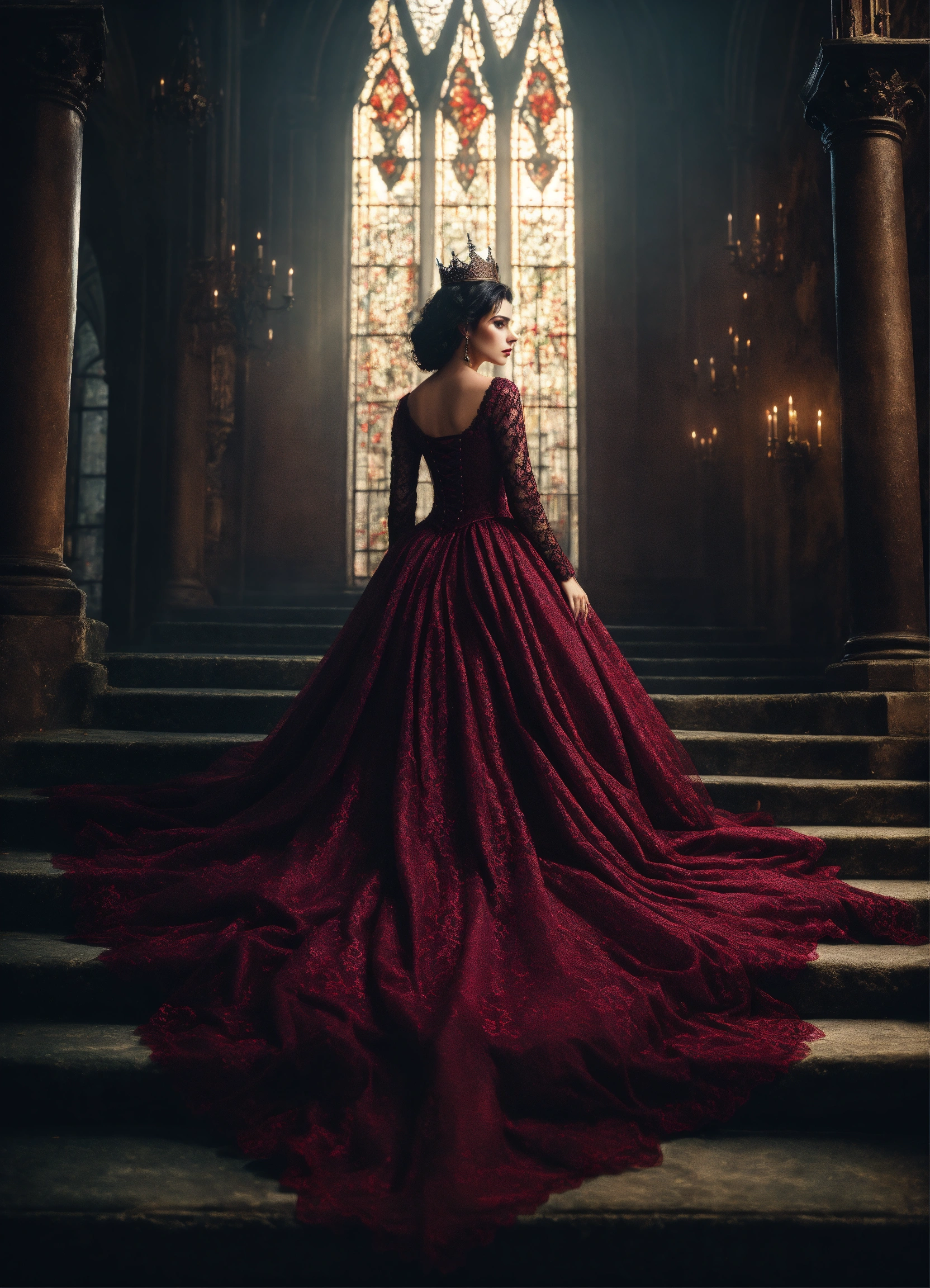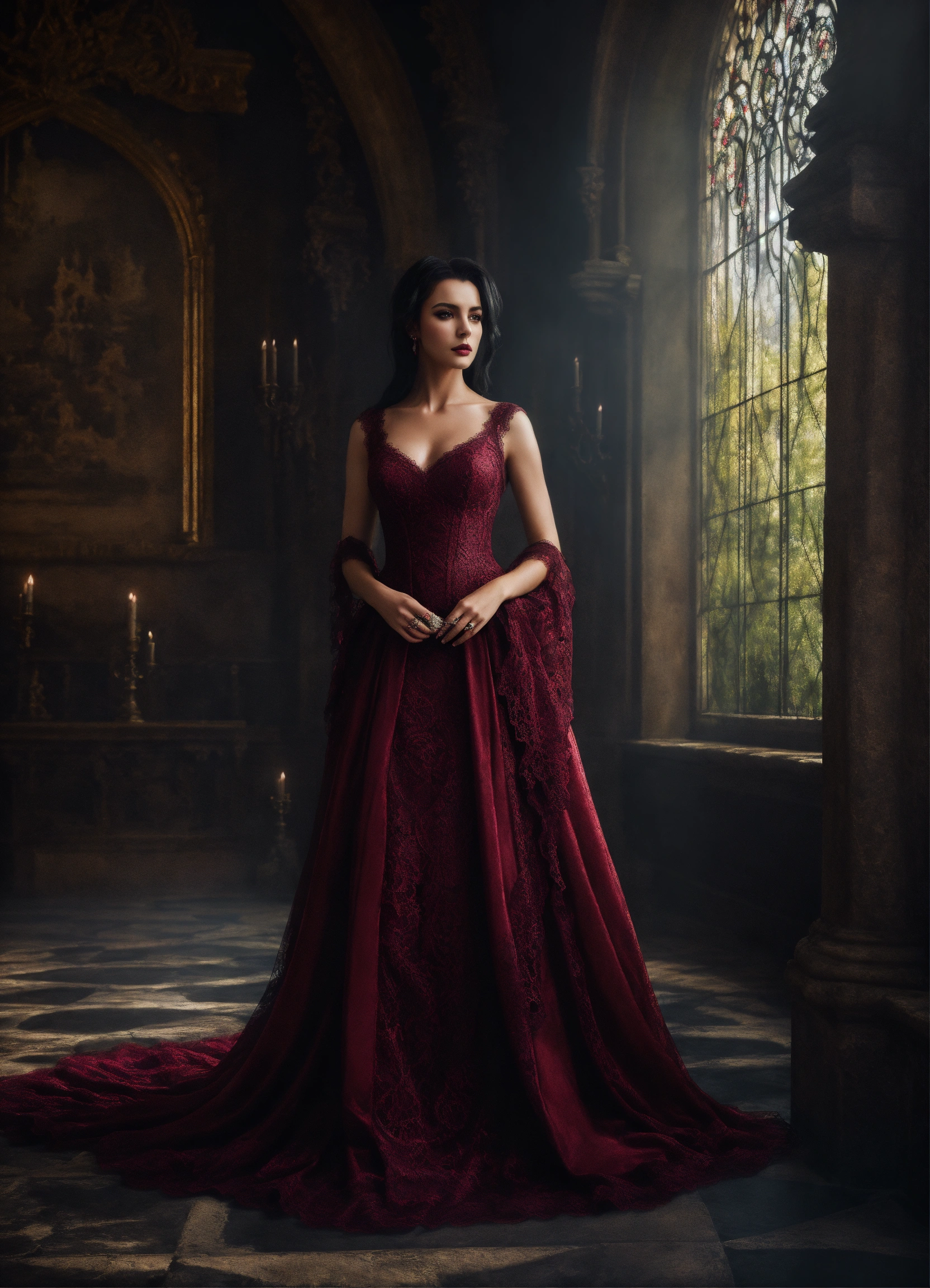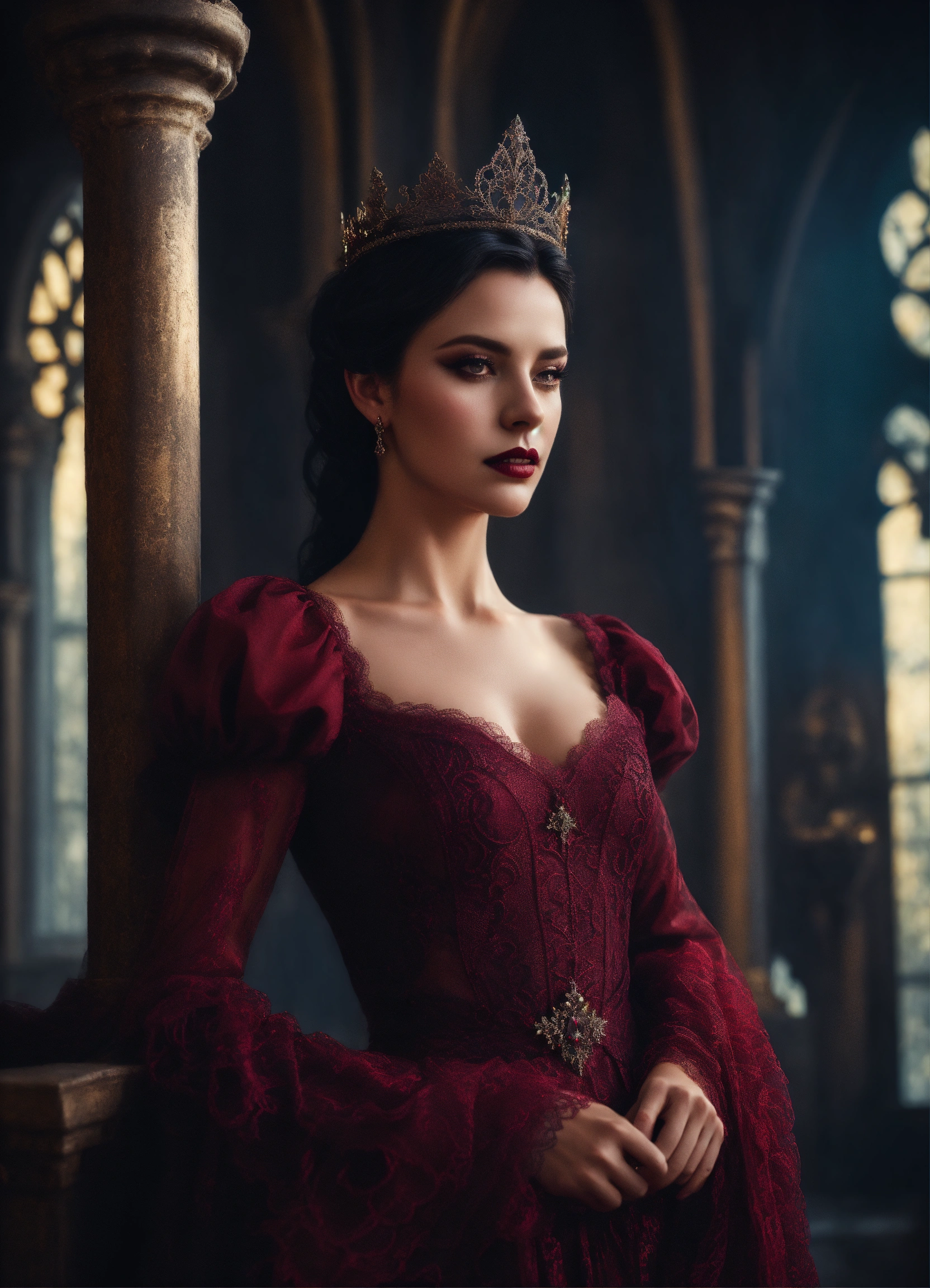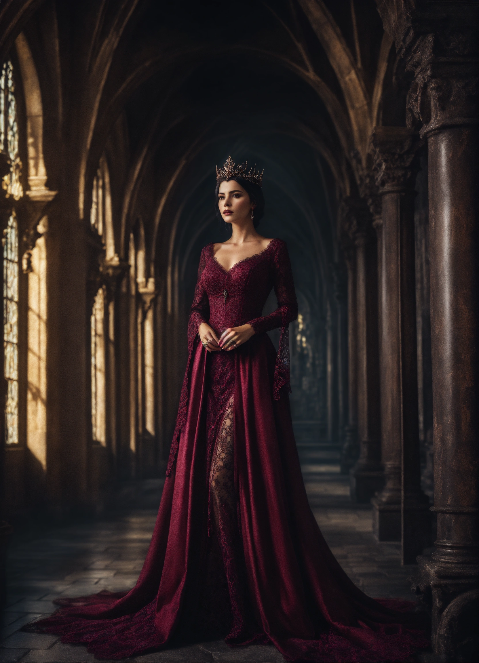Gorgeous dark haired dark european evil queen in lacy burgundy dress standing in gothic castle, mystic, dark fantasy, realistic photography, high detail, digital painting, cinematic, stunning, hyper-realistic, sharp focus, high resolution 8k, crazy detailed