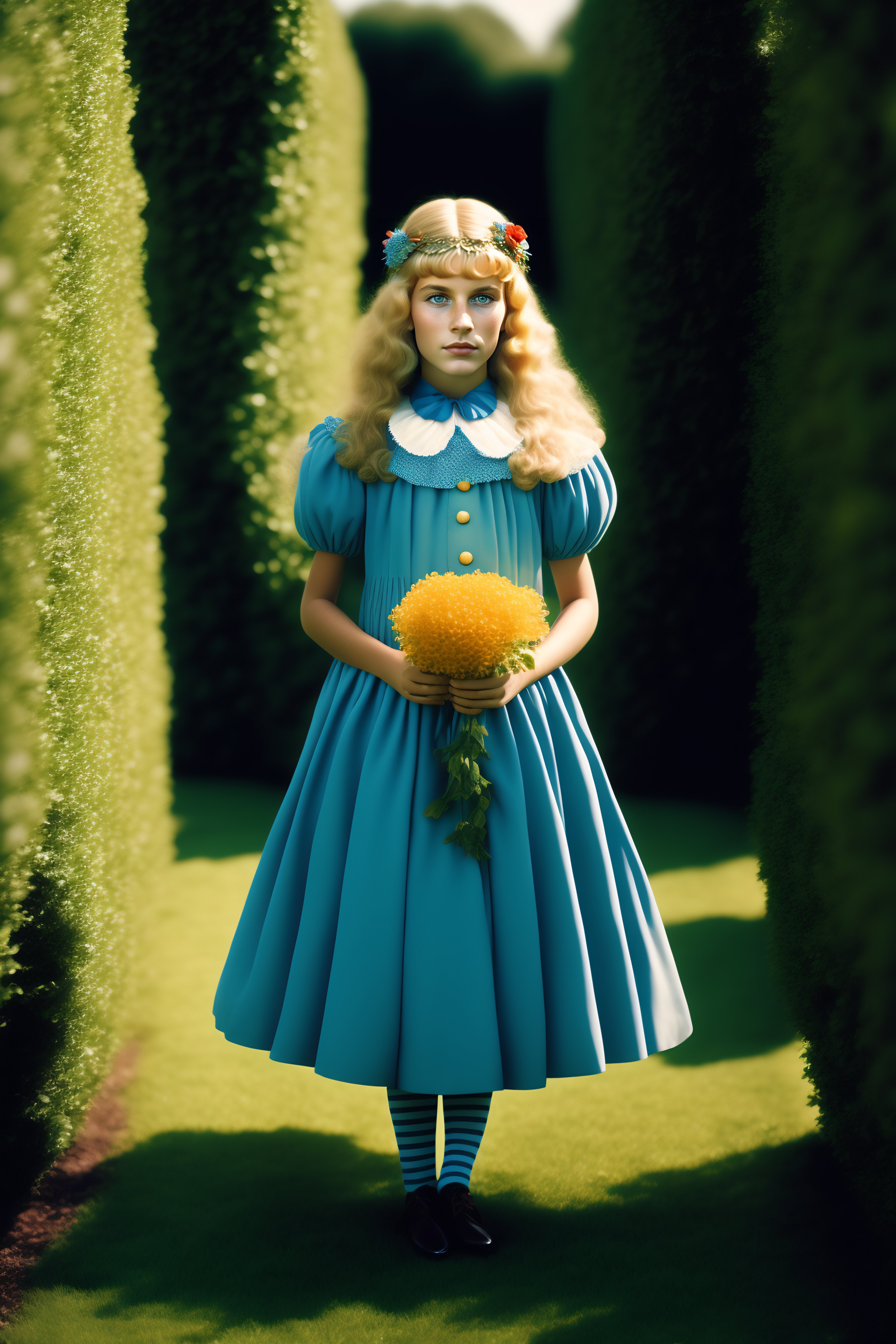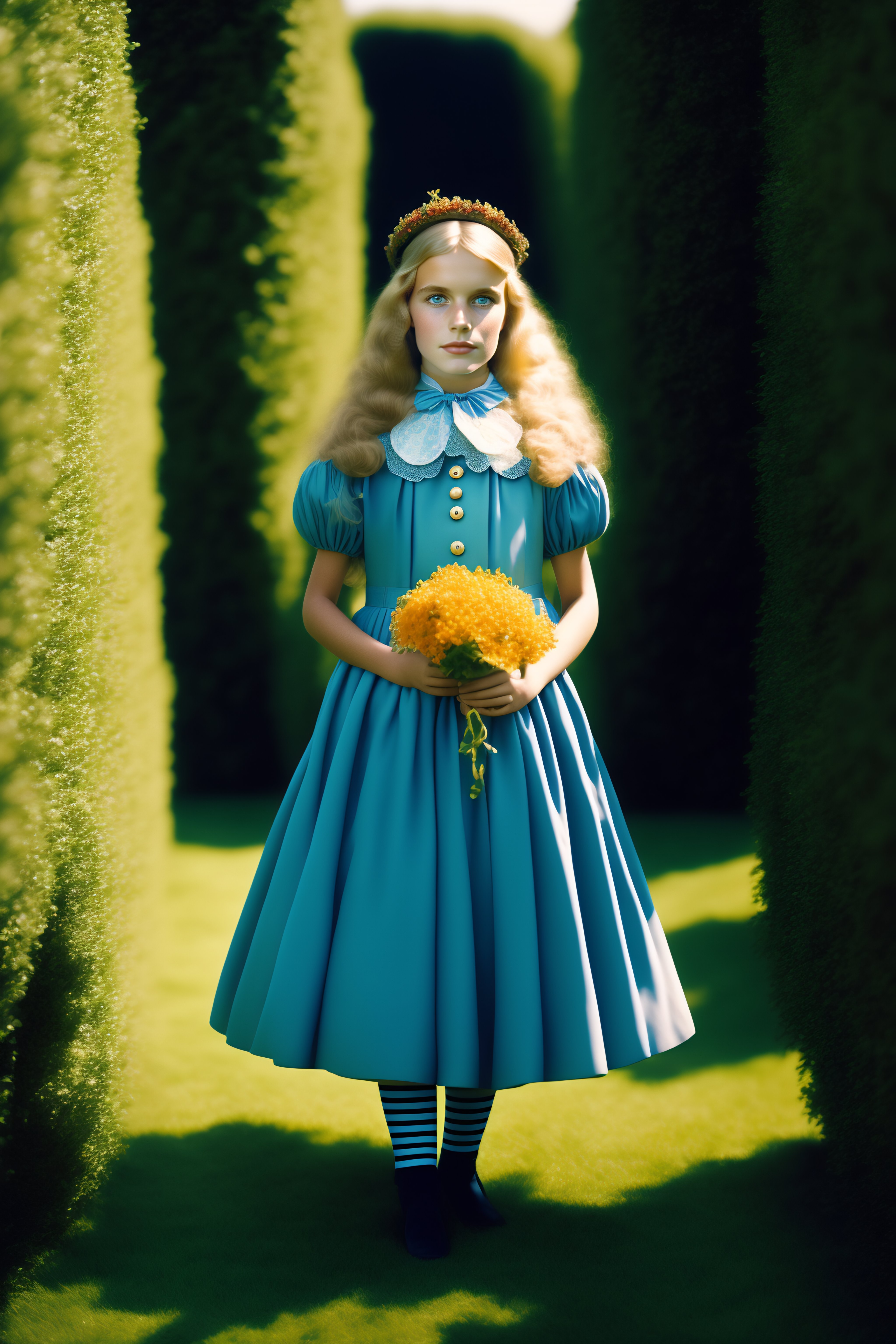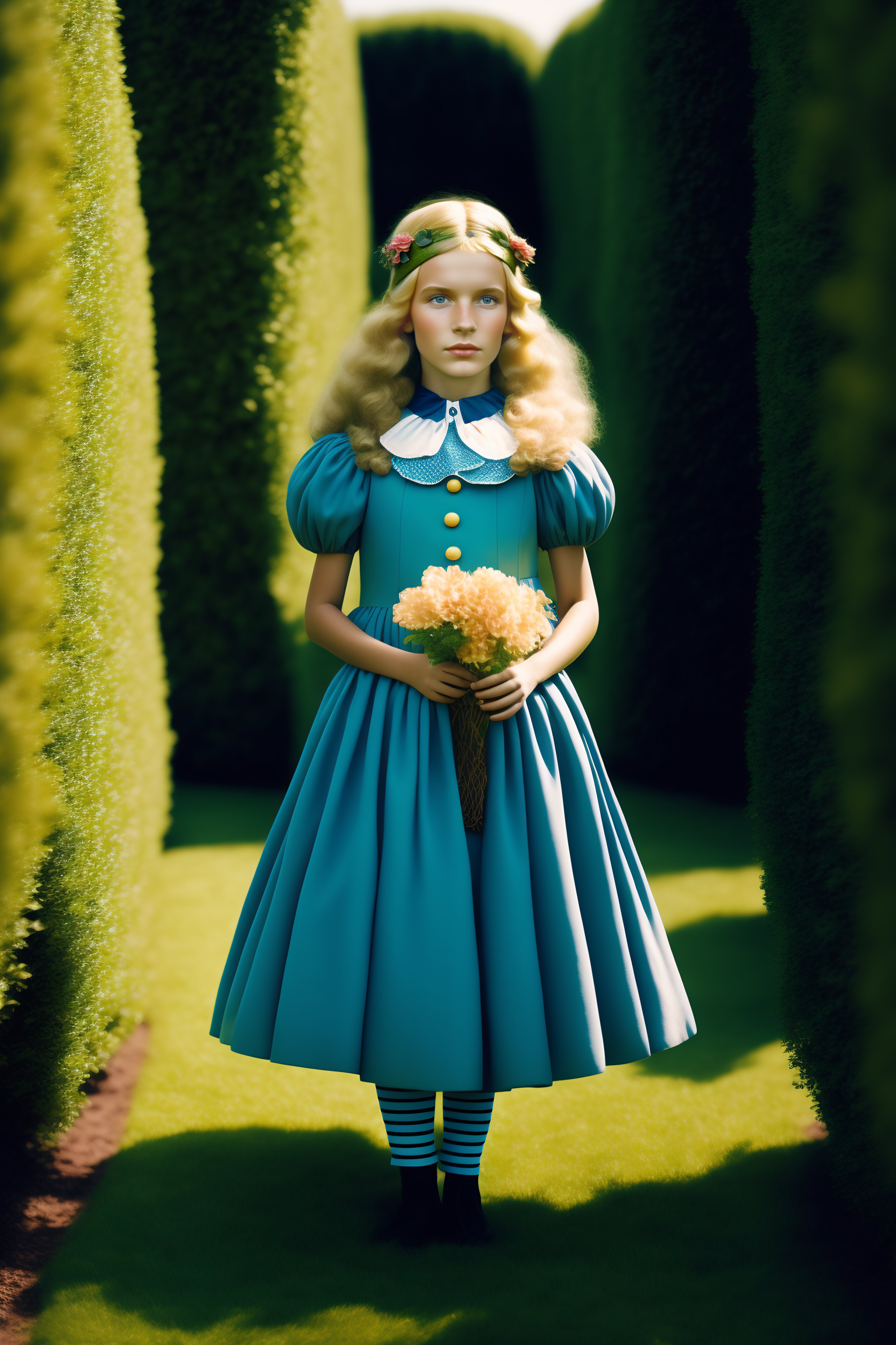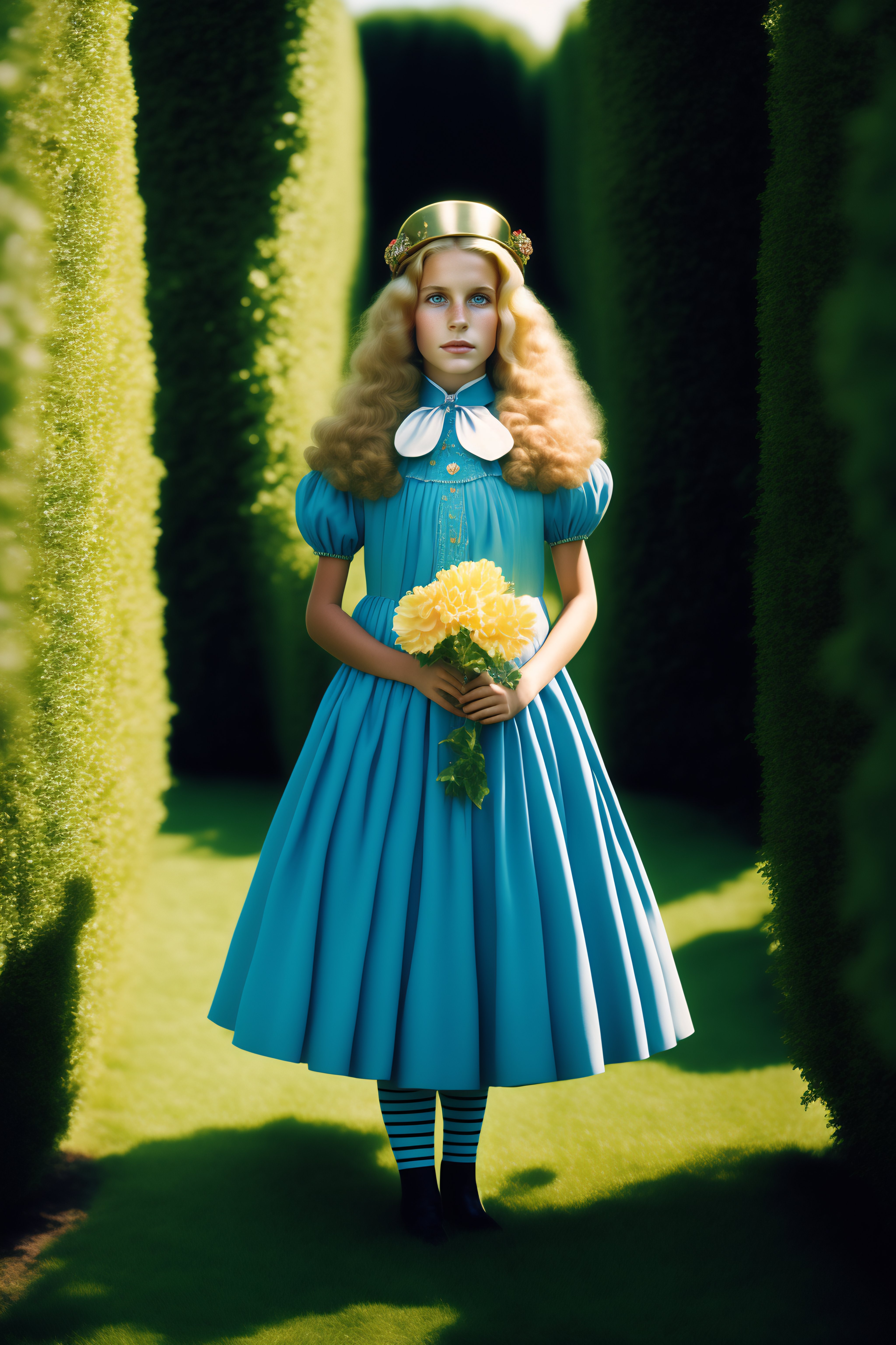 Boris beckers daughter as alice in wonderland in 1972 in giant hedge labyrinth, hasselblad, photo by brian ingram, david lazar, lisa kristine, steve mccurry, high quality, symmetrical face, clear skin, 4 k, dramatic lighting ”