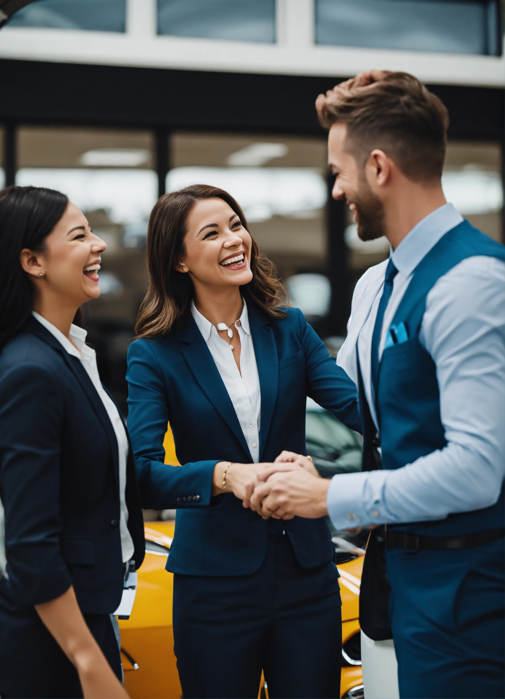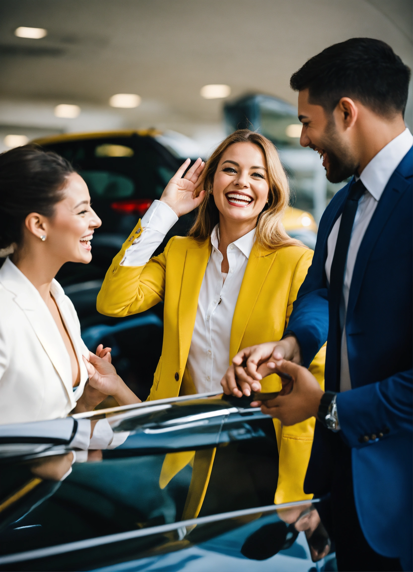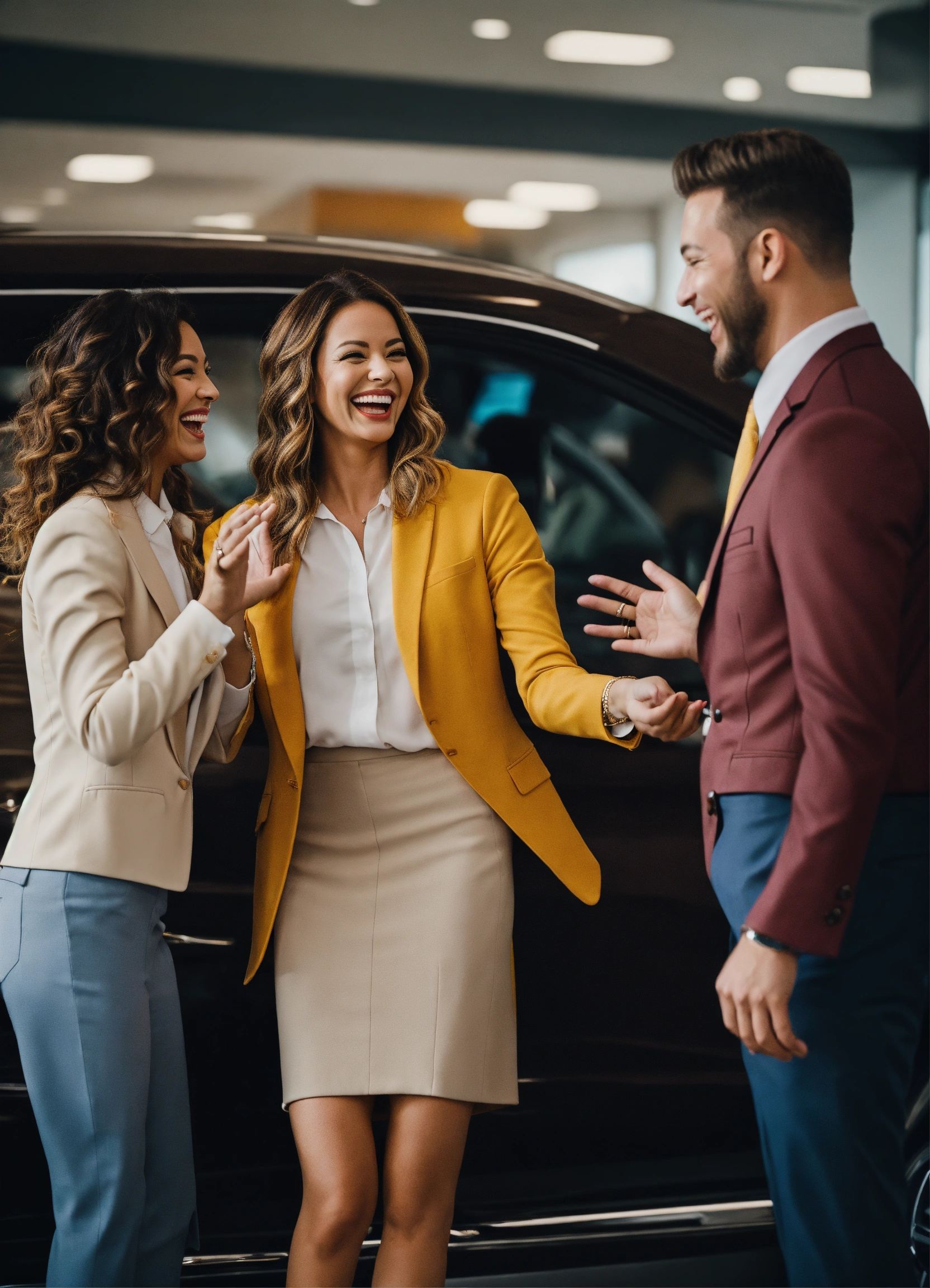 Candid photo at a car dealership of 2 women and 2 men, the woman are younger than the men, they are all dressed in professional attire and are matching, they are laughing with each other and giving high fives because they are very successful