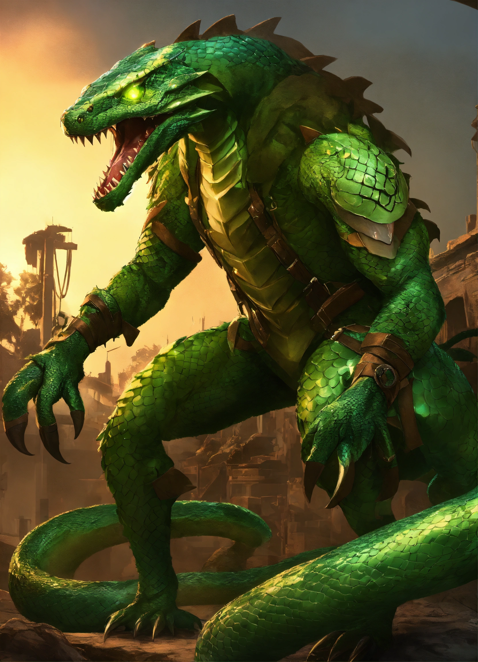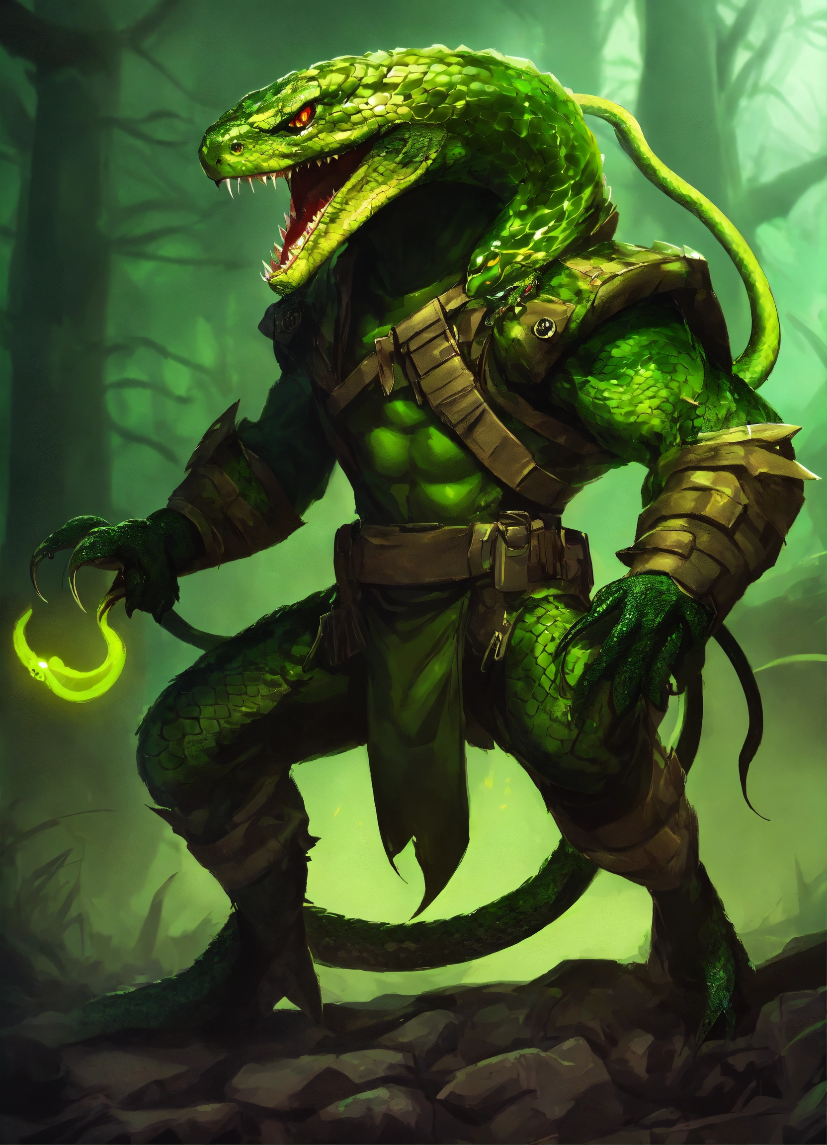 A bipedal snake monster with arms and leg, dark green scales, sharp fangs, and glowing green eyes. the snake monster is wearing up torn up green military gear. the snake monster used to be a snake man who was a mercenary.