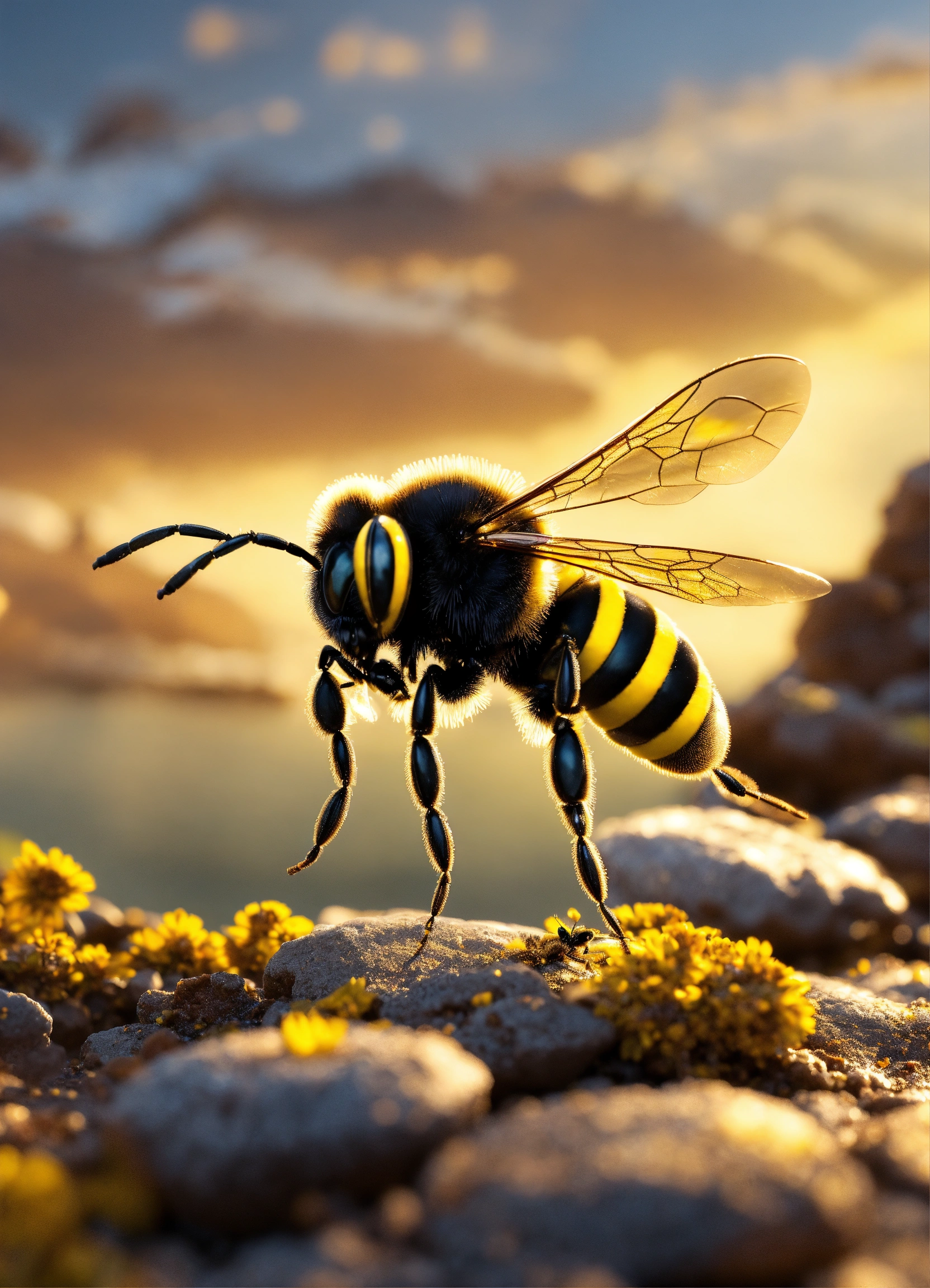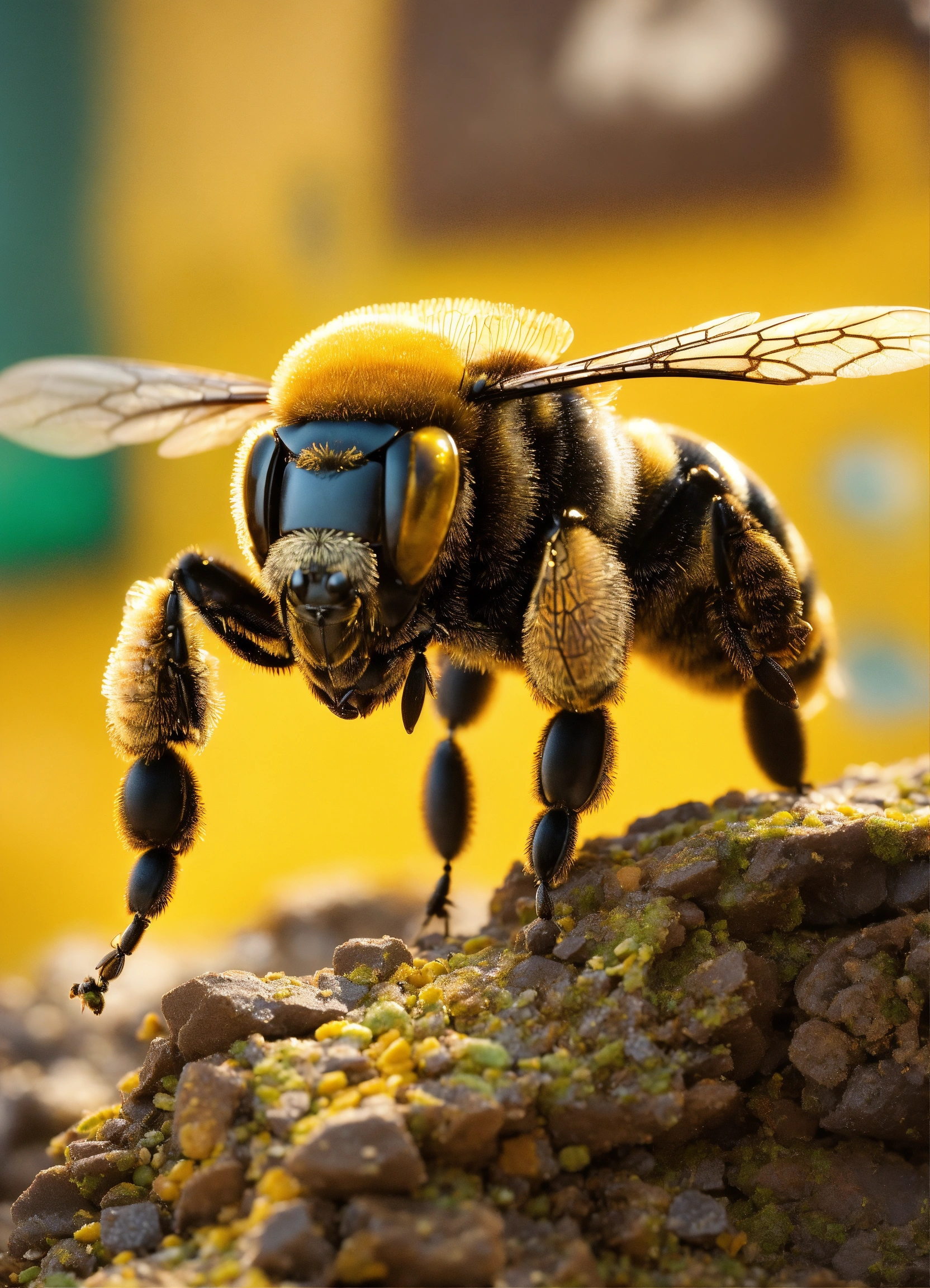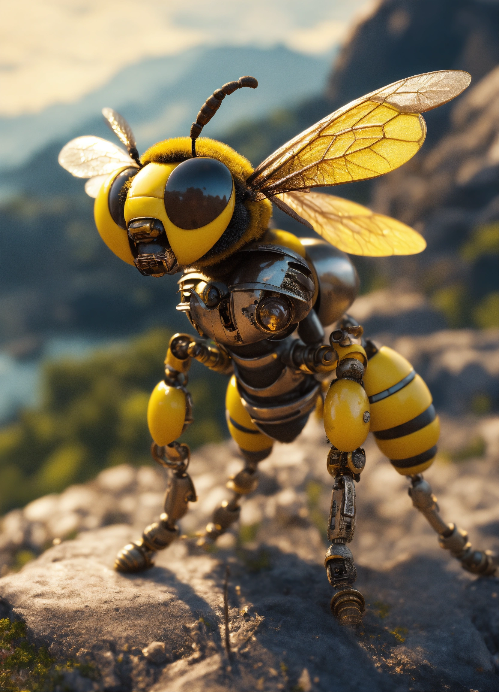 1️⃣ a bee that looks like a robot flying over a rocky road, in the style of realistic, detailed rendering, industrial decay, vray, frequent use of yellow, shot on 70mm, chromepunk, hudson river school
