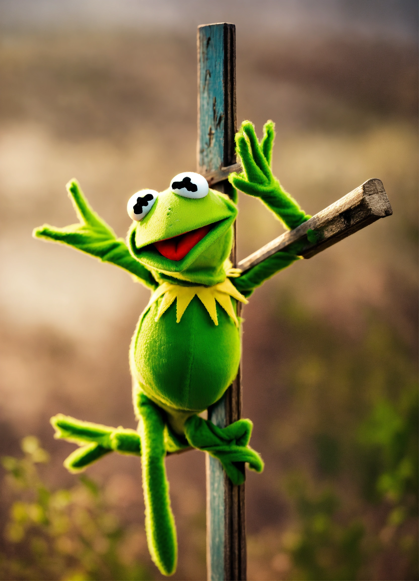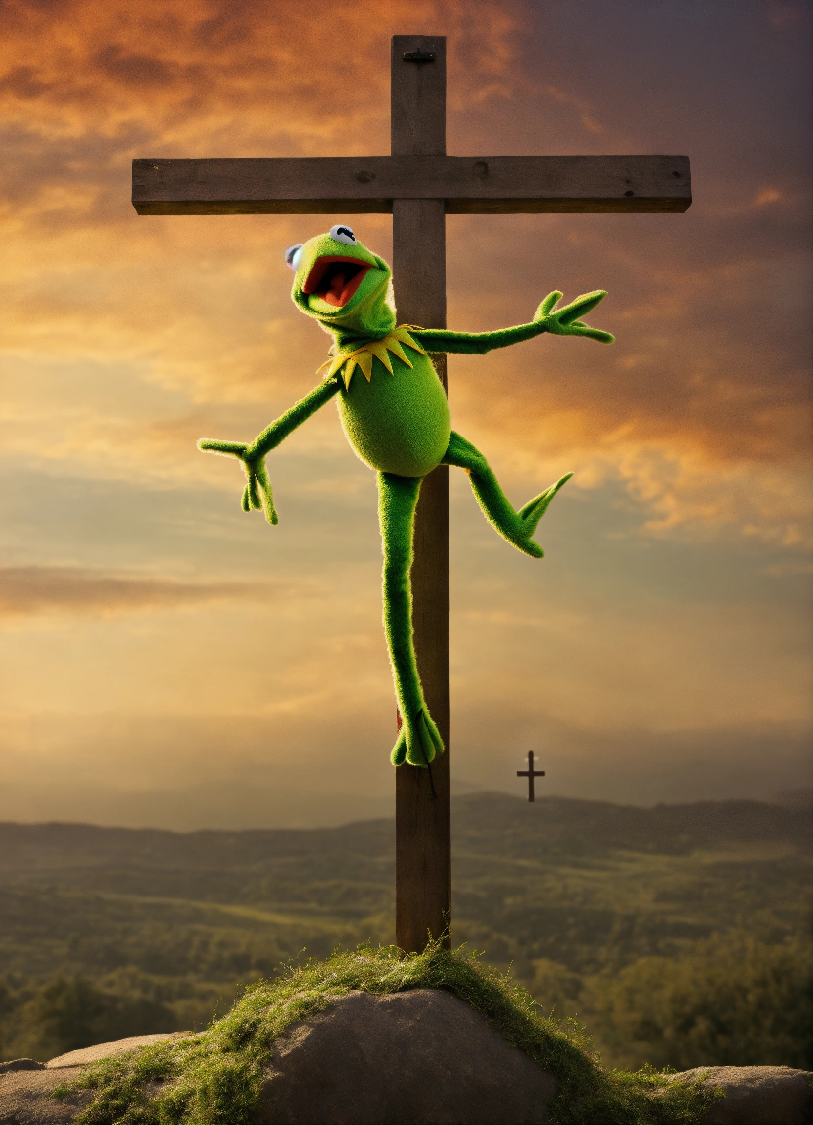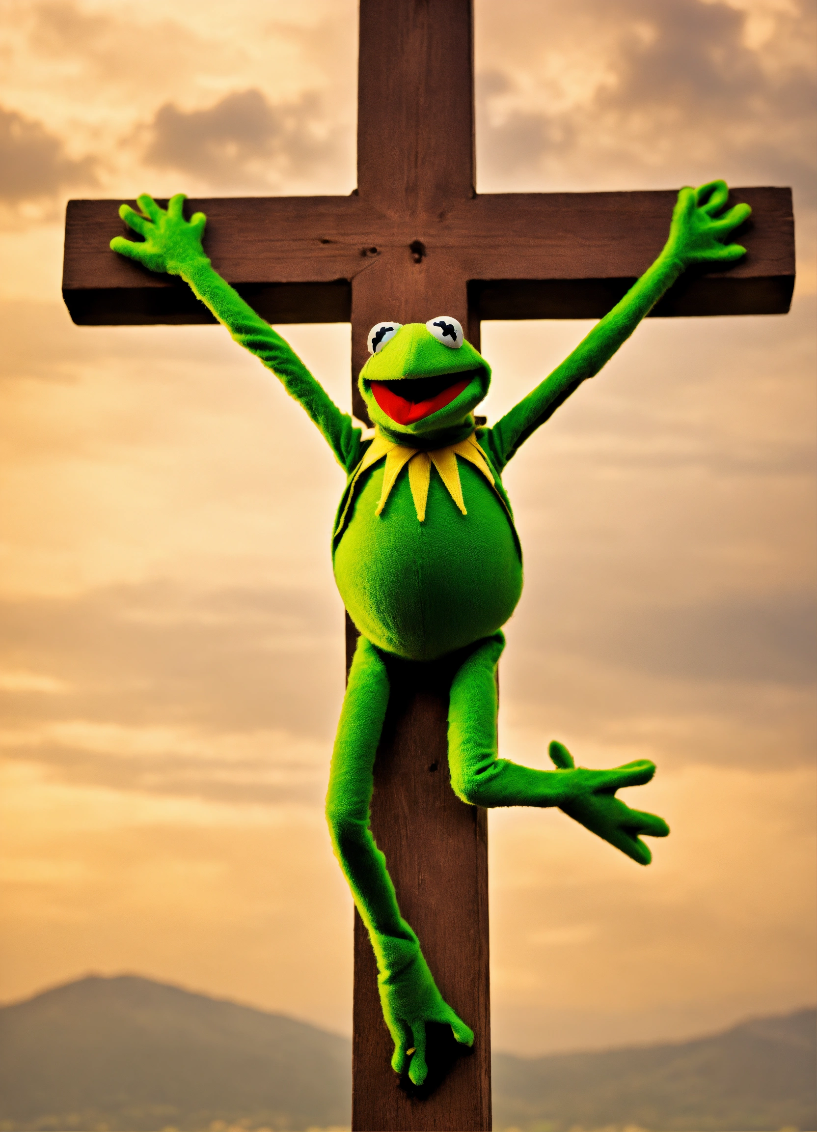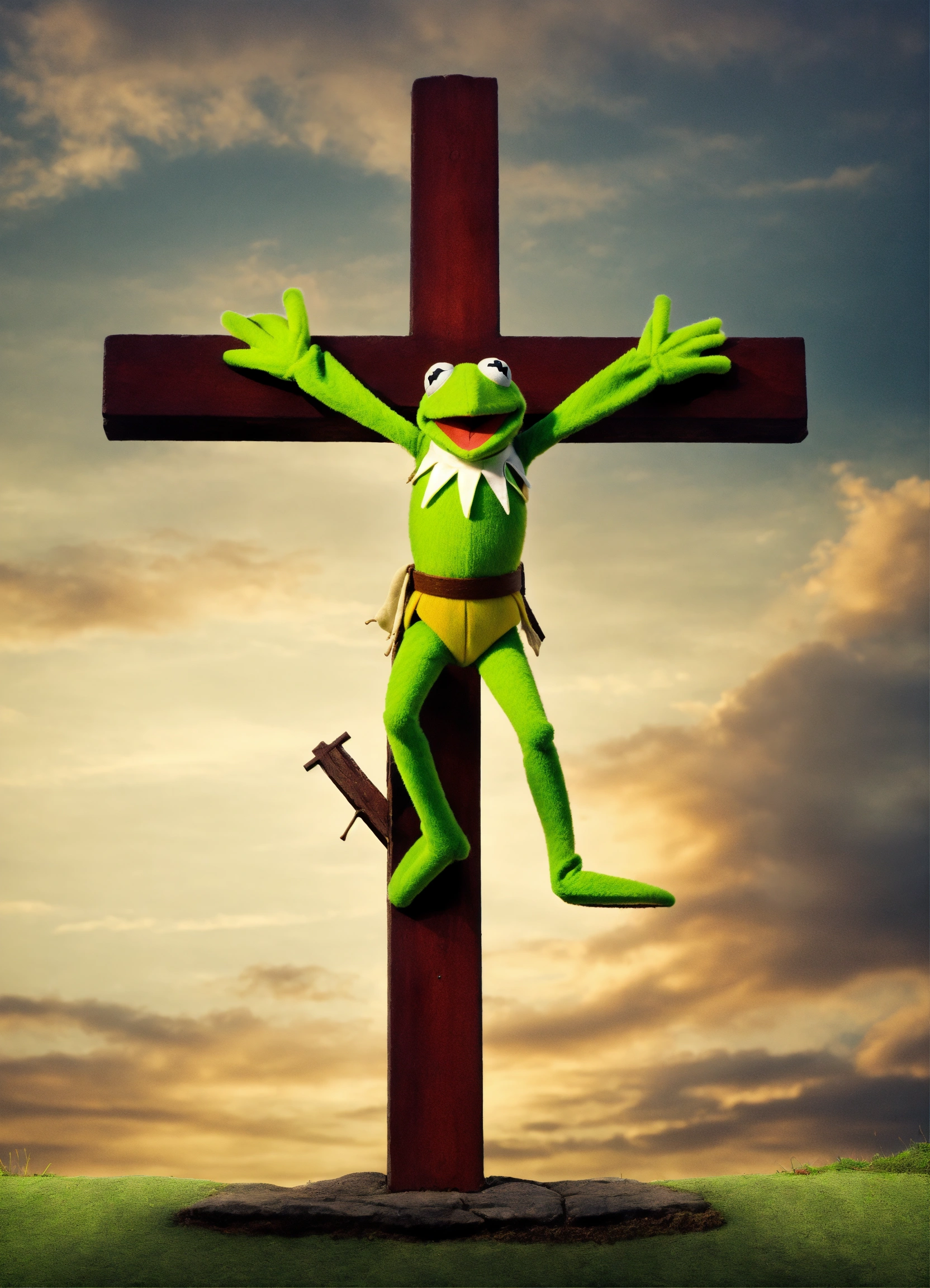 Kermit the frog with arms outstretched hanging on a cross on calvary