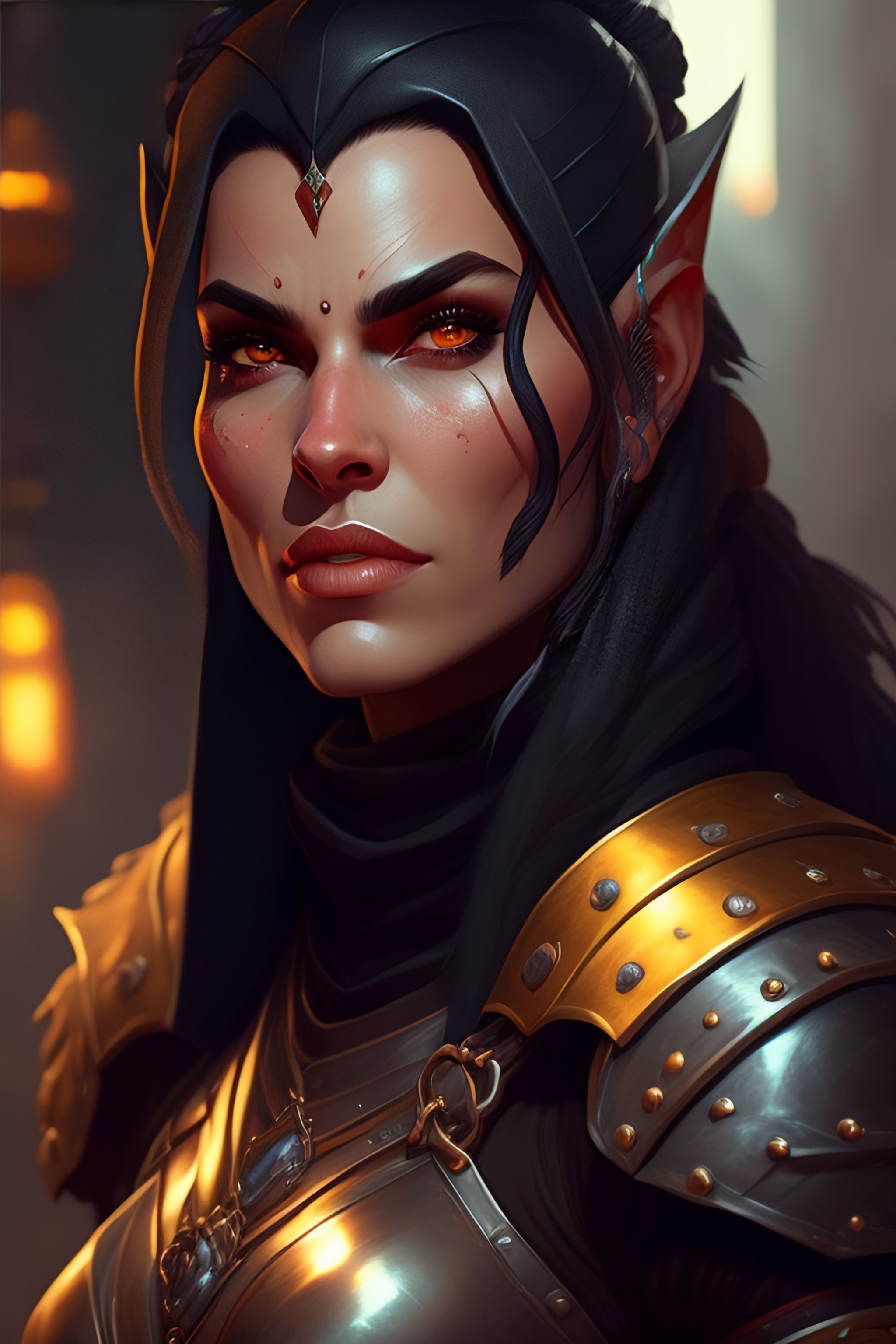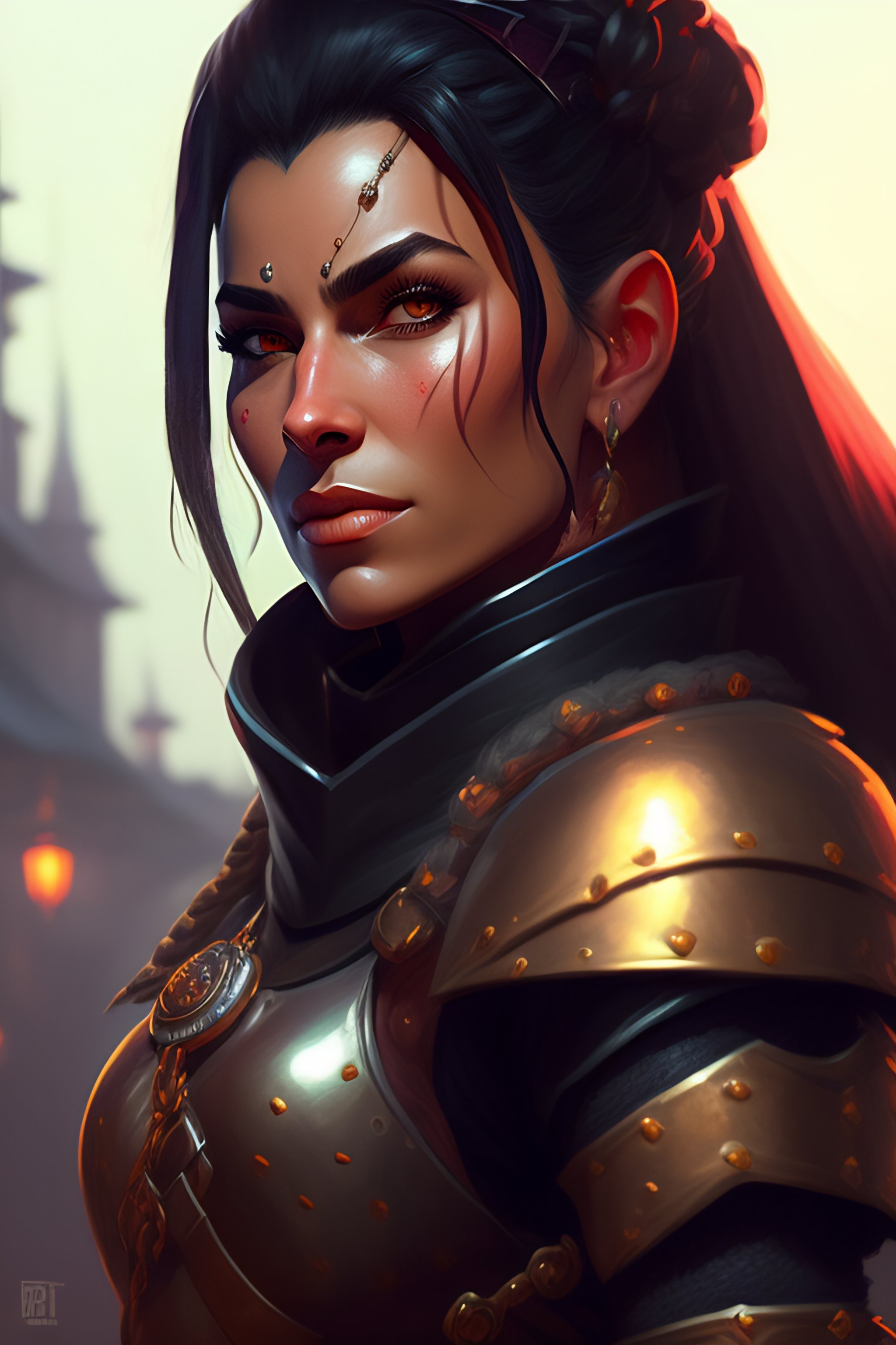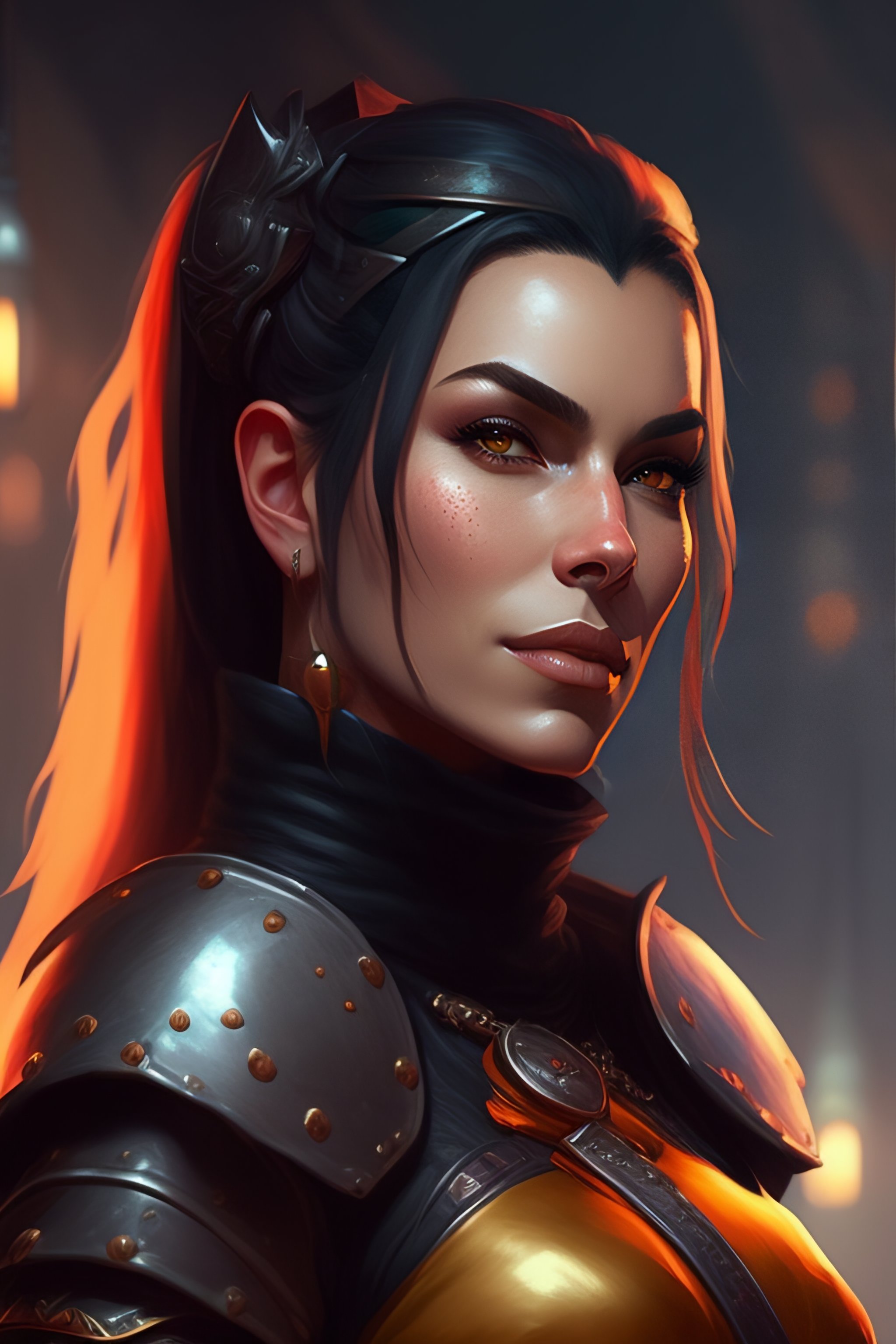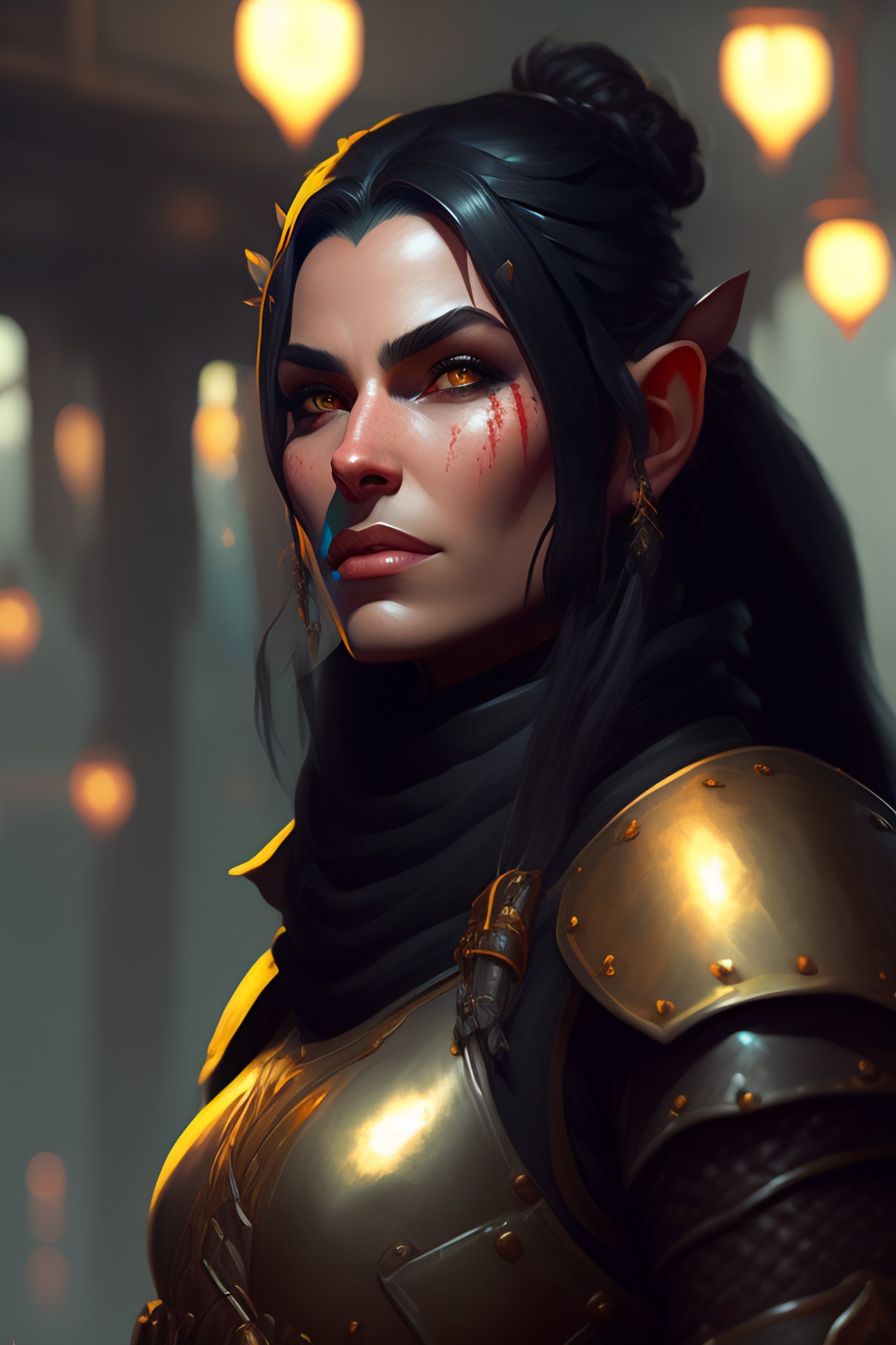 Portrait of a female orc rogue, black leather armor, tavern background., highly detailed, splash art, by atey ghailan and alice neel and simon stalenhag and darek zabrocki, digital art trending on artstation hq