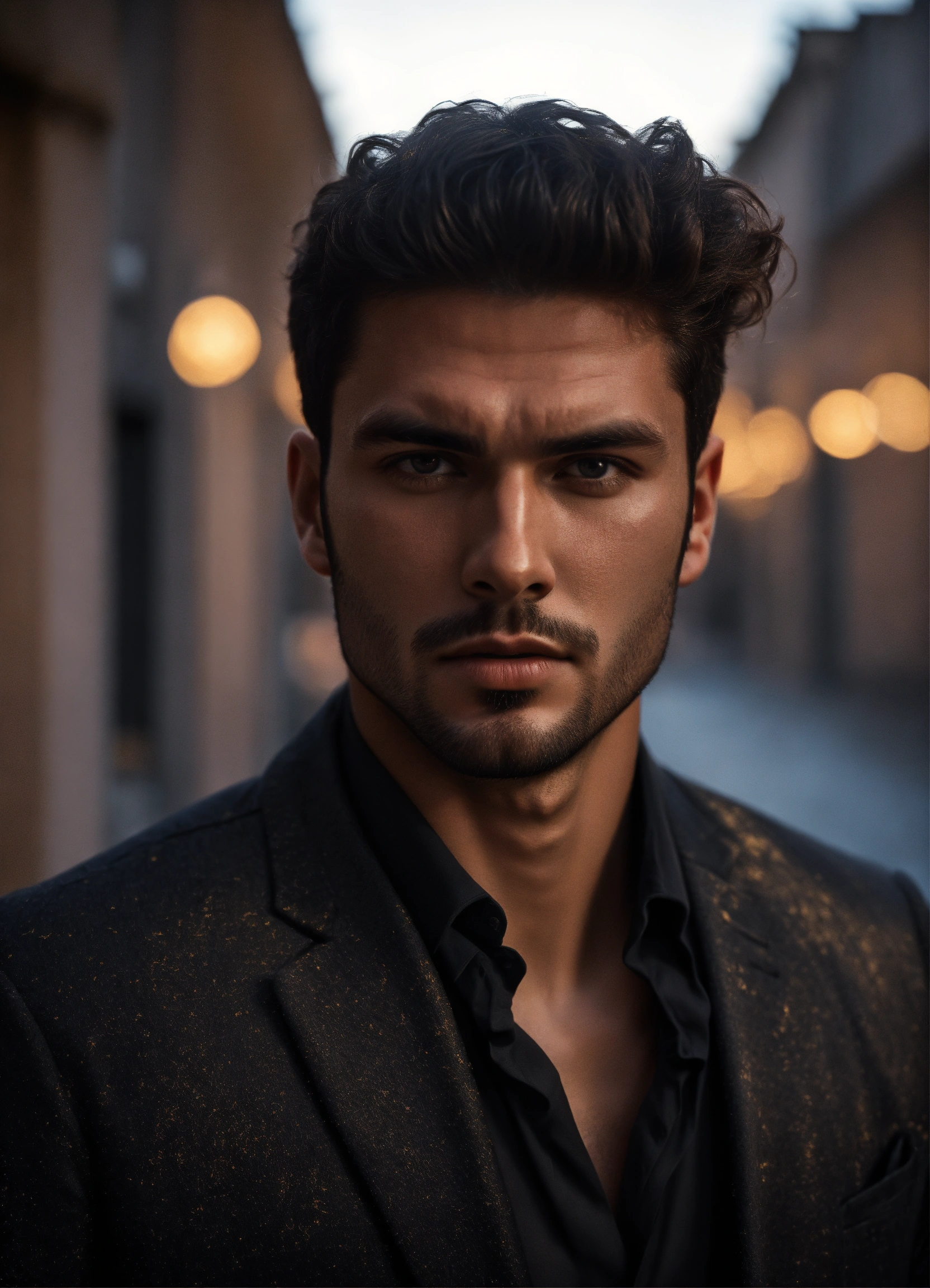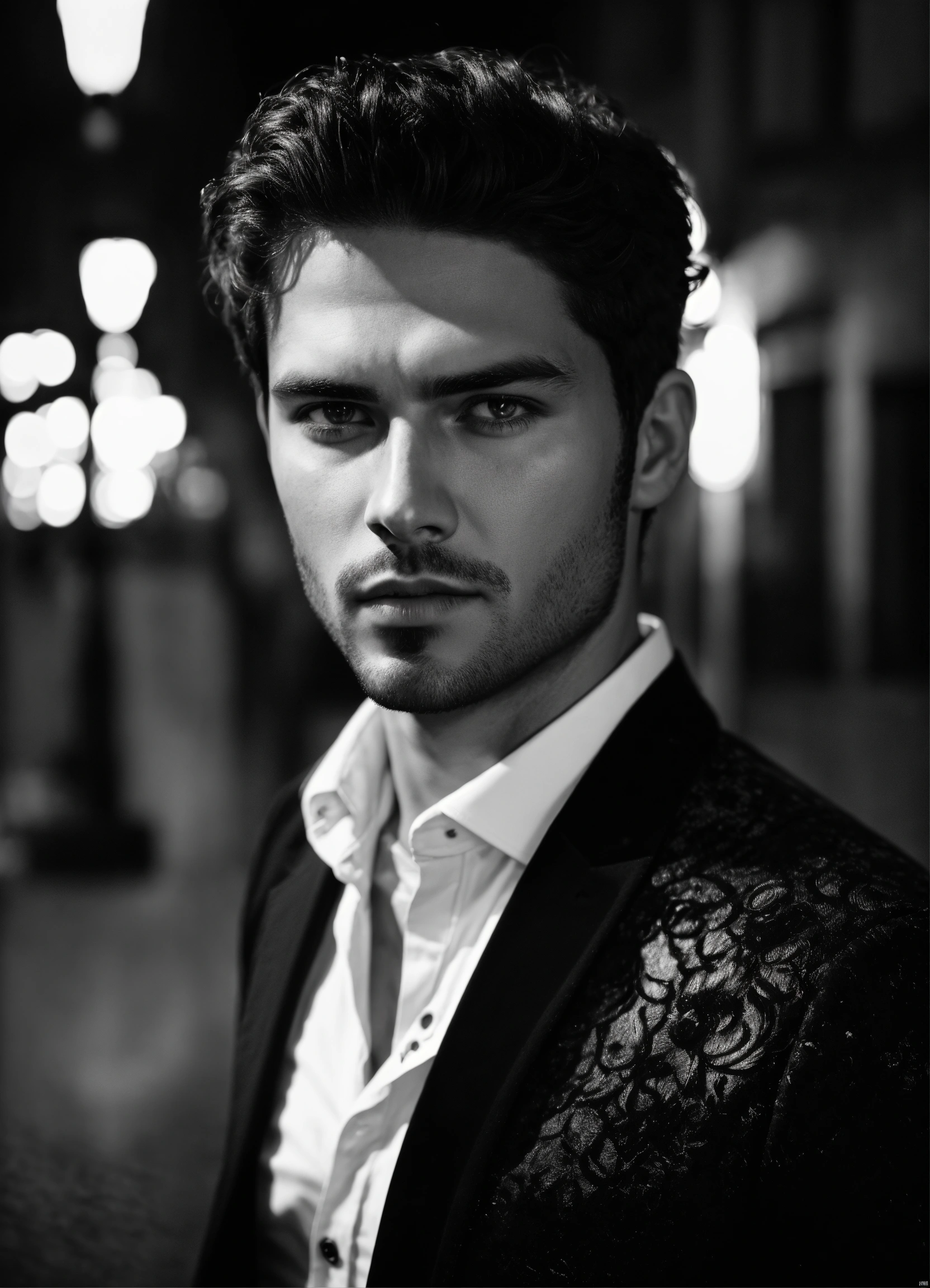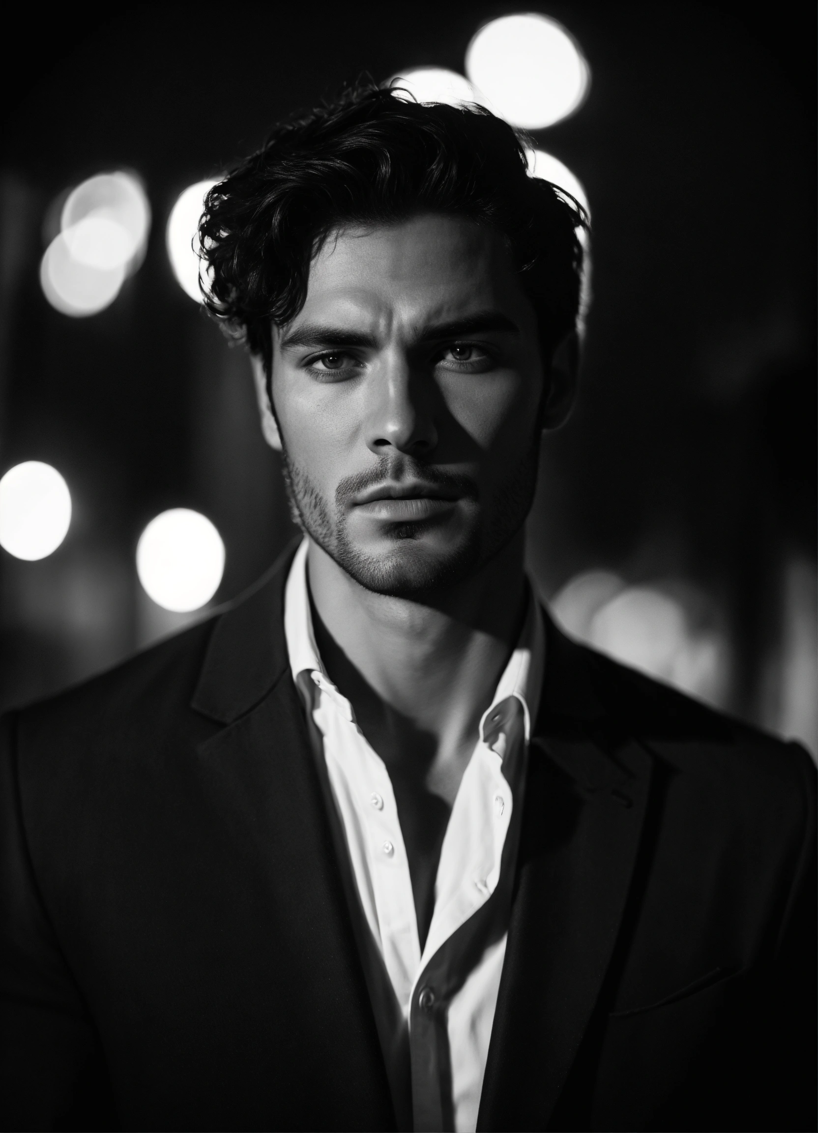 Photo of male model gonçalo teixeira, black and white, realistic, portrait, not painted, very detailed faces, skin with pores, 4k, dark suit, skin not smoothed, desire in the eyes, glowering, looking into the camera, dark shirt. antique rome at night as background