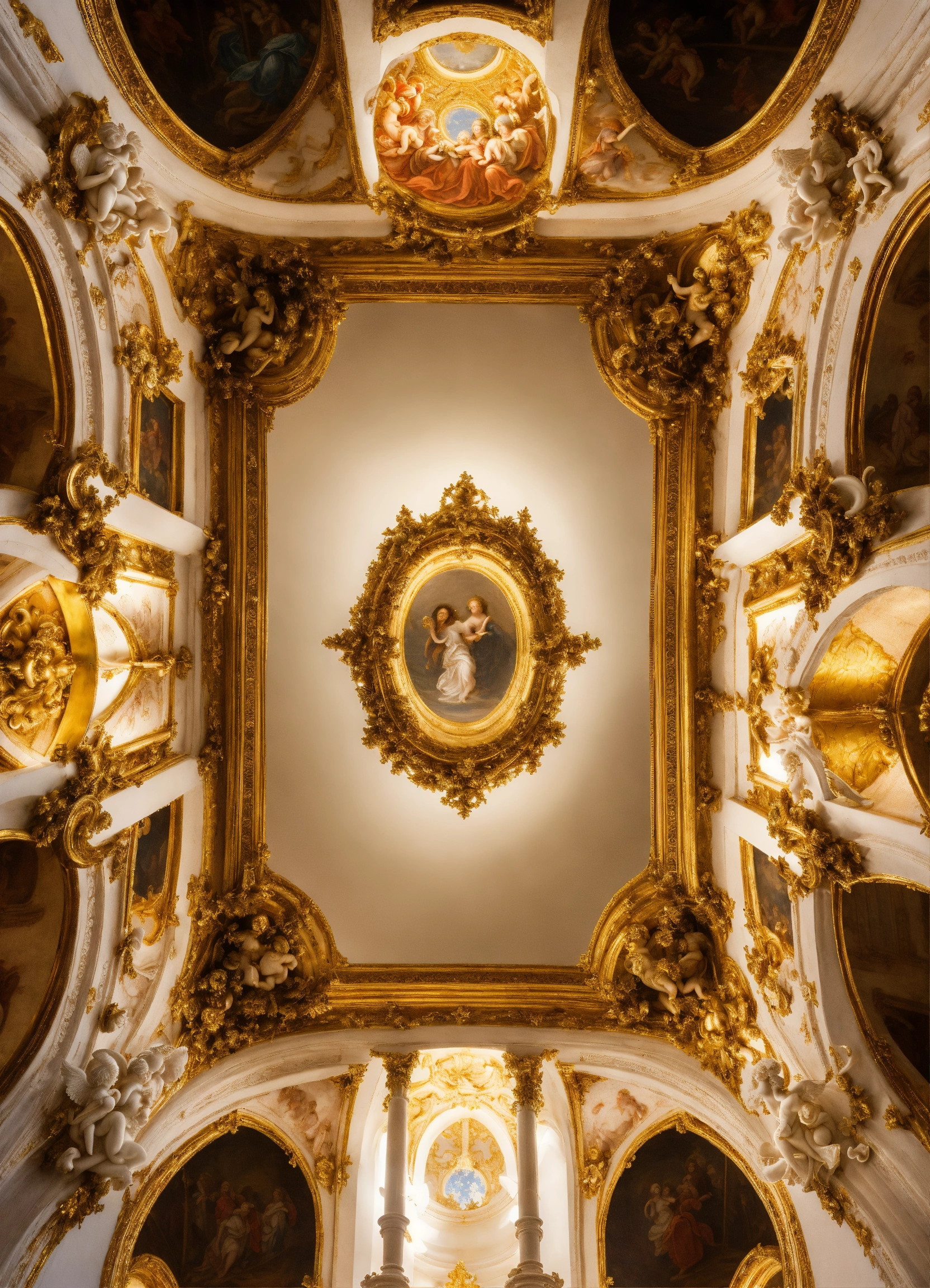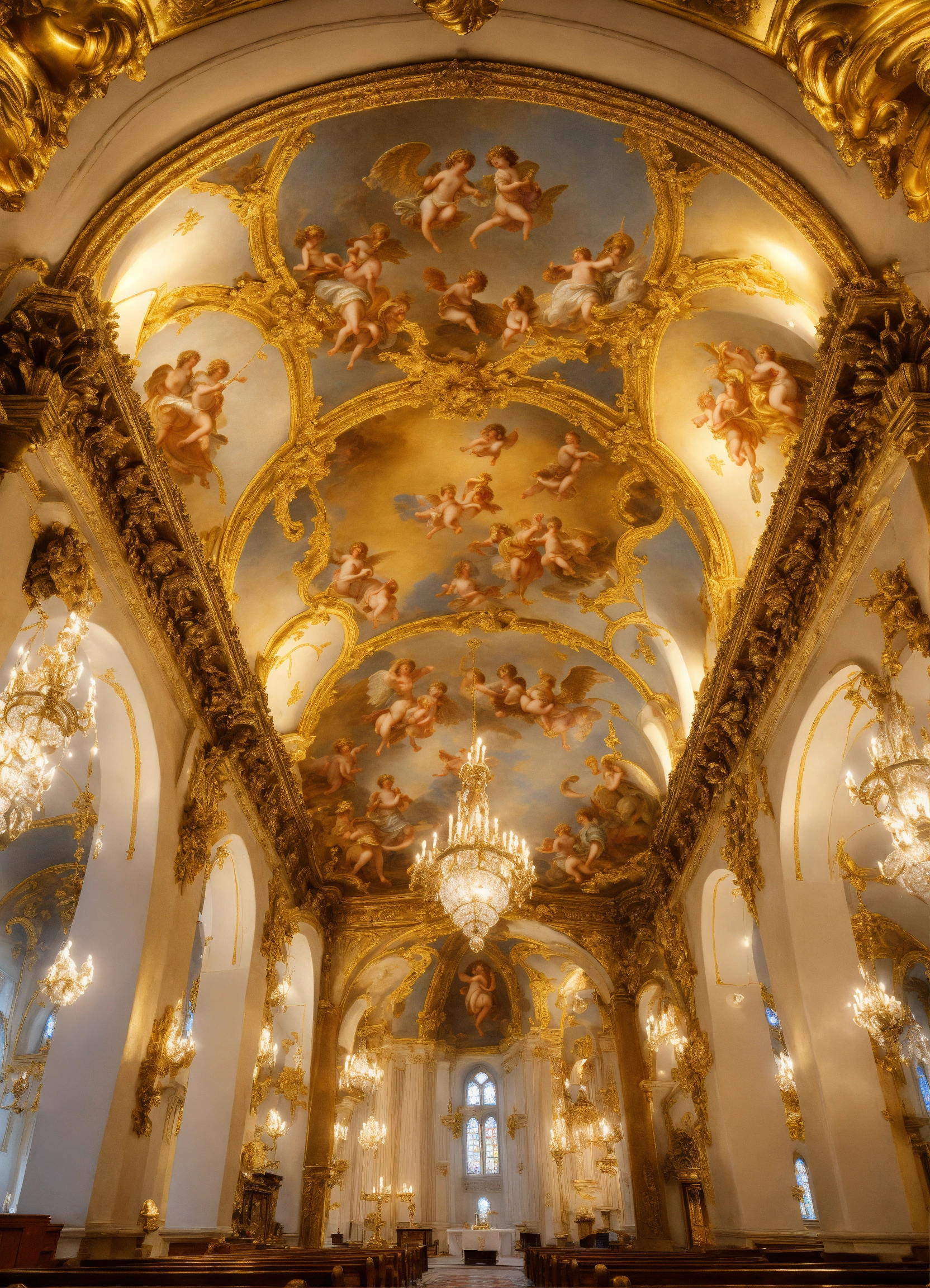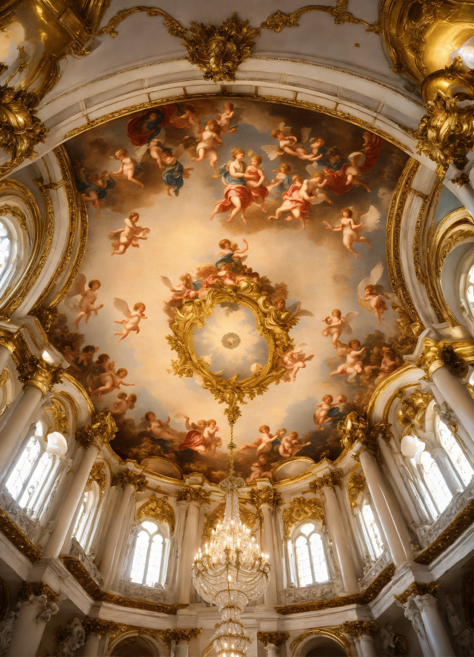 Mirrored, baroque style. multiple small angels, cherubs flying around the diamond, adorned with gold leaf scrolls, beautiful, christmas ornament, luxury, catholic, mother of pearl, champagne gold and bright gold, rococo, large nautilus pearl seashell, inside of a elegant church abbey ceiling, roman art, white pillars