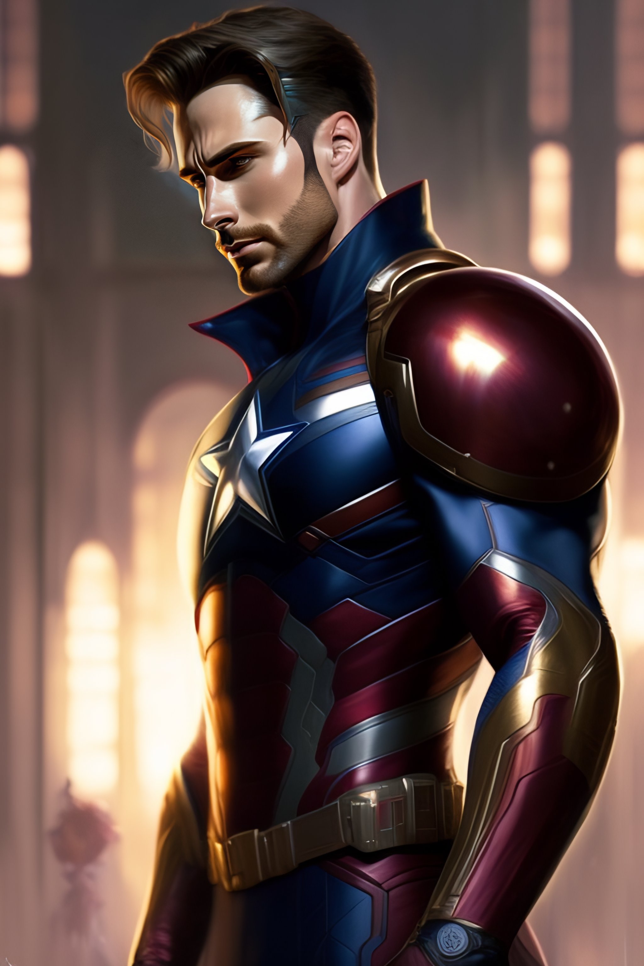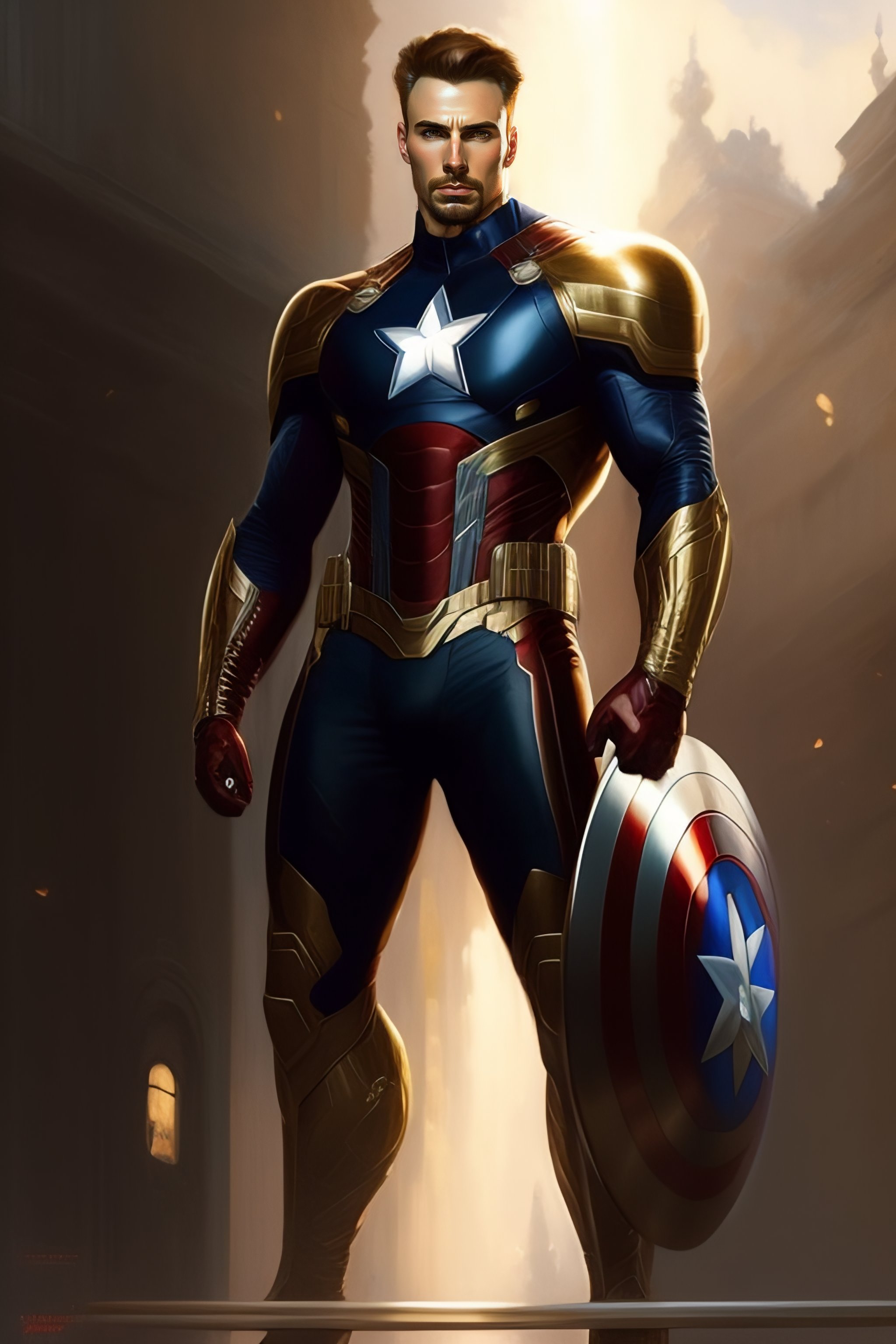 Full body potrait thin muscular chris evans in captain america civil war suit standing with a confident, nonchalant expression on his face anime version, his unassuming appearance belying his incredible strength art by greg rutkowski and alphonse mucha