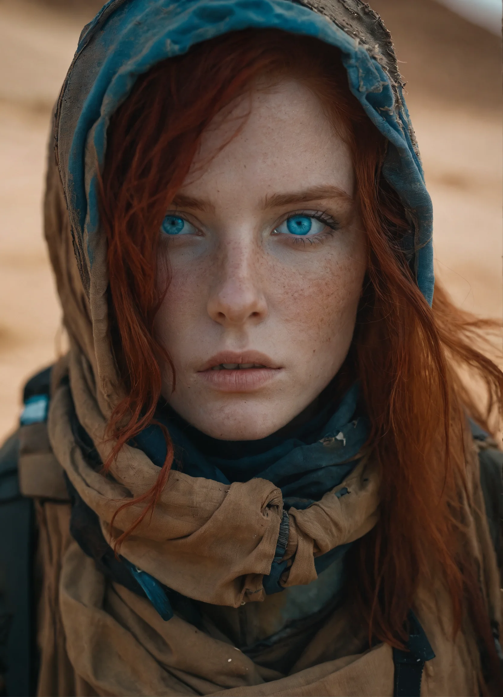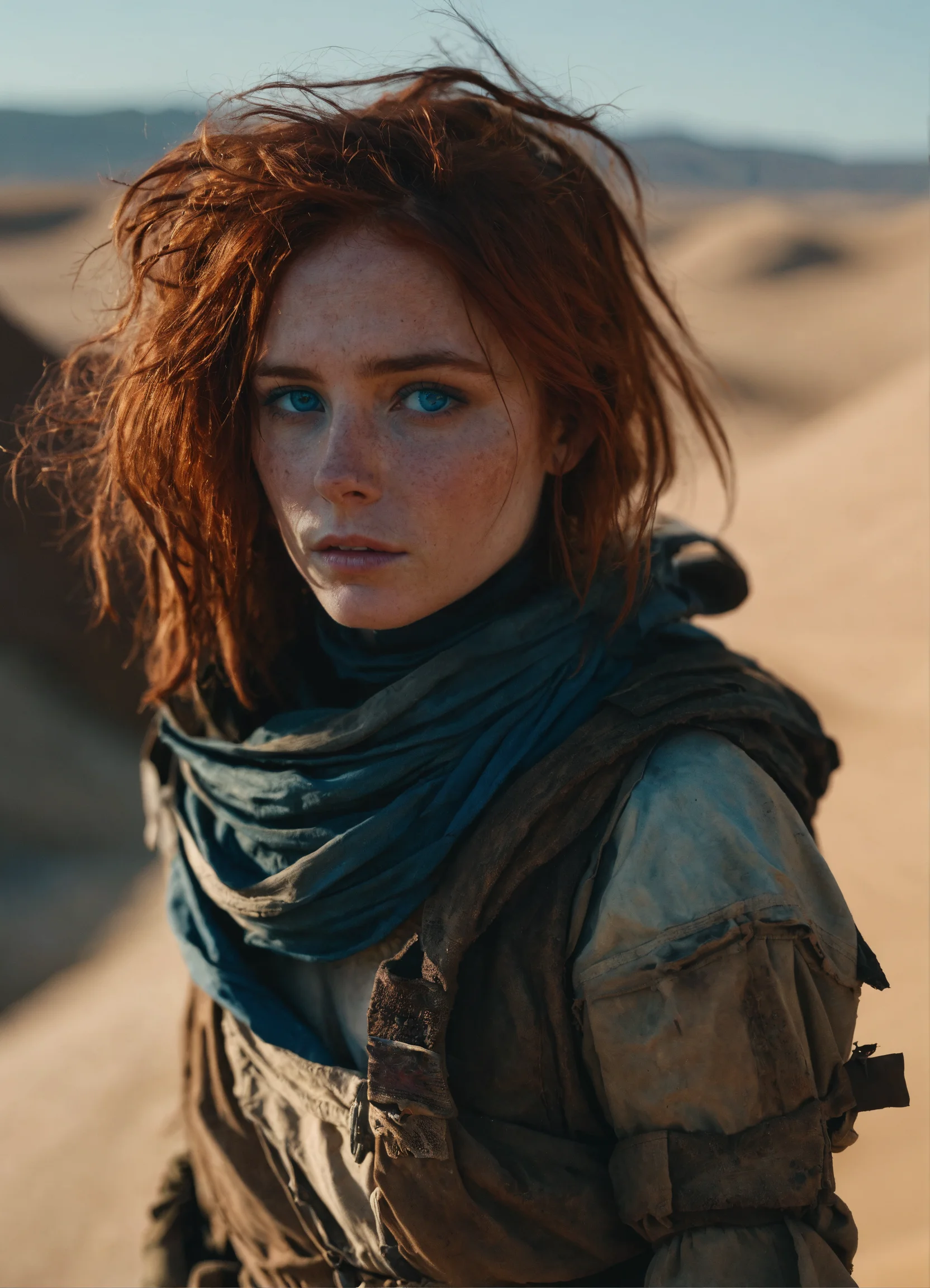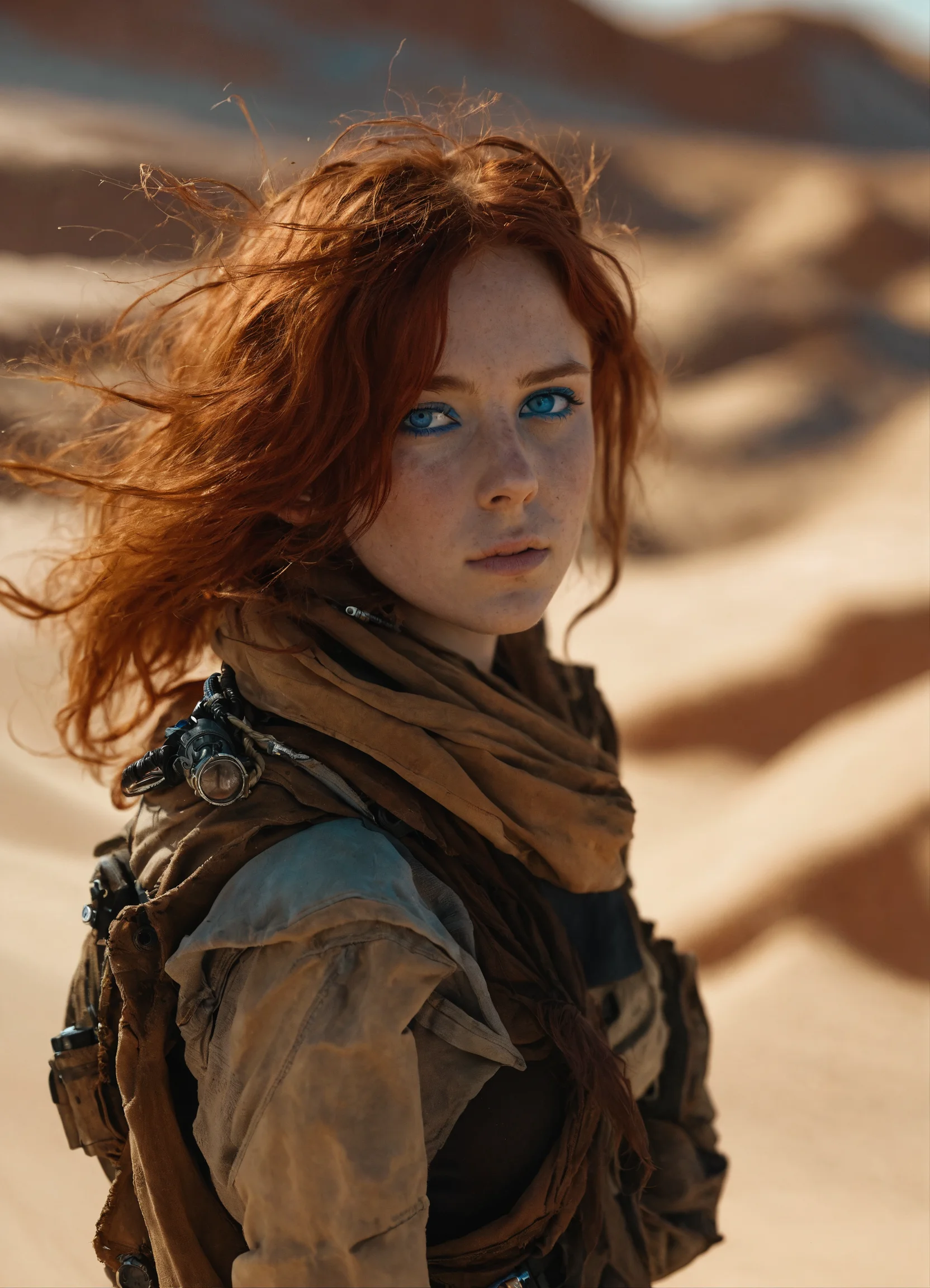 A photo of a 25-year-old woman with red hair, sharp blue eyes, and brown hair, wearing post-apocalyptic desert clothing in a dune desert. 4k