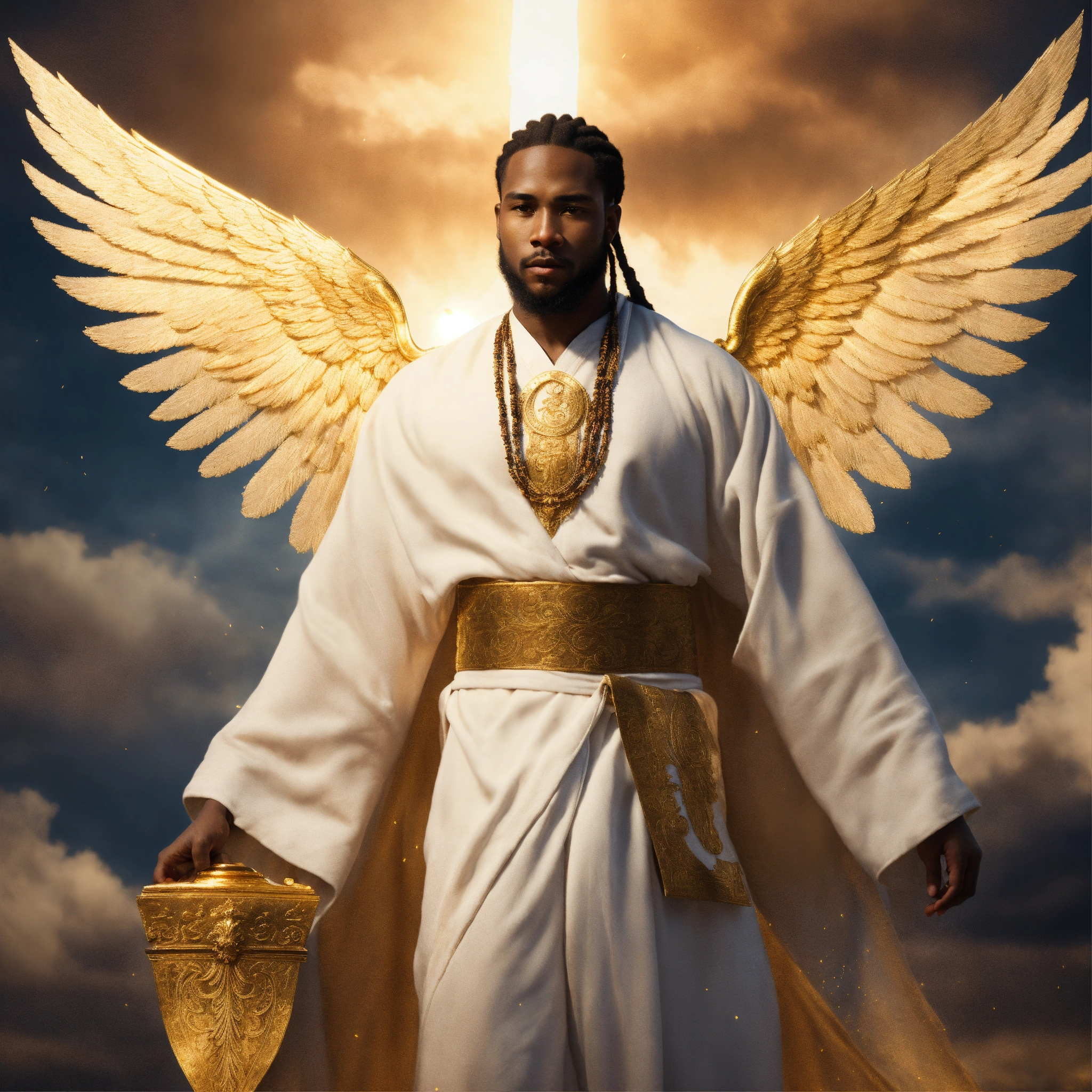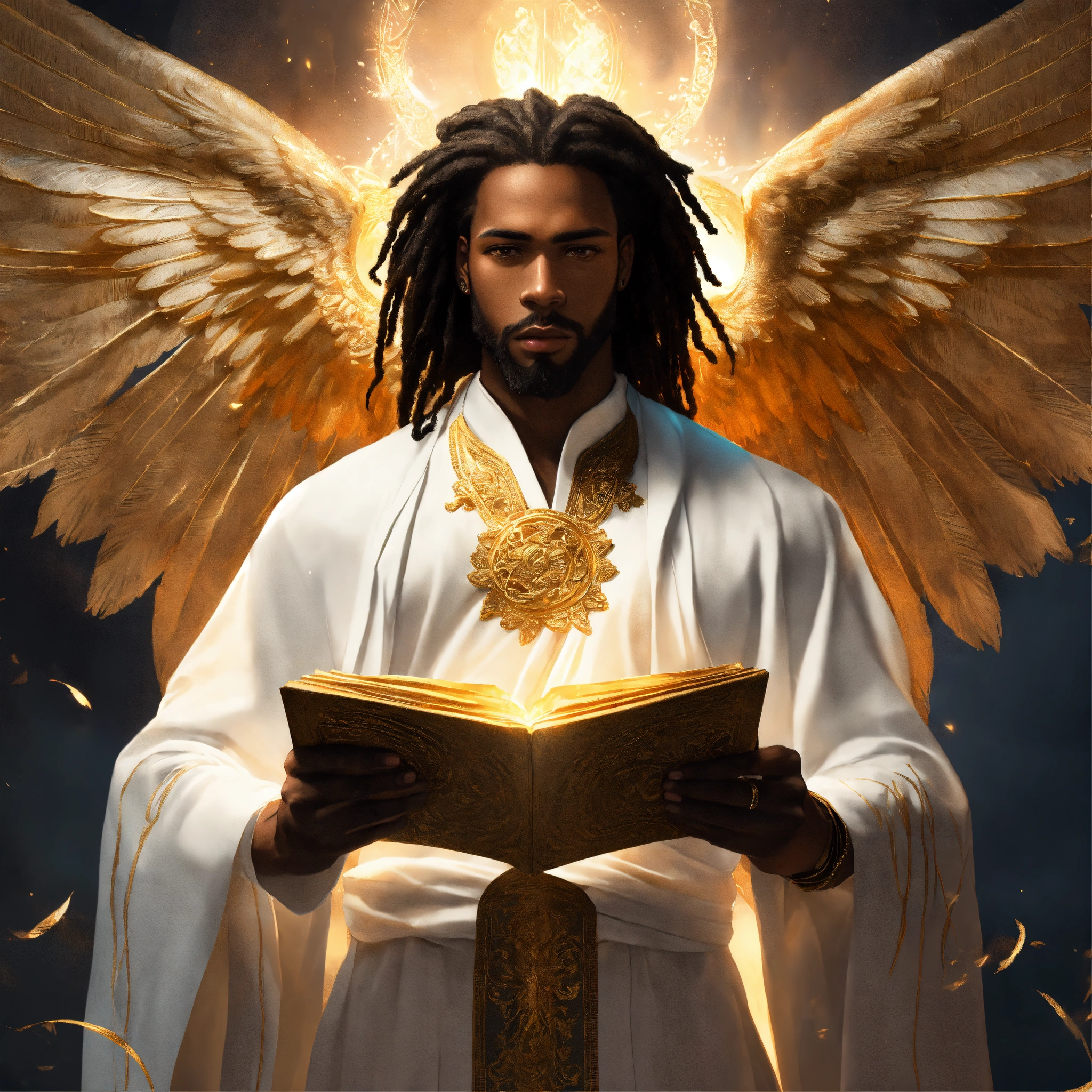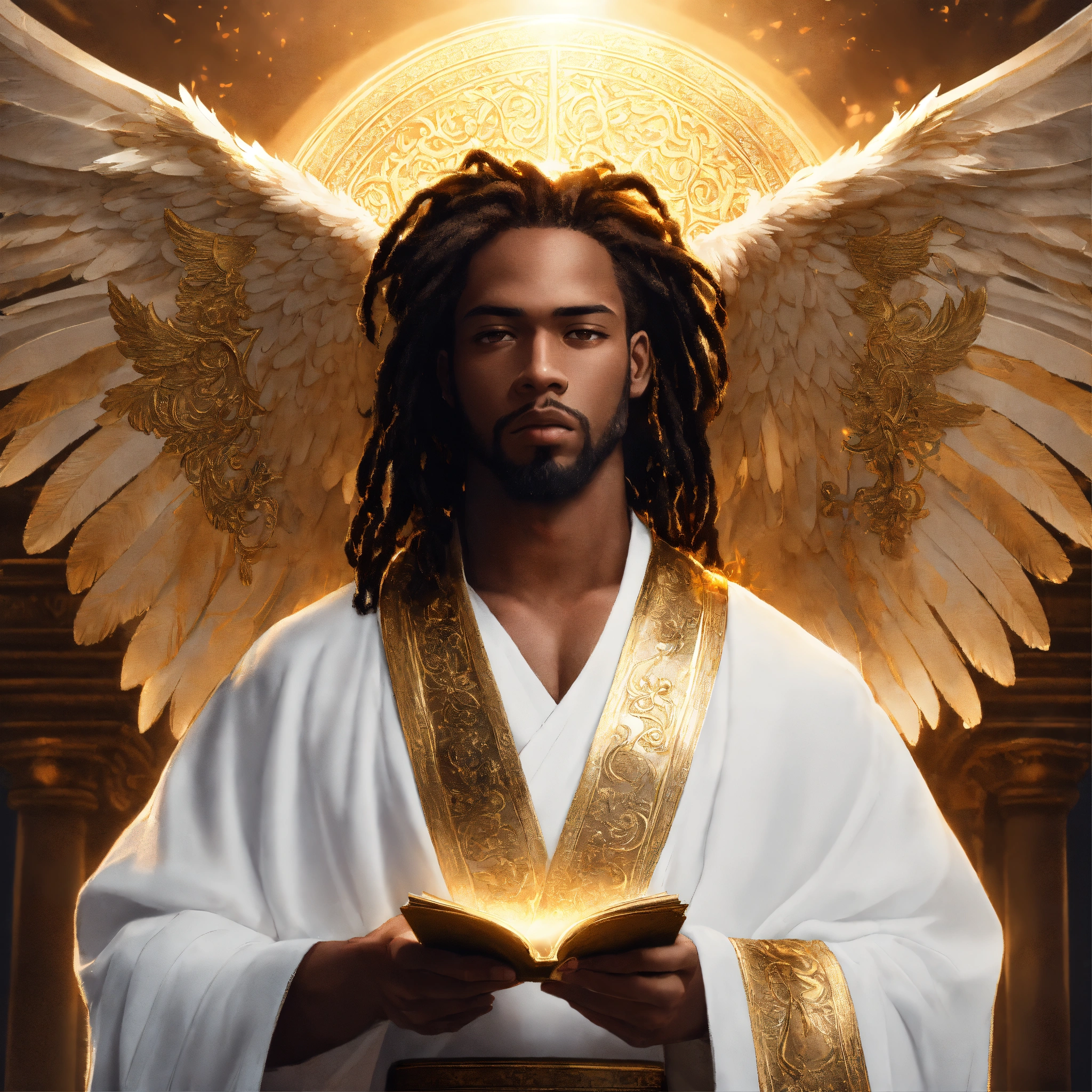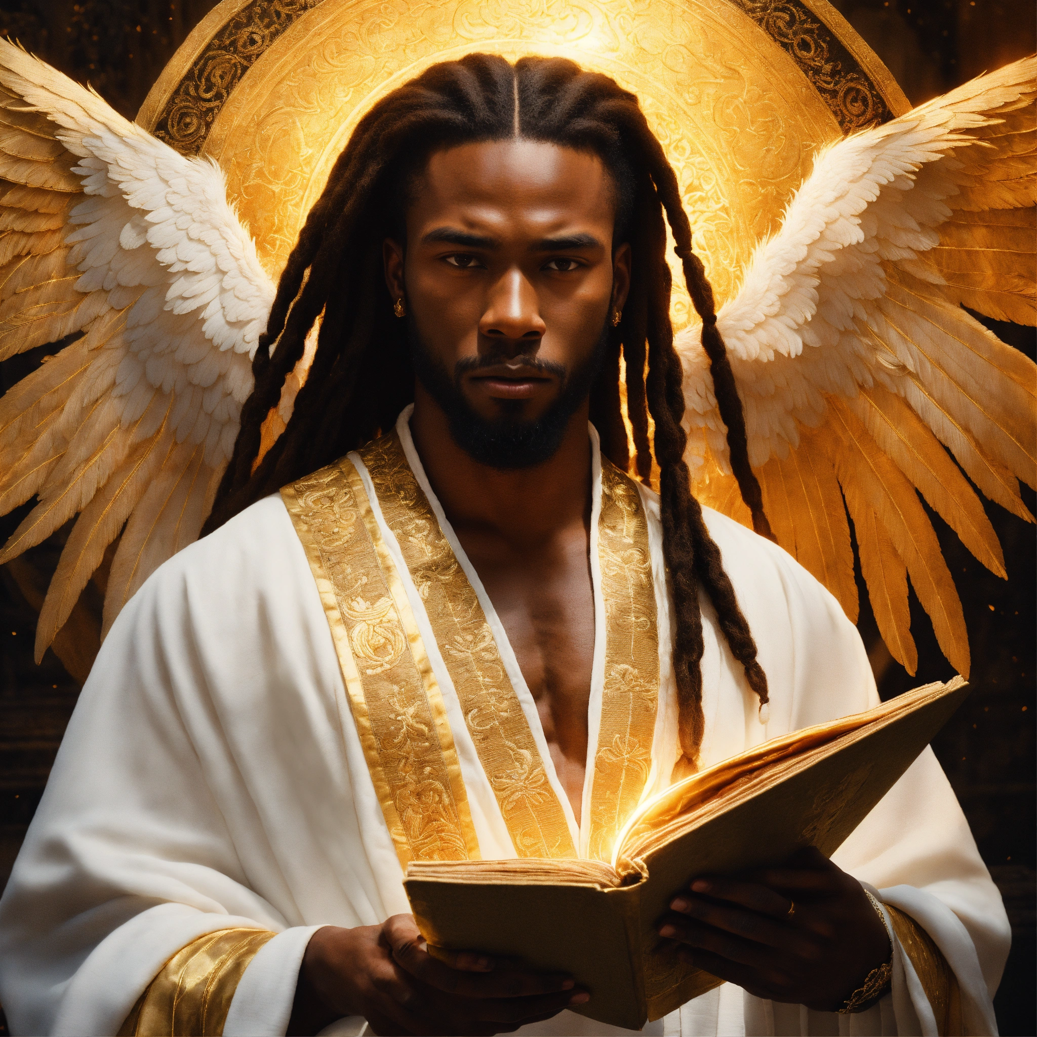 Illustrate a view of a young handsome black man wearing a long glorious white robe with gold embroidery, he has shoulder-length dreadlocks and a beard, he has shining wings and he is an angel, he is holding a large ancient scroll, frontal view with the face of a warrior with righteous anger and indignation, ethereal and fantasy photorealistic 16k