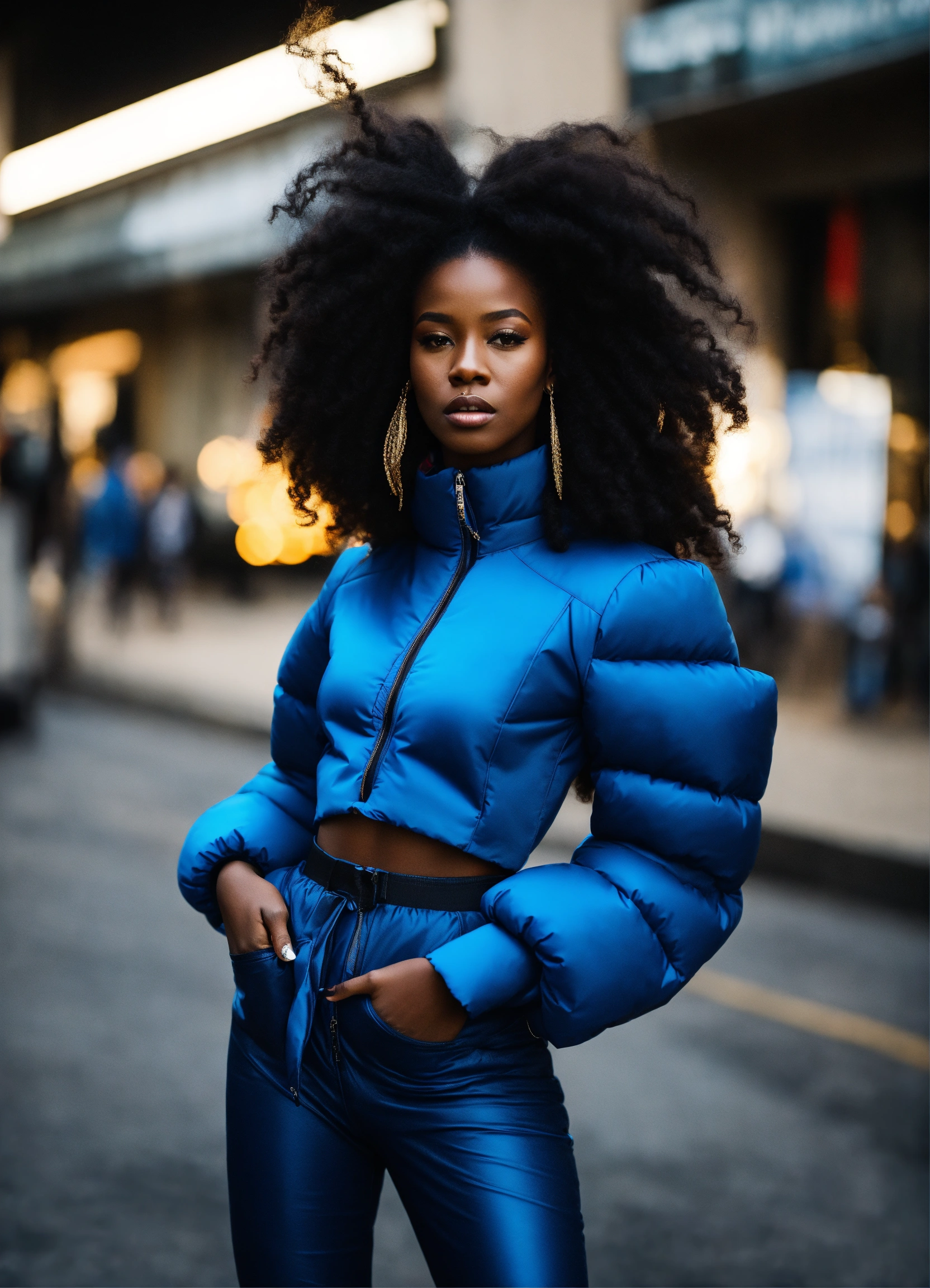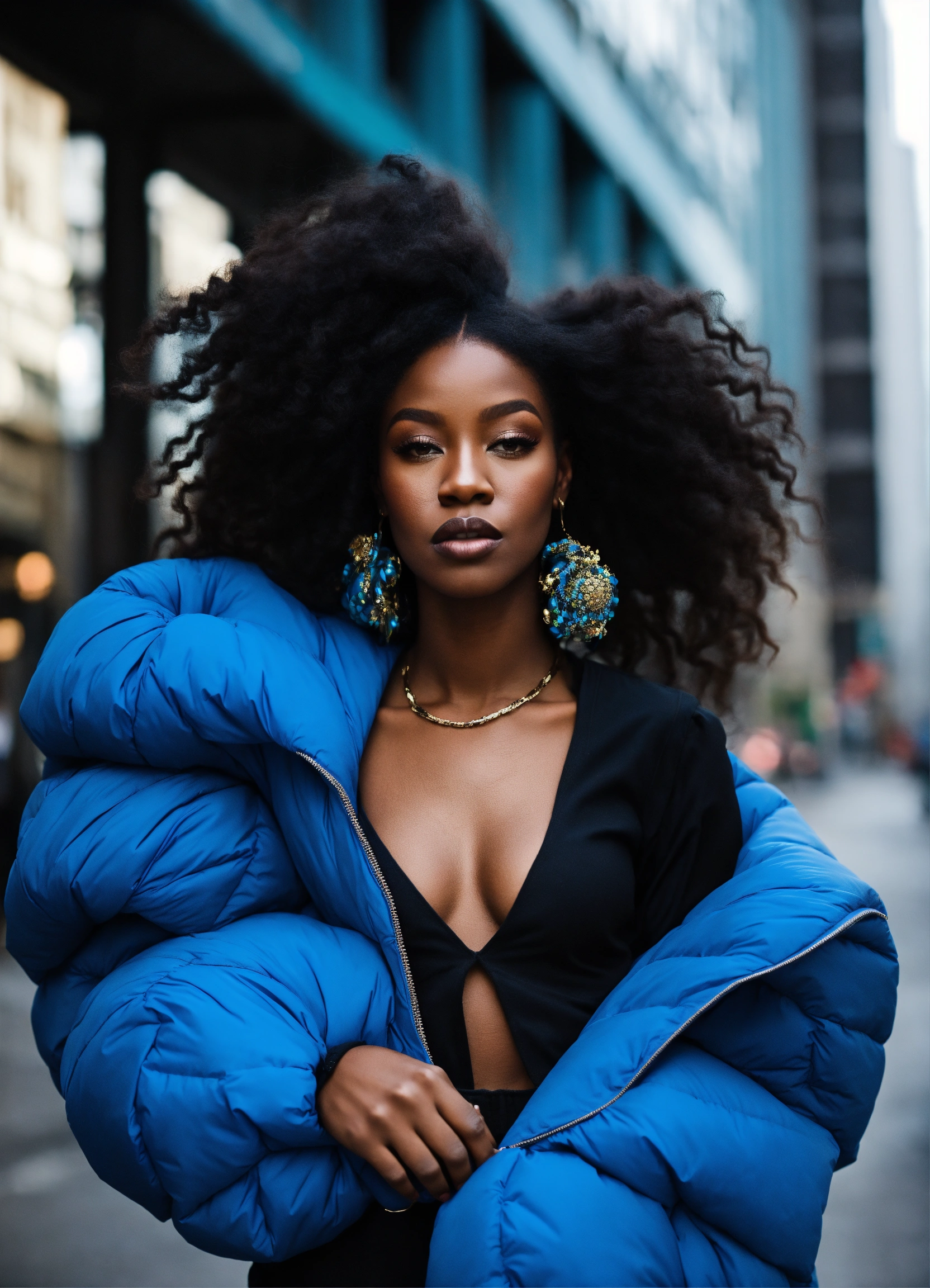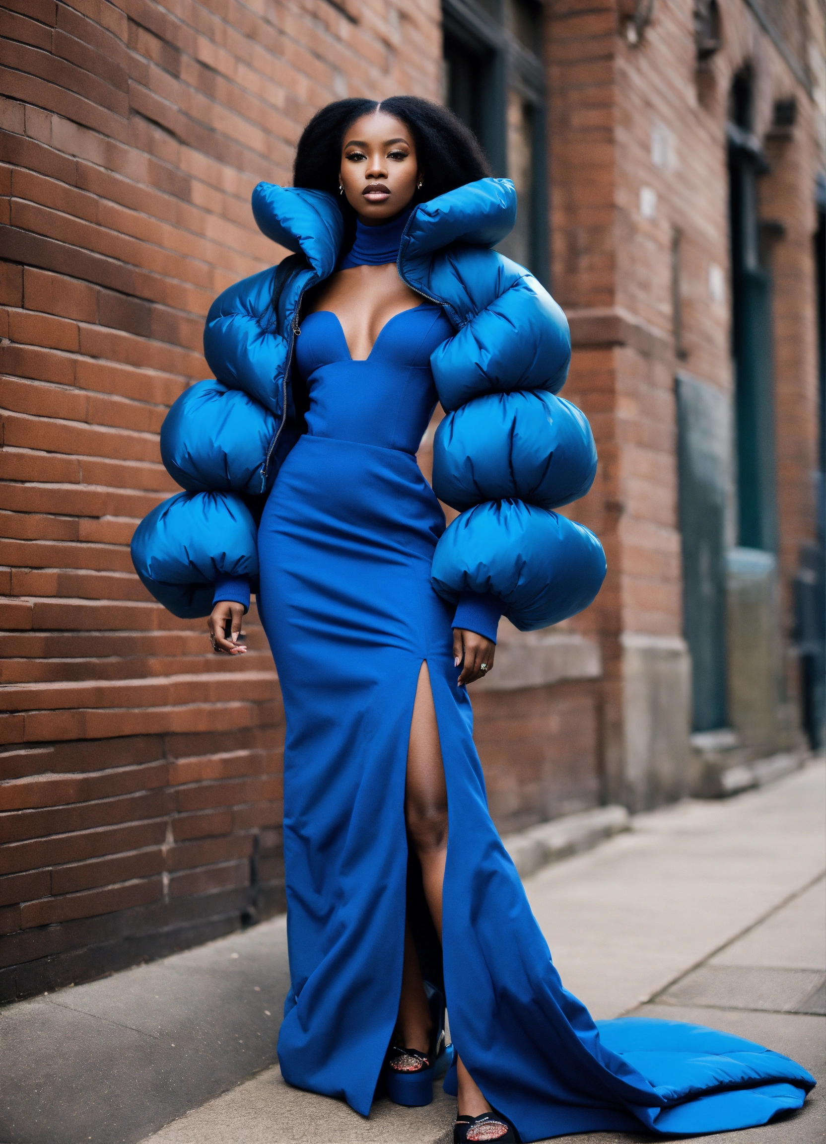 Black woman, in blue high fashion street wear with puffer sleeves, avant-garde, long flowing hair, edgy sleek styling, photography