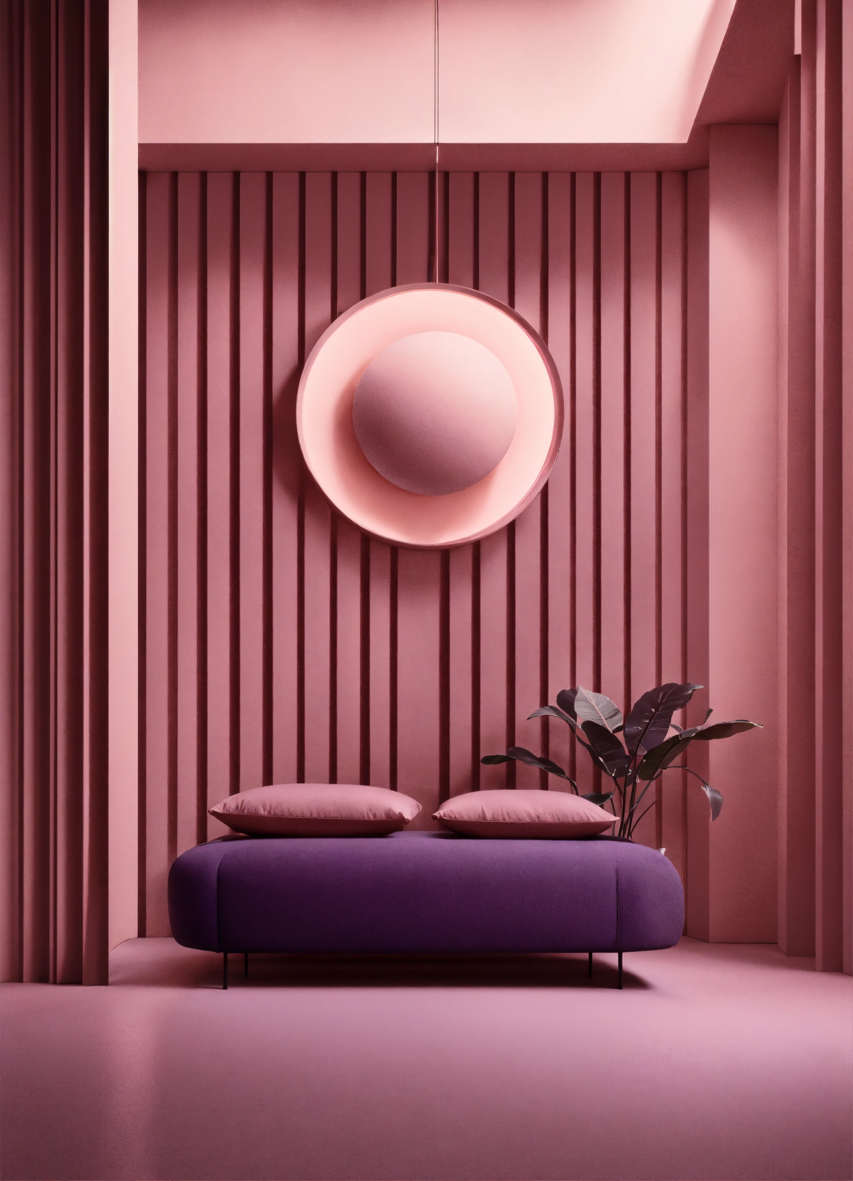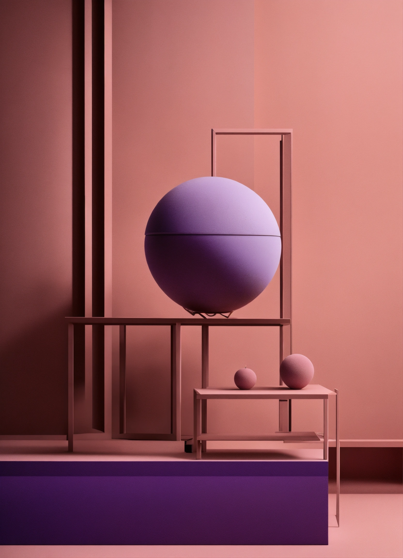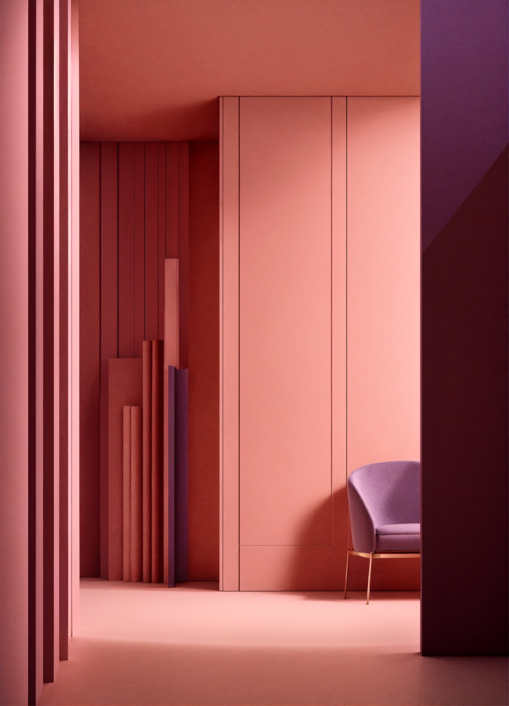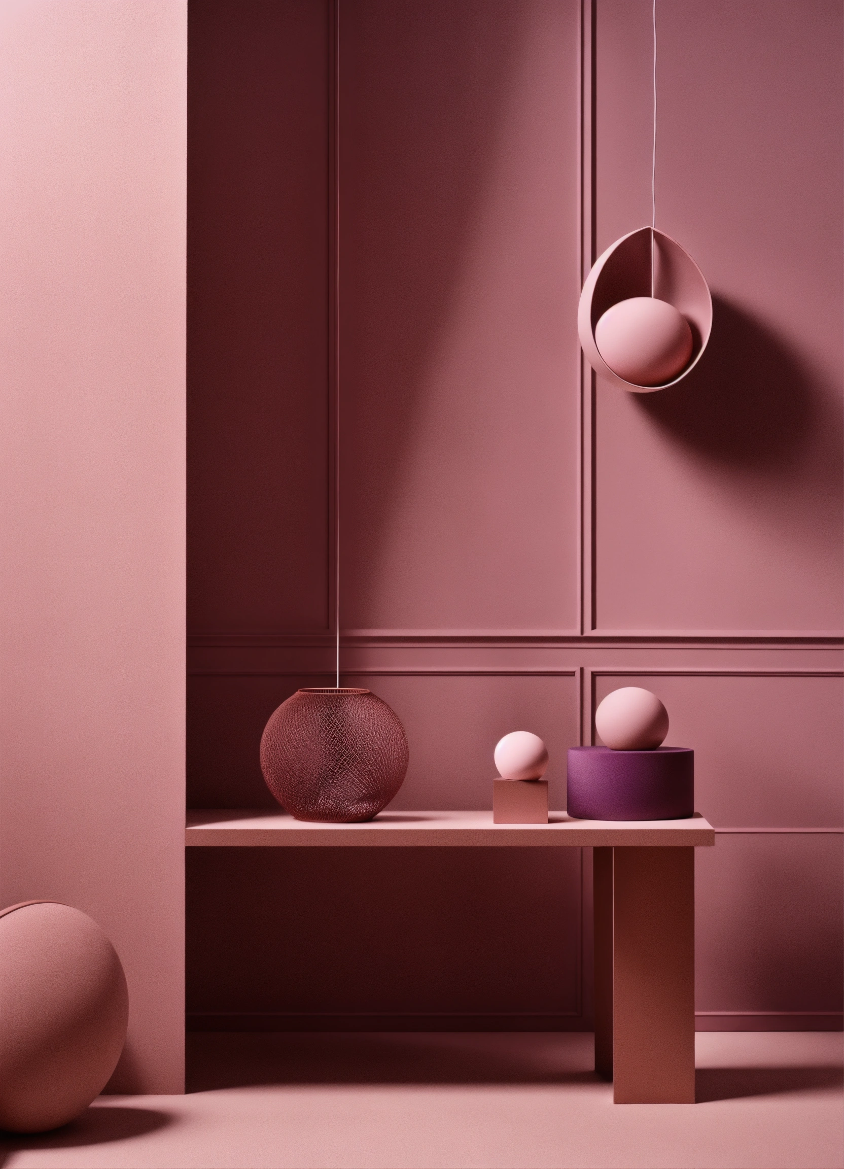 Muted tones of dusty pink and dark purple surreal combinations with minimalist compositions, evoking a sense of calmness, lighting installations, simple bare minimalist style 3d compositions, vintage theme