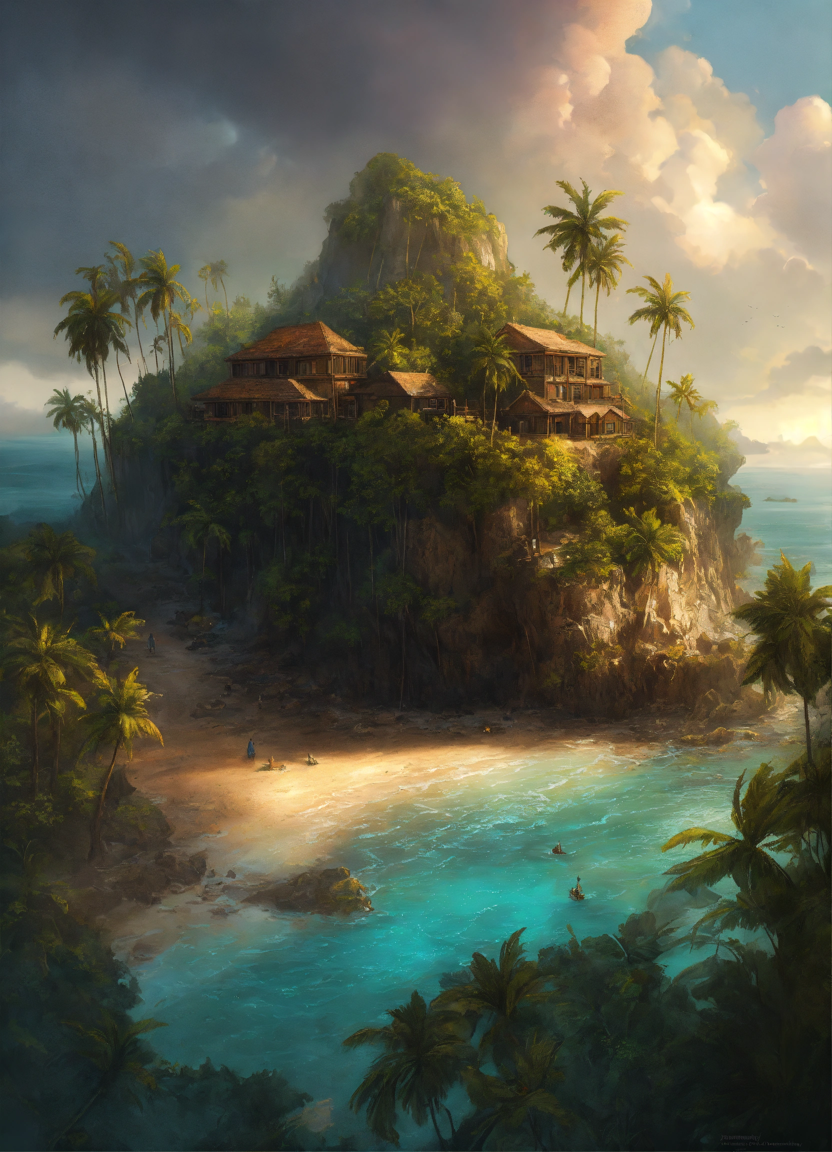 Island landscape, highly detailed, epic, dramatic, dark ambient, 16th century, bahamas, colonial, intricate, art by greg rutkowsky, charlie bowater, donato giancola and james gurney, digital art, trending on artstation, pinterest, cgchannel, cgsociety.