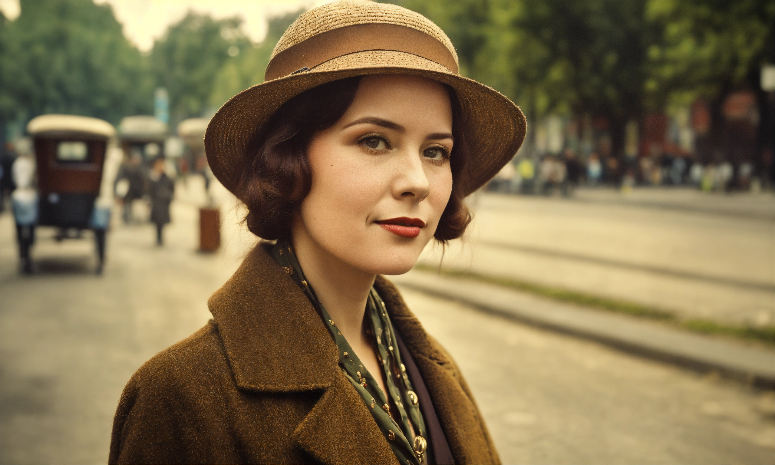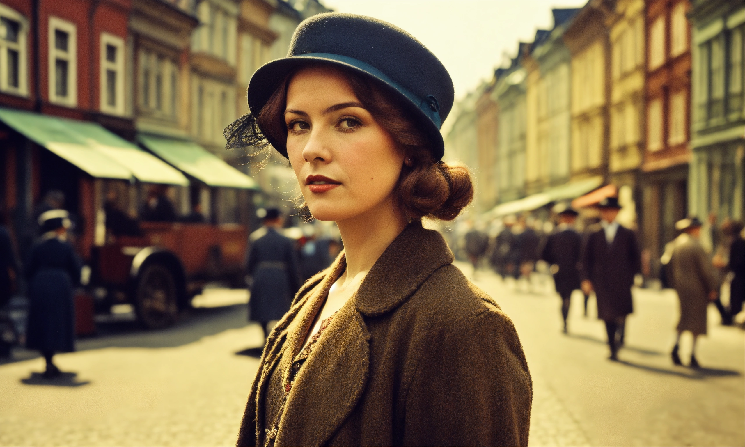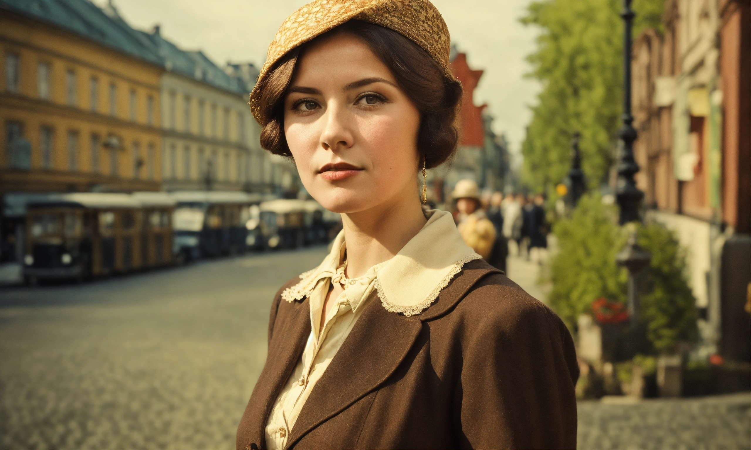 Poland rich woman age 30 half height full haight, 1920-1930 on streen in warshaw. retro style photo. without people. focus camera on face woman . on main streen in warshaw, woman full haight