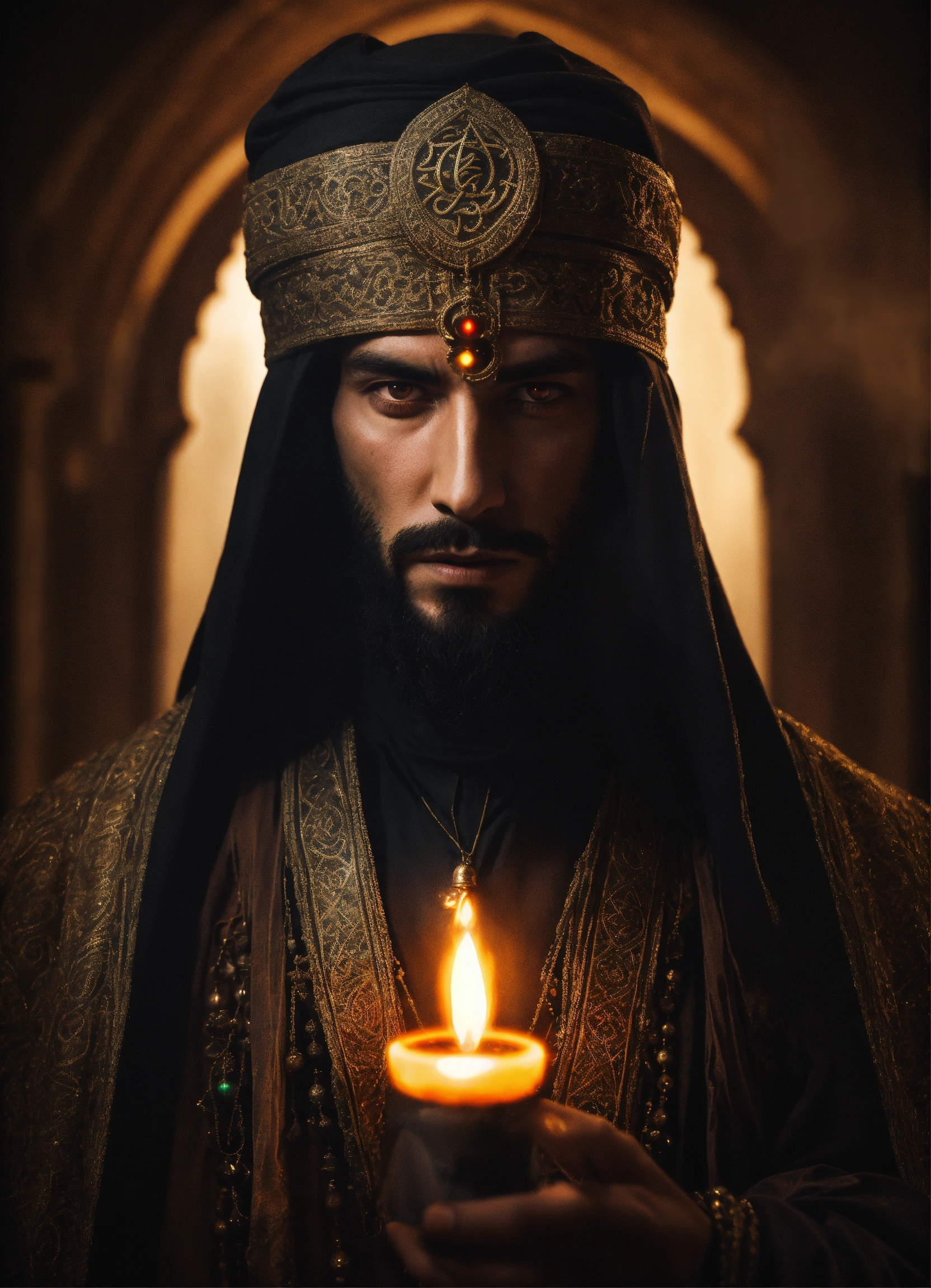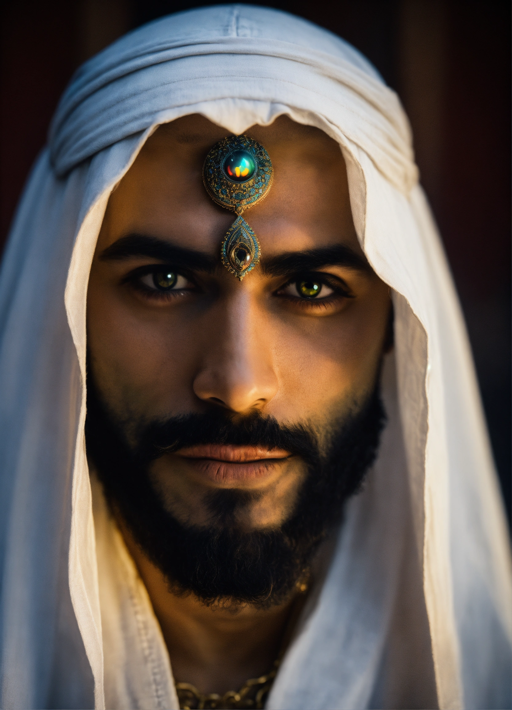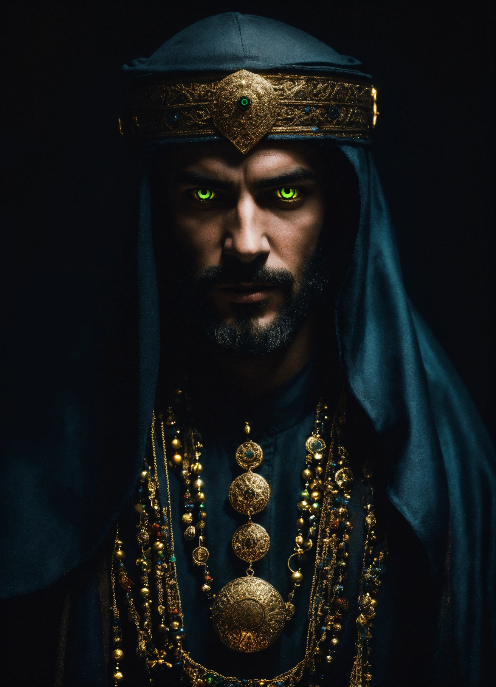 Dark, mysterious and dramatic headshot of a handsome ancient arabic wicked sorcerer with glowing hypnotic eyes