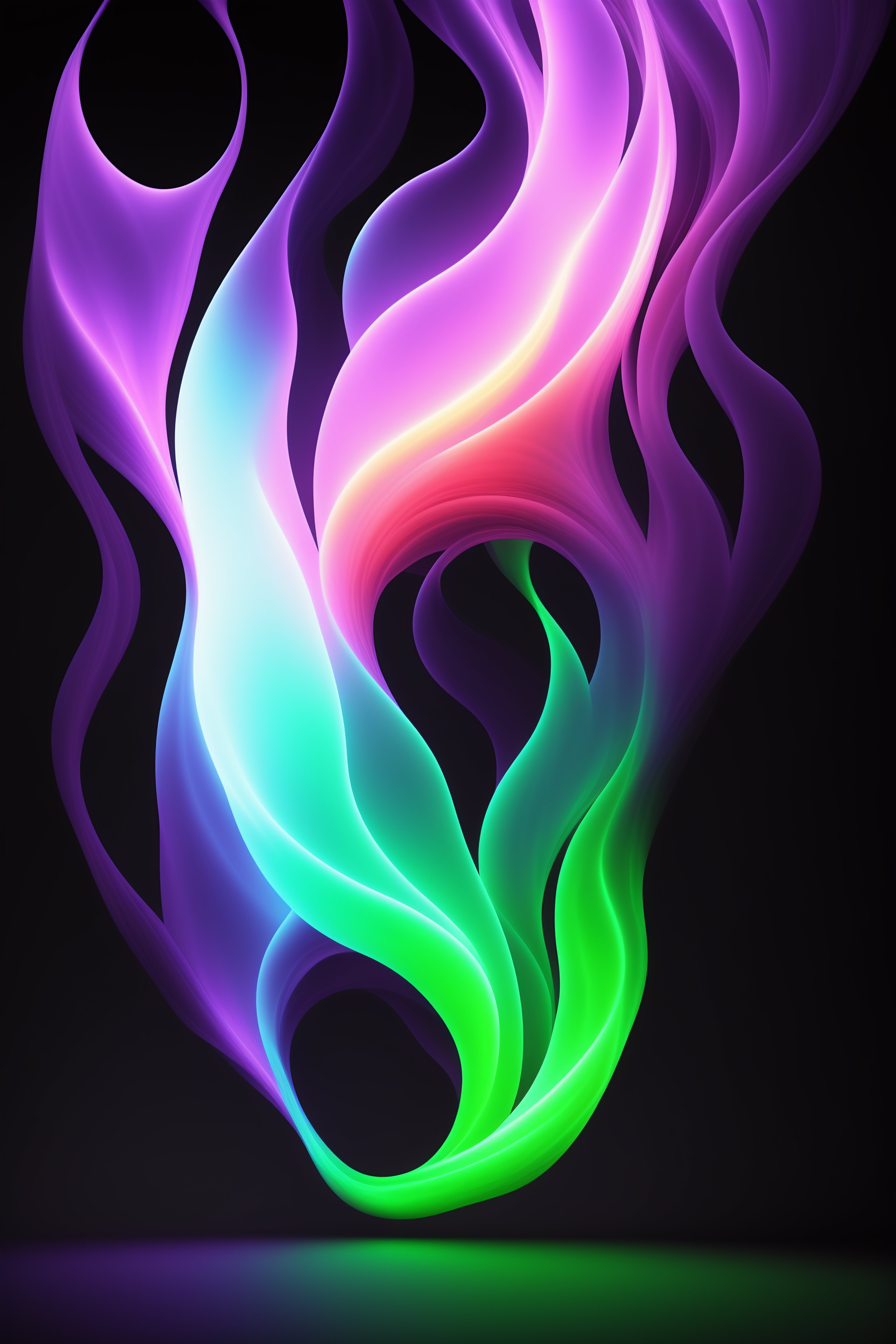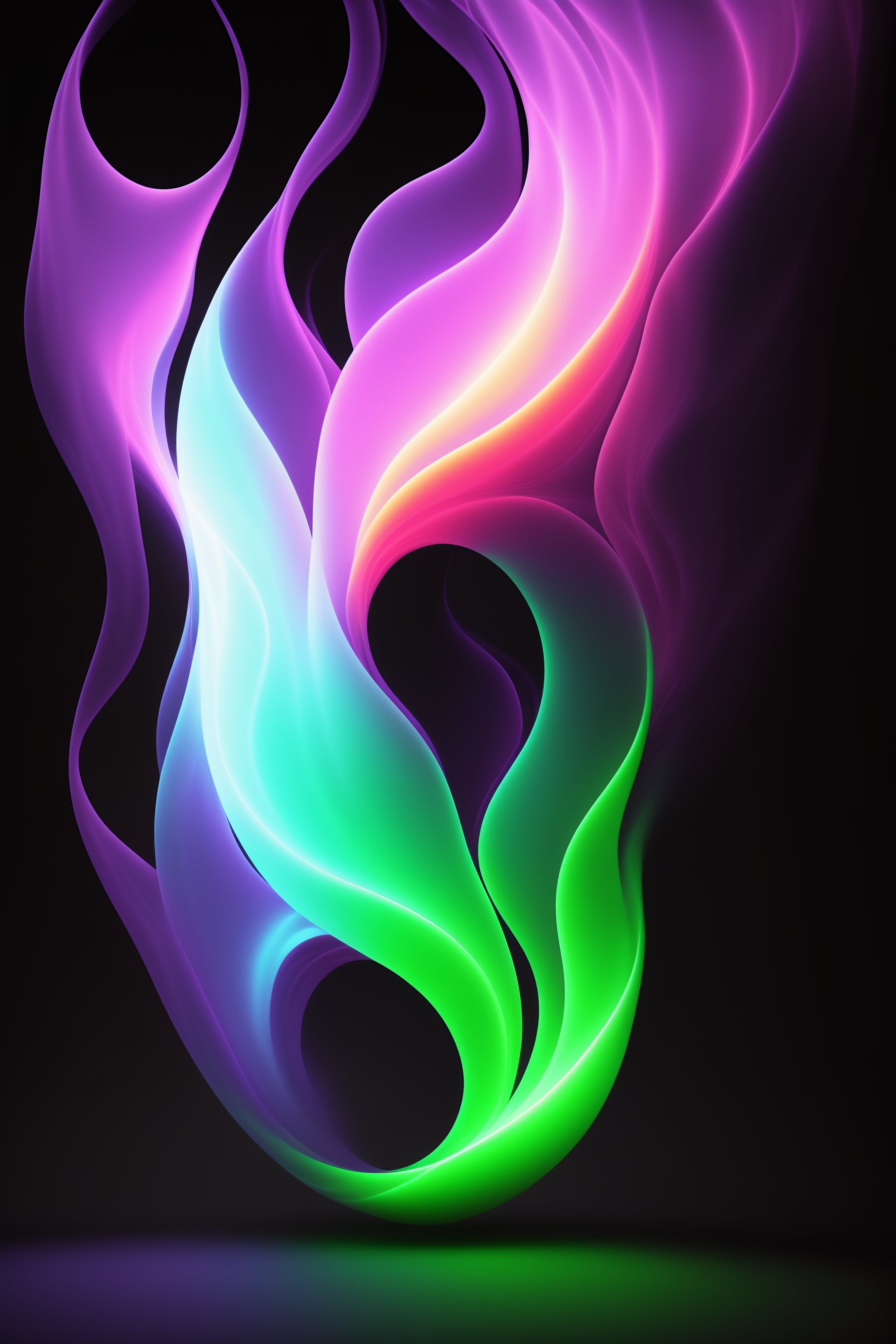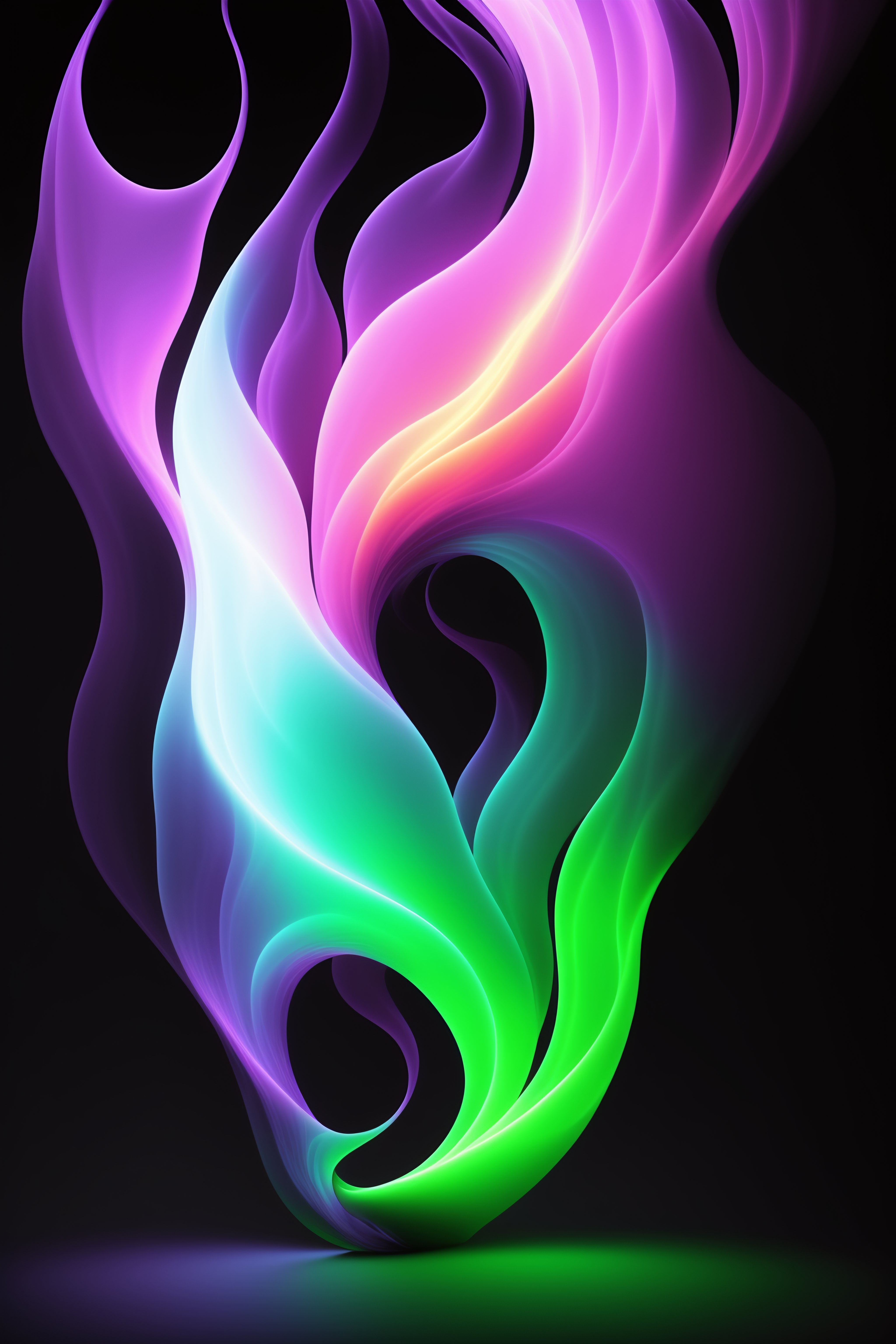 A single 3d rendered purple and lime green flame on a black background. the flame should be highly detailed and realistic, with swirling tendrils of blue and white fire. the background should be a deep, dark black, with the flame standing out in stark contrast. the overall look should be dramatic and otherworldly, with the flame appearing to dance and writhe on the screen.