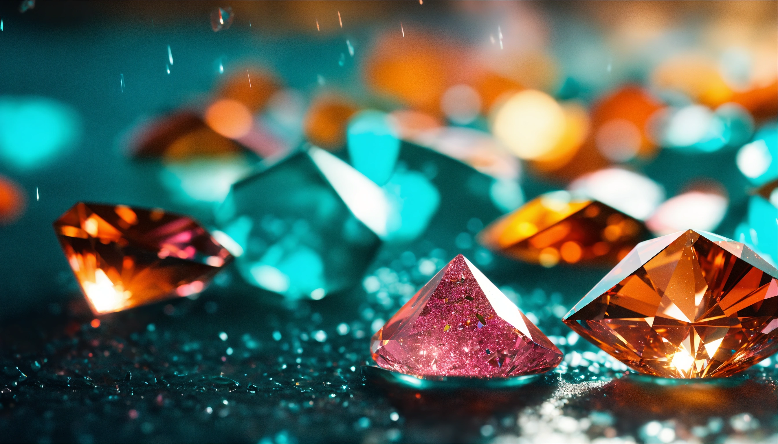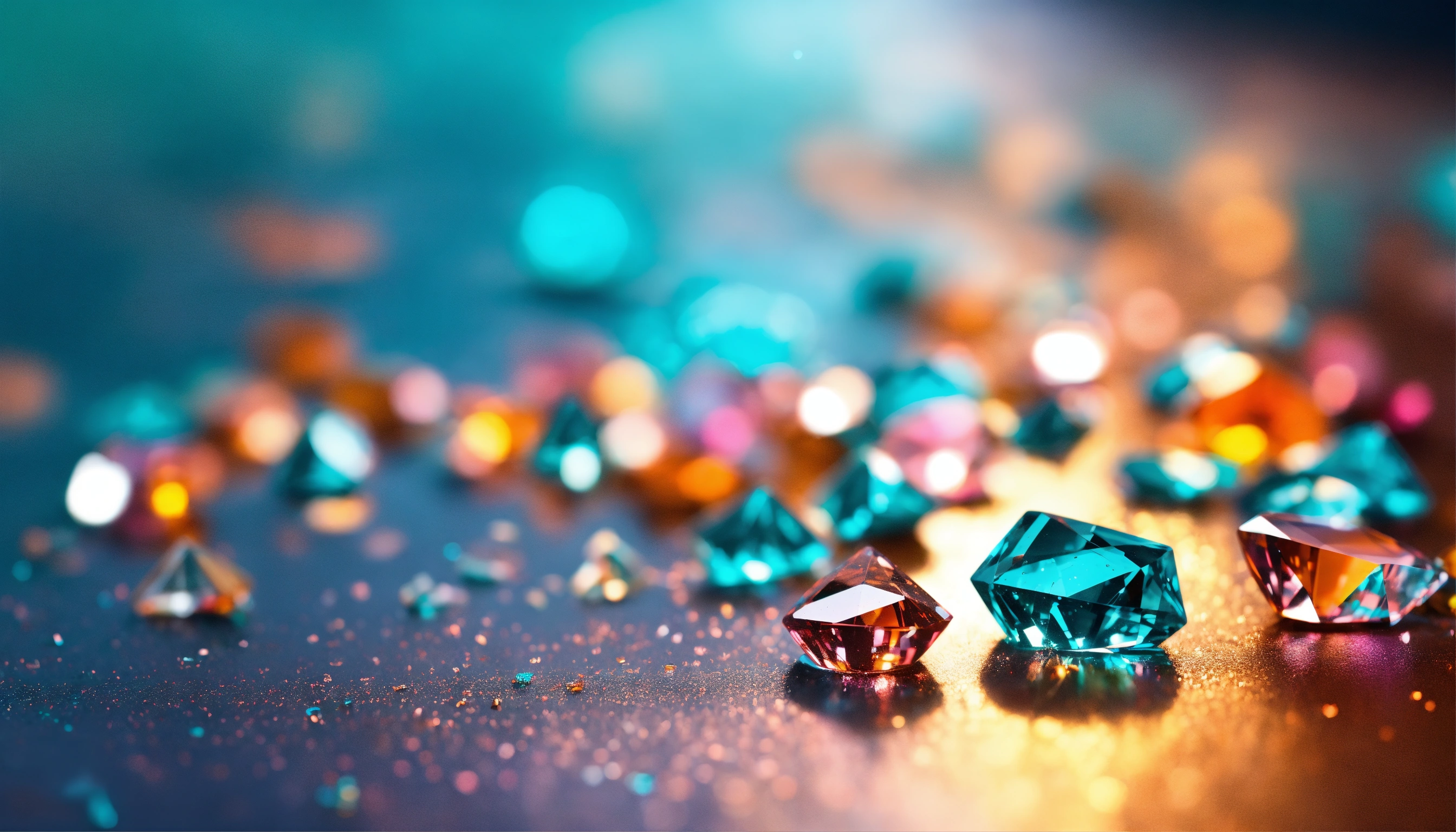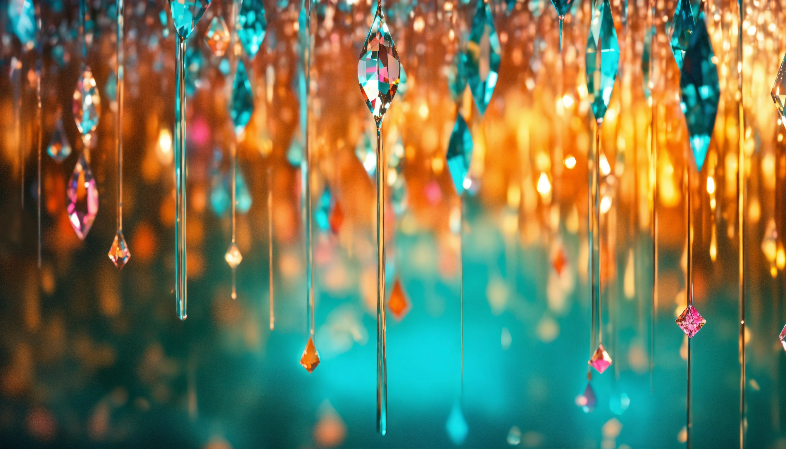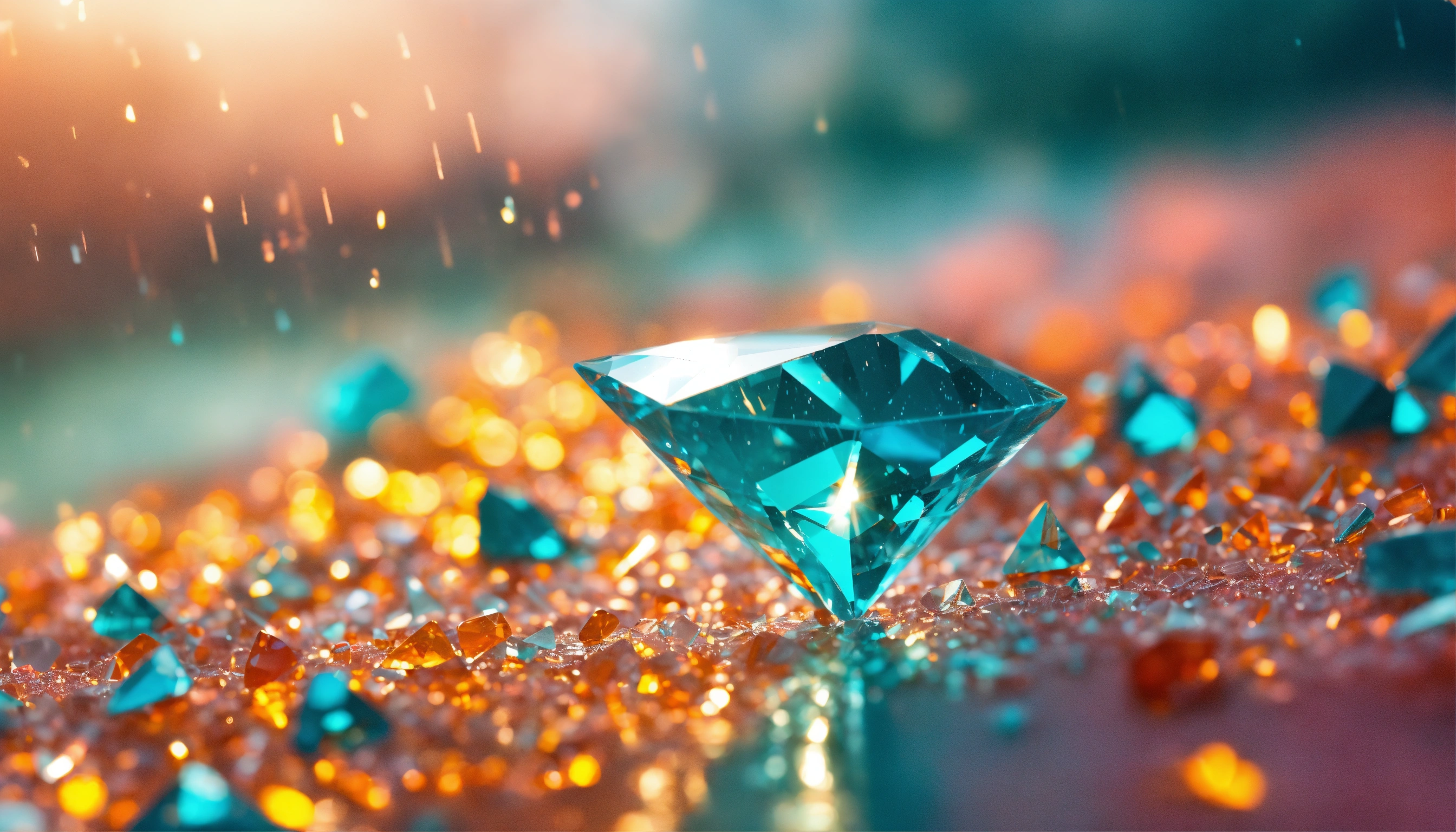 Rain made of sparkling diamond glass fragments in deep turquoise, orange and pink shades. shiny, elegant. light background