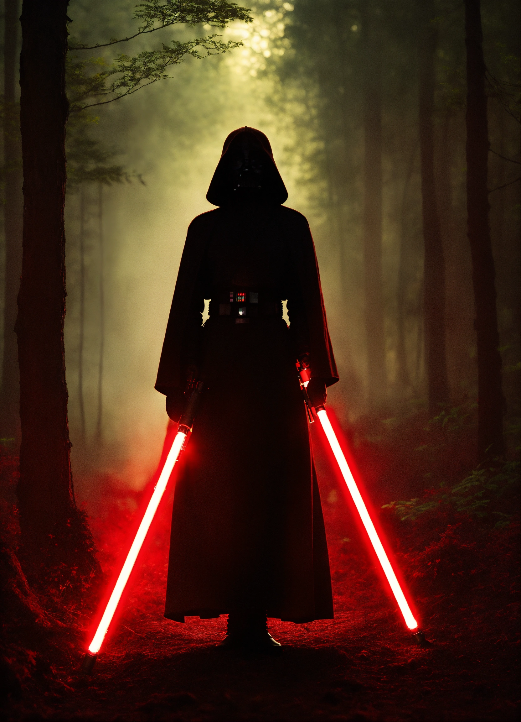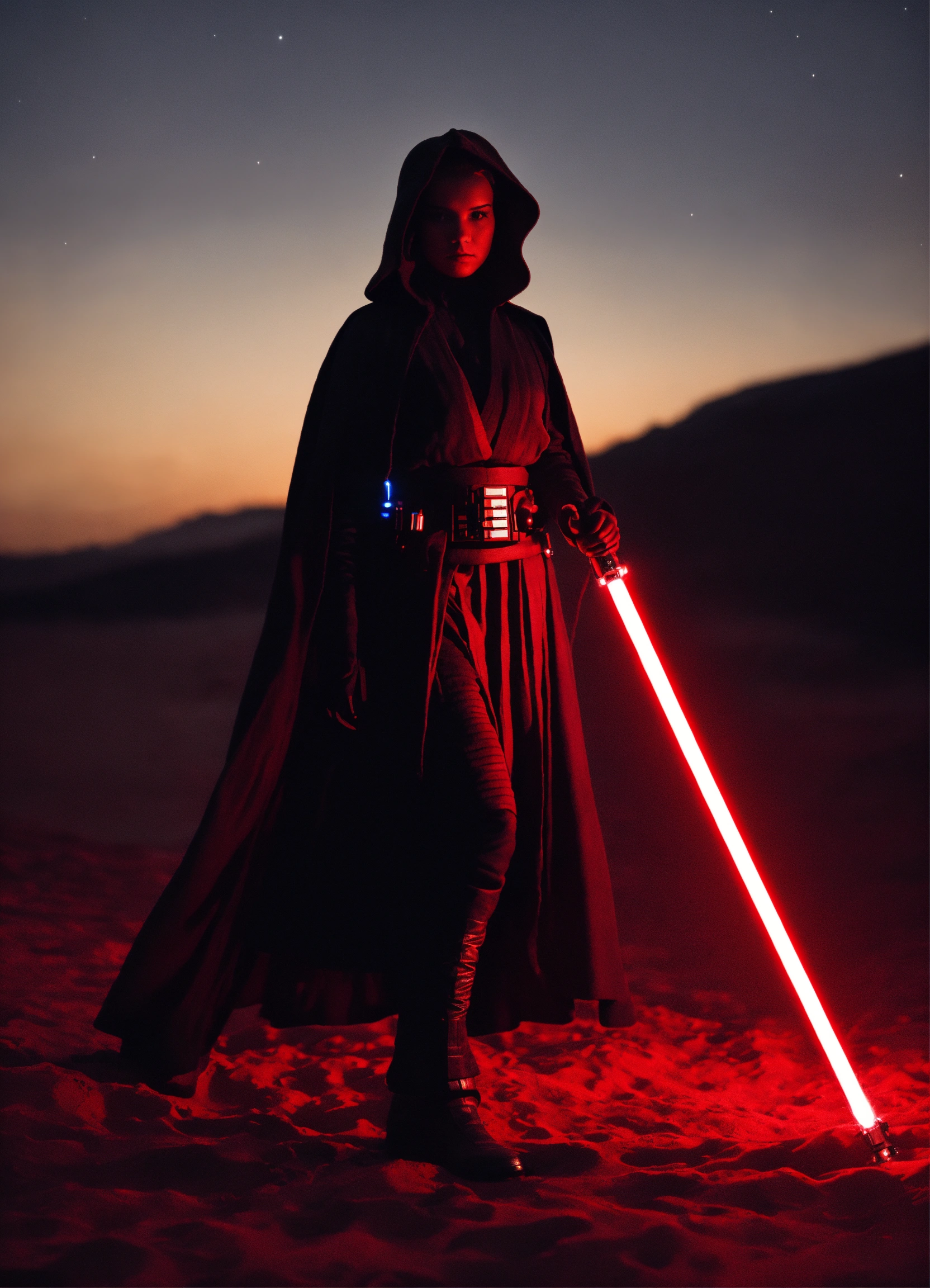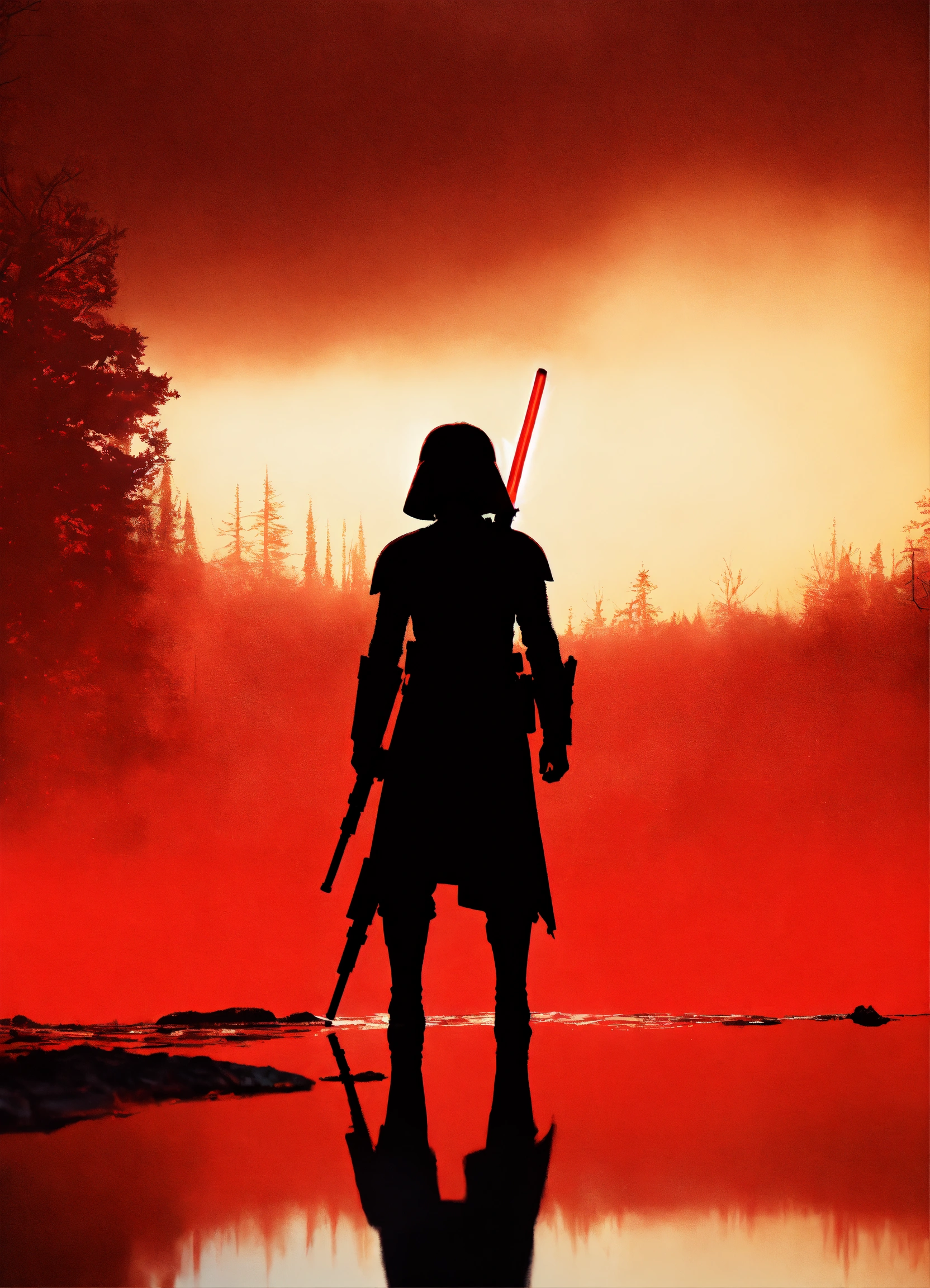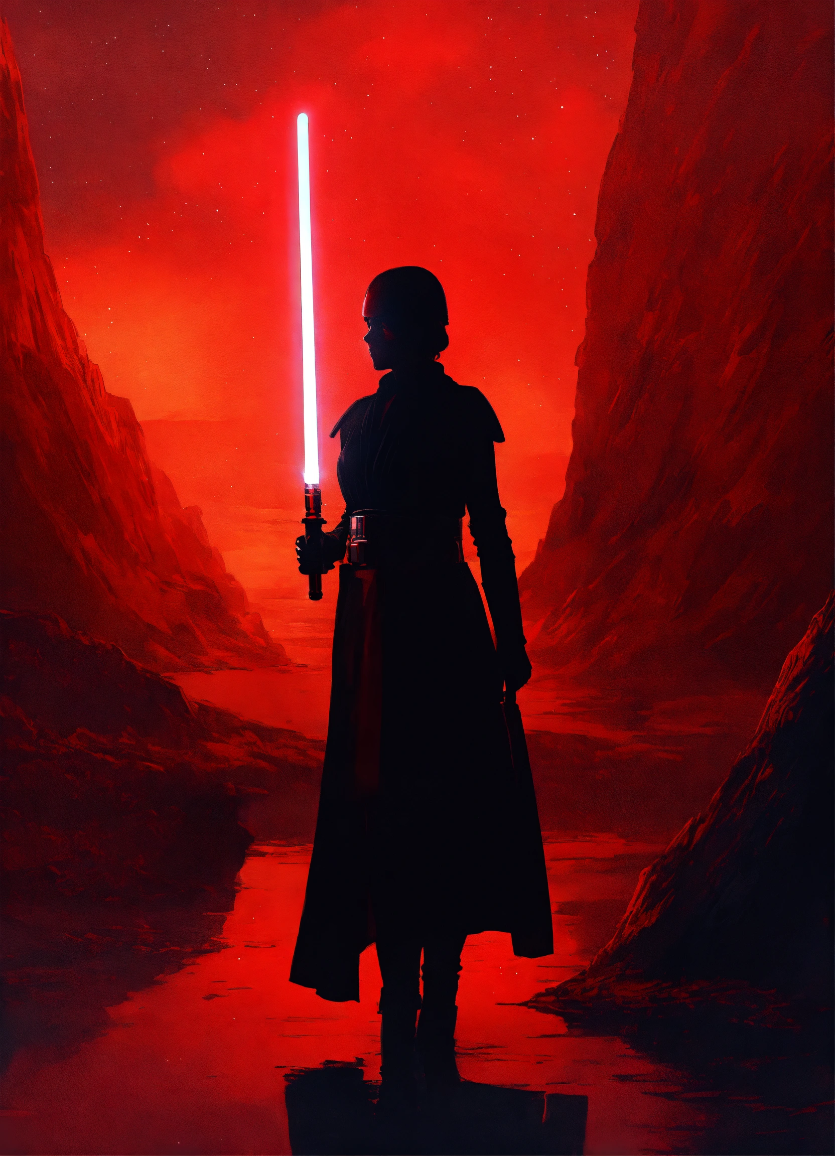 Portrait of a silhouette star wars figure in her red lightsaber, in the style of evocative environmental portraits, dark, red