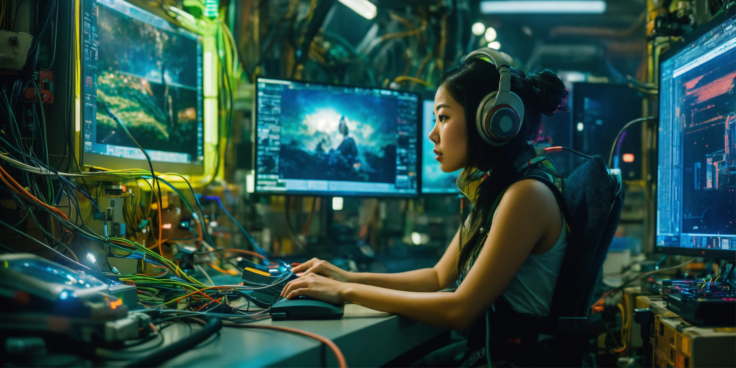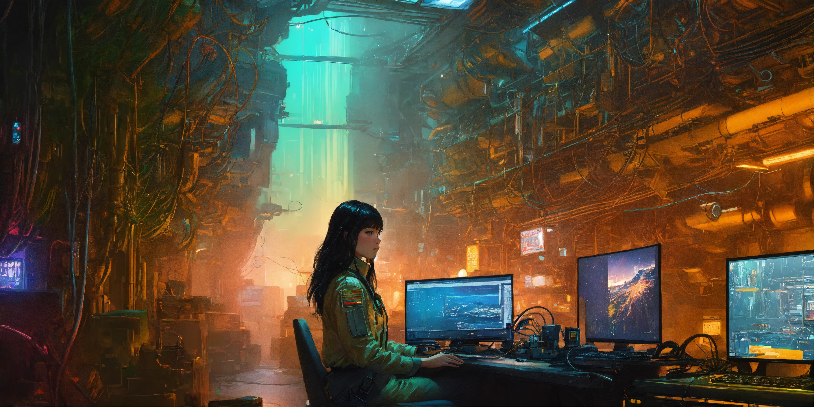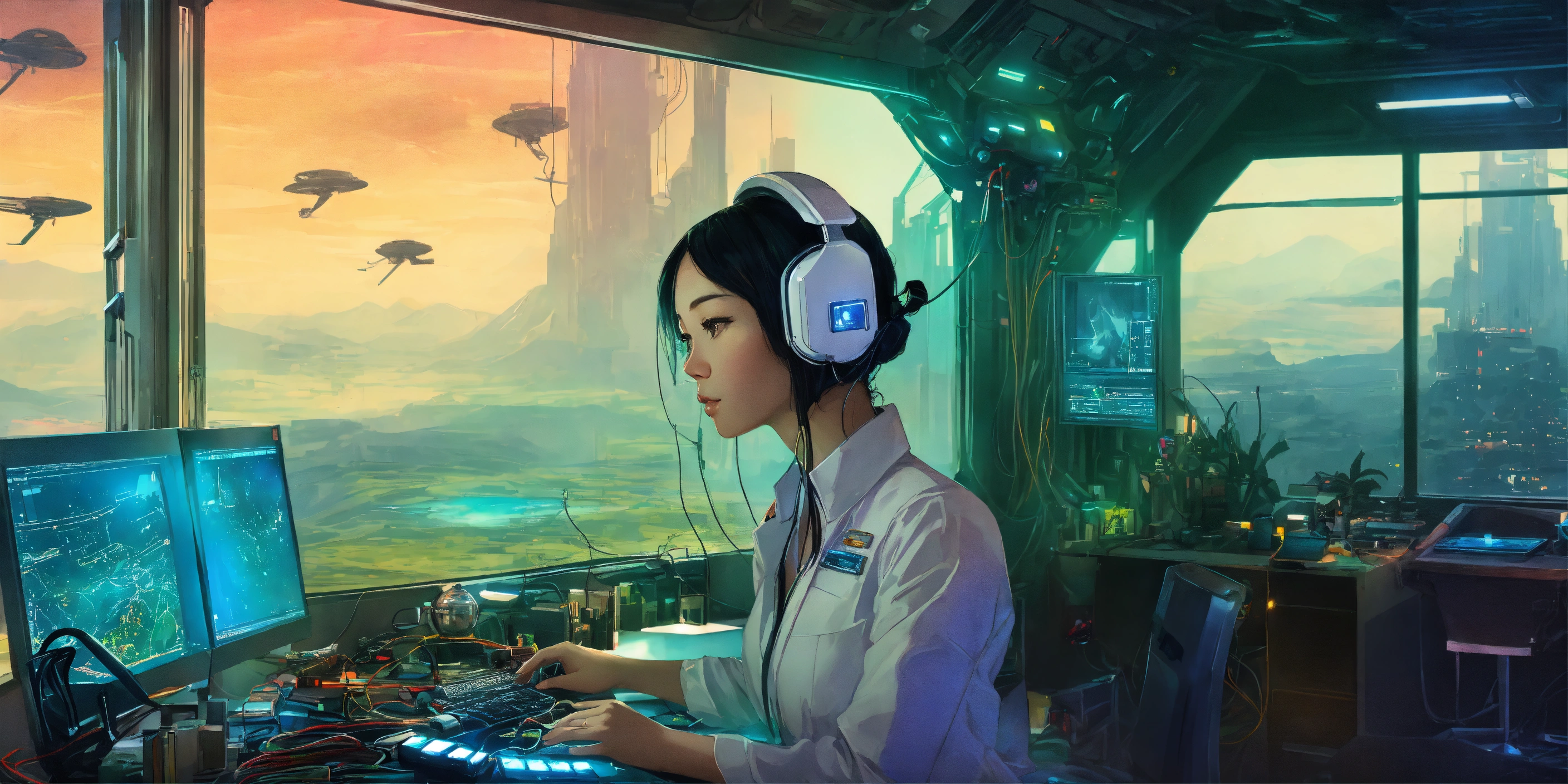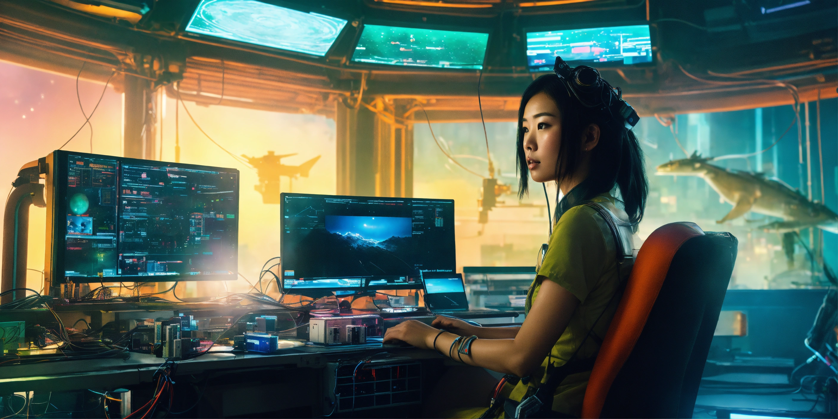Portrait photography inside of a futuristic blade runner cyberpunk spaceship, an asian astronaute woman, in a laboratory full of machines with cables and wires, at her desk in front of her computer, dreaming of a lush landscape with a waterfall and wild animals, art by sergio lopez arctium láppa conrad roset poster.