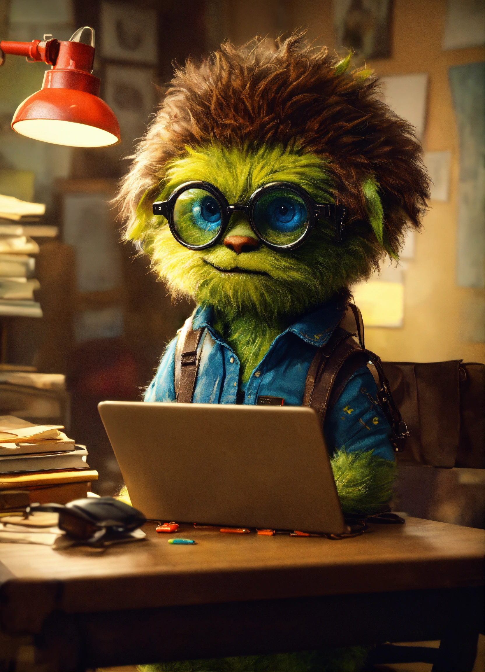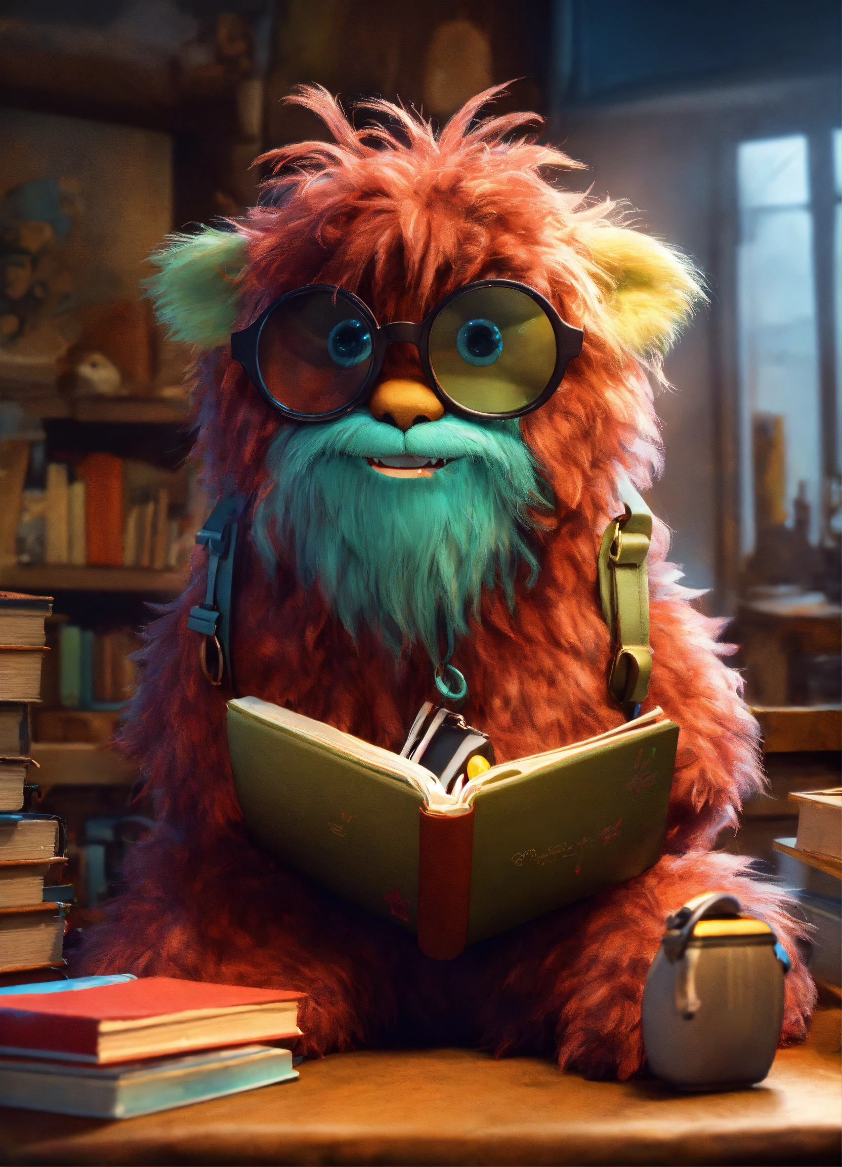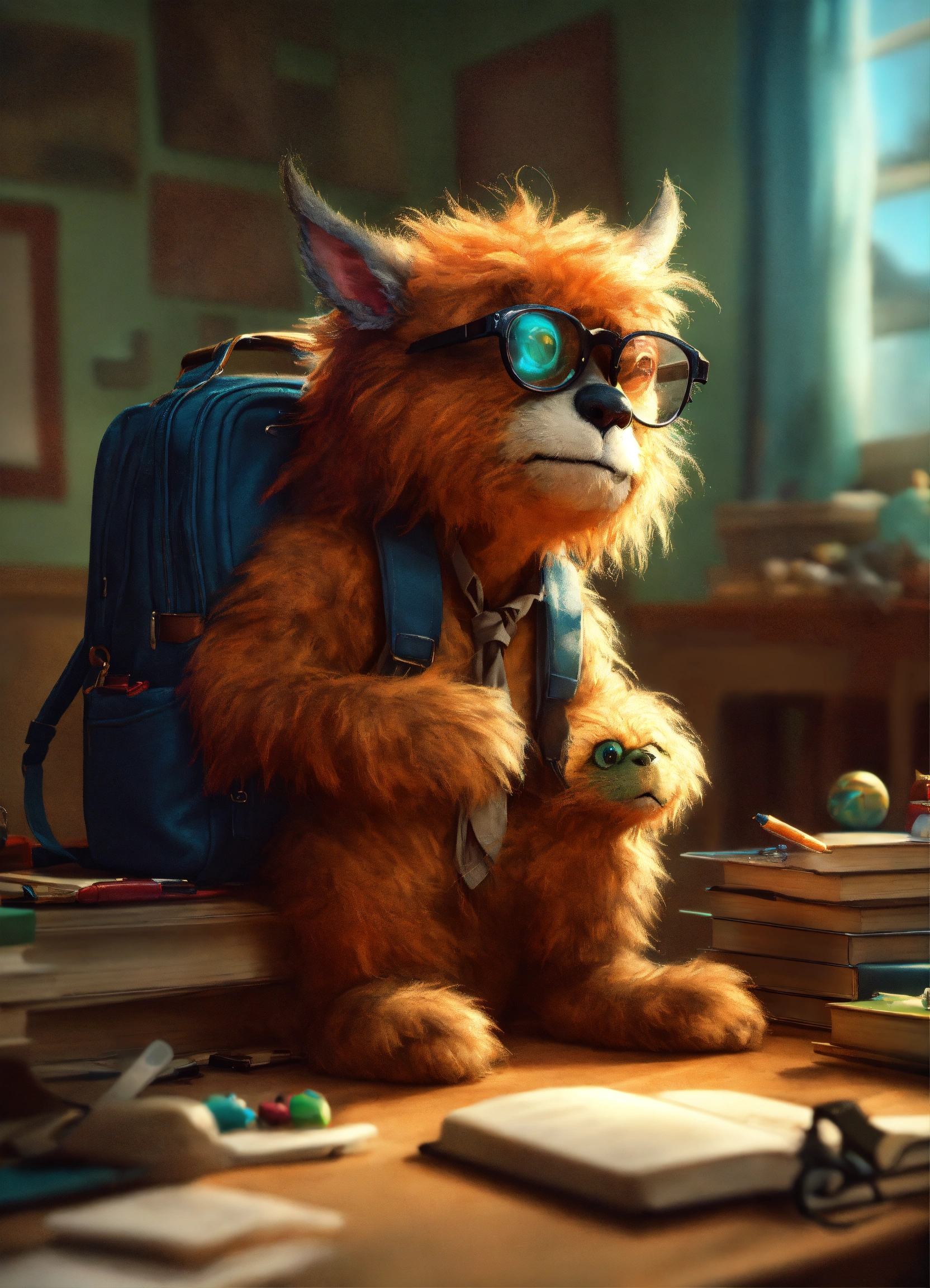 A whimsica cute furry fluffy non scary hairy monster wearing glasses and a school capwith his school bag and a school bag sitting at a school desk, perfect composition, whimsical, adorable, artstation, atmospheric, hdr, trending on artstation, wlop, polychromatic colors, high contrast, detailed, arthur rackham, jean baptiste monge, alberto seveso, erin hanson, jeremy mann, android jones tiny hairy monster, not scarry, studio photography, award winning photography, studio lighting, ultra realistic, sharp features, trending on artstation, soft smooth lighting, soft pastel colorsin the background, pixar, disney, concept art, 3d digital art, maya 3d, zbrush central 3d shading, bright colored background