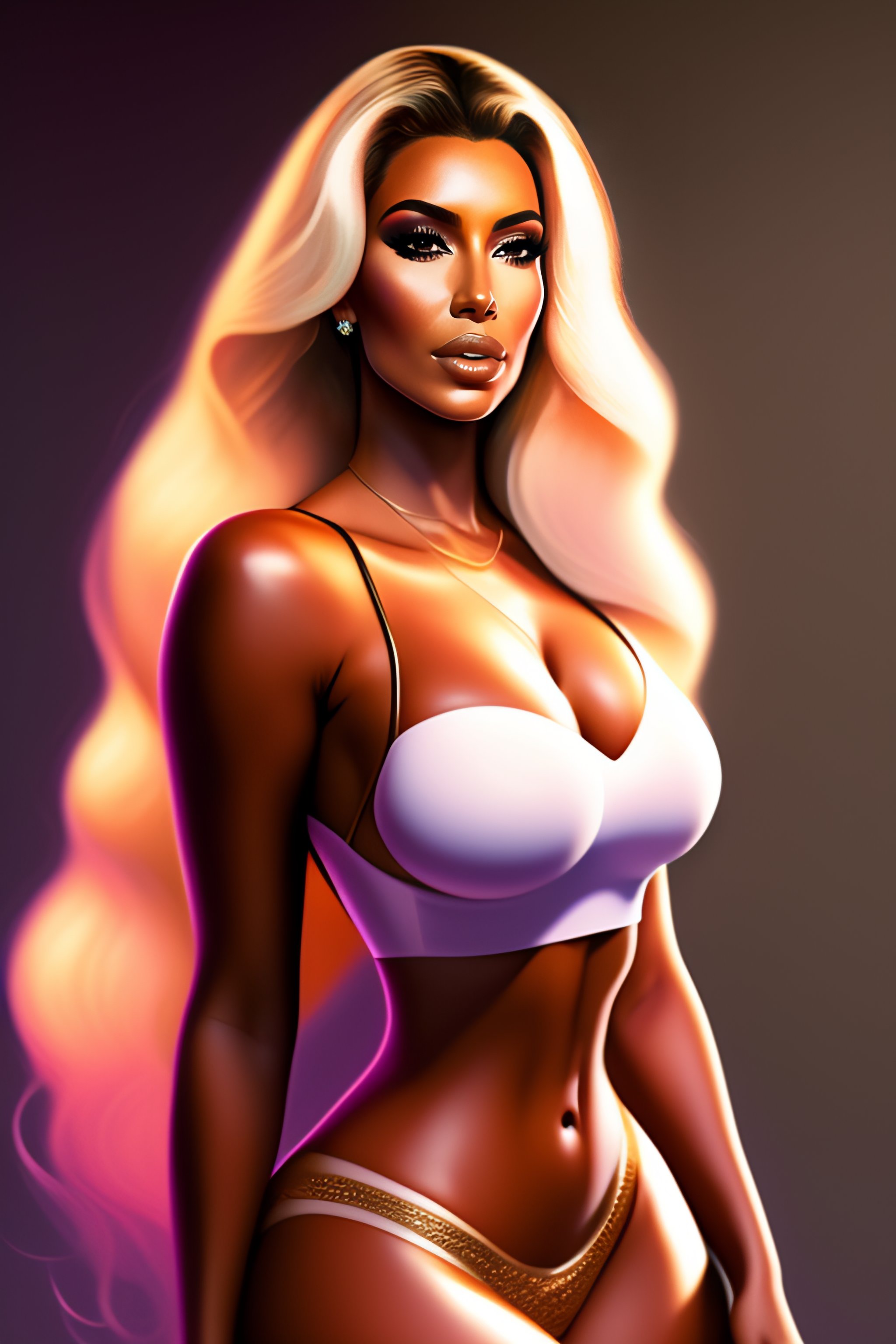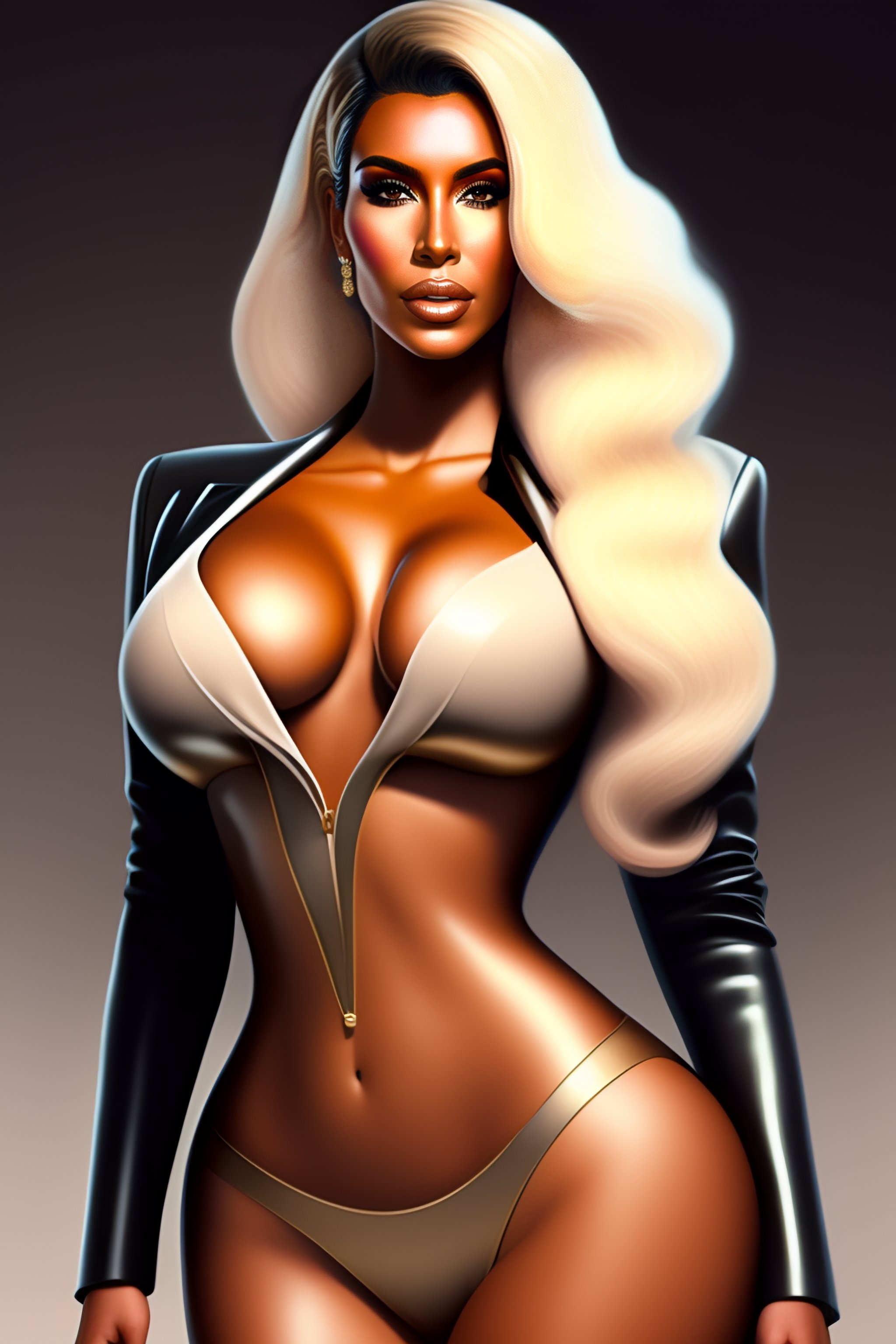 Kim kardashian perfect hourglass body, pretty face, blond wearing v neck, snakeskin pants, portra 400 medium format, plain background, futurstic concept art, huge thick long perfect hair, pixar concept
