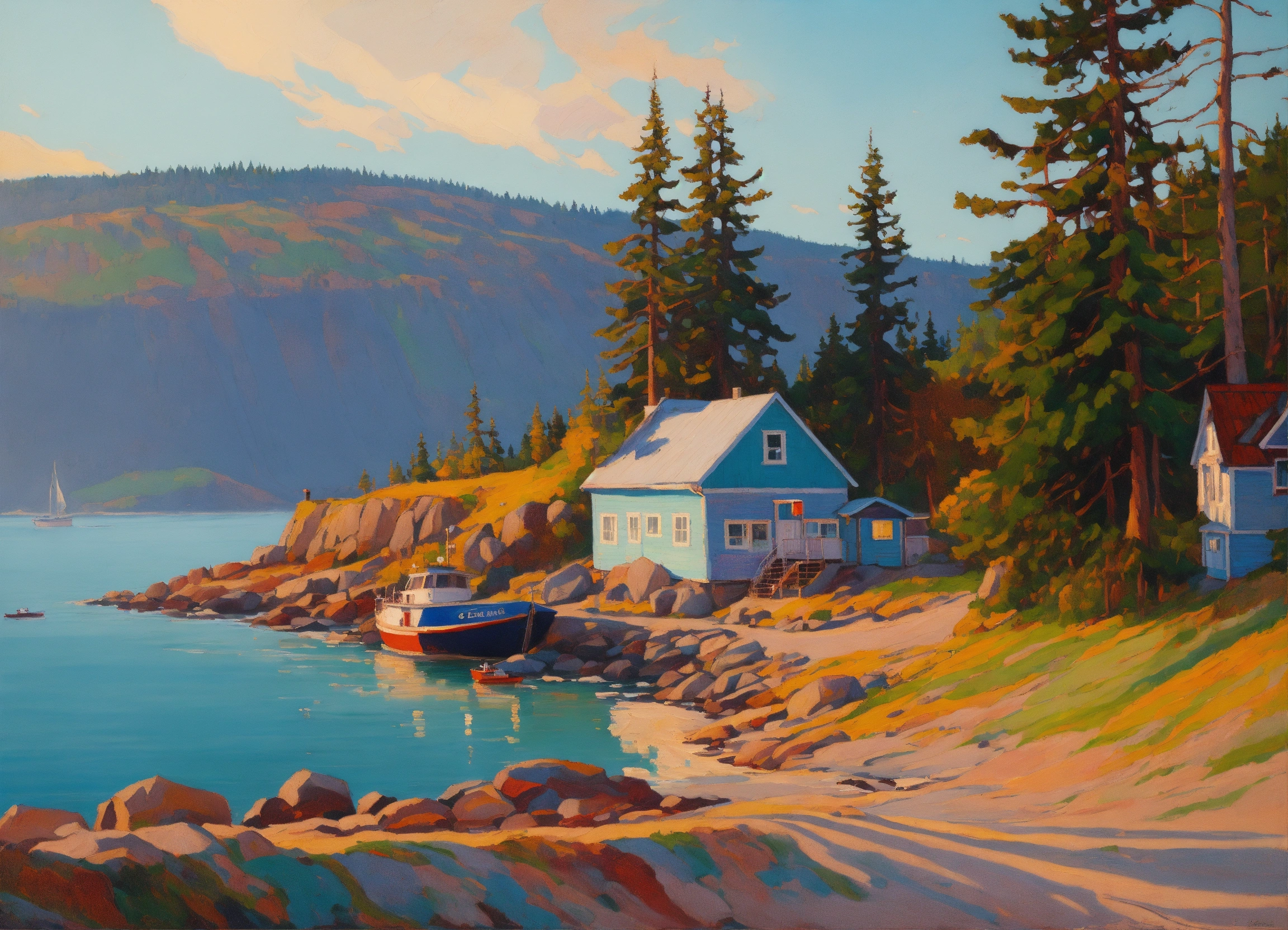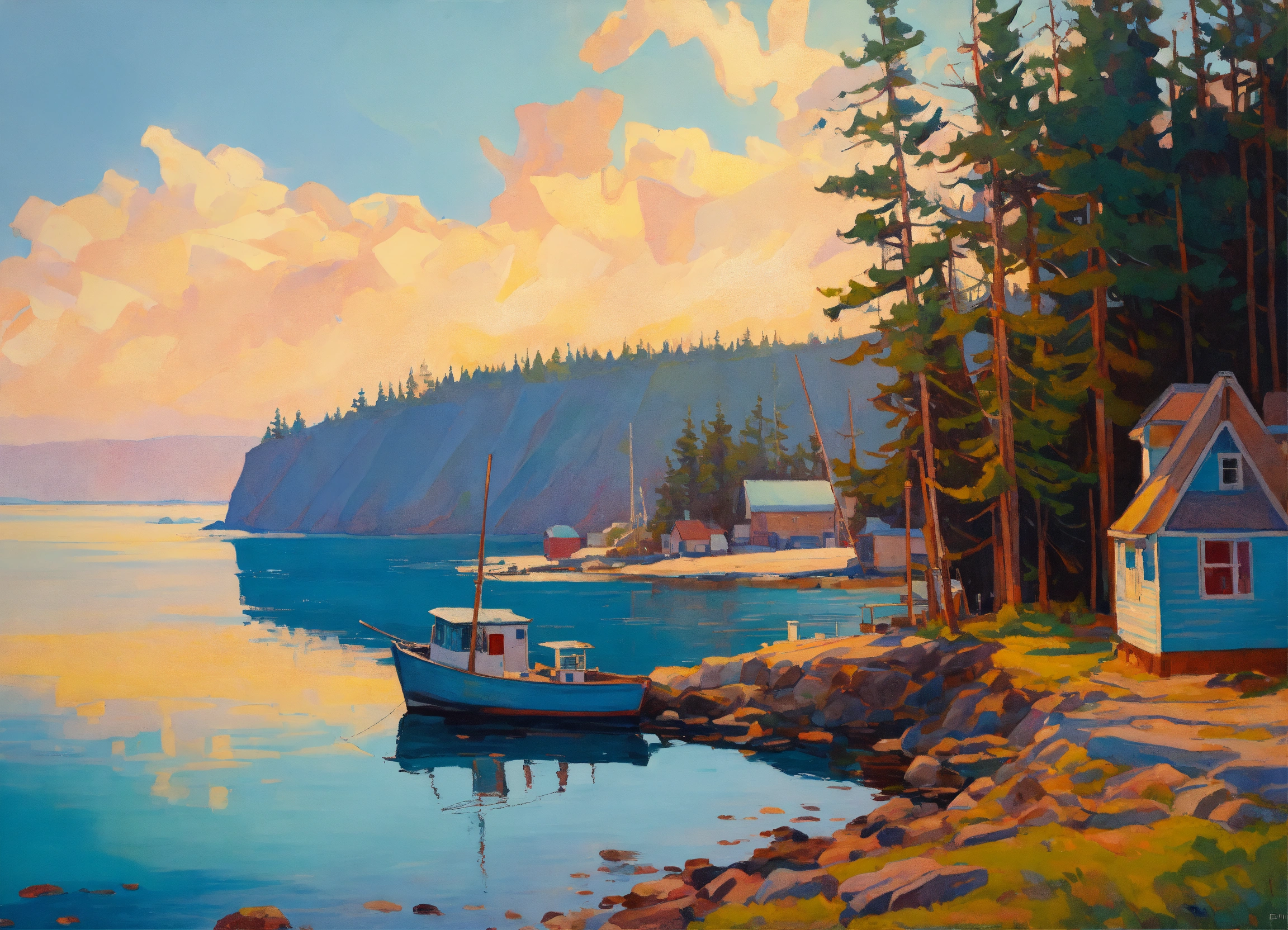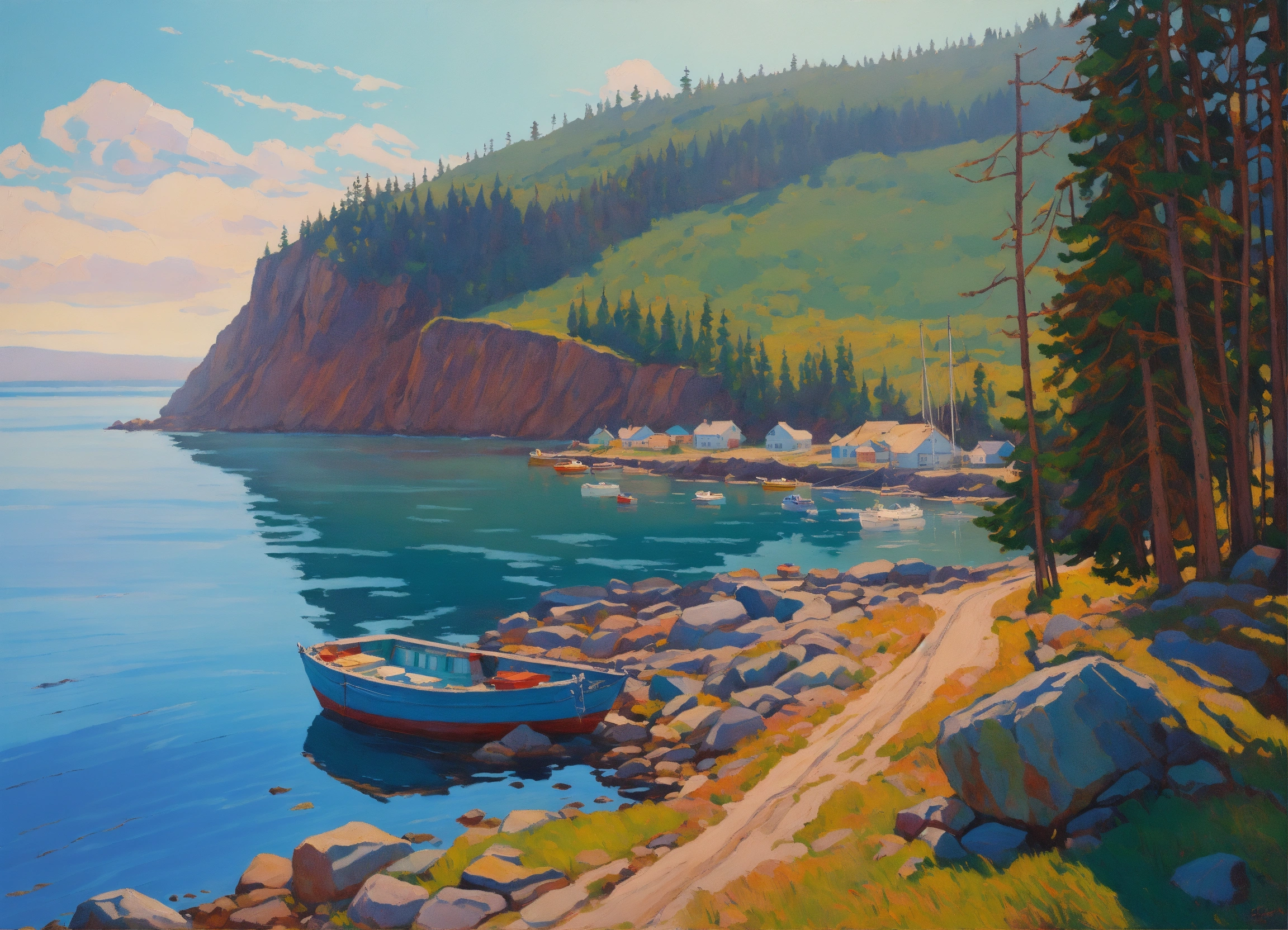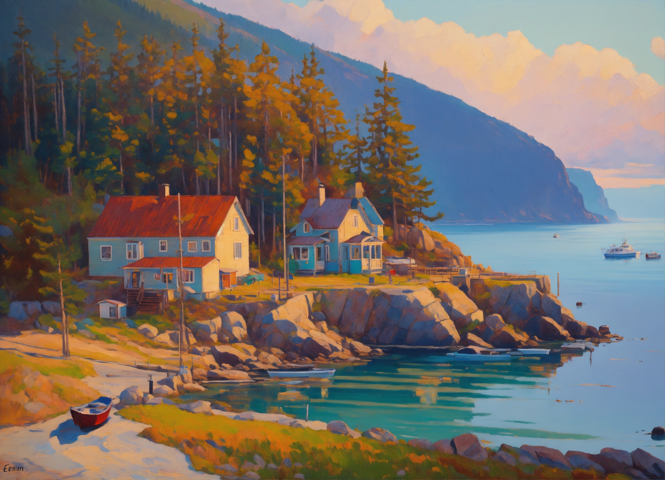 Ocean, seashore, some gaspé cliffs, labrador landscape, rpg style, erin hanson, trees, boat, quay, wharf, morning light with long shadows and mist, some fog, house, painting, hill, spruce tree, some sand