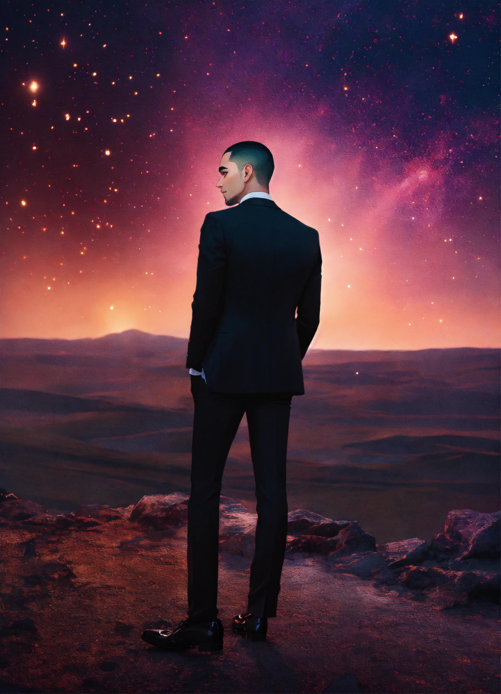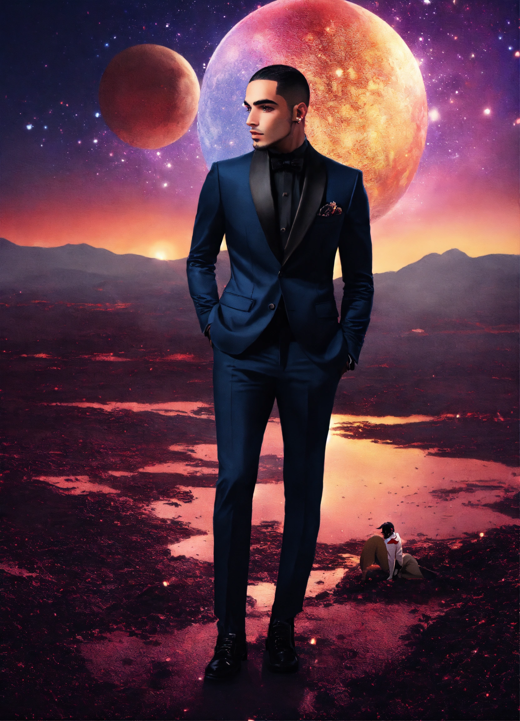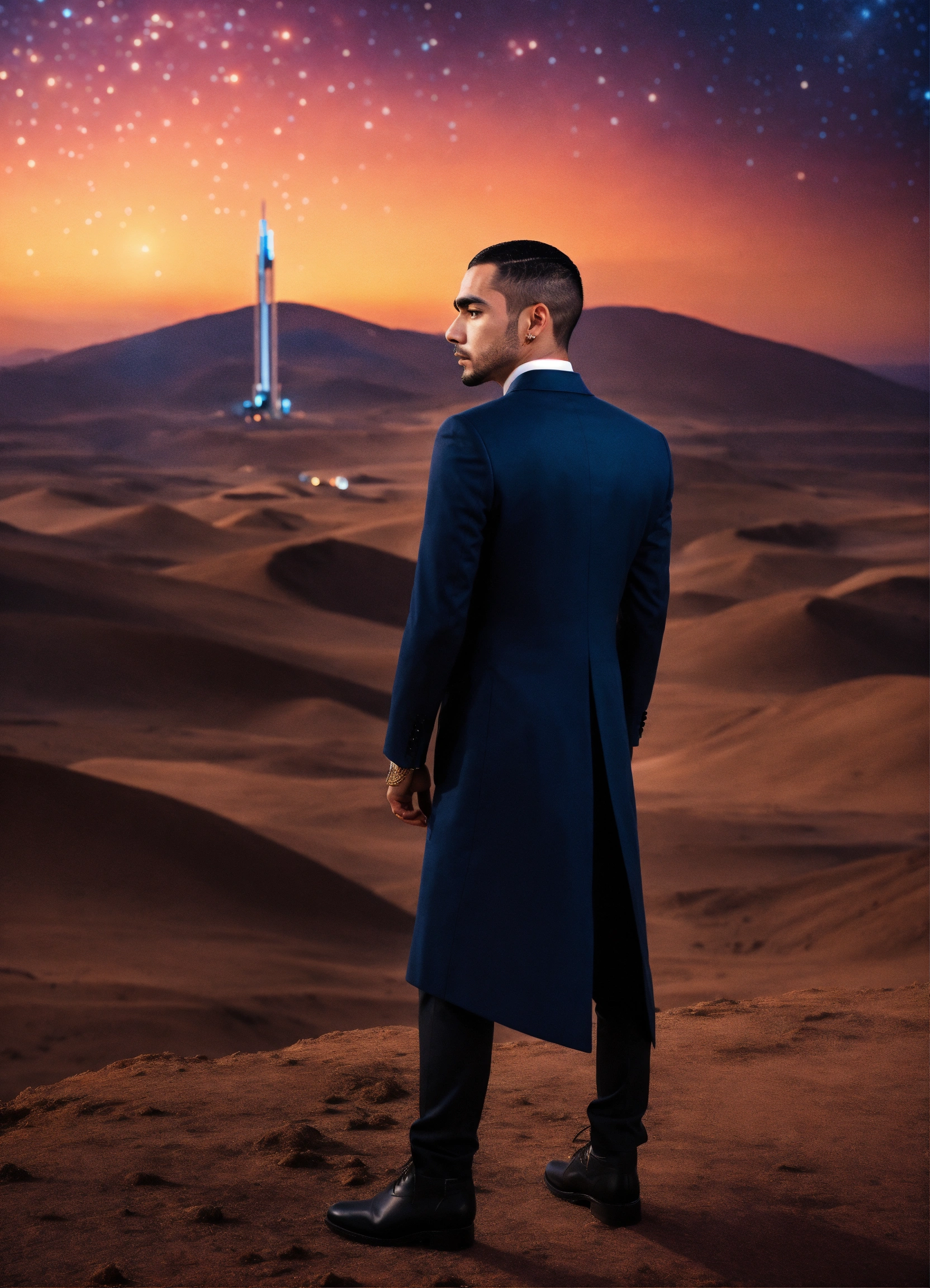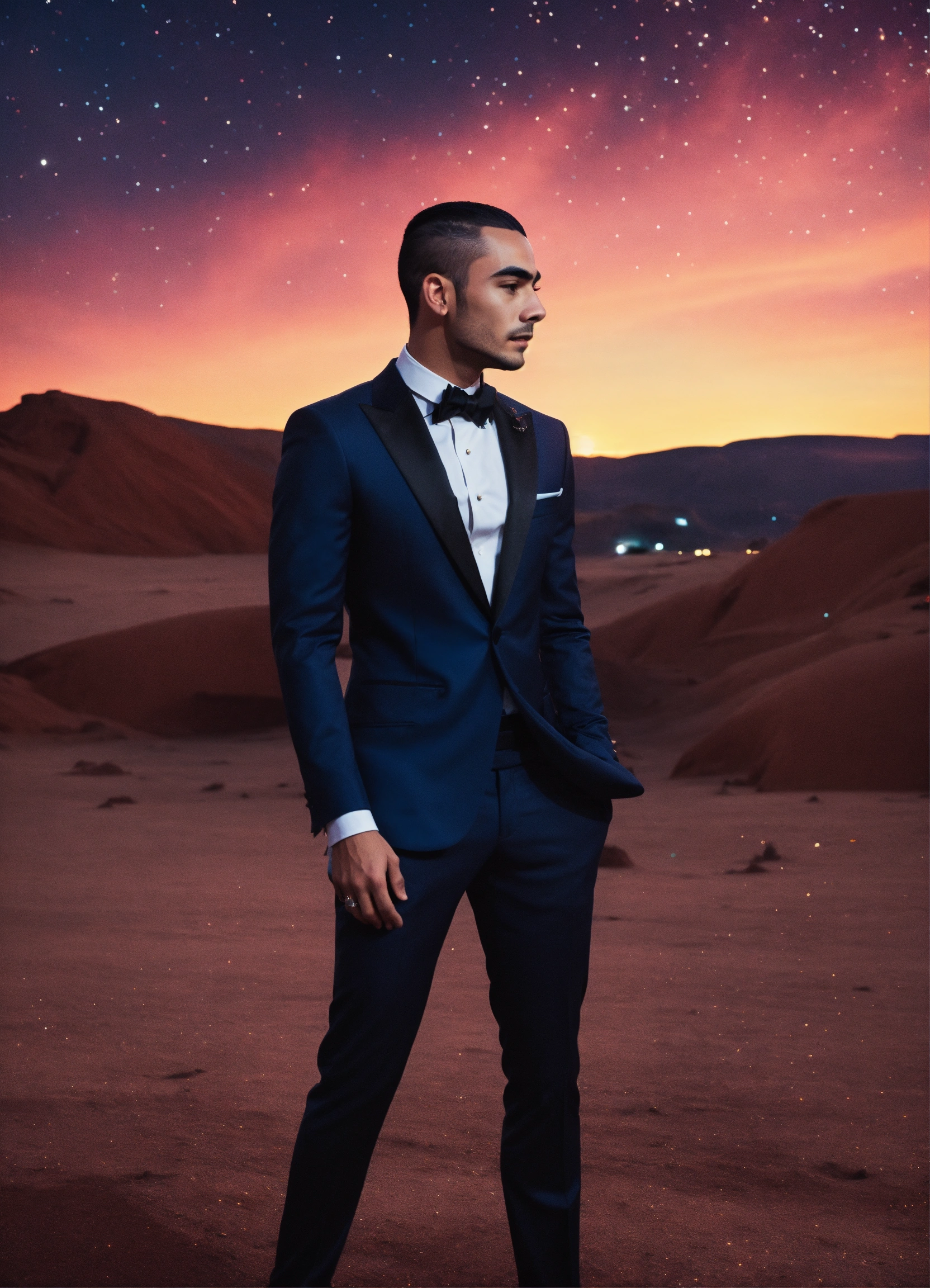 Manny montana, tuxedo, dark hues, back half turned, in a futuristic landscape, full body, stars falling, sunrise, realistic, photoshoot