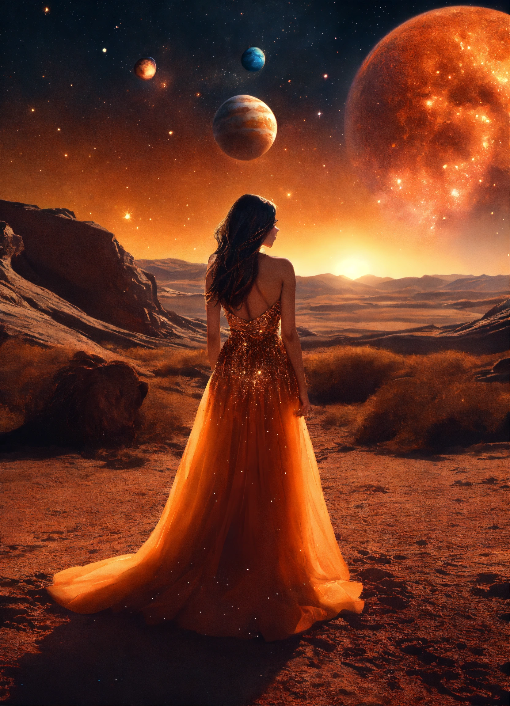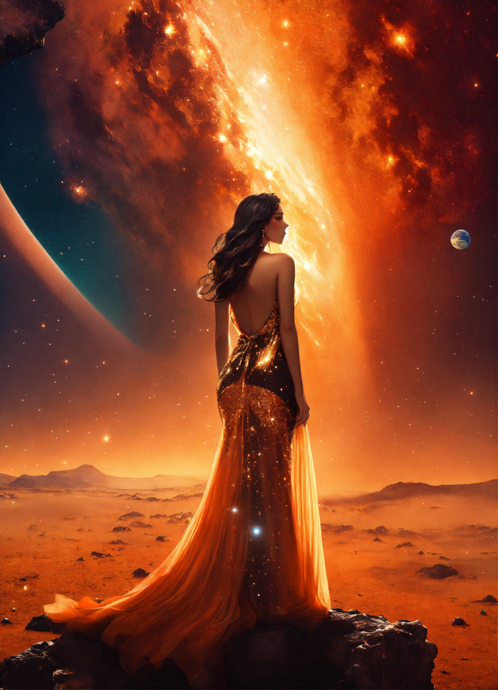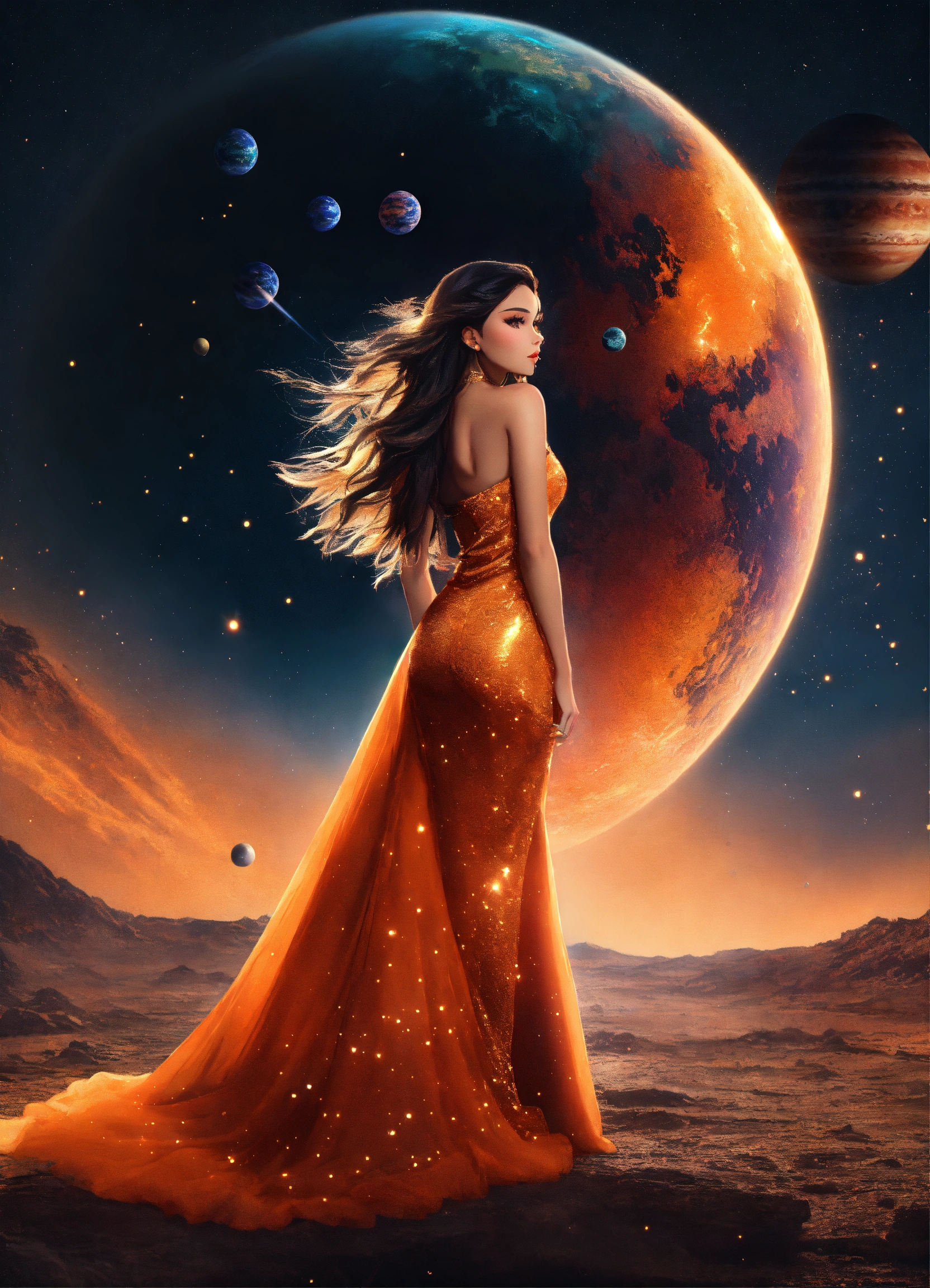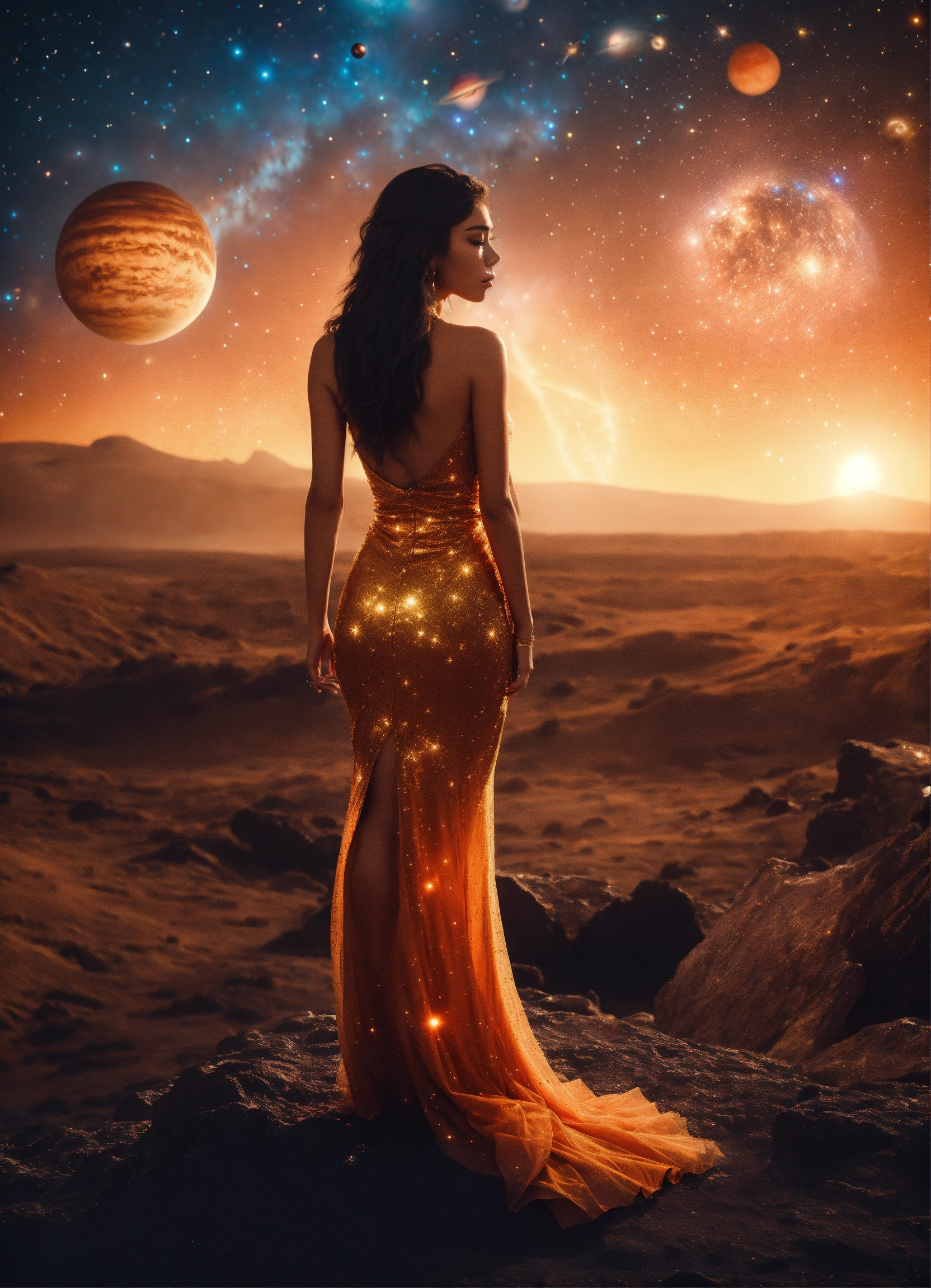 Madison beer in a orange sparkling cocktail dress, black, on an isolated planet, back turned. stars raining down, a majestic lion with golden mane watching her. galaxy filled with planets, realistic. full body. 4k real photoshoot.