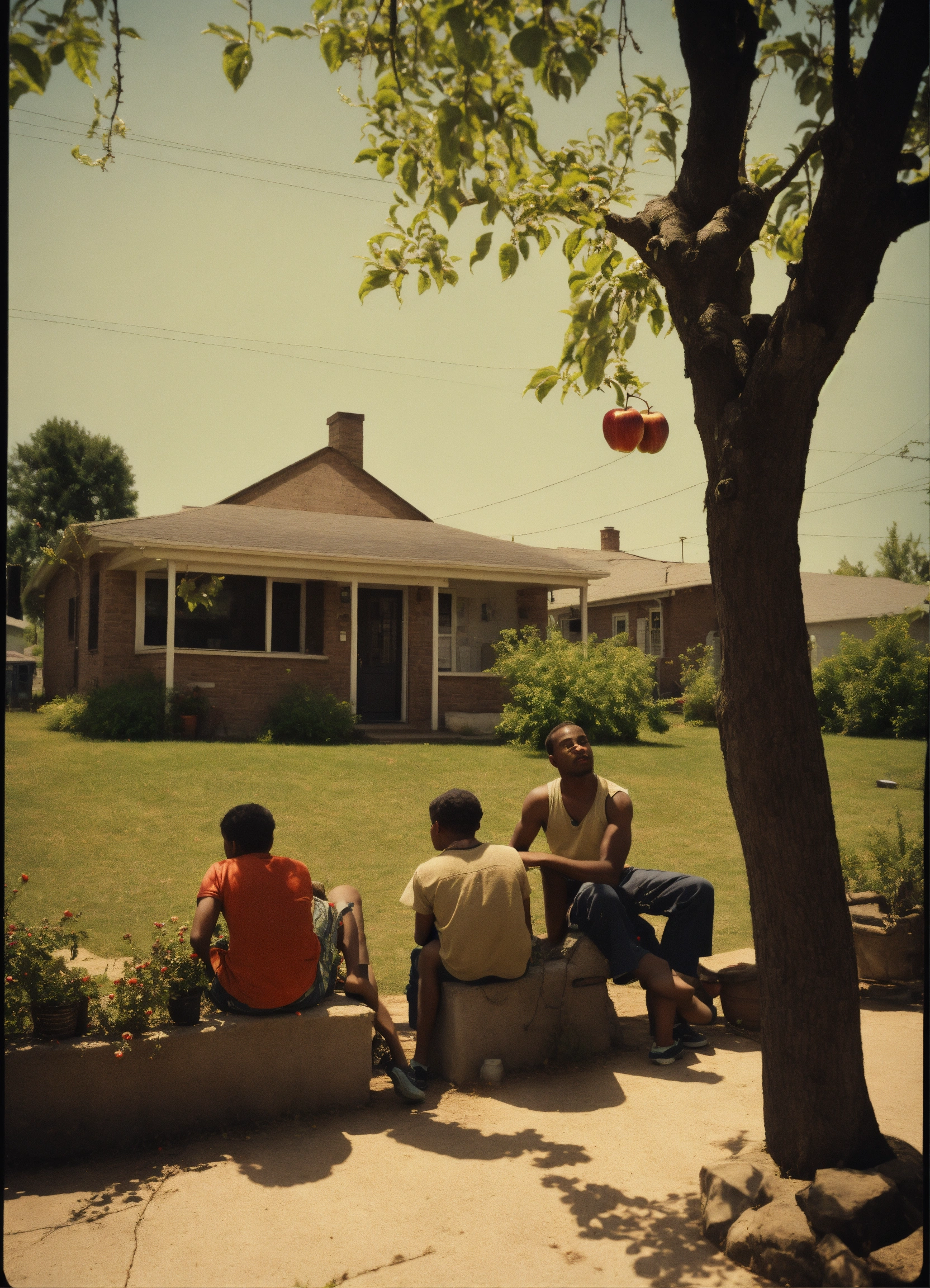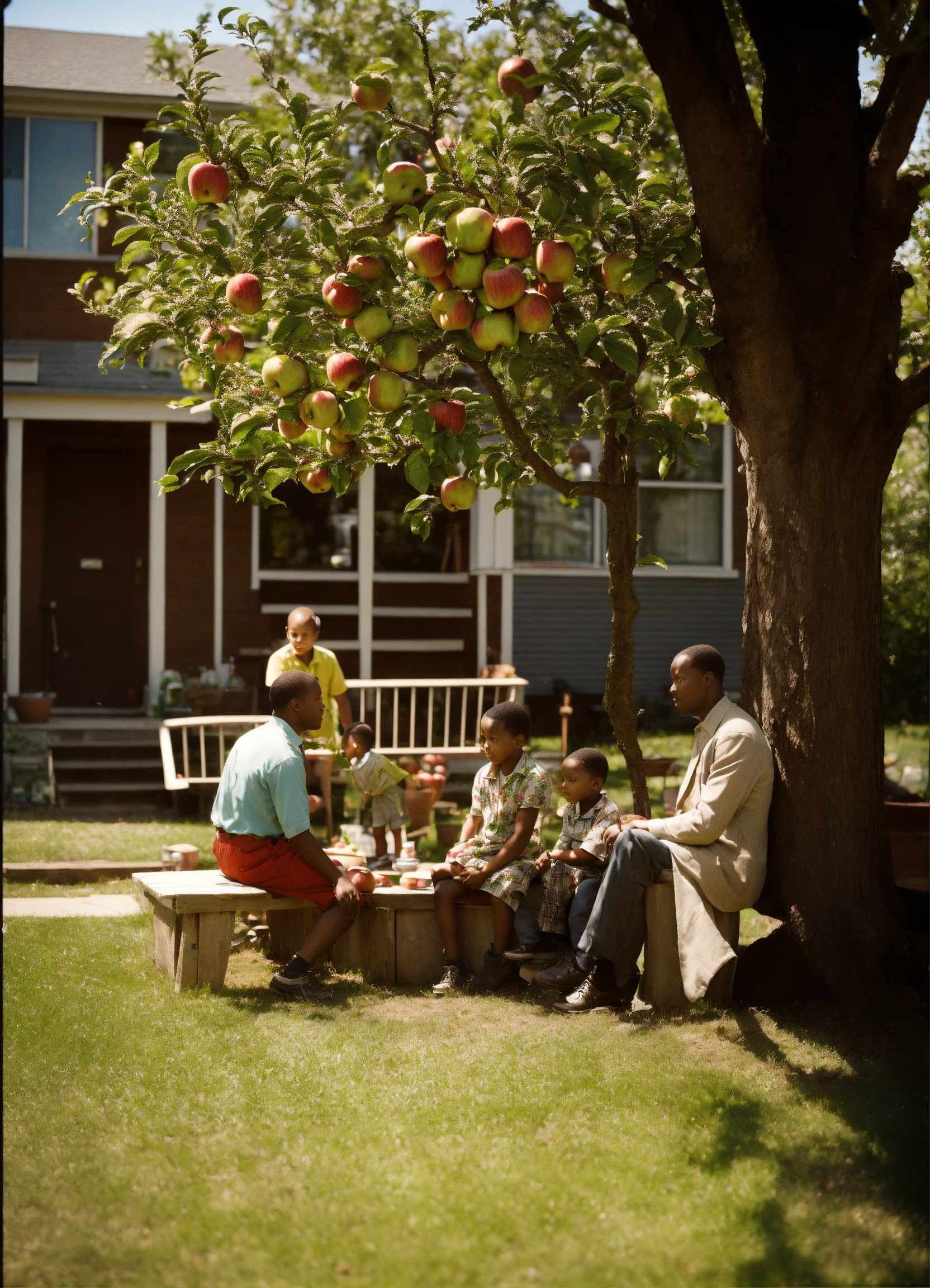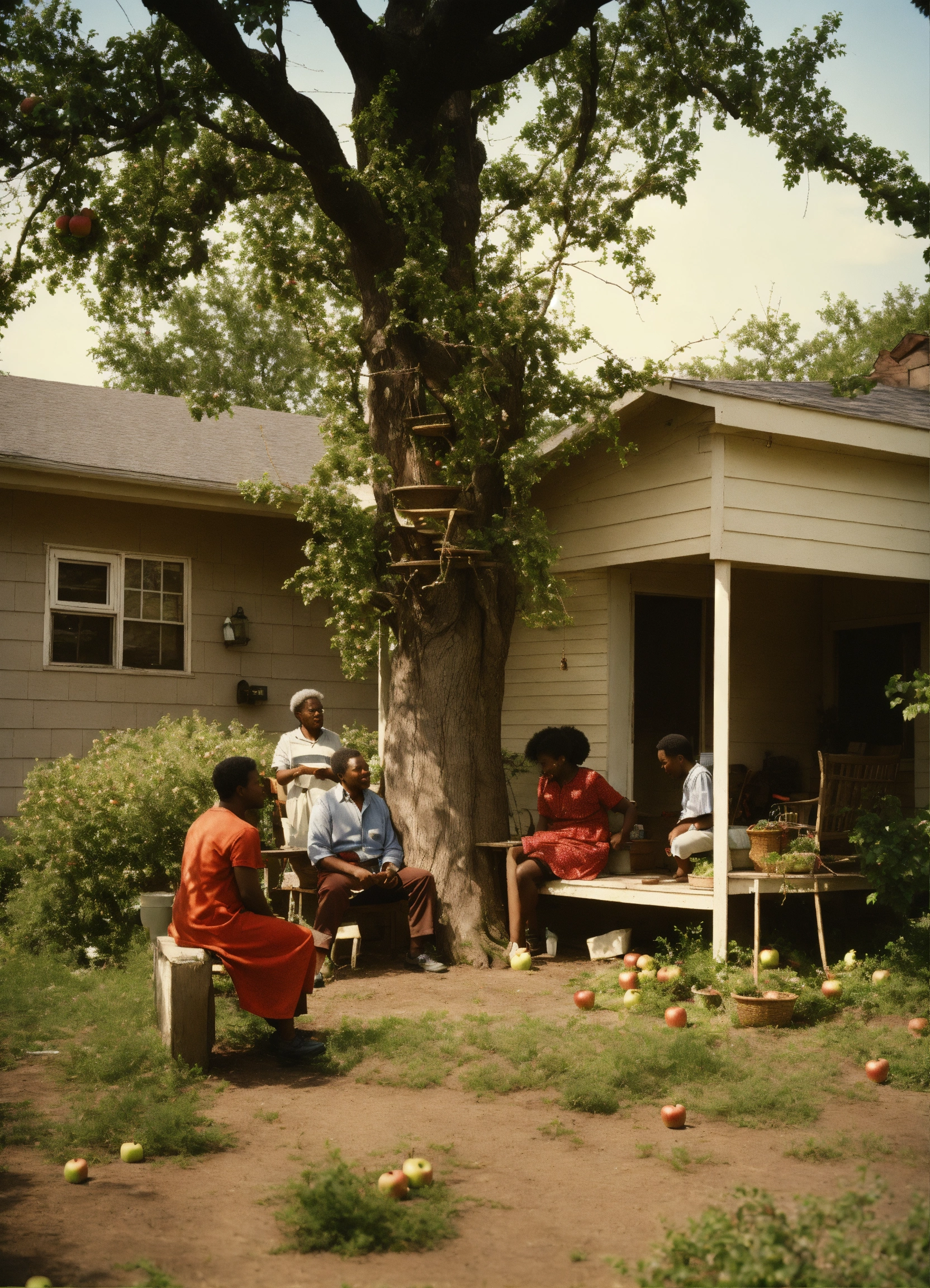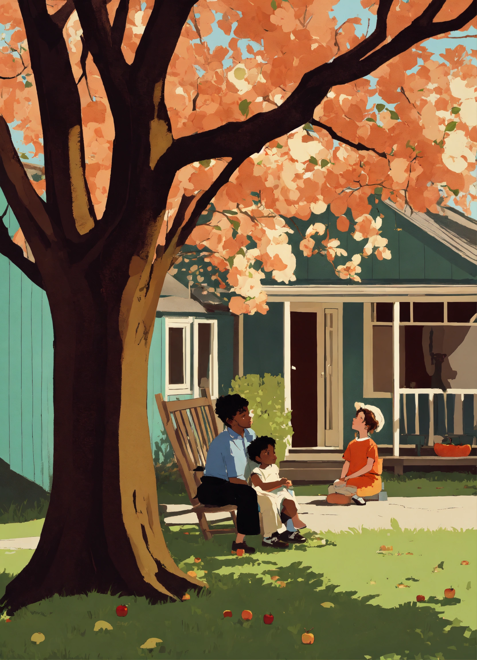 Setting 1960s backyard and porch of an urban home. in the foreground a black, 55-year-old woman is seated on the porch, and she is holding a five-year-old boy. in the background a 25-year-old man under the apple tree. a balding, 55-year-old man under an apple tree men are having a conversation by themselves. a well-grown apple tree, possibly discussing it.