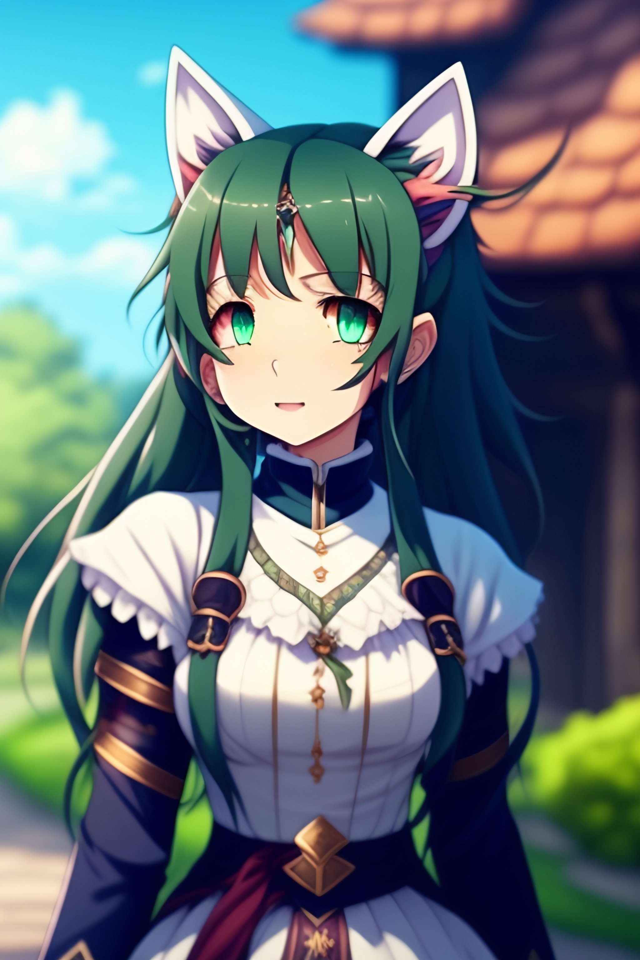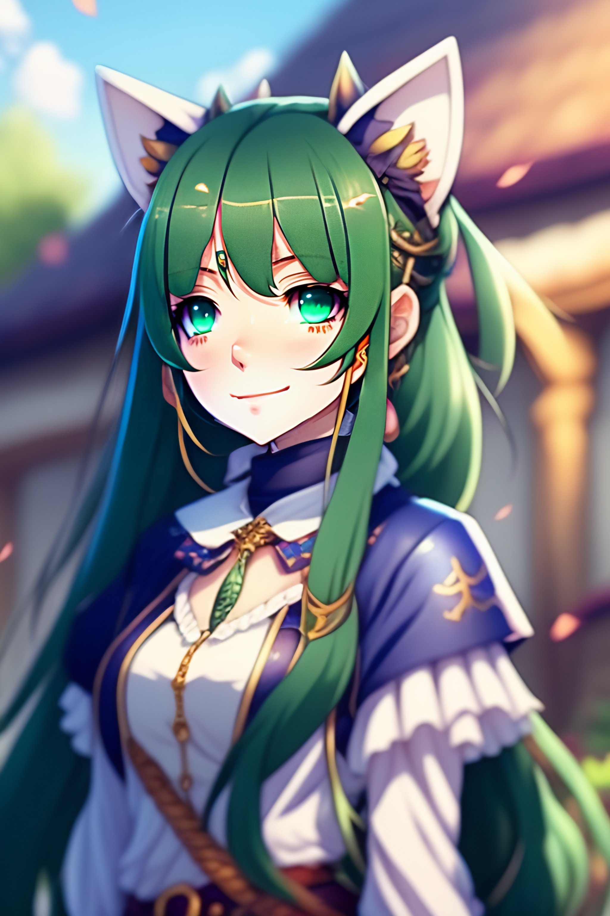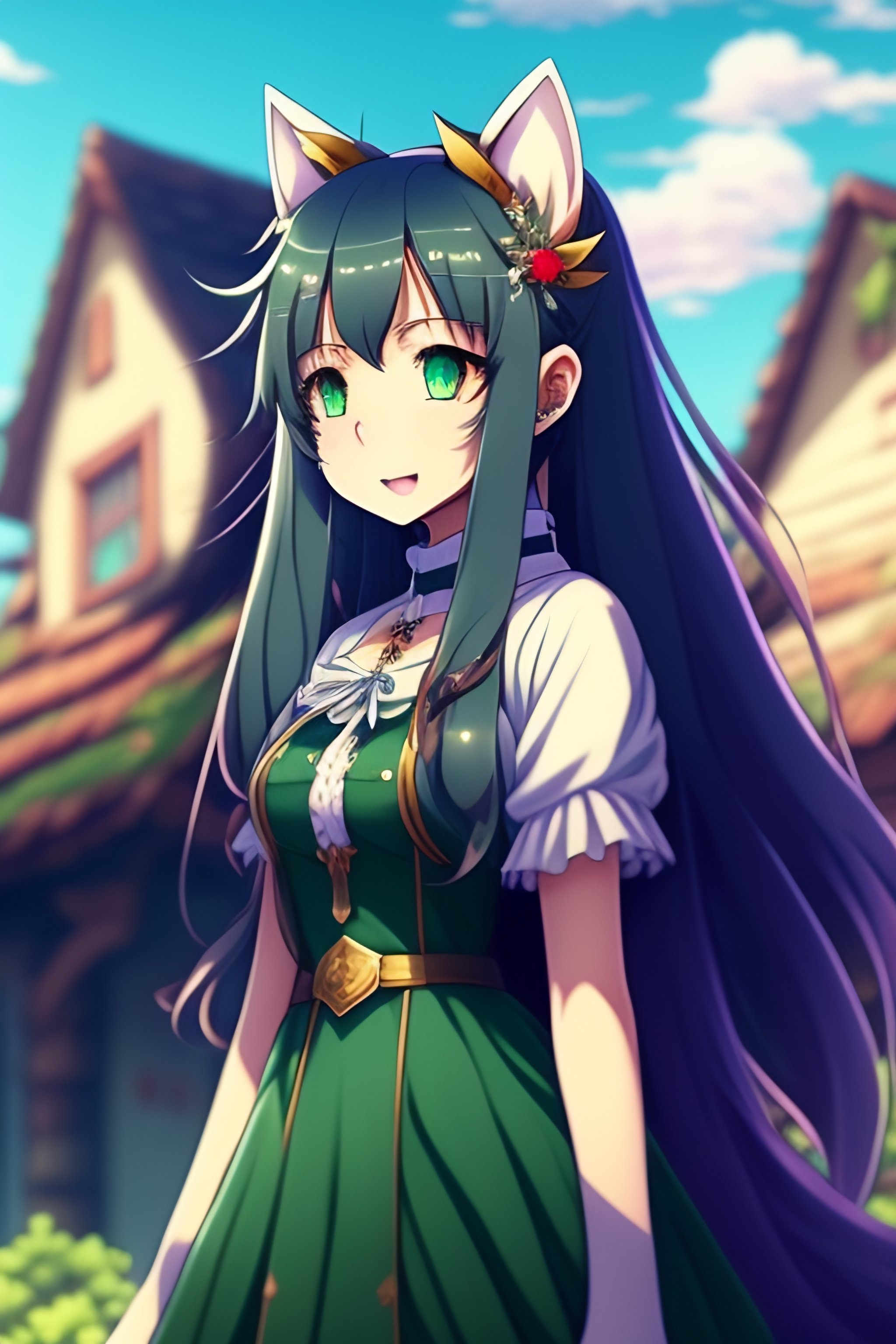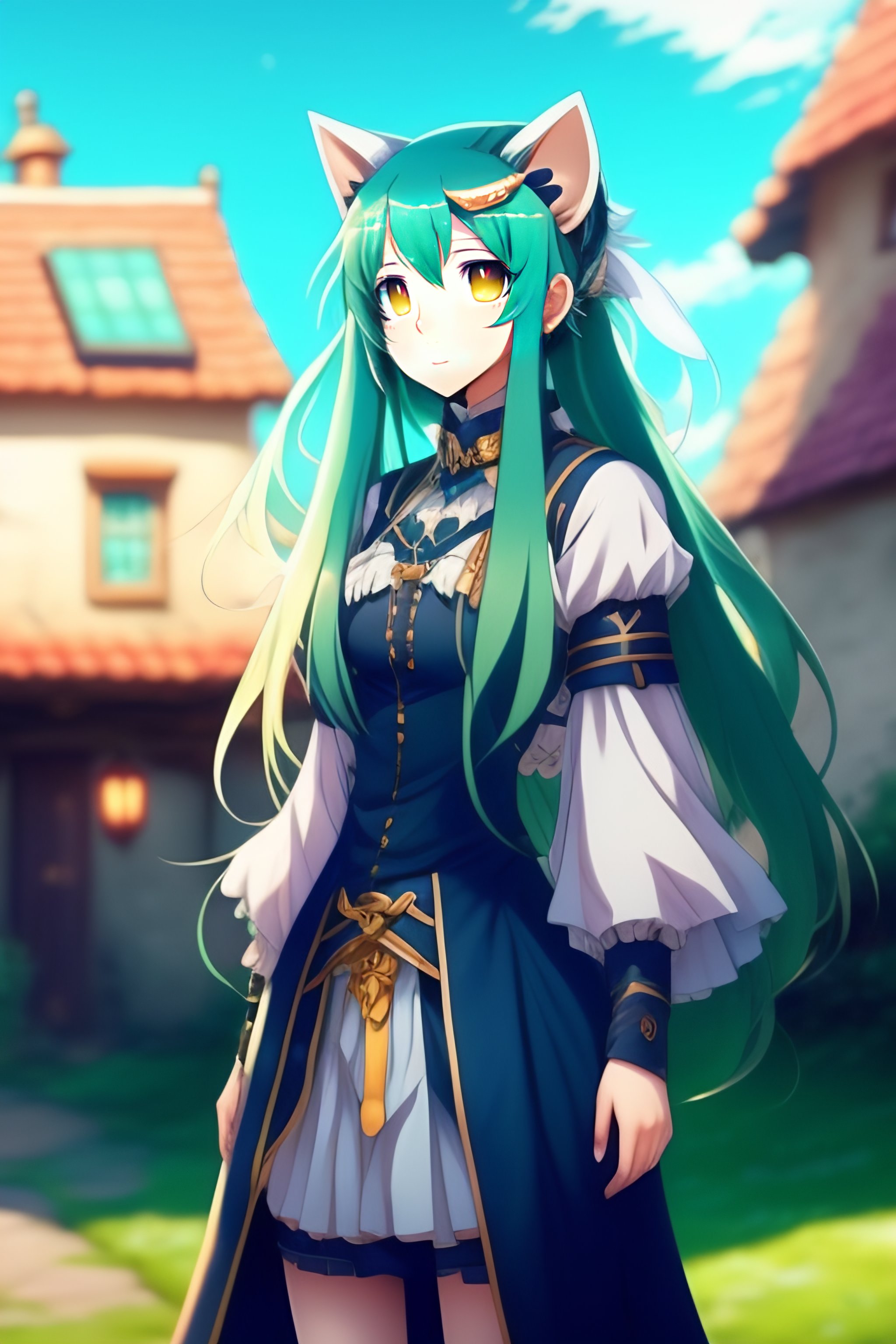 Cute anime girl, long hair, green eyes, blue hair, house in the background, smal cat ears, smiling, medival clothing, right hand magic wand, short clothes