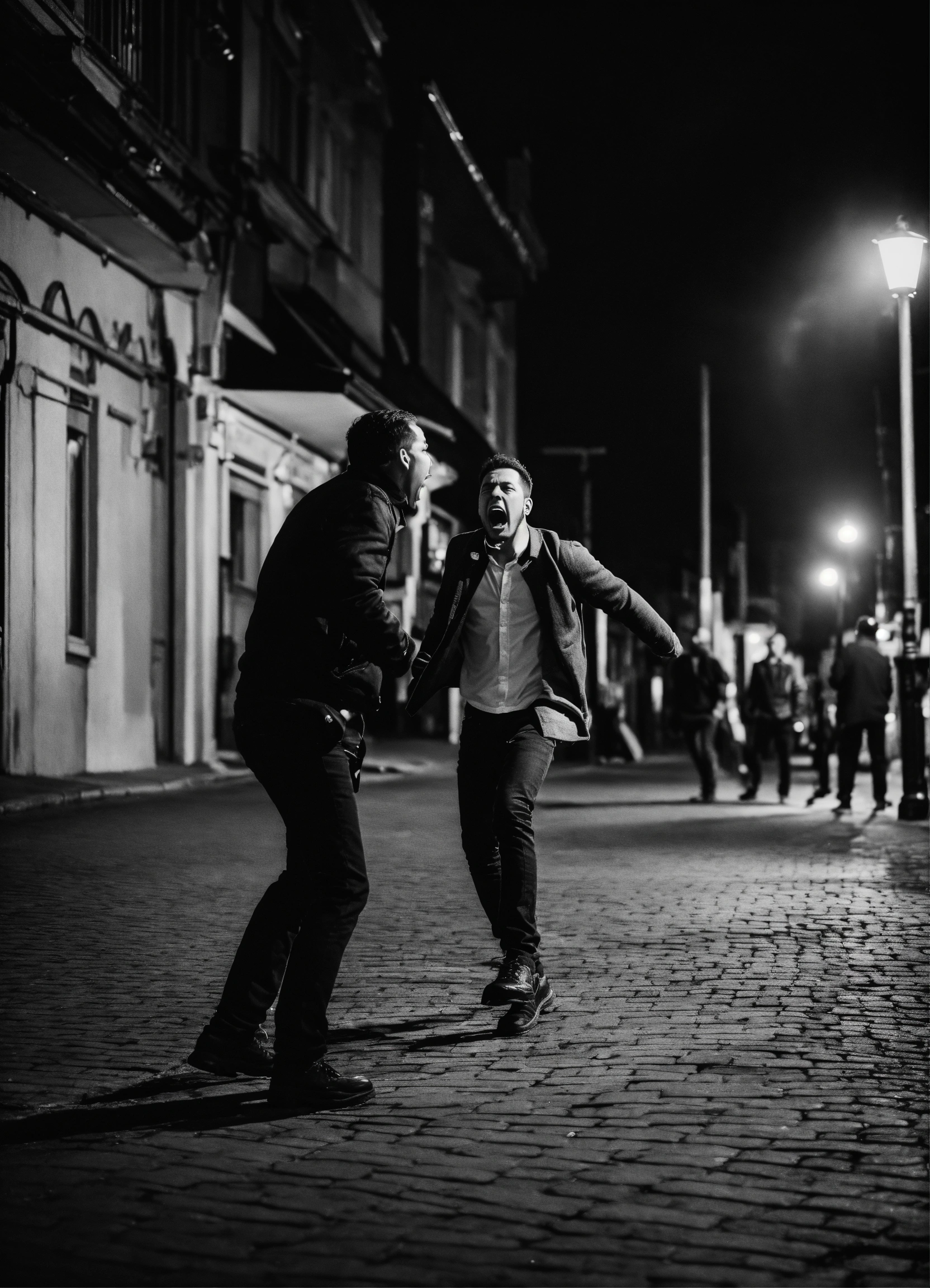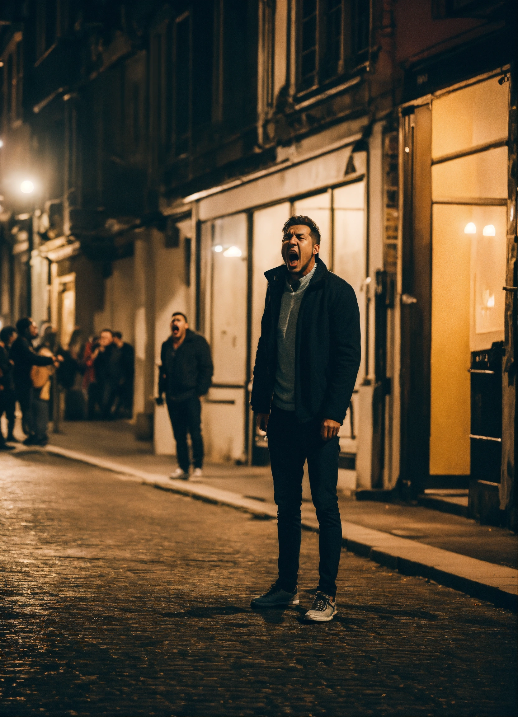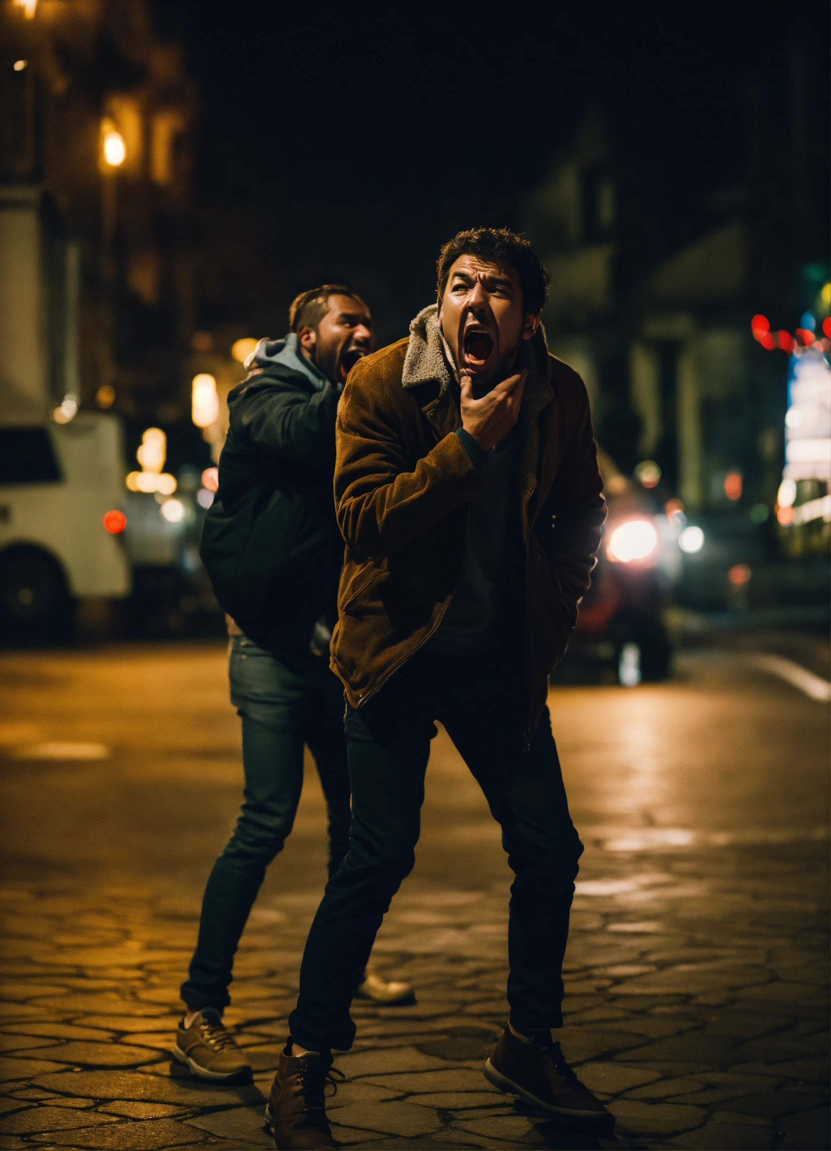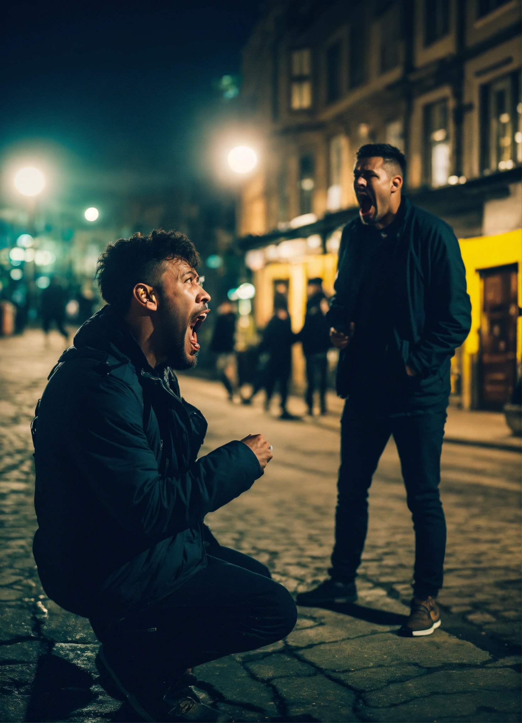 Man shouting at a scared person in the street at night