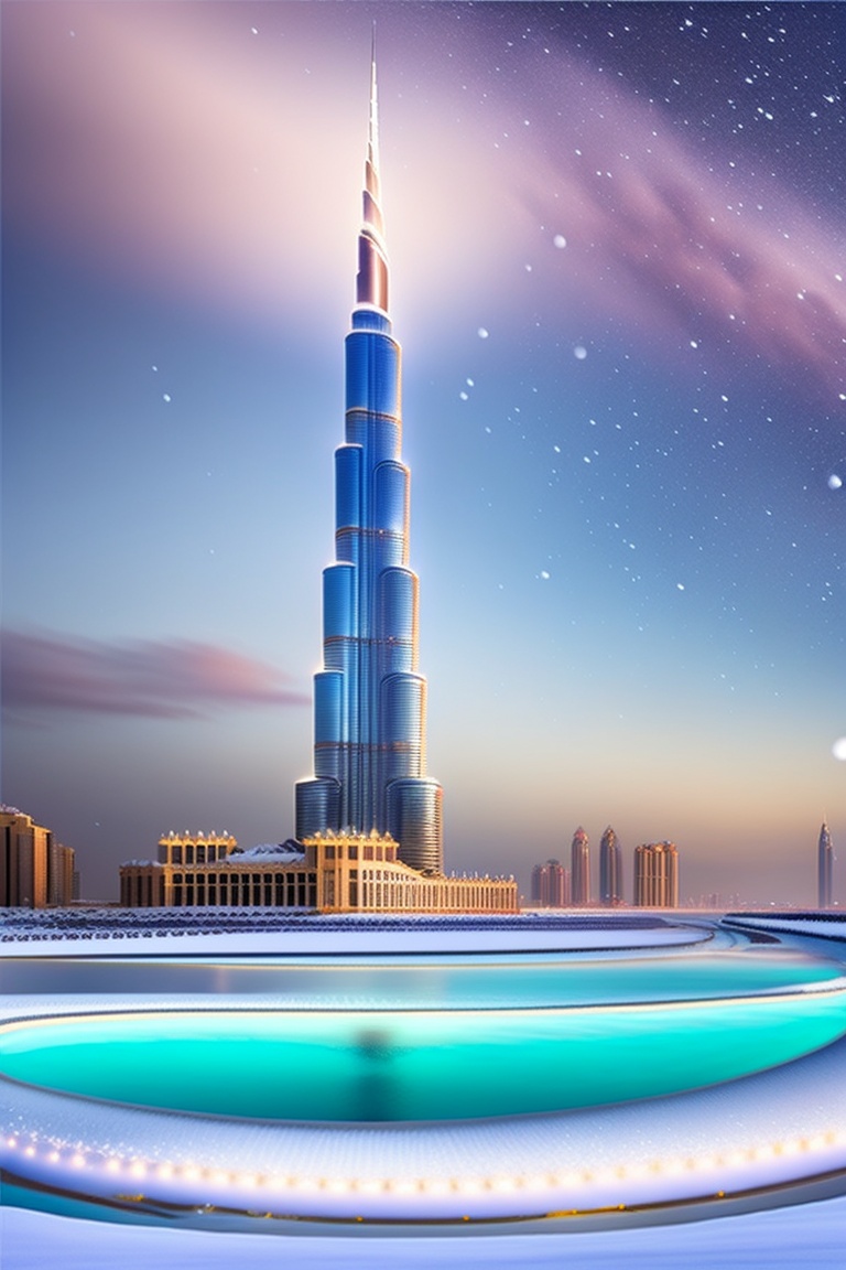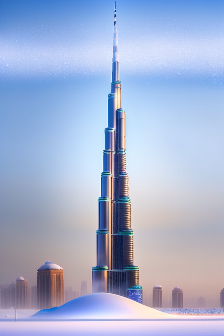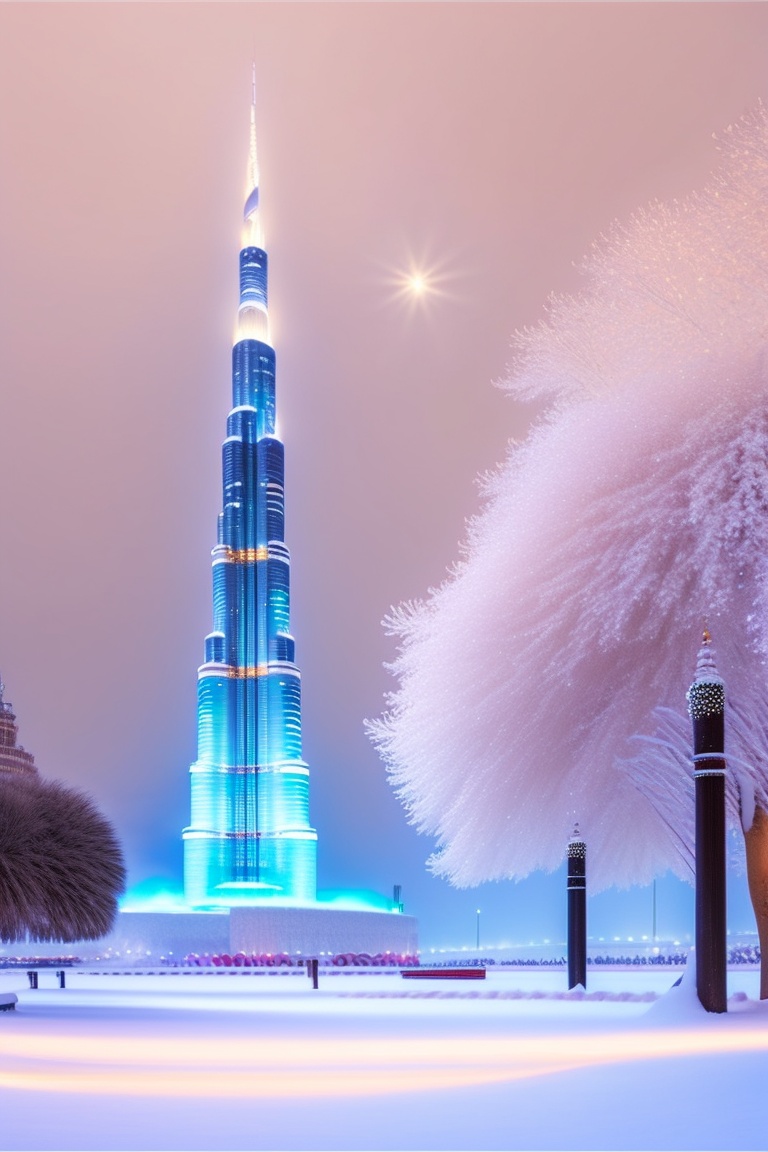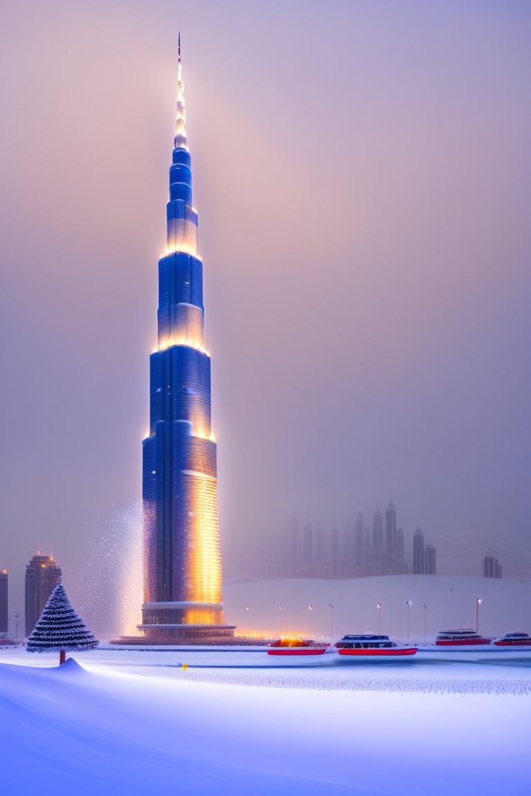 A view of the burj khalifa in the snow-covered city of dubai, with extreme cold temperatures, in a christmas setting, with snowflakes, toboggan runs and skies.