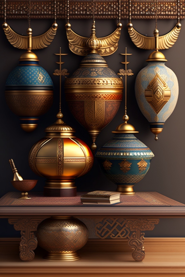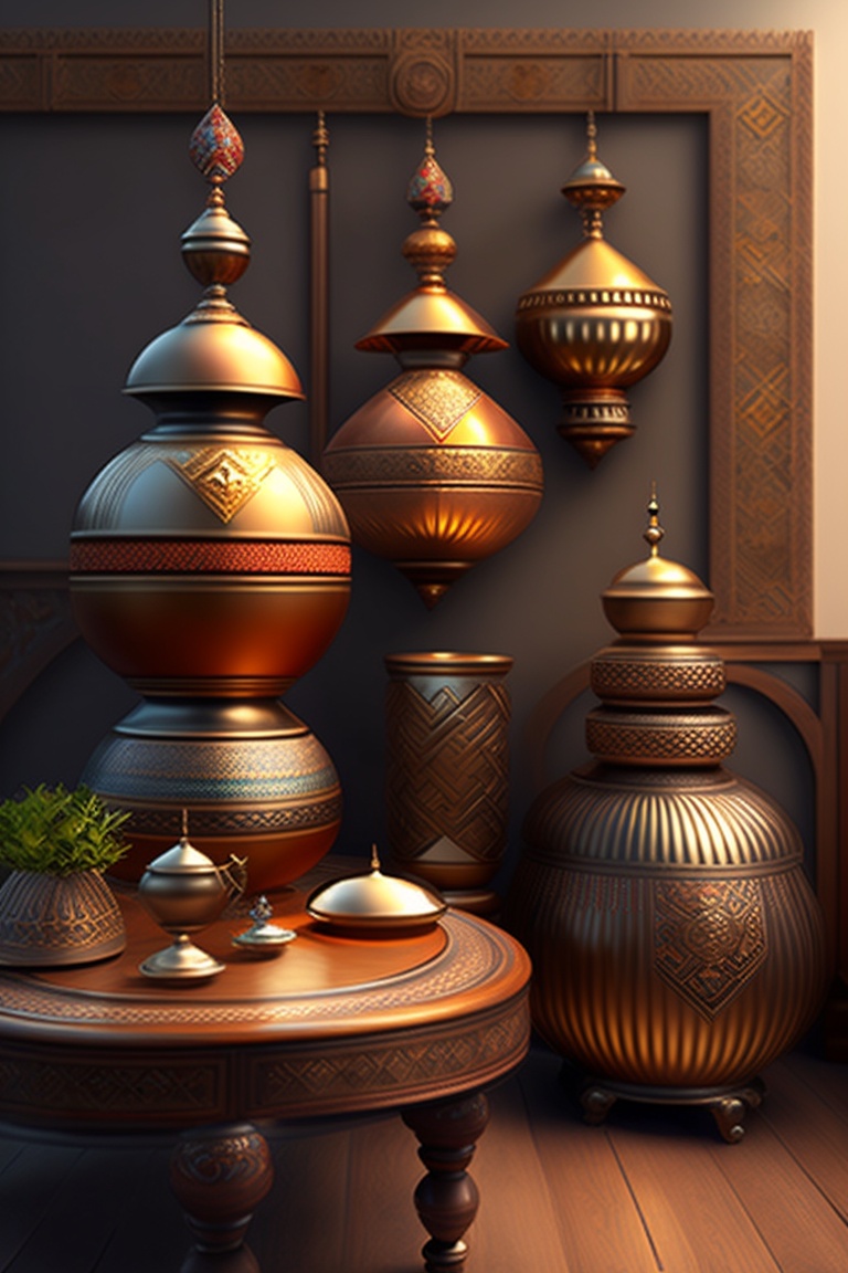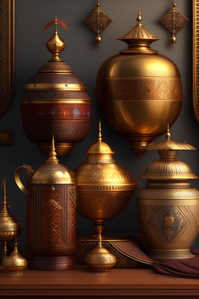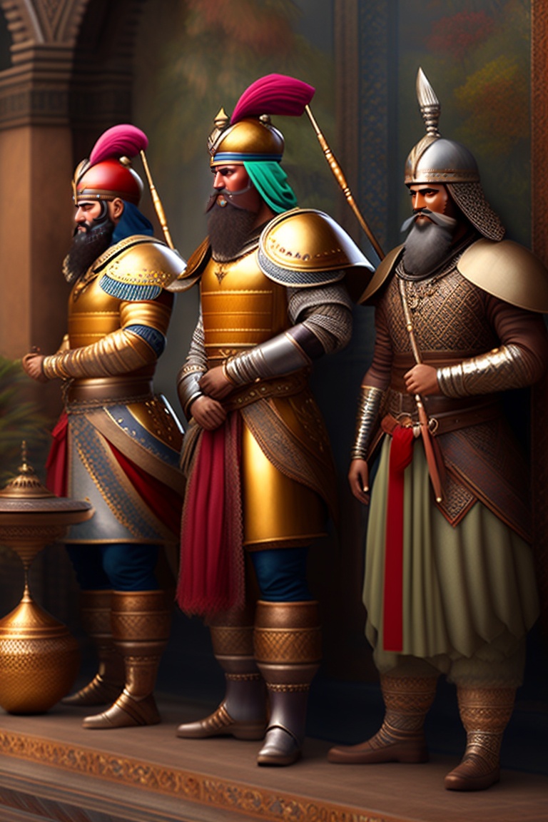 Indo persian arms and armour on the table and hung on wall, war moody aesthetic, cinematic, browns, shields, sikh warriors