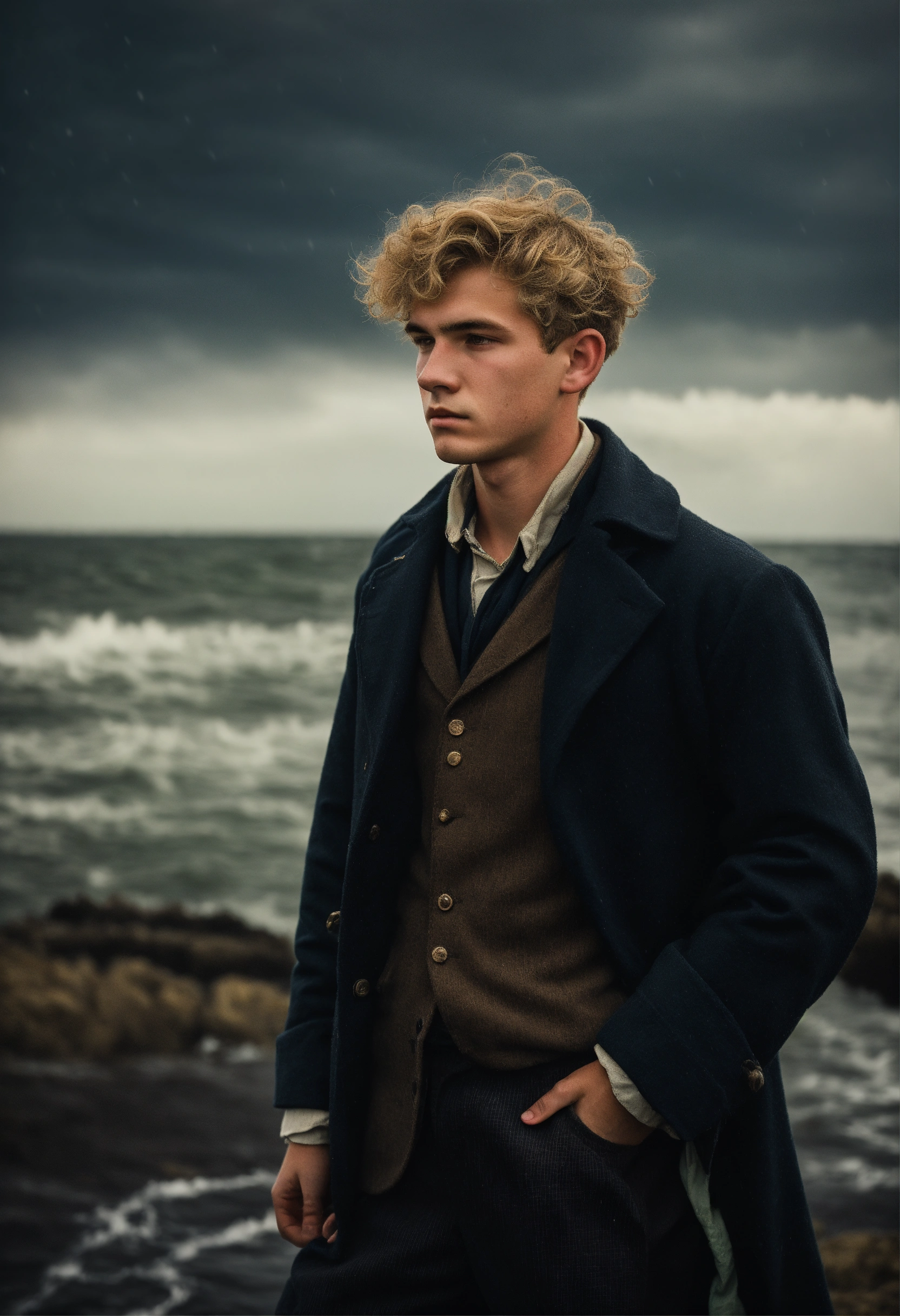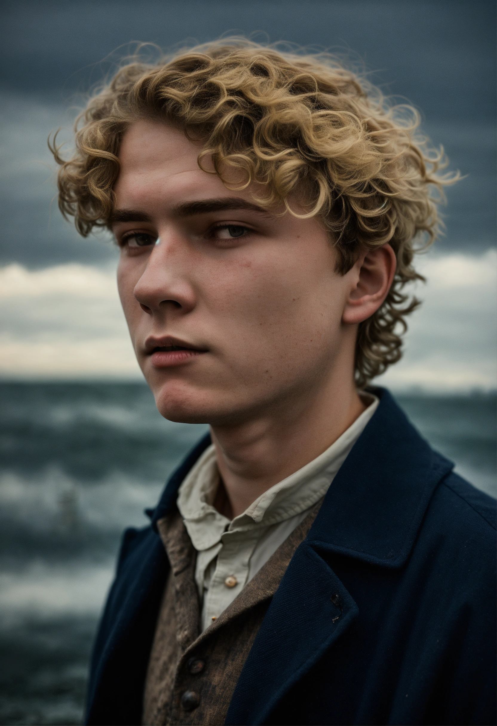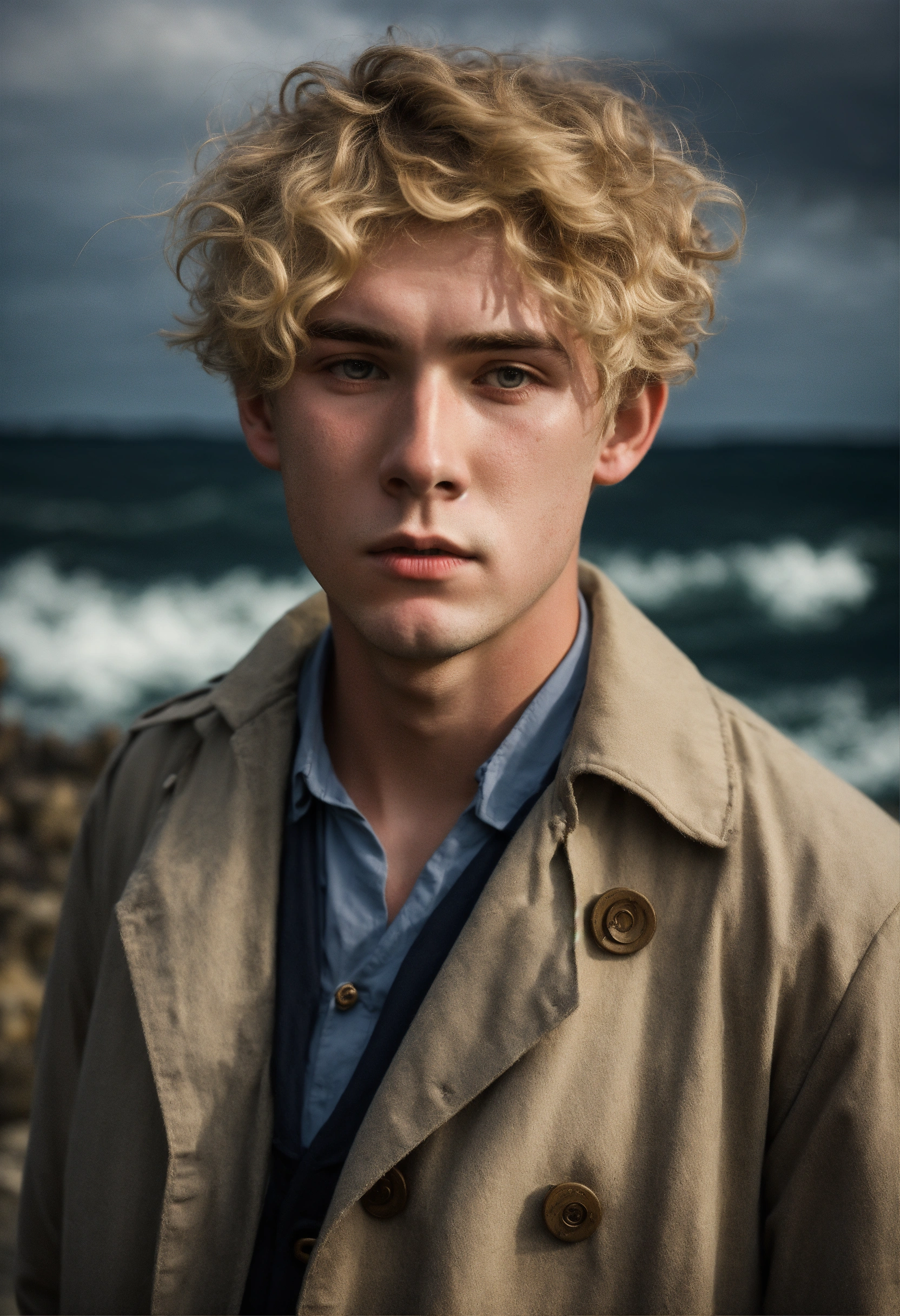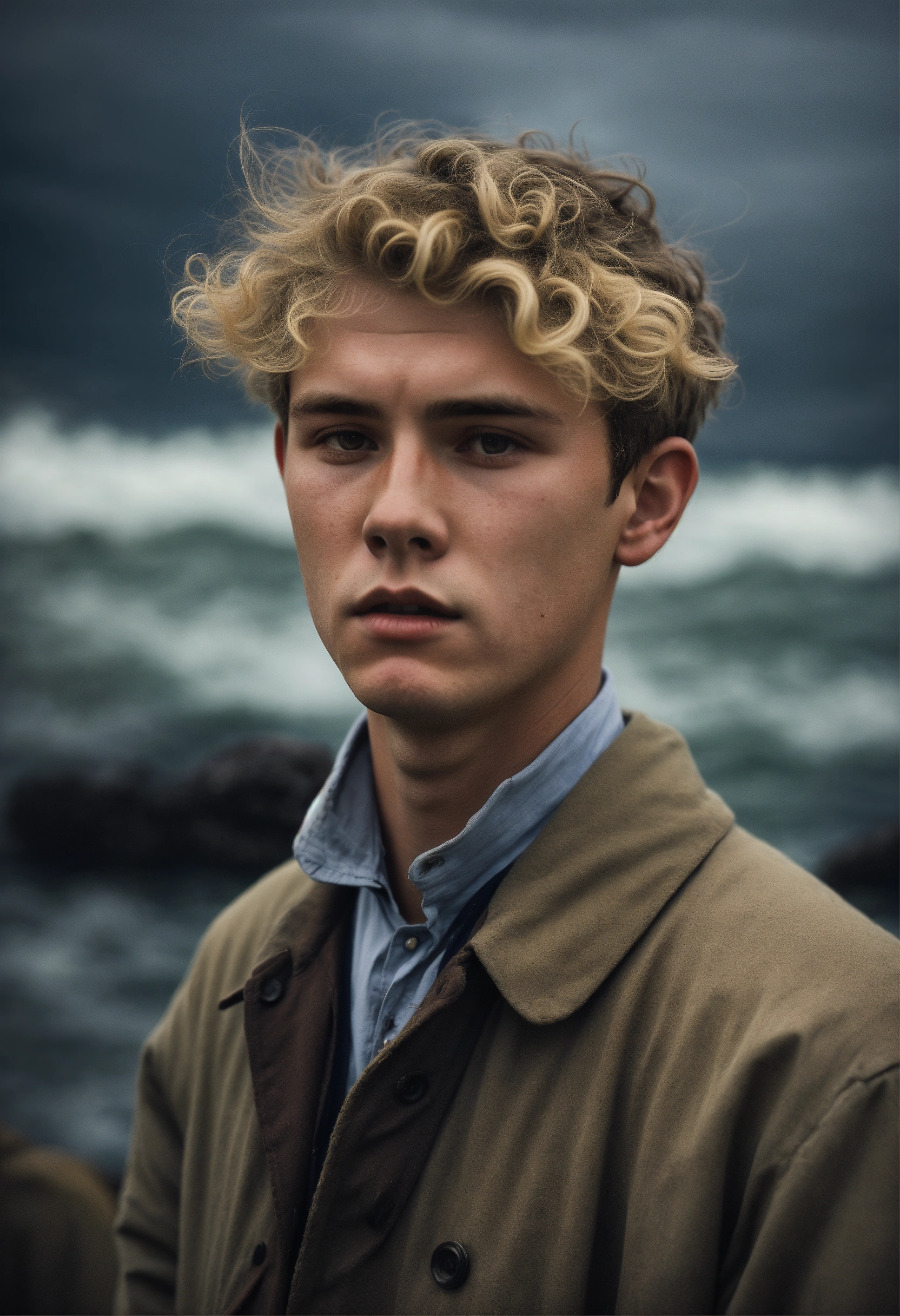 1910's 20 year old boy, wearing 1900's poor boy clothes, serious, short light blonde curly hair, by the dark ocean, in storm, lighthouse
