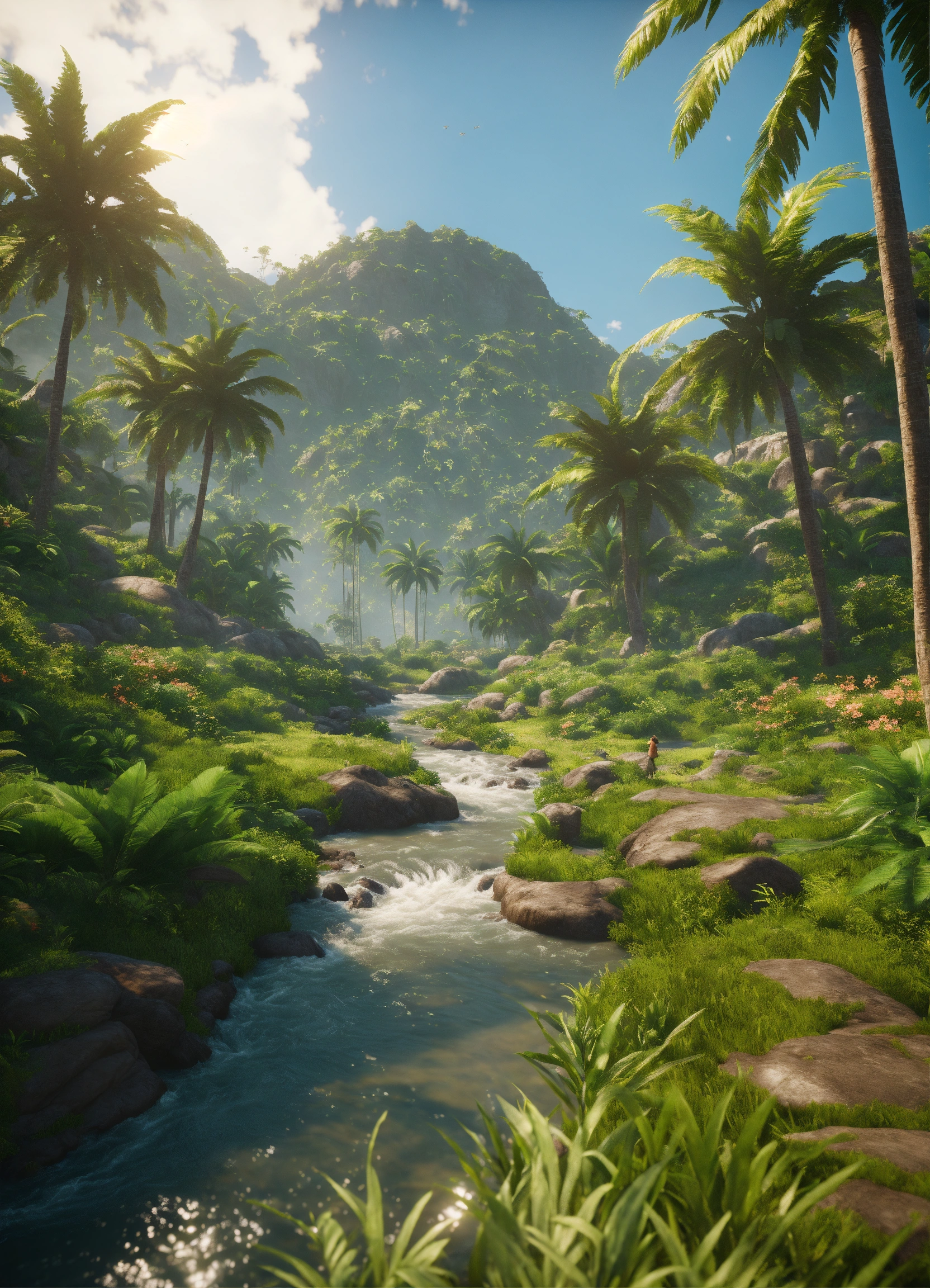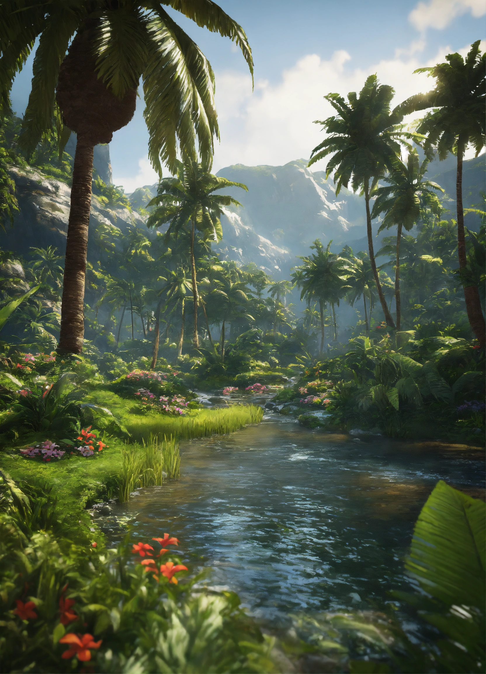 Massive open tropical landscape, alien palm trees, tropical flowers, flowing river, lush green grass. hyper detailed 8k, unreal engine.