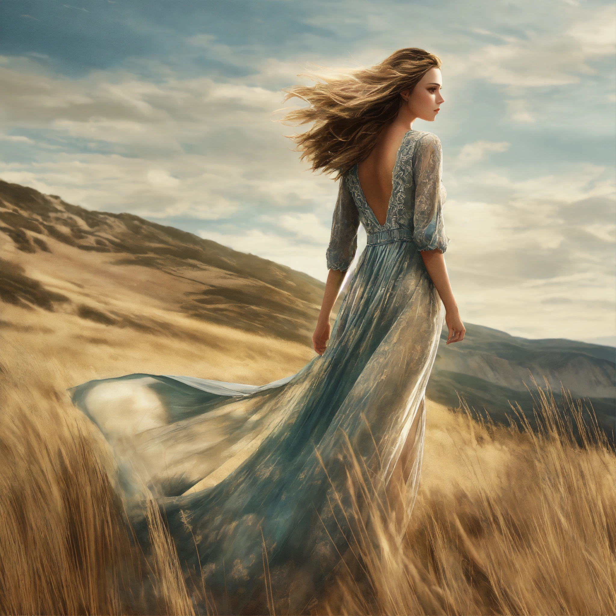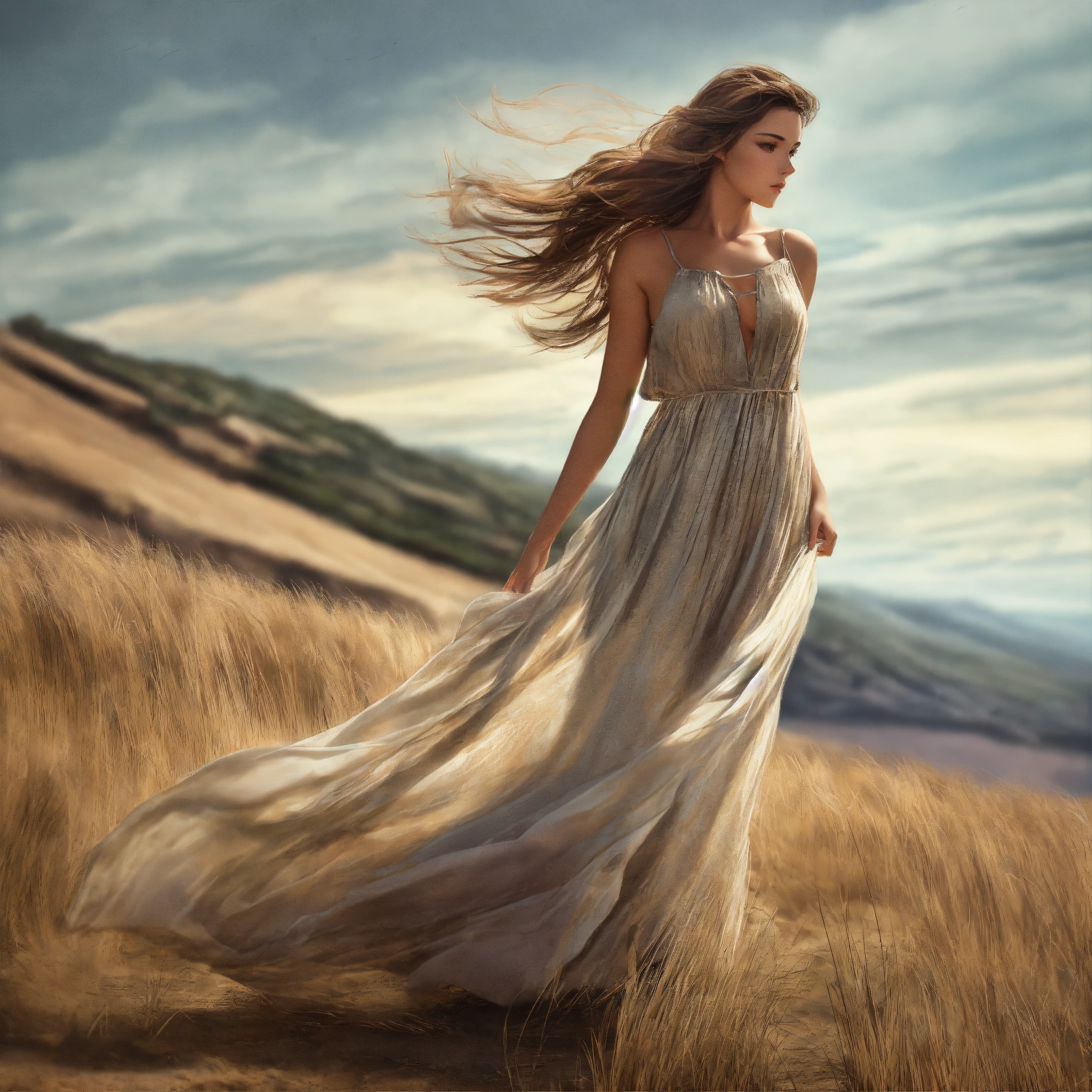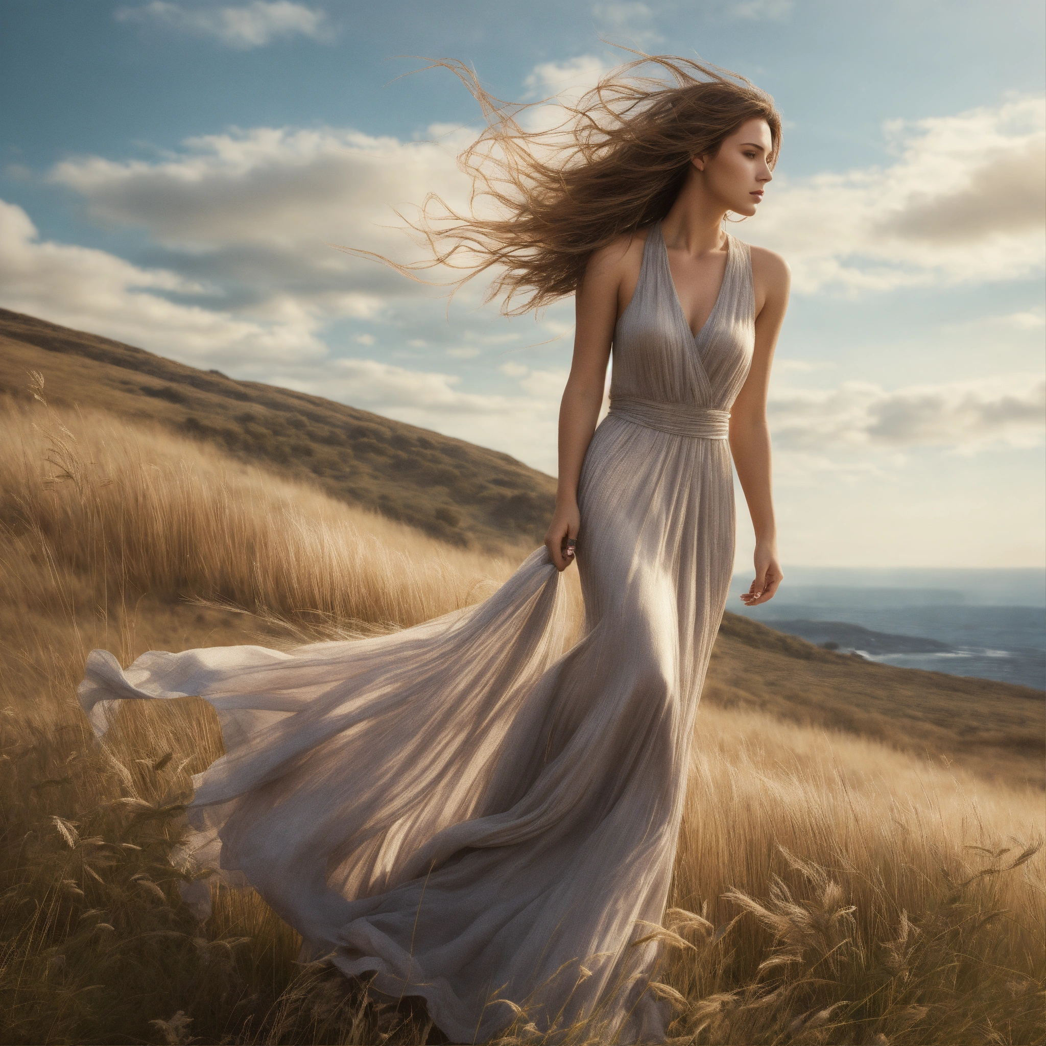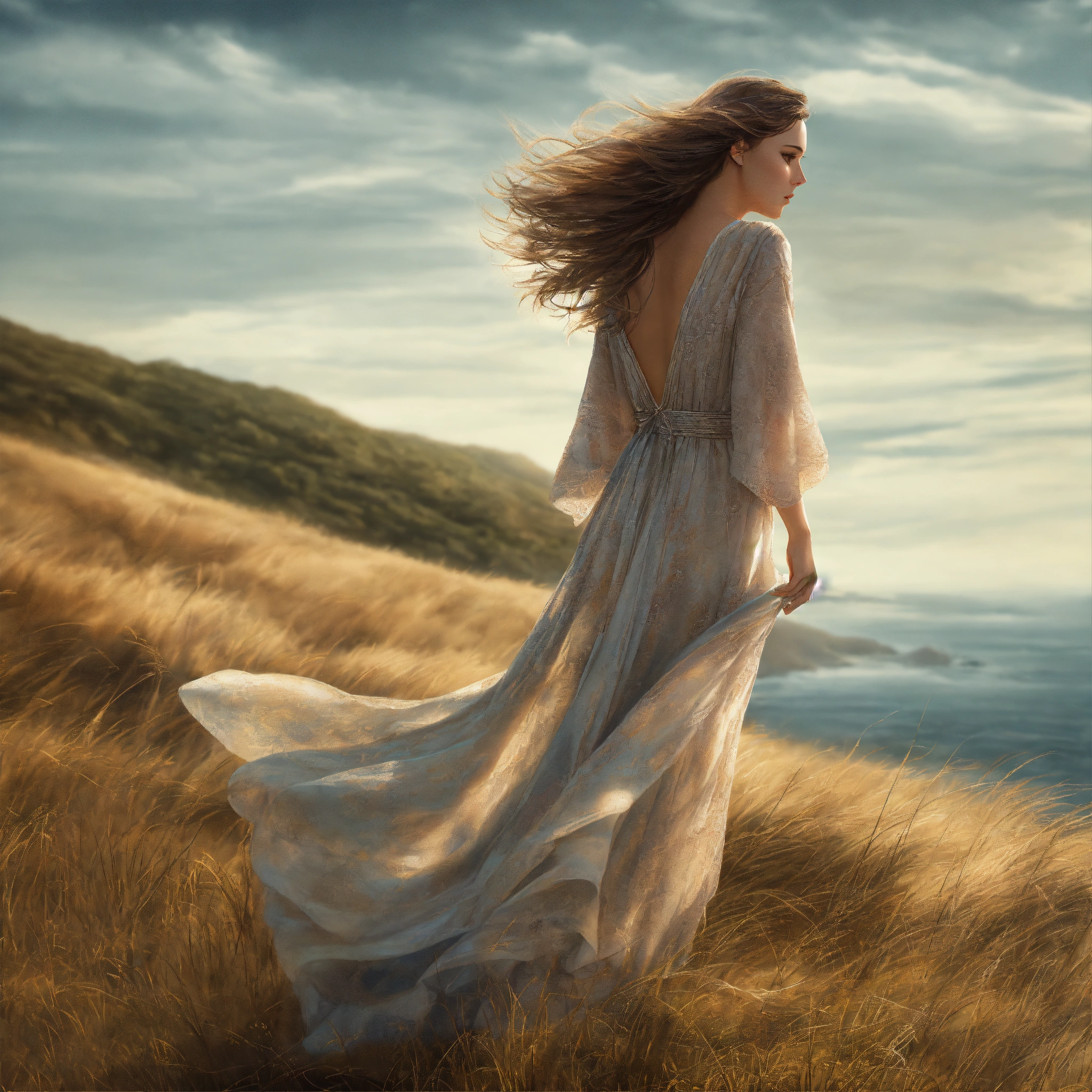 Woman face totally hidden by hair in the wind, full body, hyper realism, poetic, romantic, angelic long dress, realistic shading, realistic render, detailed textures, photorealistic, wide shot, landscape