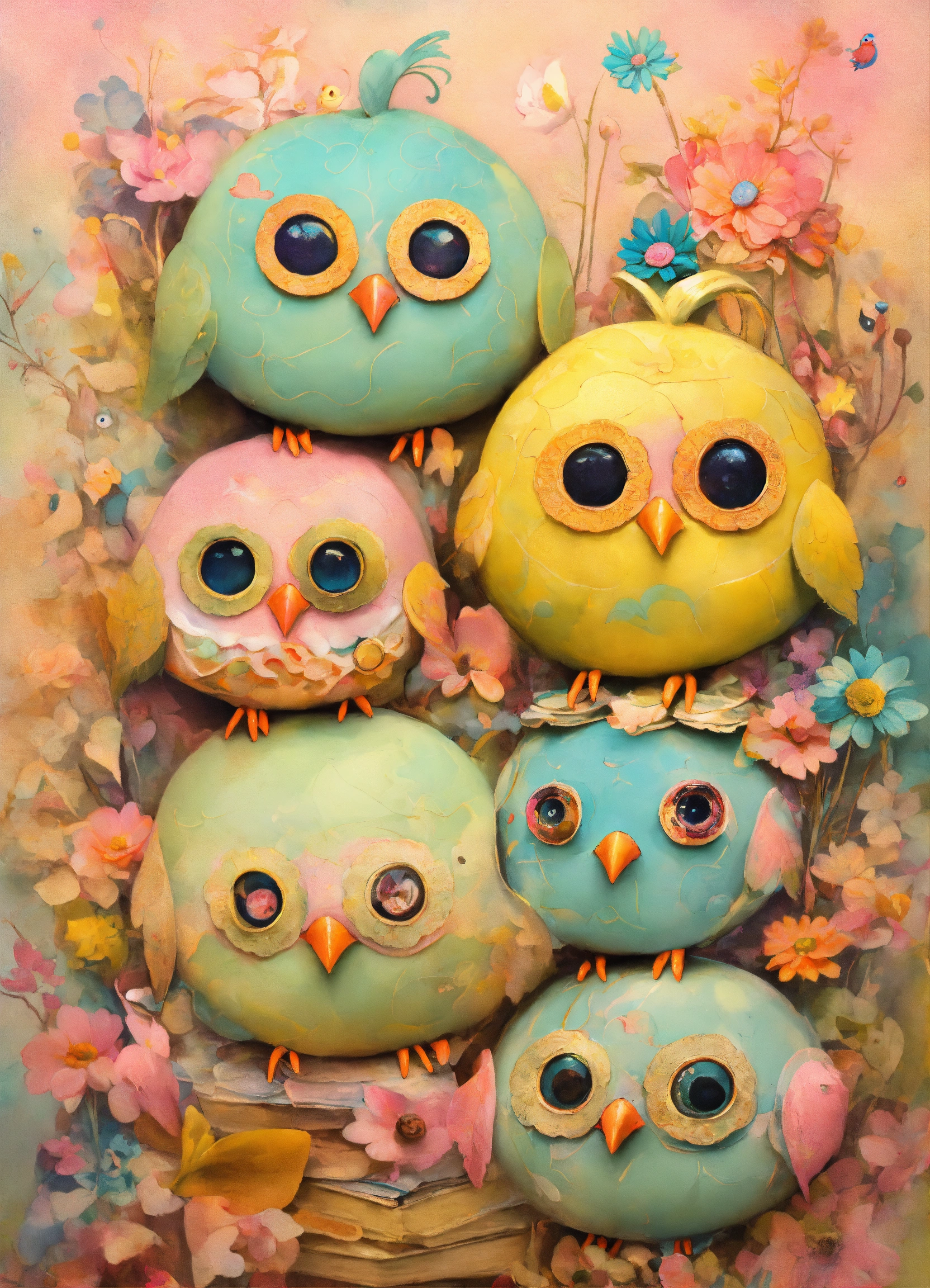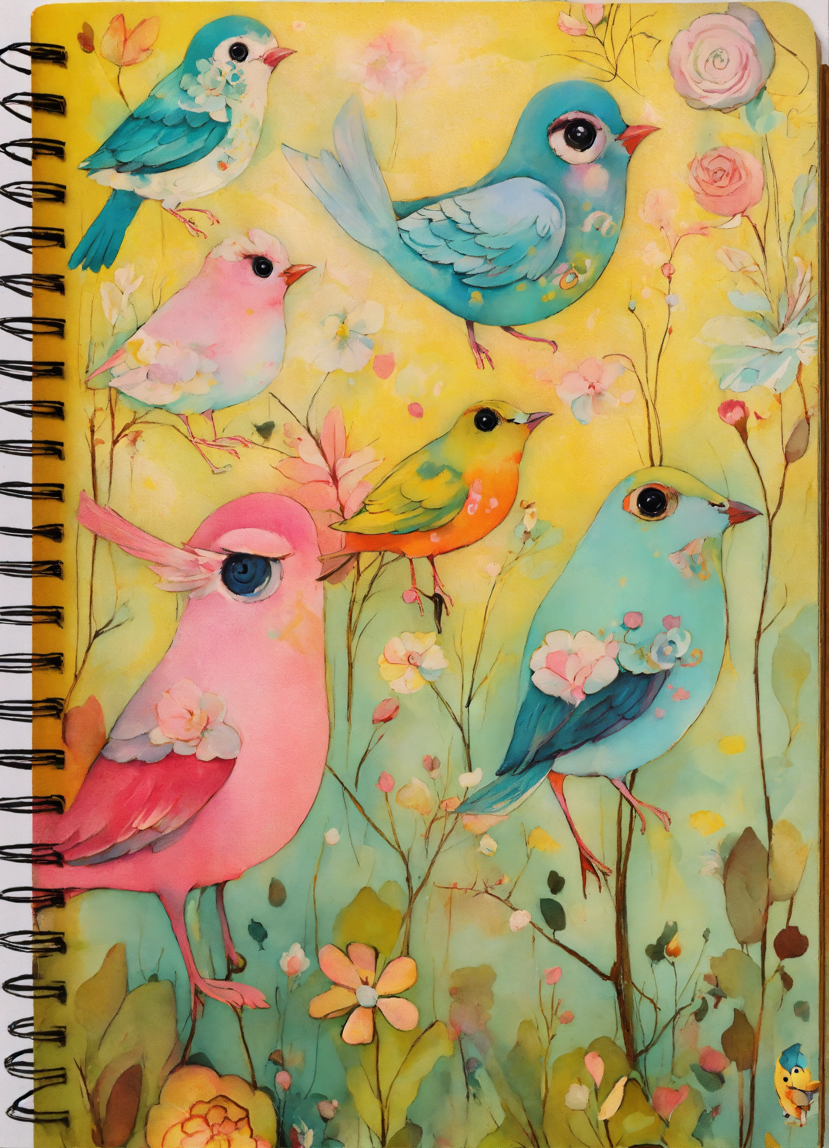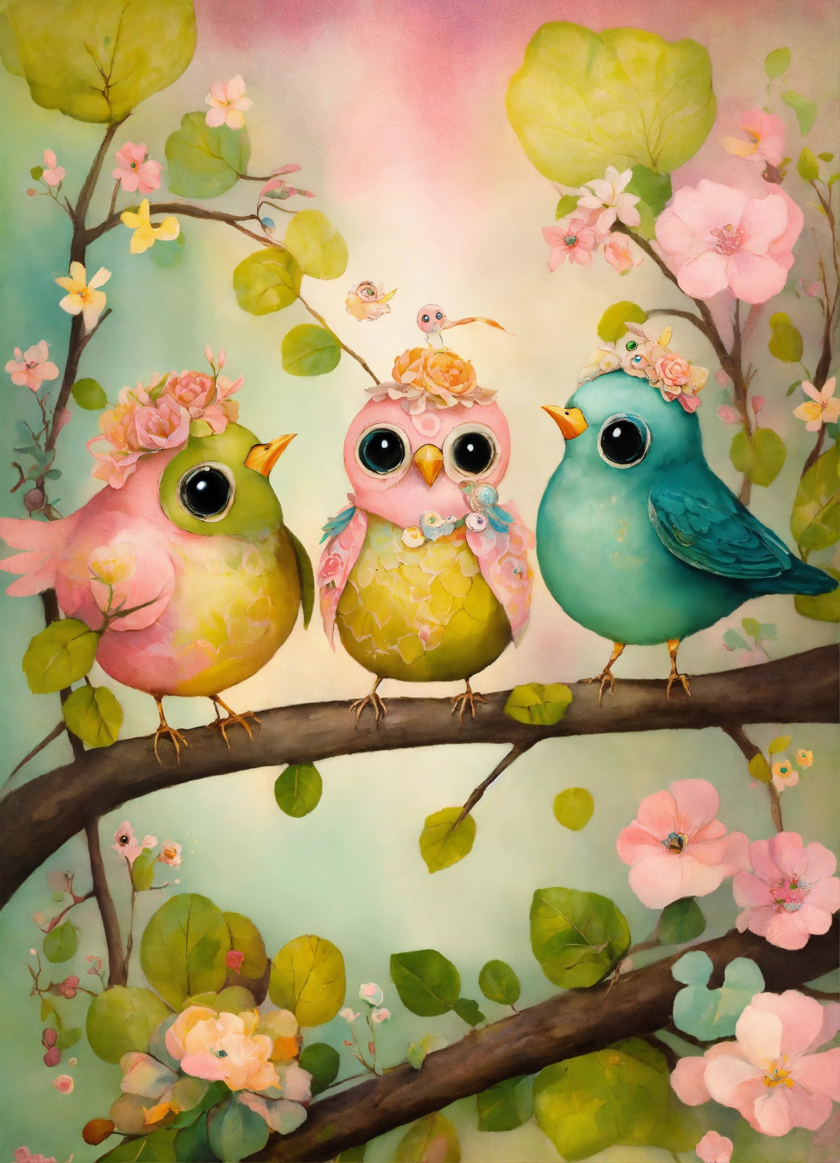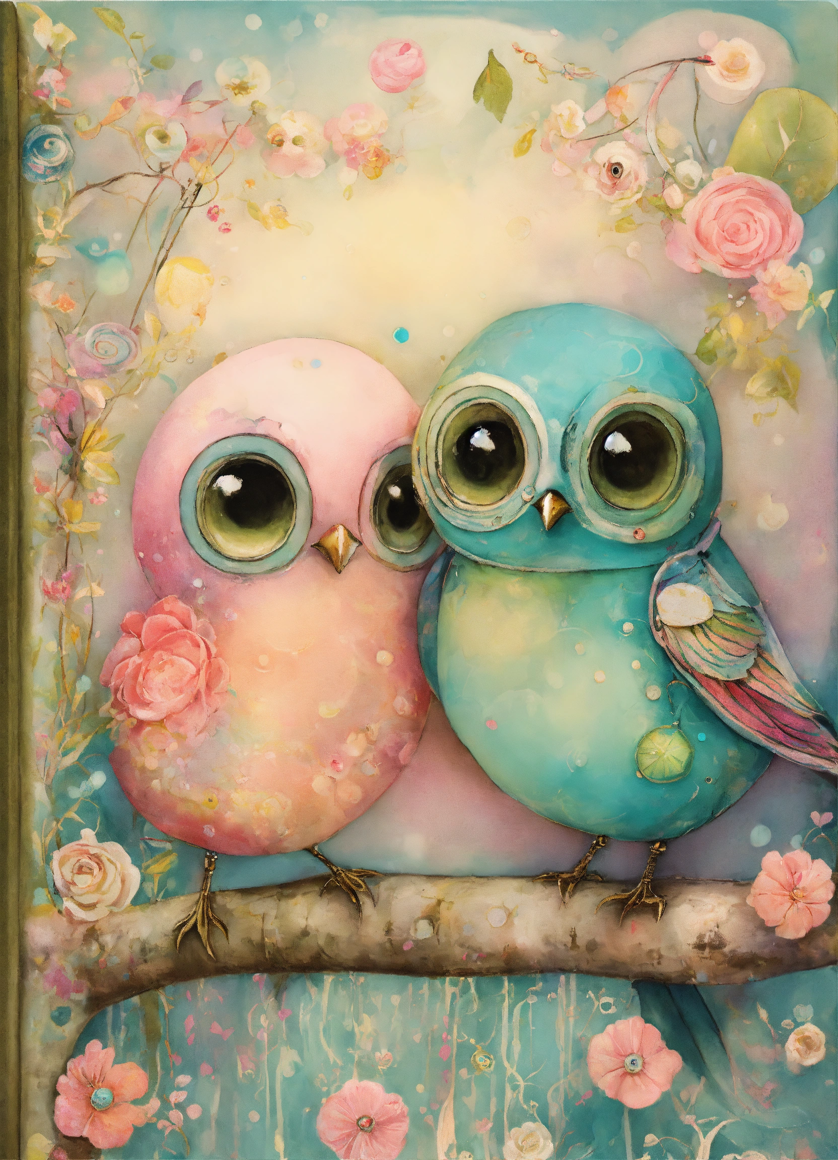 Shabby chic dreamy mist pastel junk journals whimsical cute quirky birds with big eyes in odd clothings swirling magical fairytale abstract art style