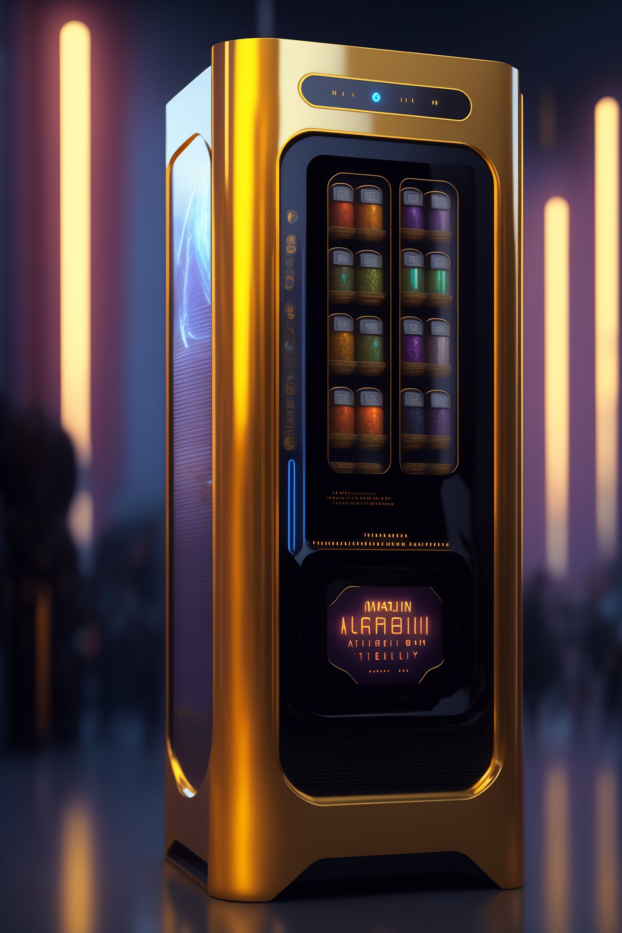 Alien tech vending machine with magic potions inside, highly detailed, 8k, rim lighting, digital painting, artstation, concept art, sharp focus, illustration, art by greg rutkowski and alphonse mucha