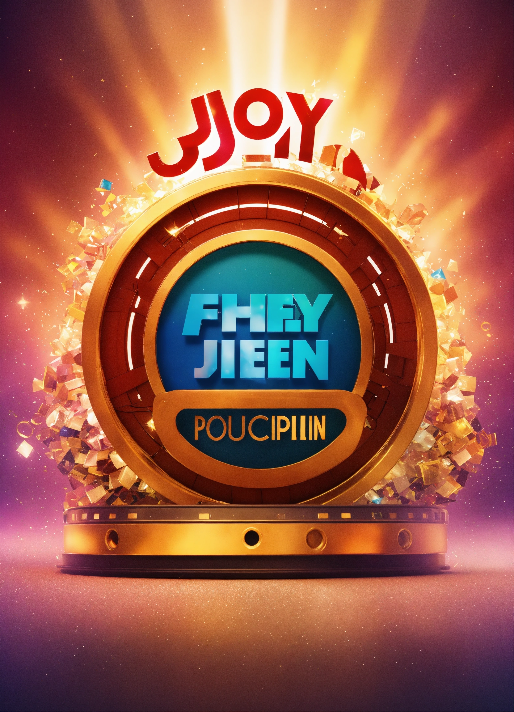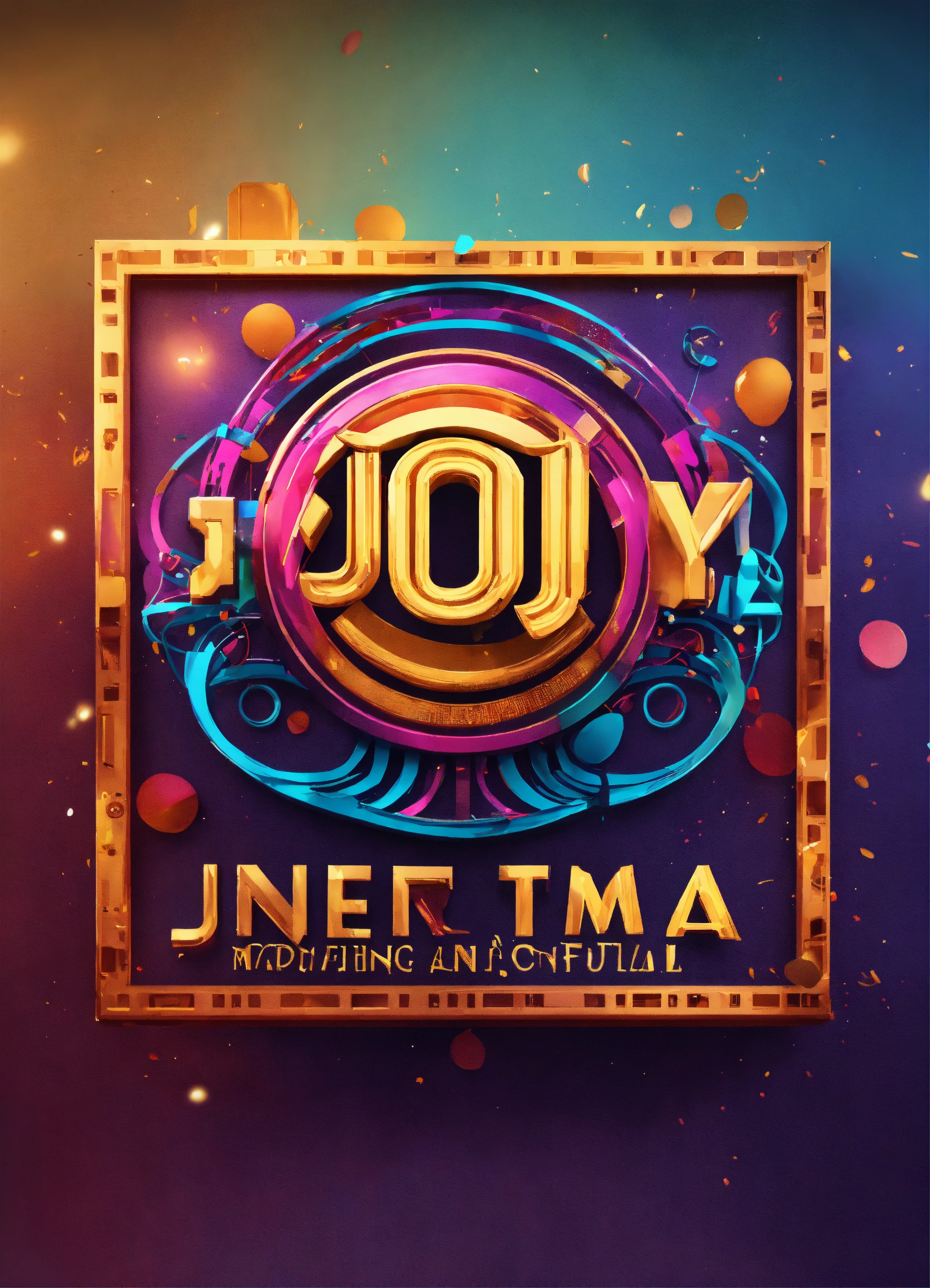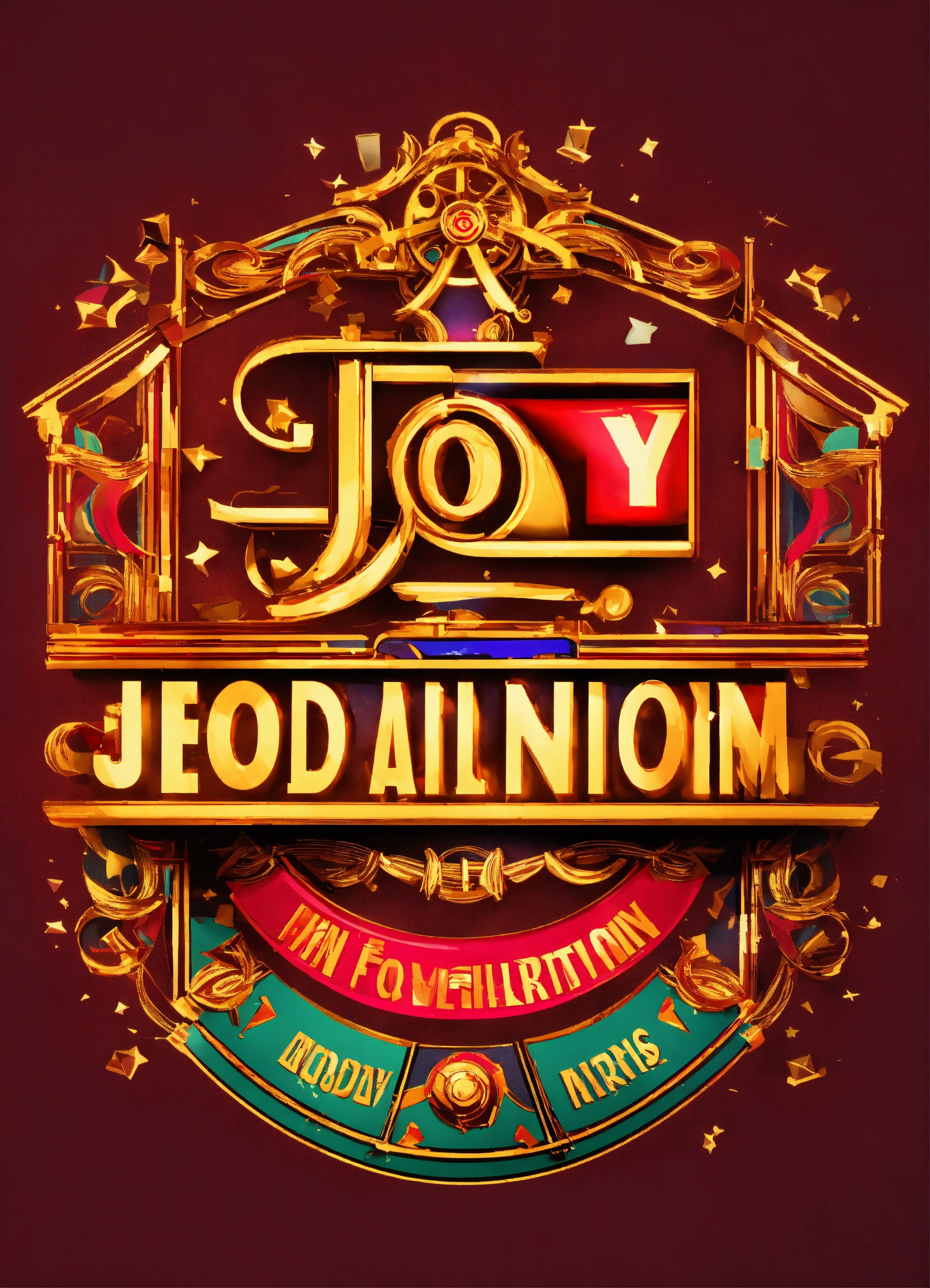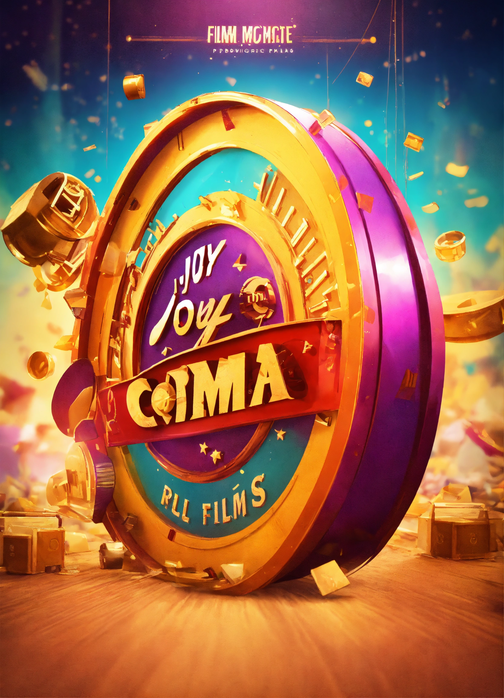 Movie production company logo design, emblem design, text as "joy films", ink art, octane rendering, cinema 4d render, happiness, entertainment, and the magic of cinema, visually striking, a powerful emblem, a smiling film reel, vibrant colors, and a playful font elements, filmstrips or film ribbon elements, lettering art, typography art.