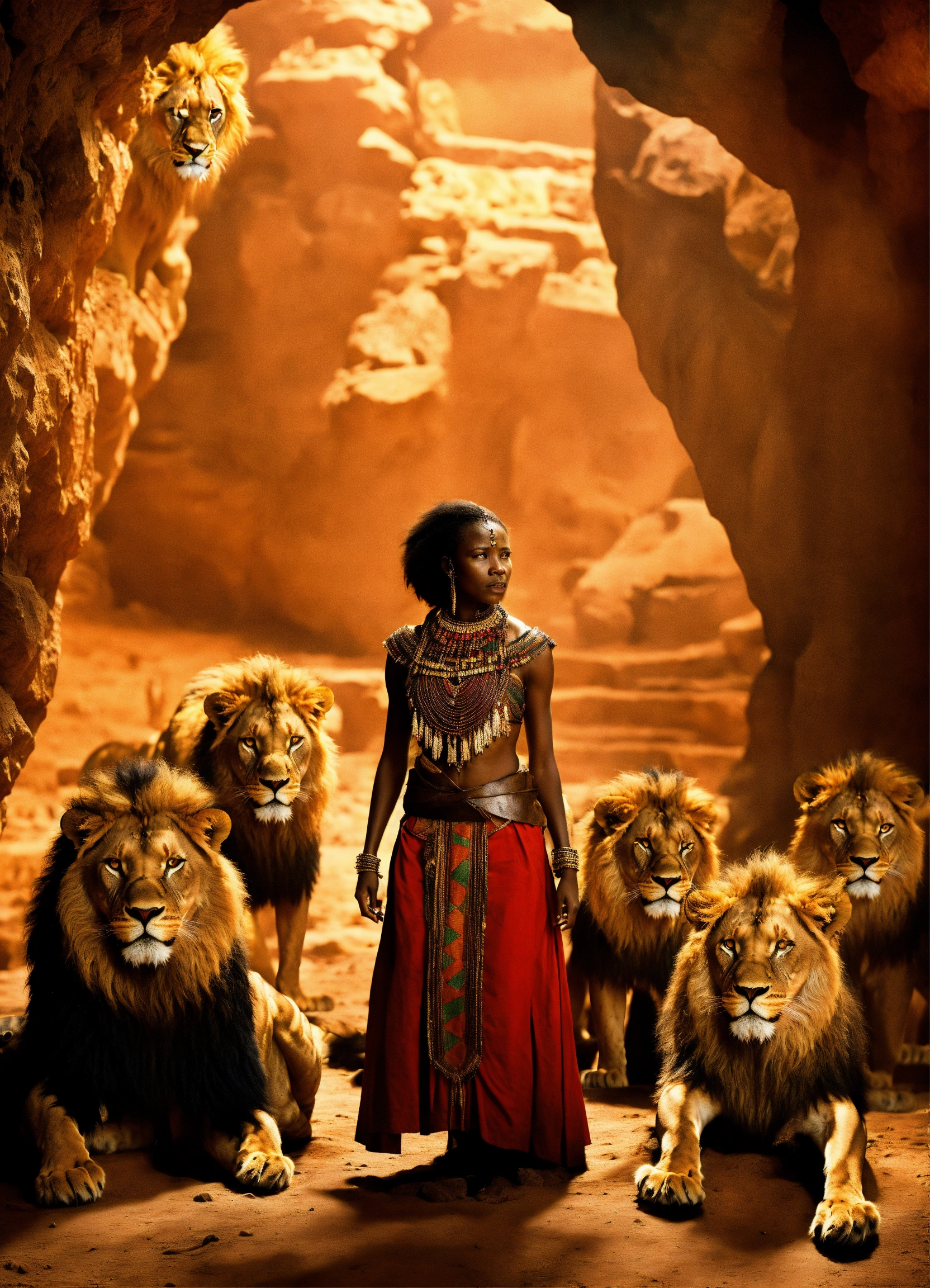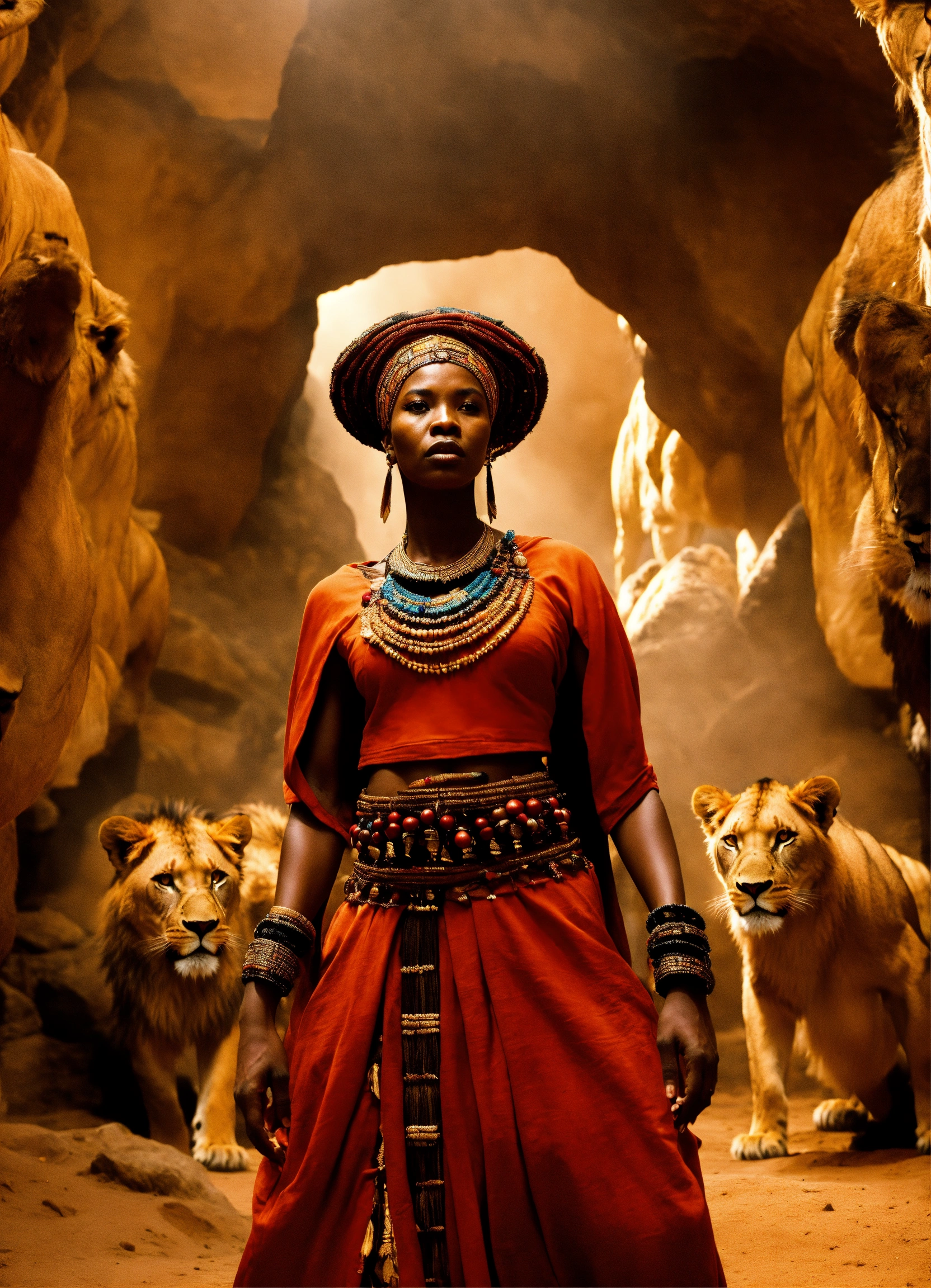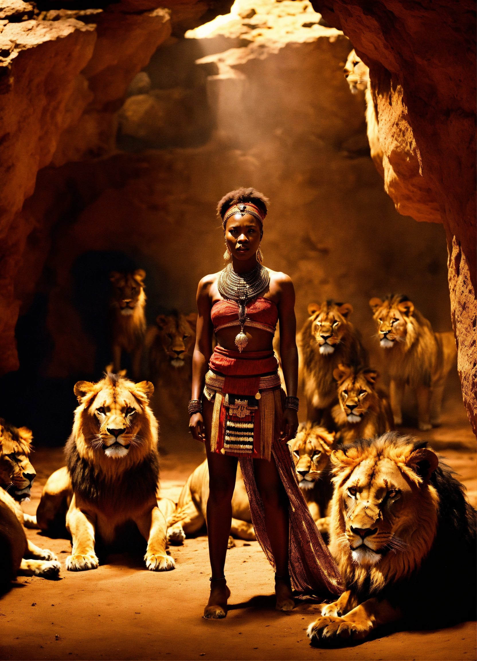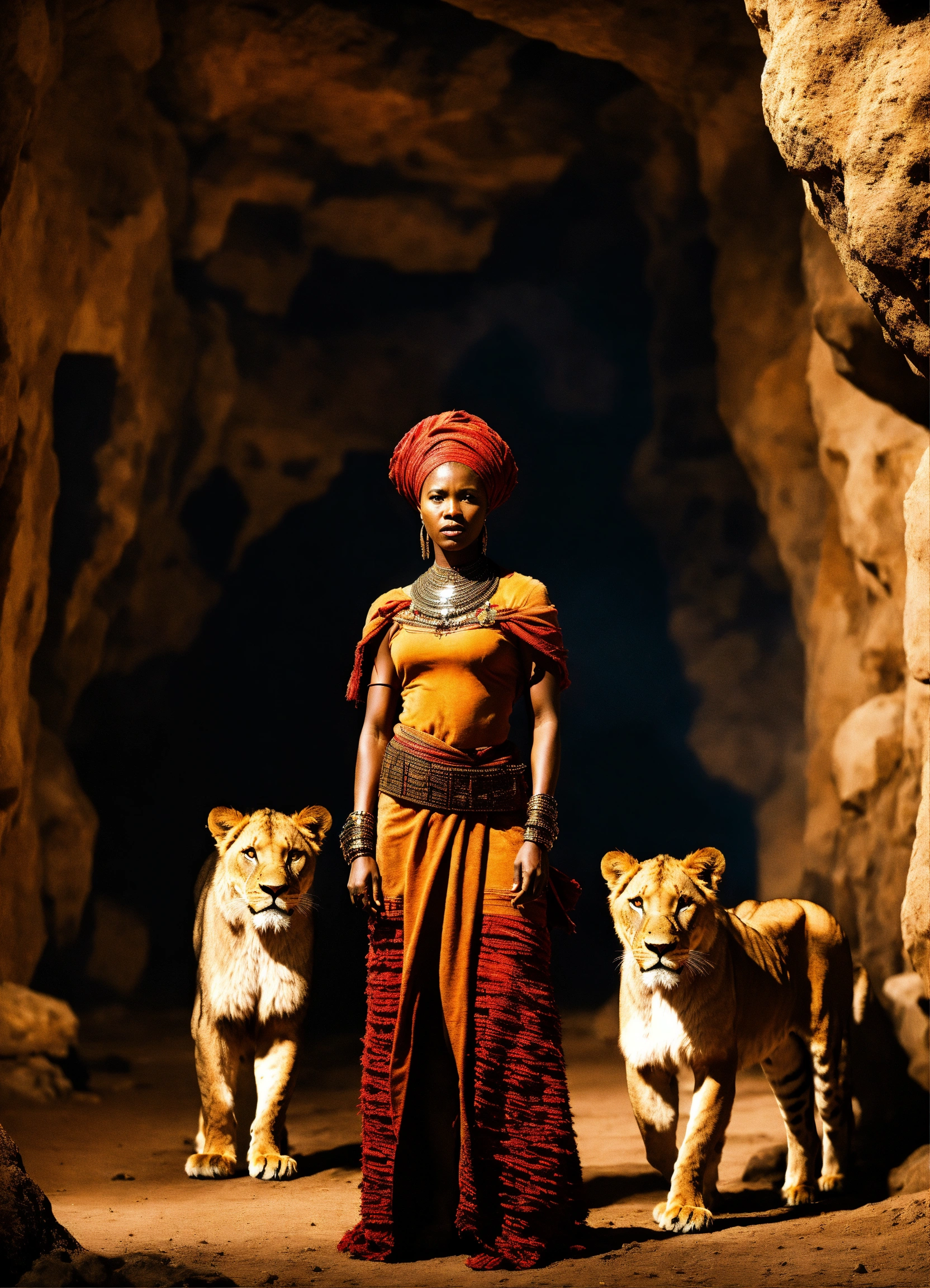 Dramatic film still of an african woman in ancient african warrior clothing surrounded by ferocious lions in, a cave interior background, directed by michael bay