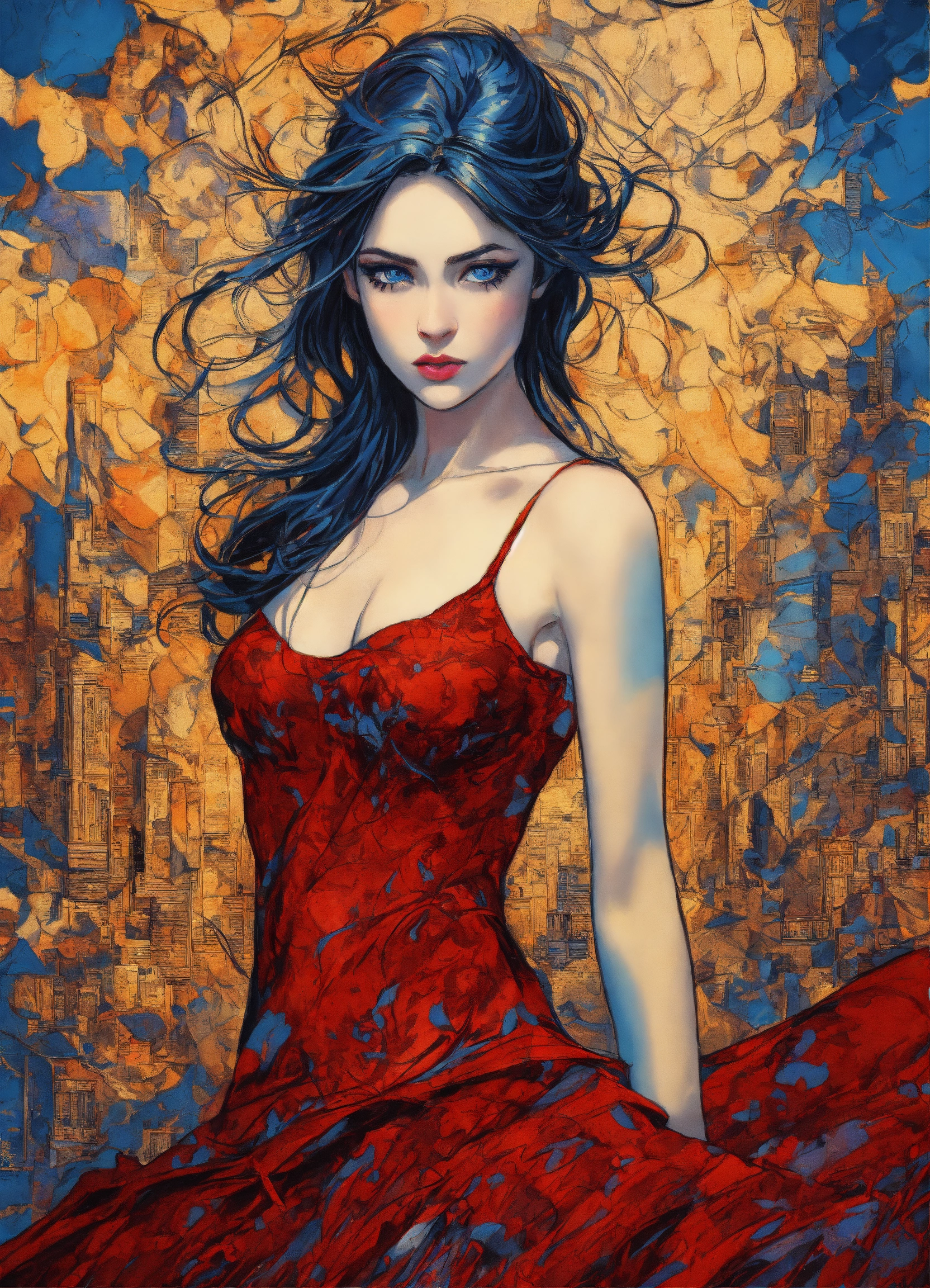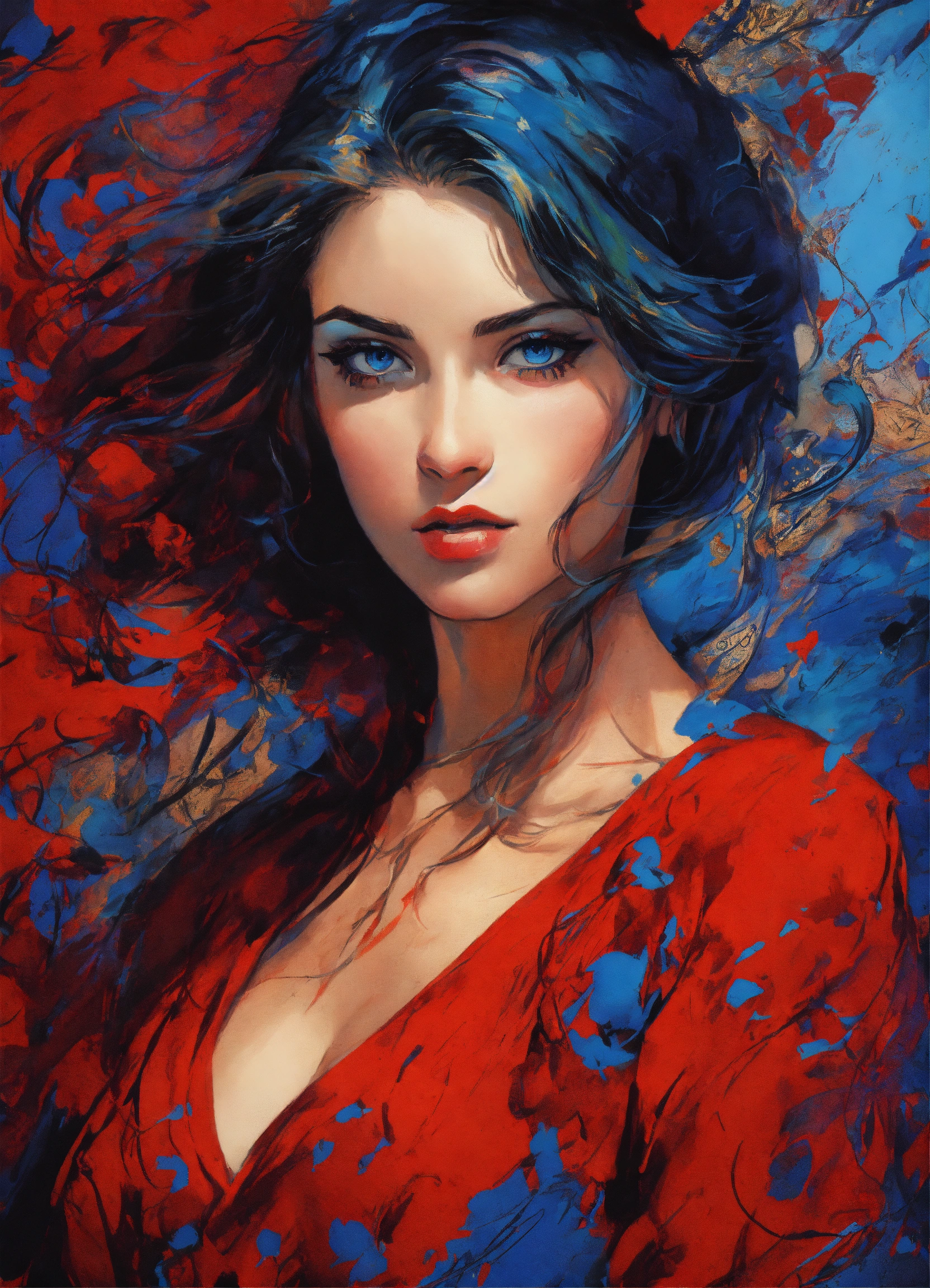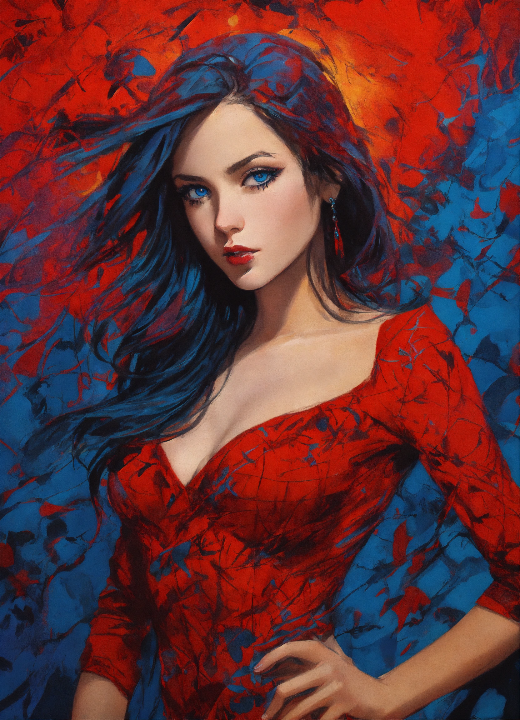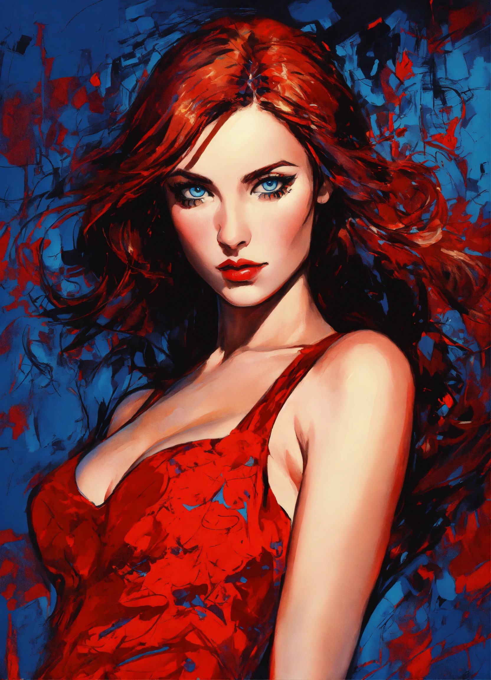 Pop art, mysterious beautiful caucasian female, blue eyes, red dress, fantasy, concept art, sharp focus, intricate, highly detailed, smooth, twilight, art by jackson pollock, comic book art style