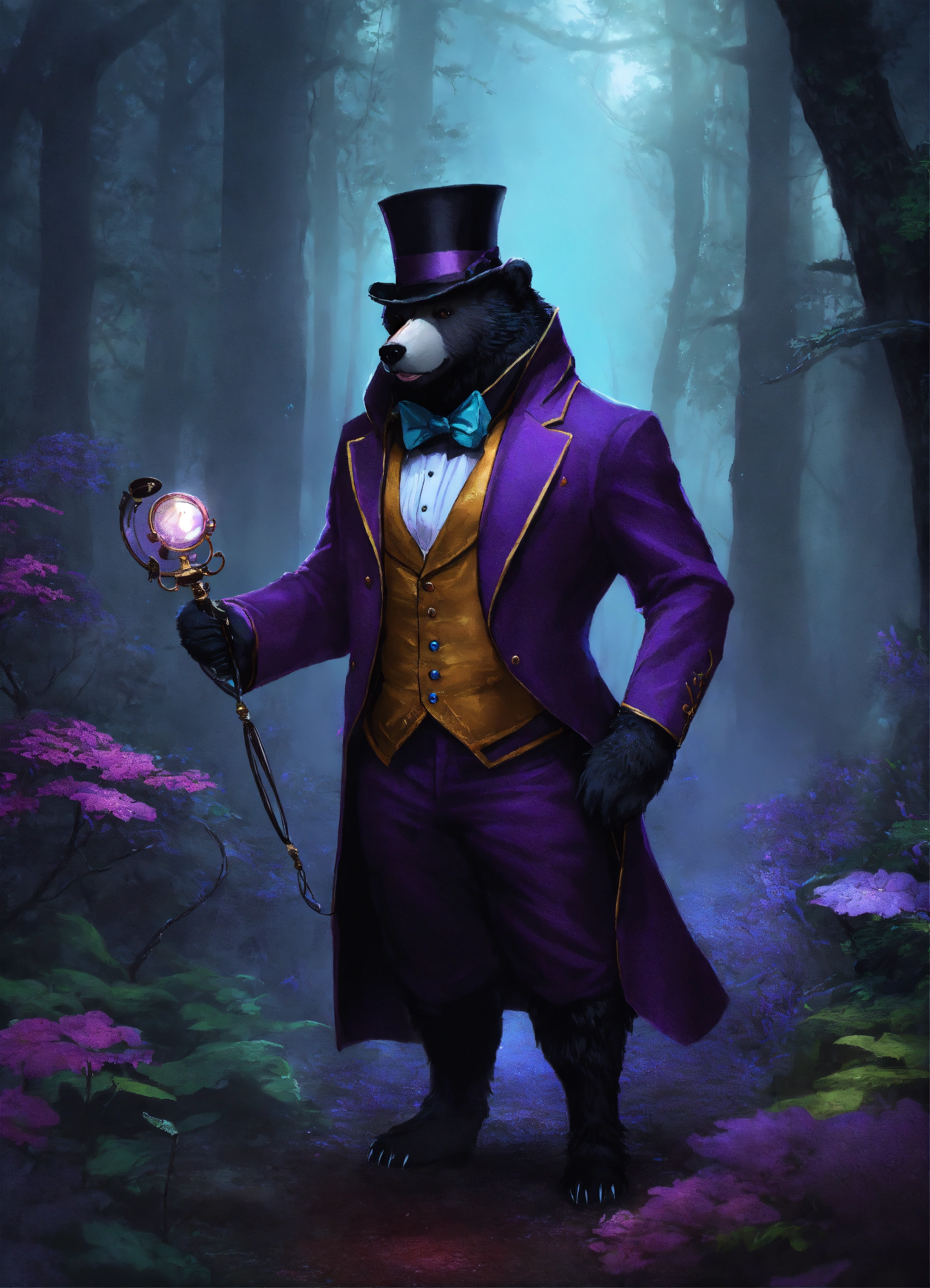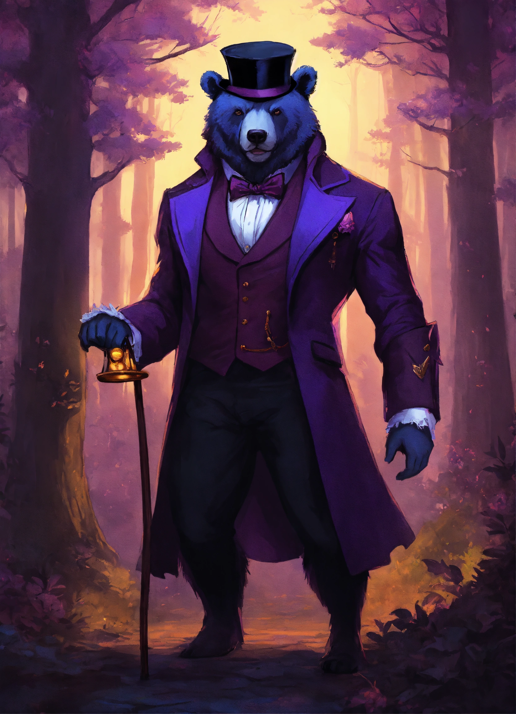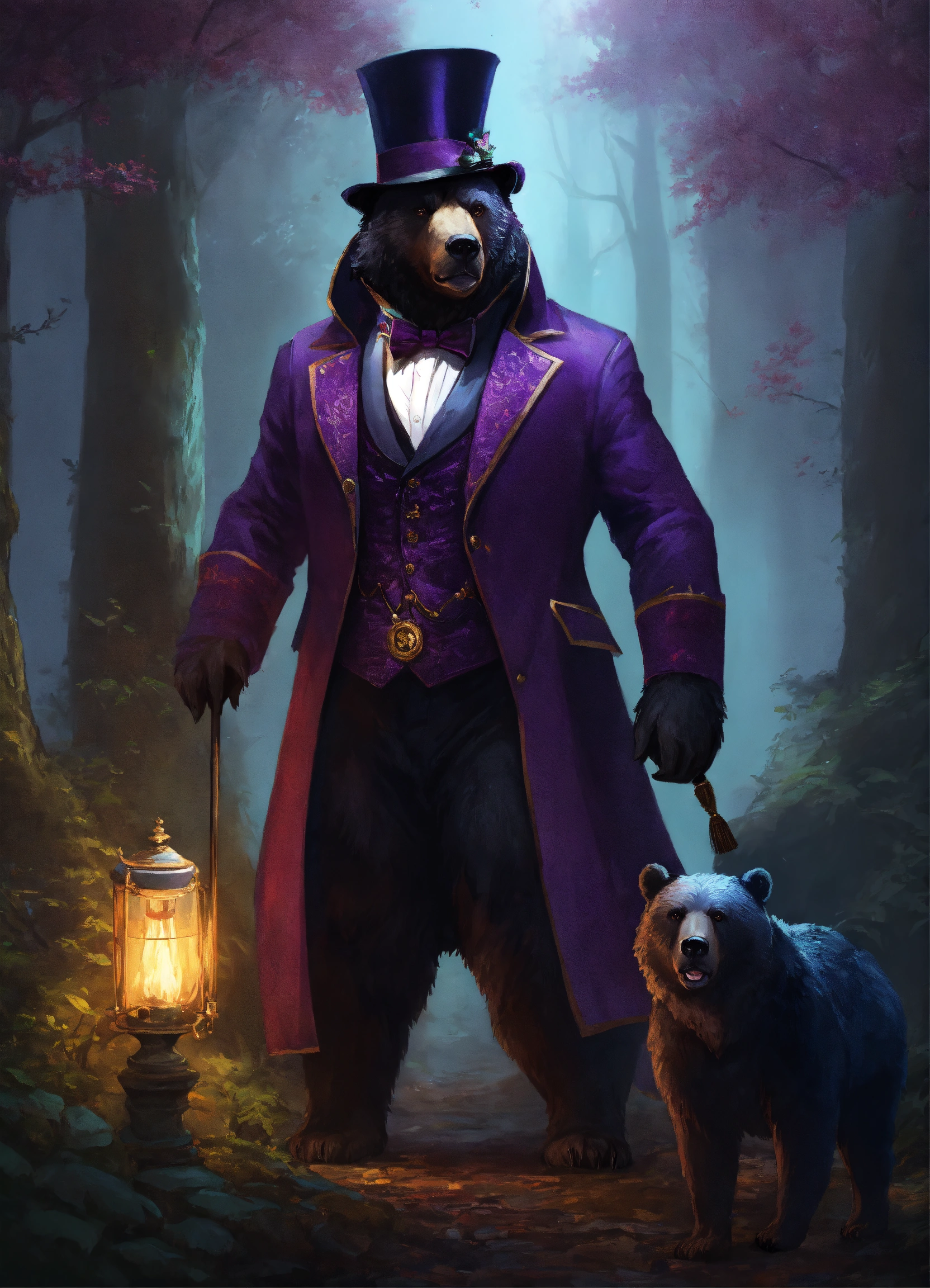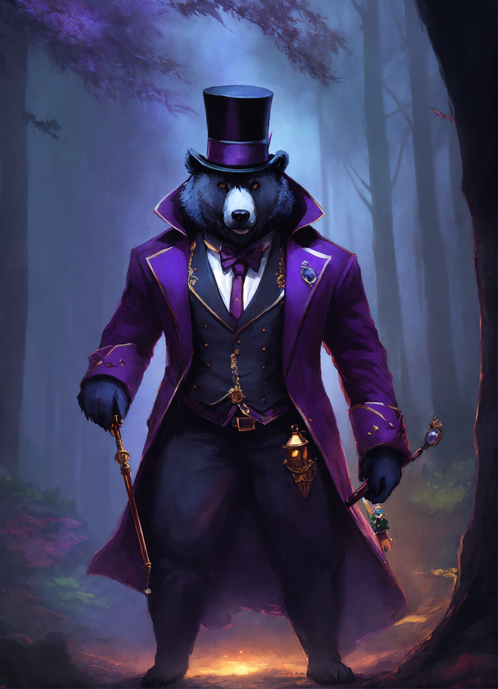 A dire bear wearing a classic tuxedo with a eye glass monocle and top hat, classy, fantasy, dnd, full body, and a drow elf with a dark purple hood stand together in a dark forest, hd