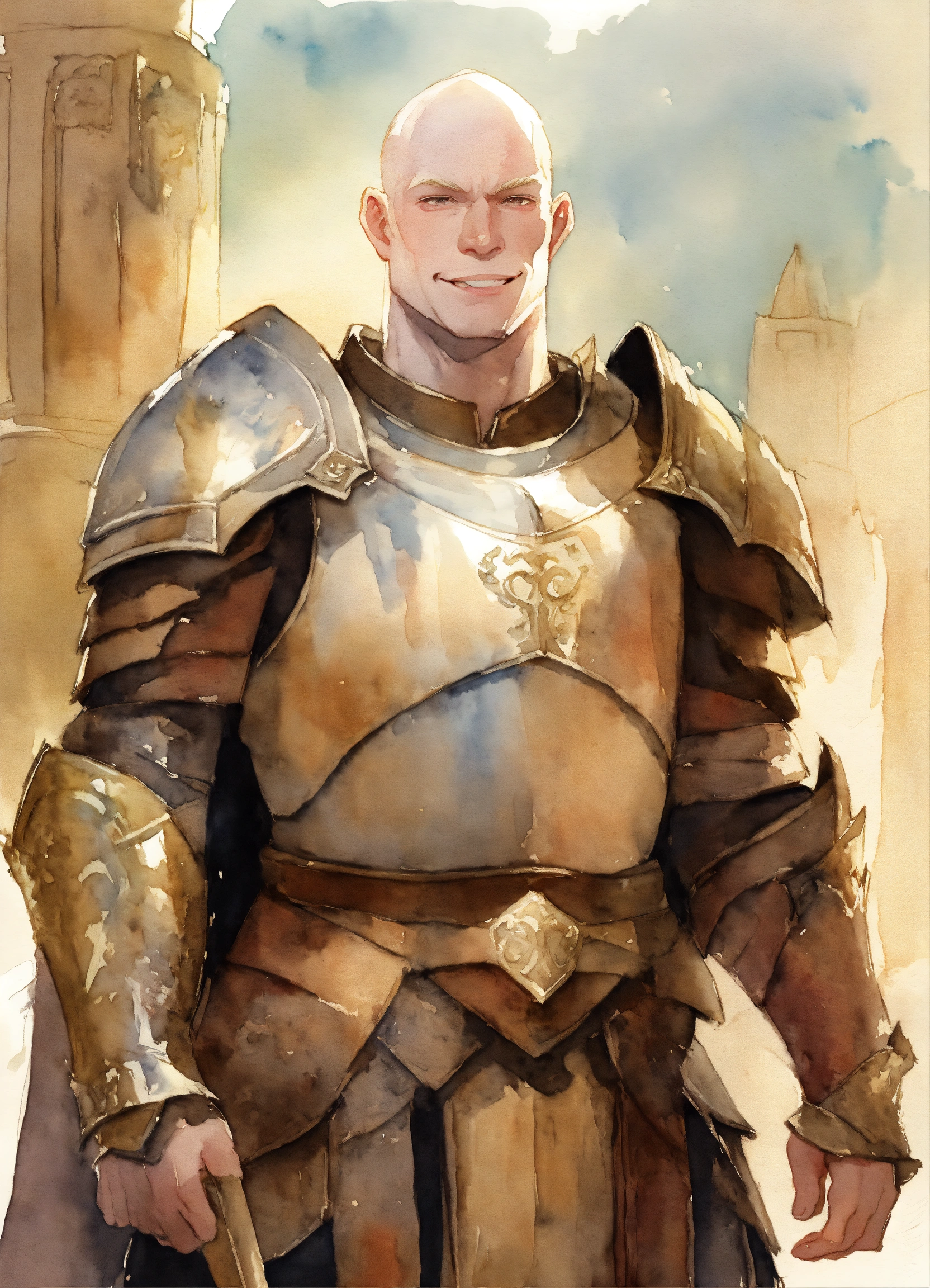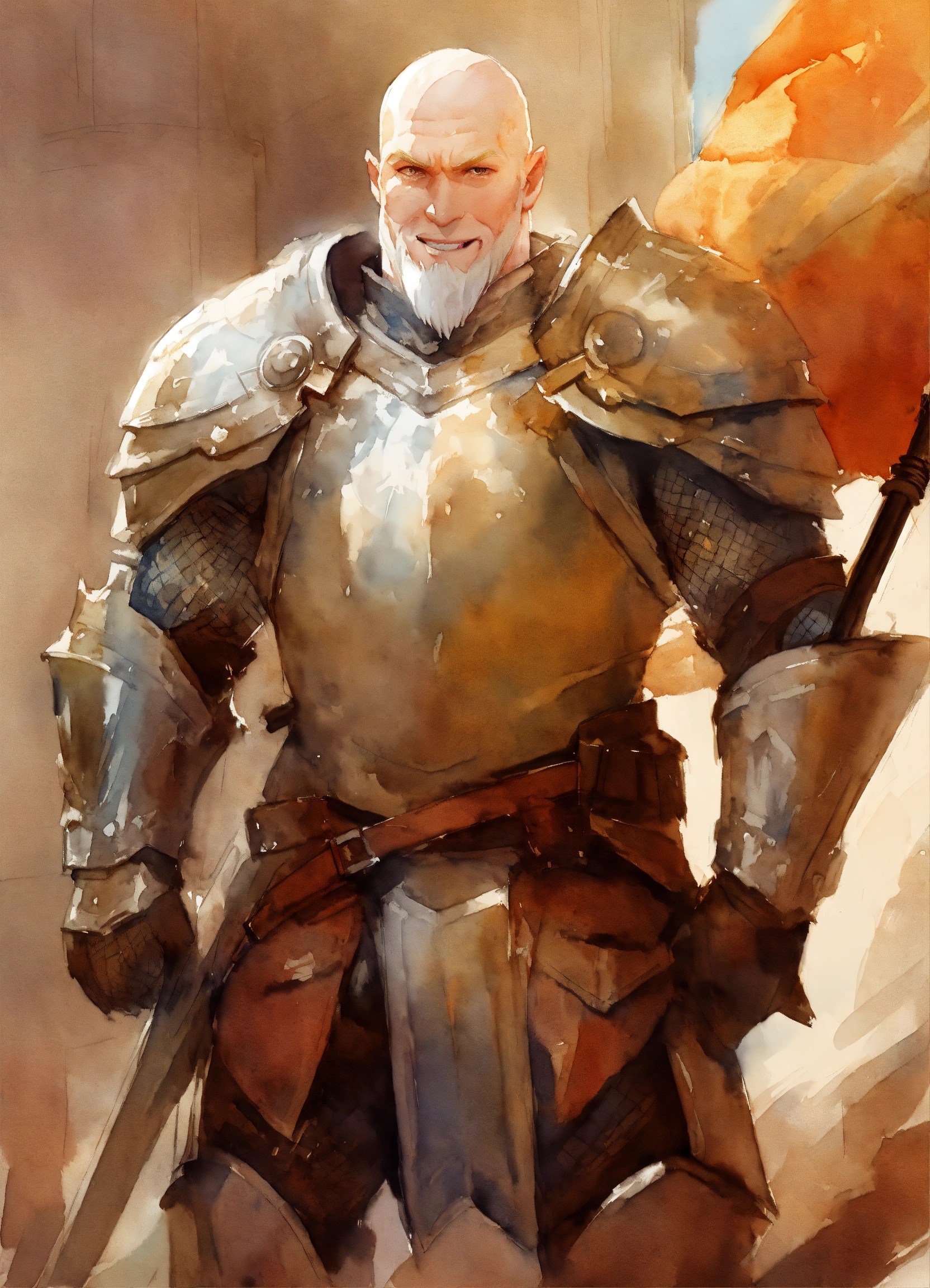 Watercolor, sketch, concept art, character design, high fantasy, huge man with pale skin, albino, hairless, paladin, grin, strong, huge, plate armor, heroic, muscles, knight, shield, smile, charismatic, leader, epic, broad shoulders, wide torso, tall, hero, good, friendly, jolly, joyful, gigantic, giant