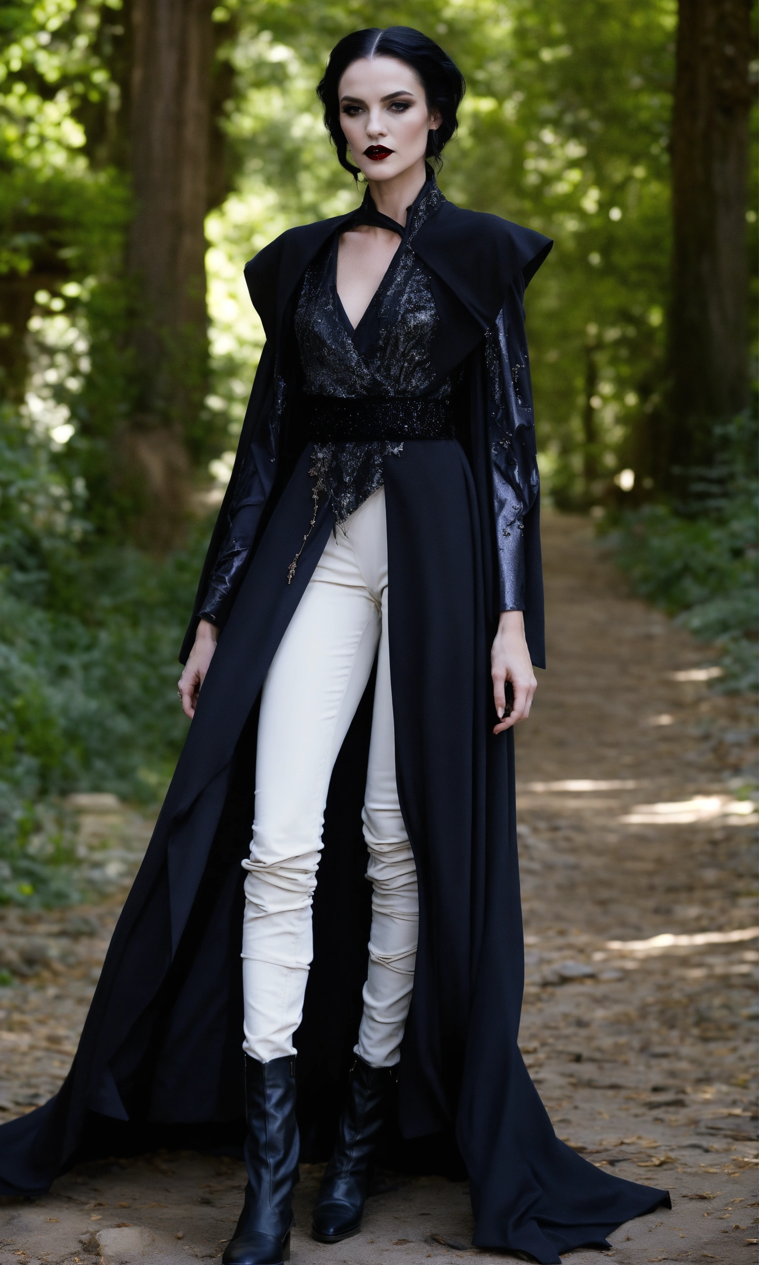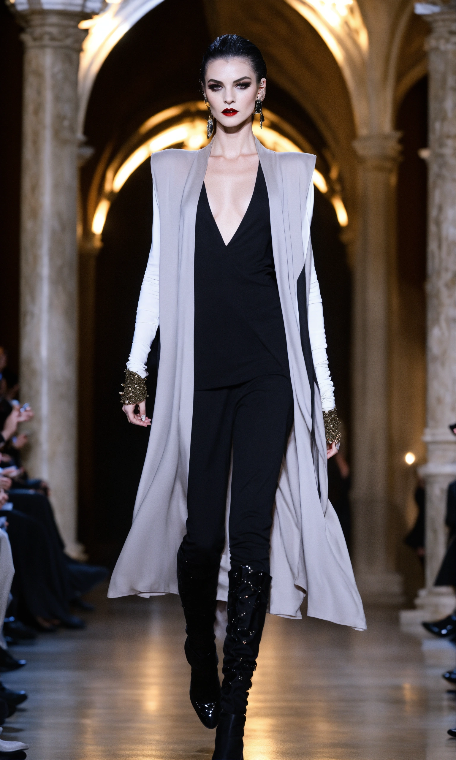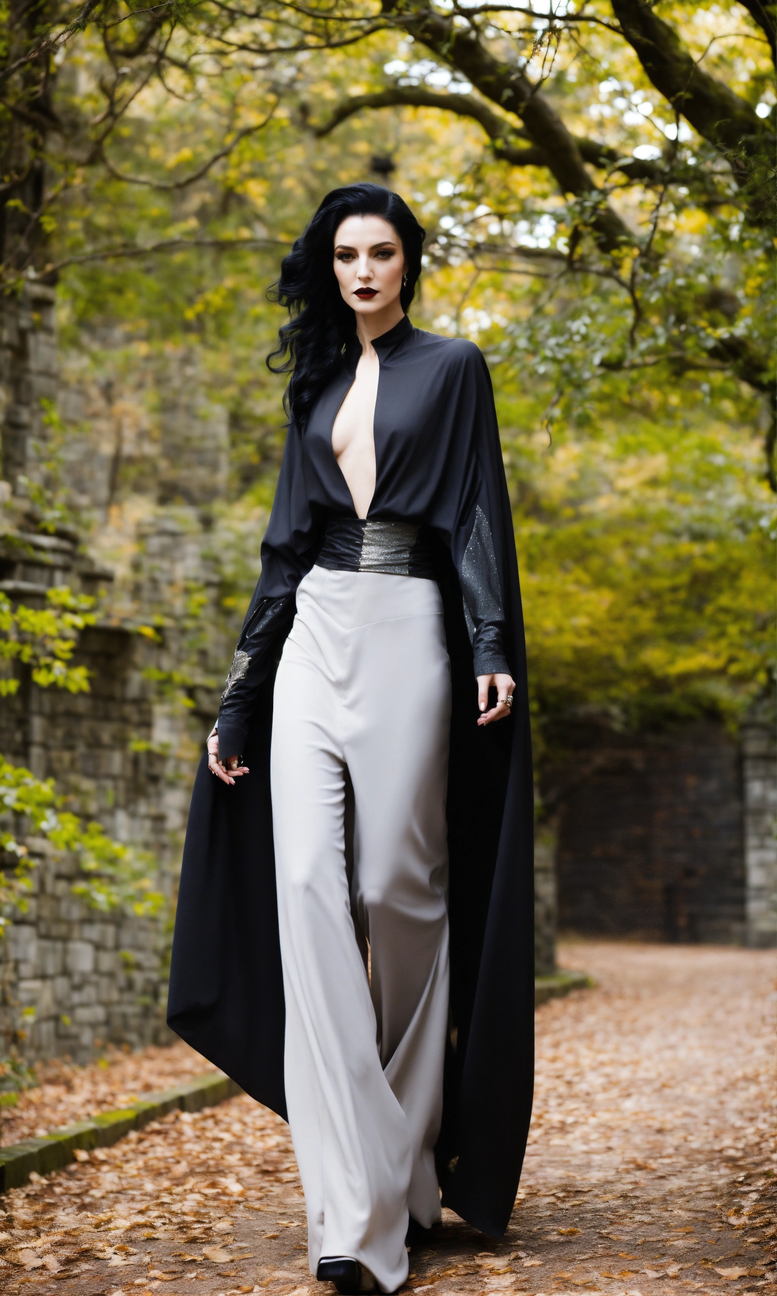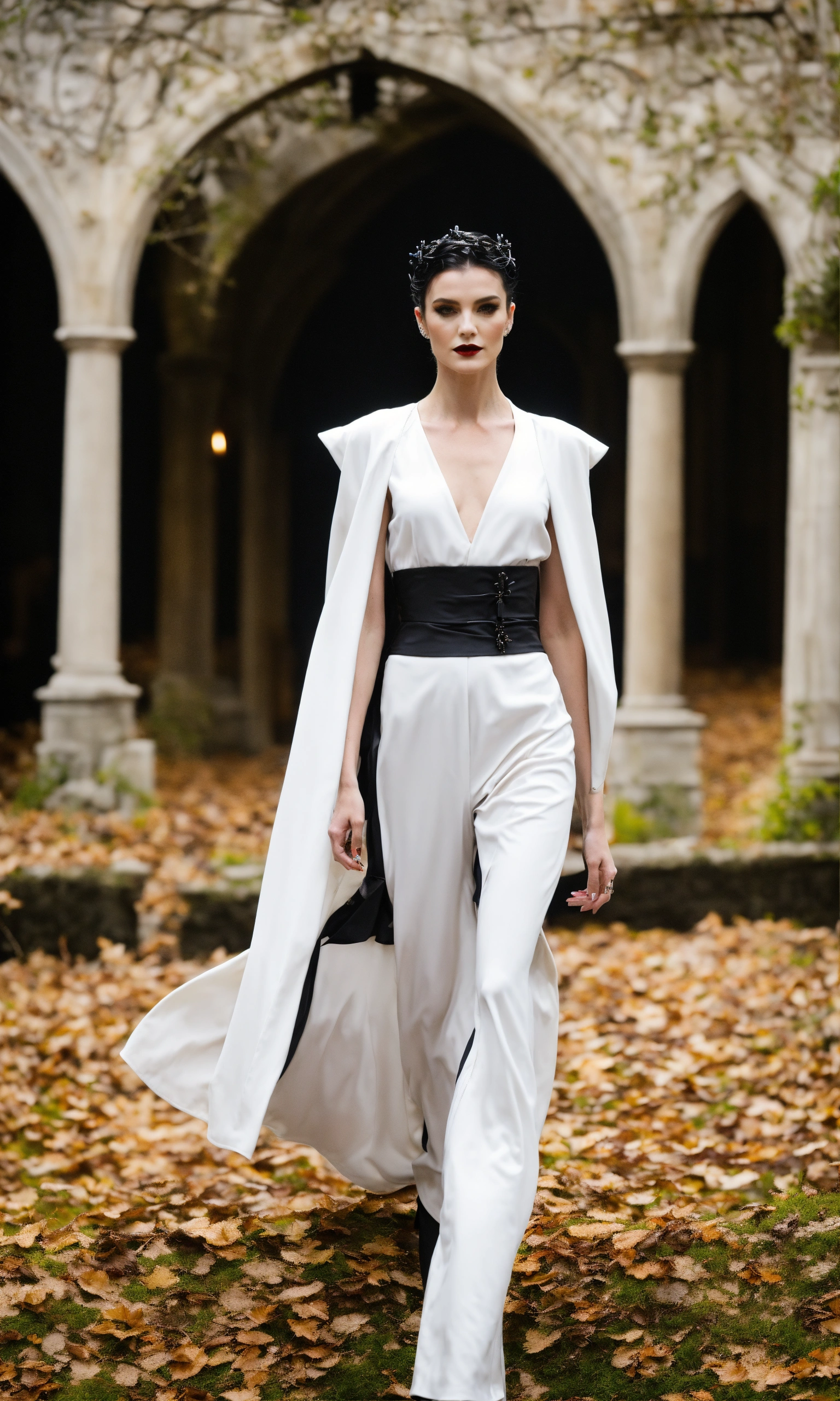 Lothlorien androgynous royal vampire walking runway during vamp fashion week wearing dolman sleeve dark donna karan vamp fashion in black, white, grey, beige, stone, metallics, shimmer walking runway at a goth castle