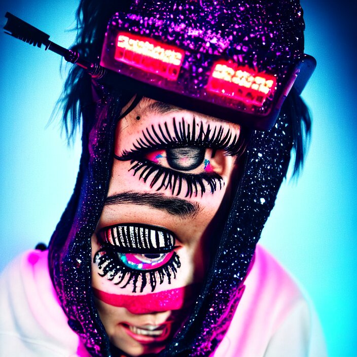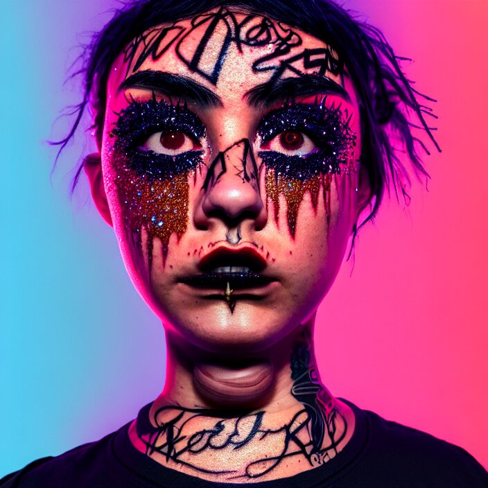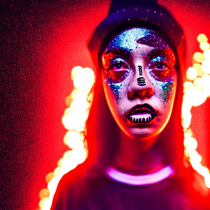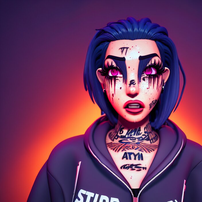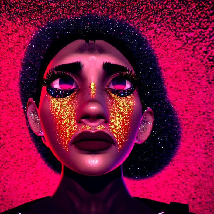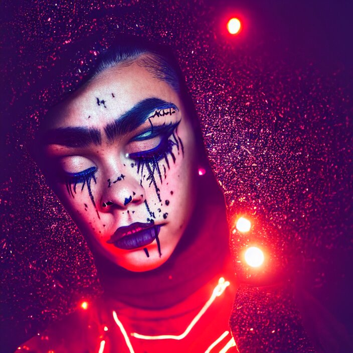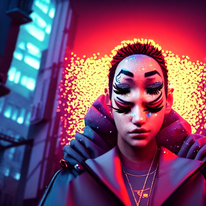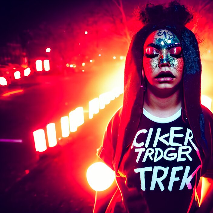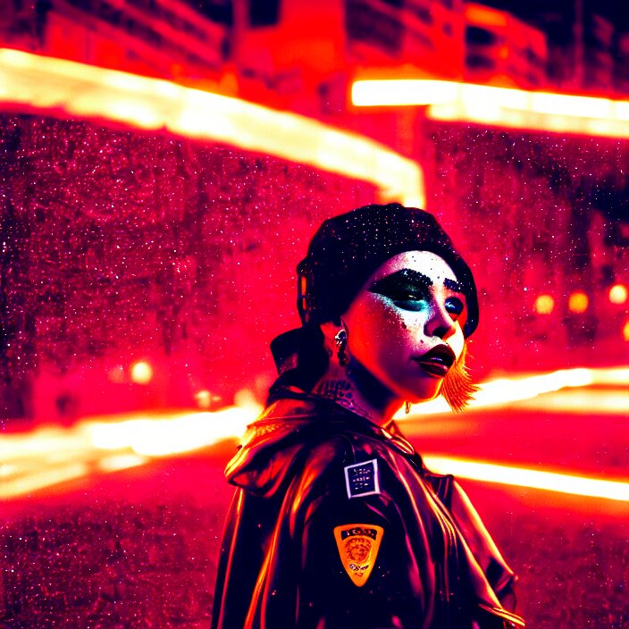 A streetwear studio trigger style mixed woman wearing thick mascara, crying, a city on fire in the background, police lights shine on her face, tattoos, dark glitter, cinestill 50d, 4k, 8k, hd, full color, octane render, trending on artstation, highly detailed