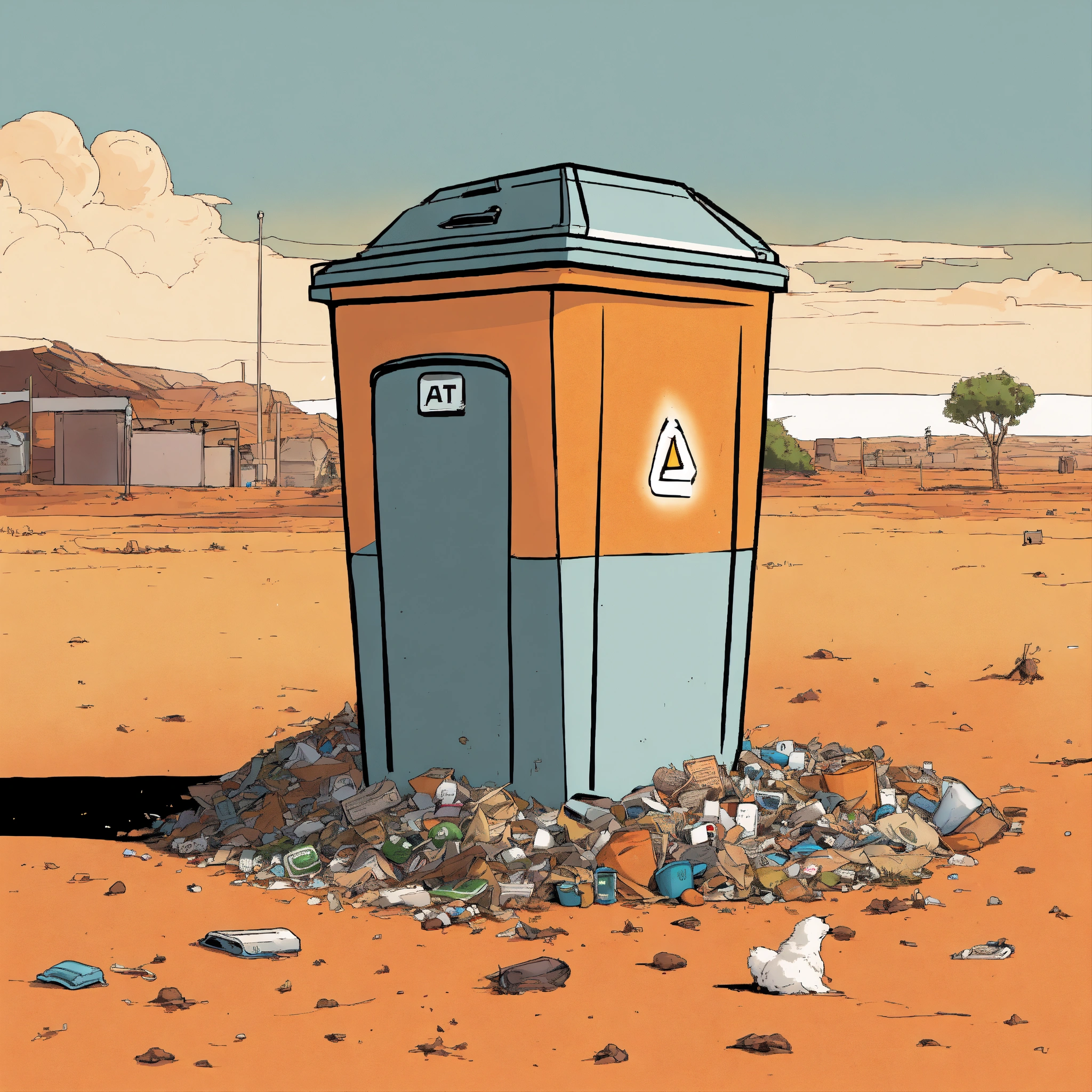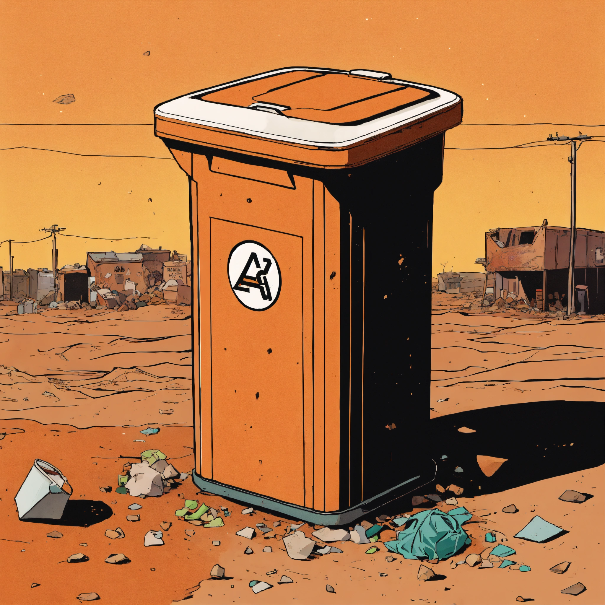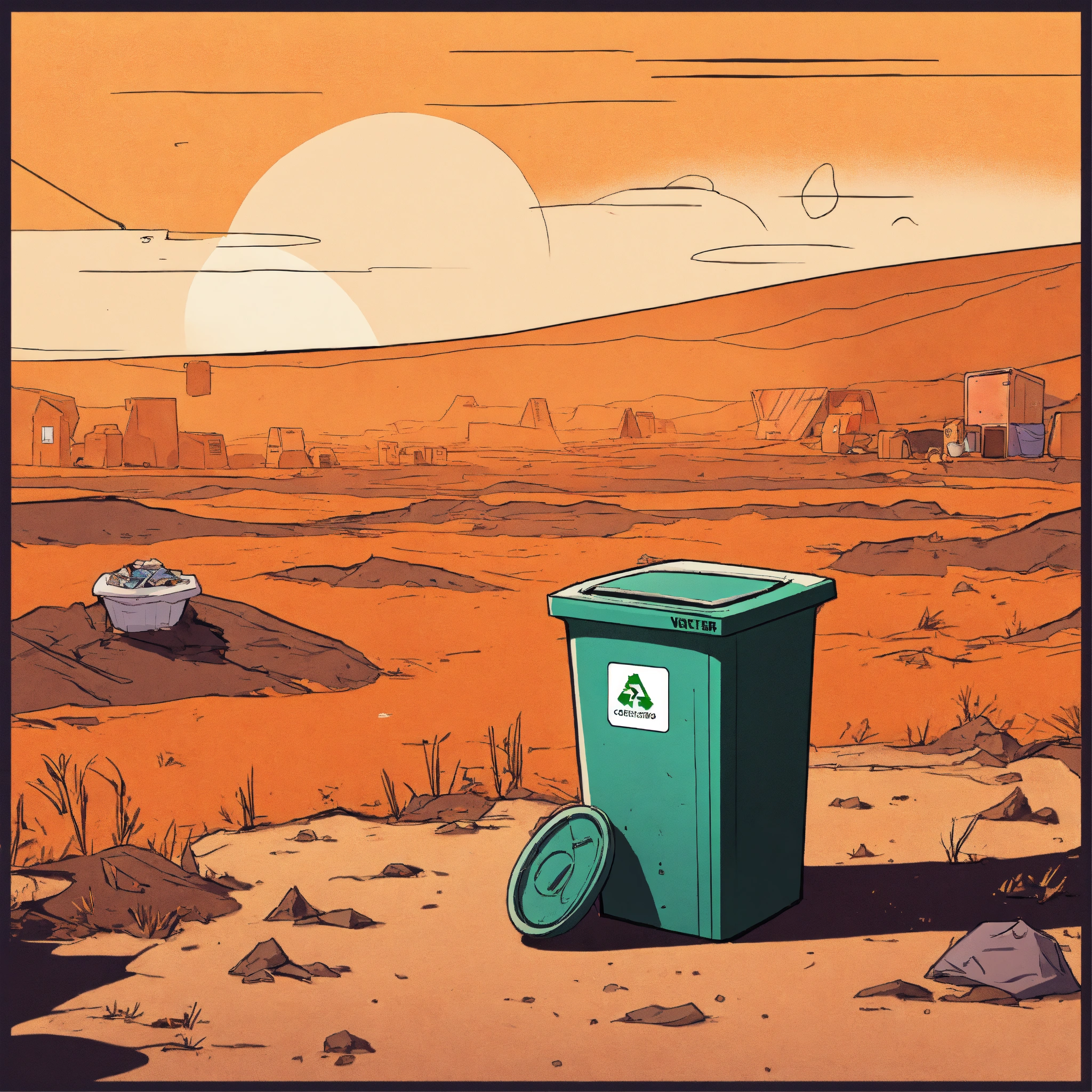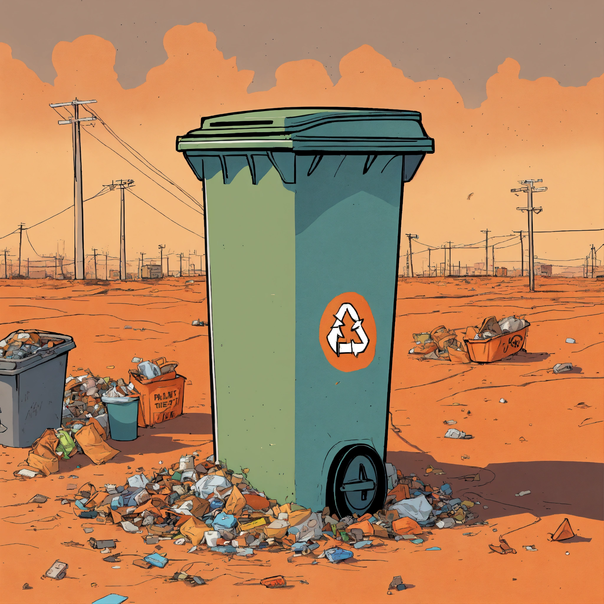 Conceive a comic strip panel showing a 'smart' garbage can, equipped with faded recycling symbols, amidst a stark, orange-hued wasteland