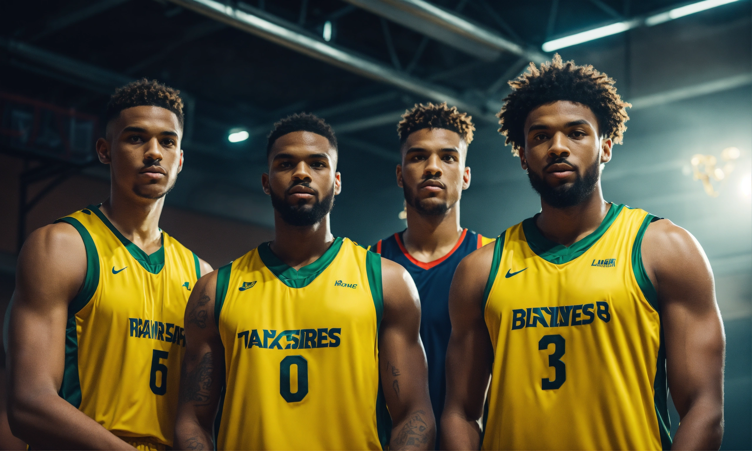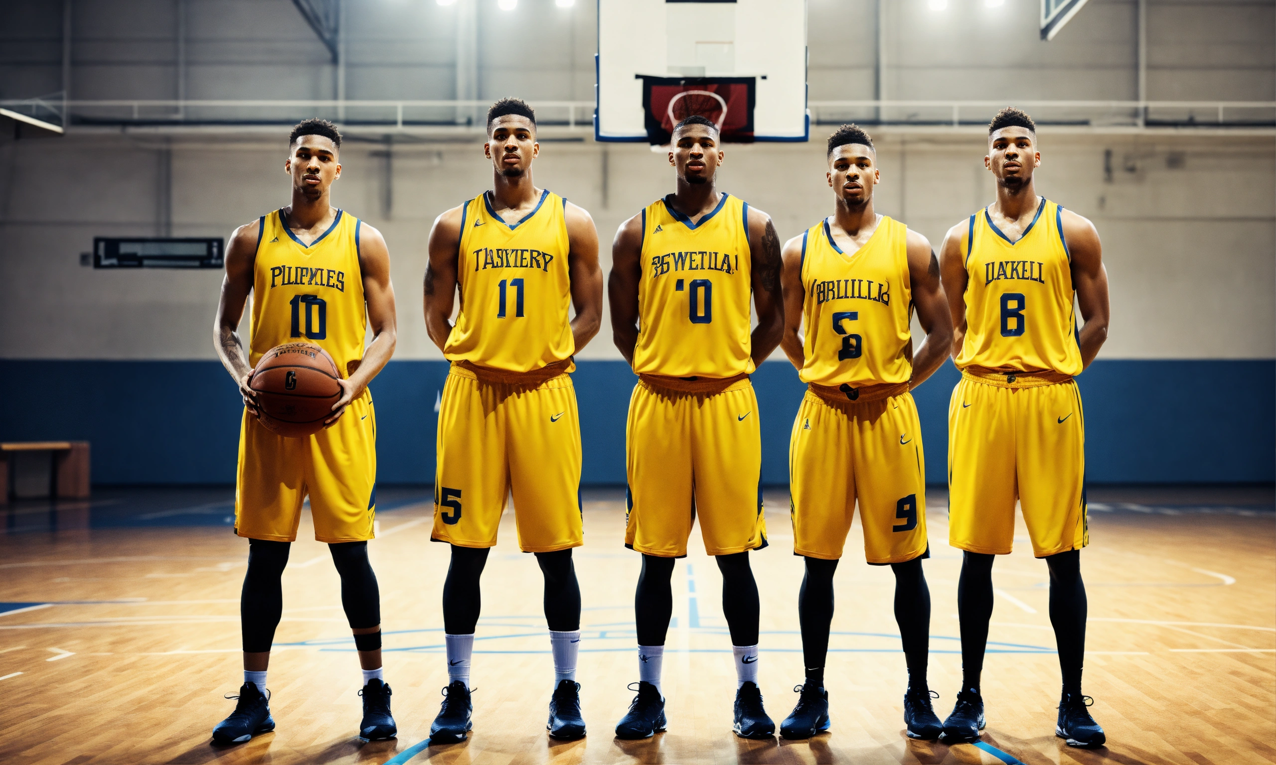 Five players basketball team in yellow jersey 4k facing camera