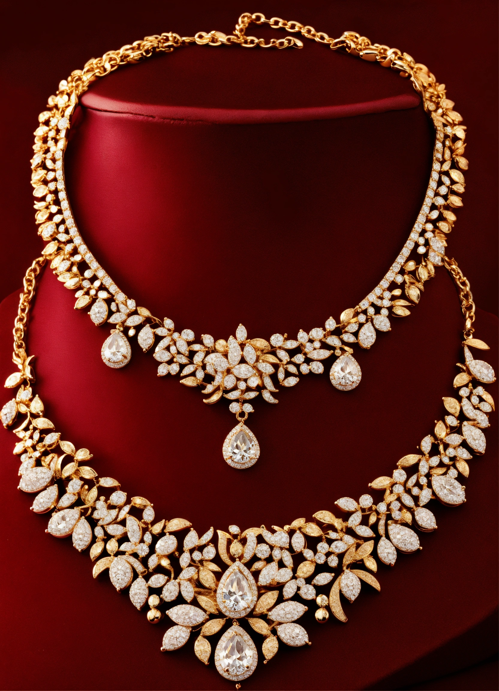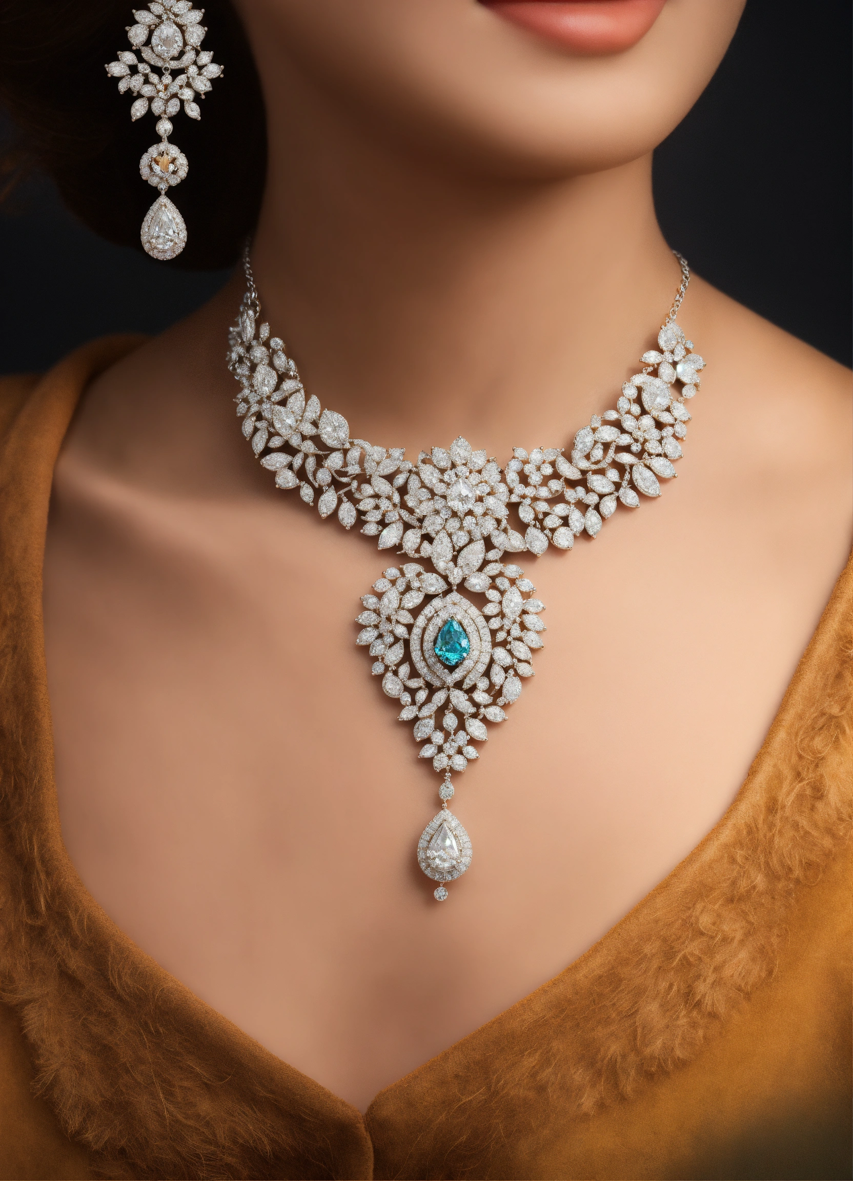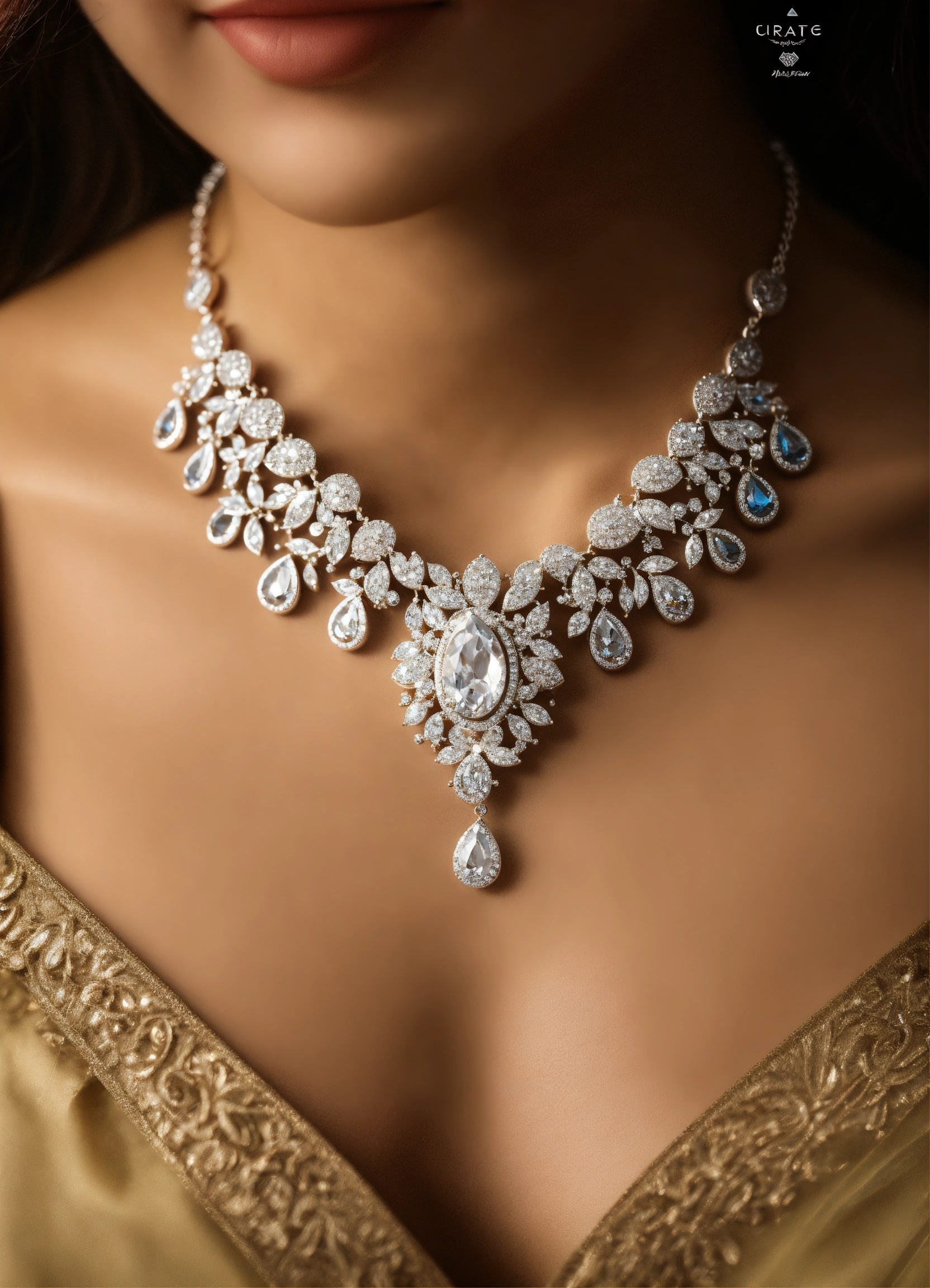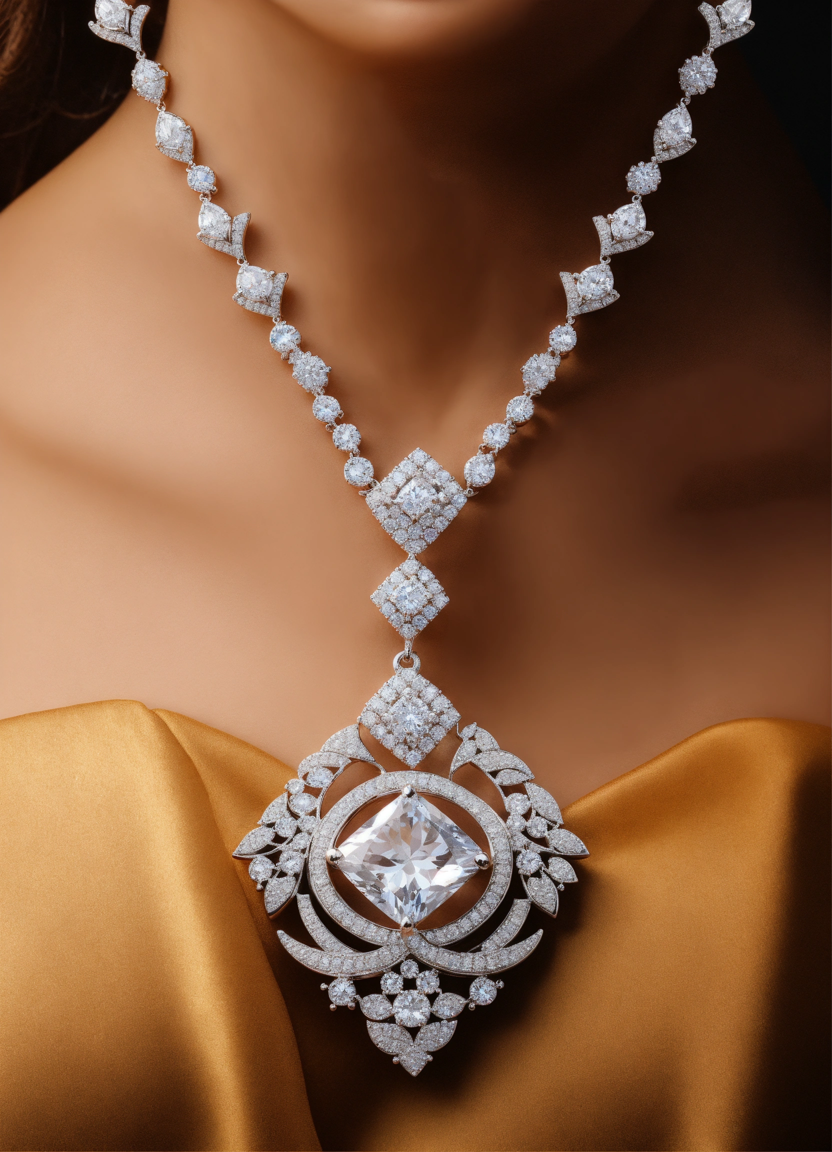 Jewellery design, vintage style, create diamond silver necklace with matte finish in prong setting, default-theme, --product-view --ultra-quality