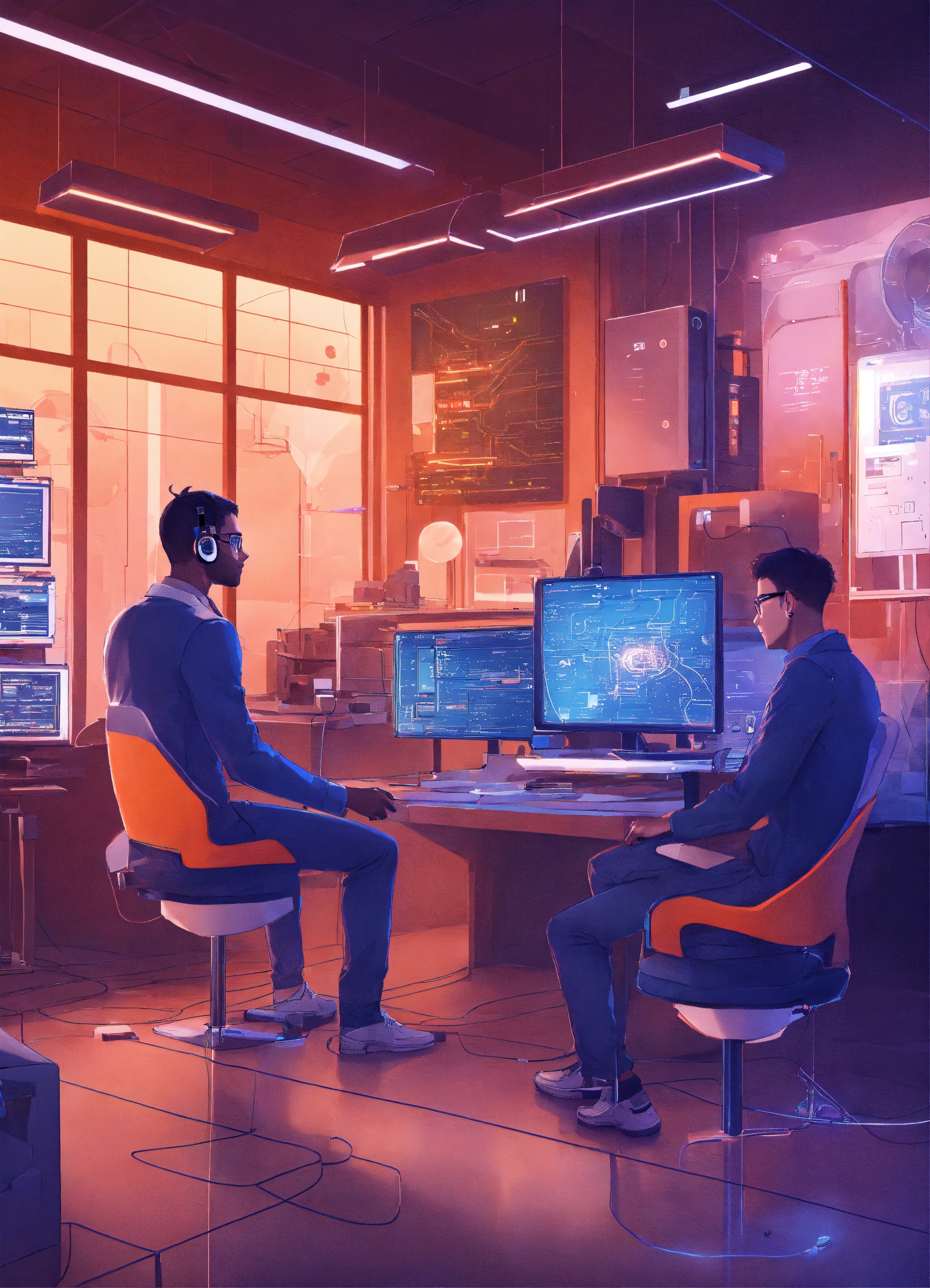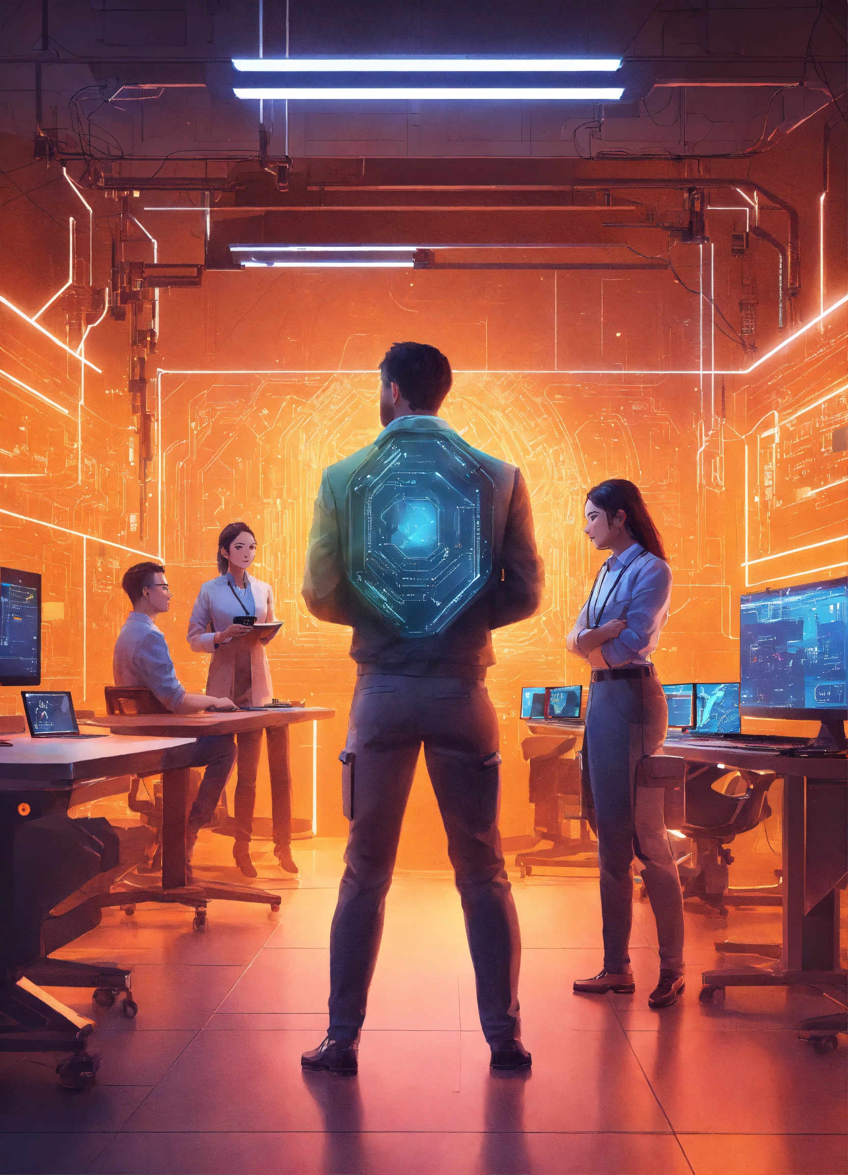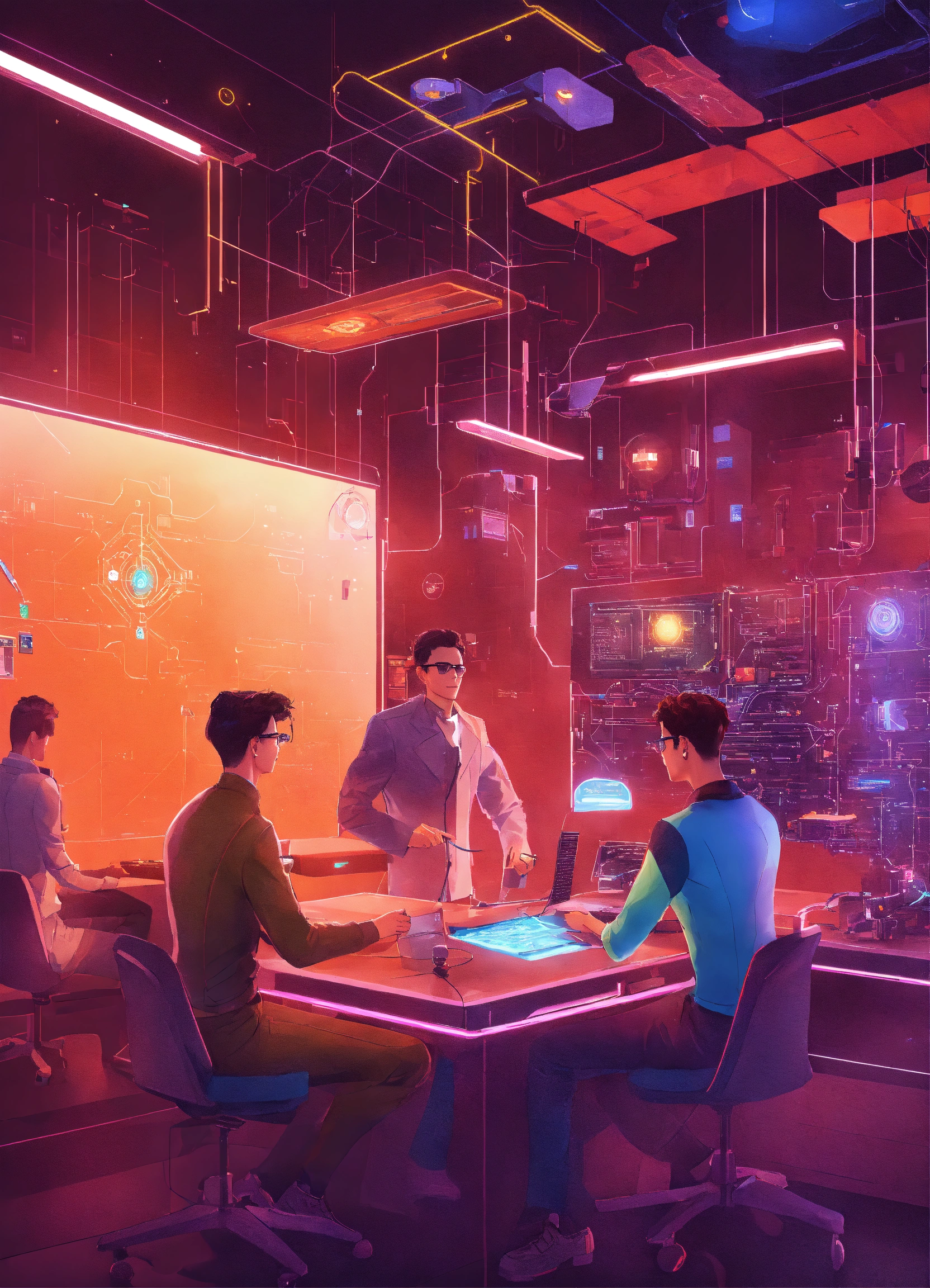 Create an image of young professionals, innovating in a futuristic computer workshop, which is enhanced with ai-augmented machines.